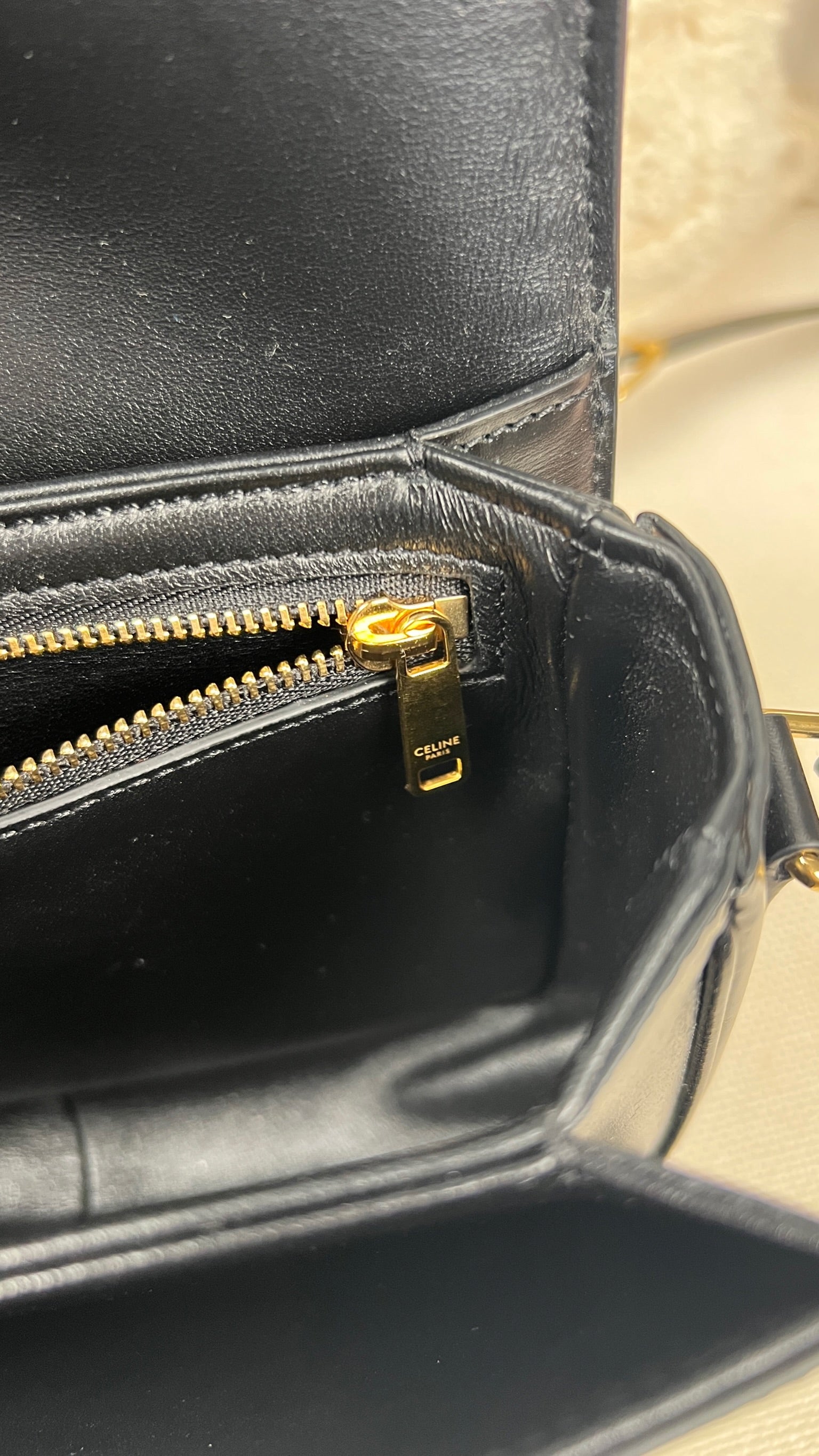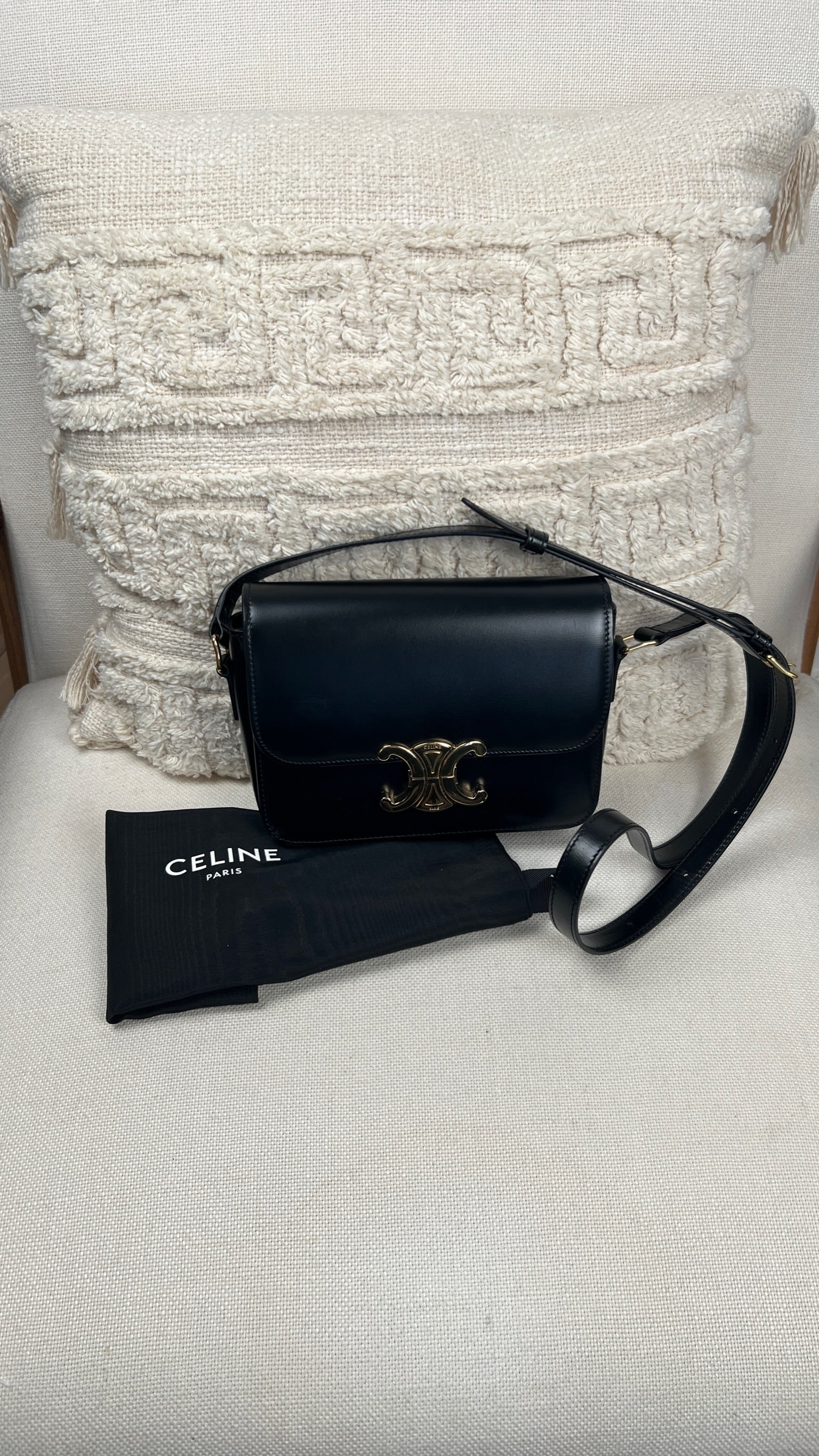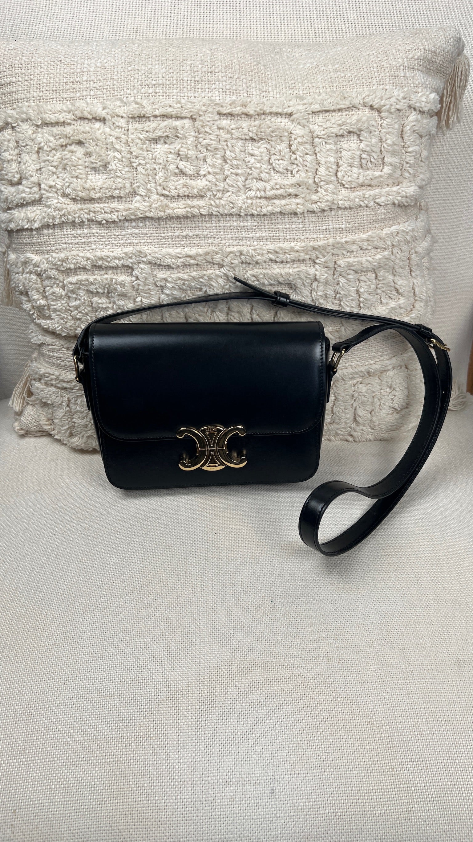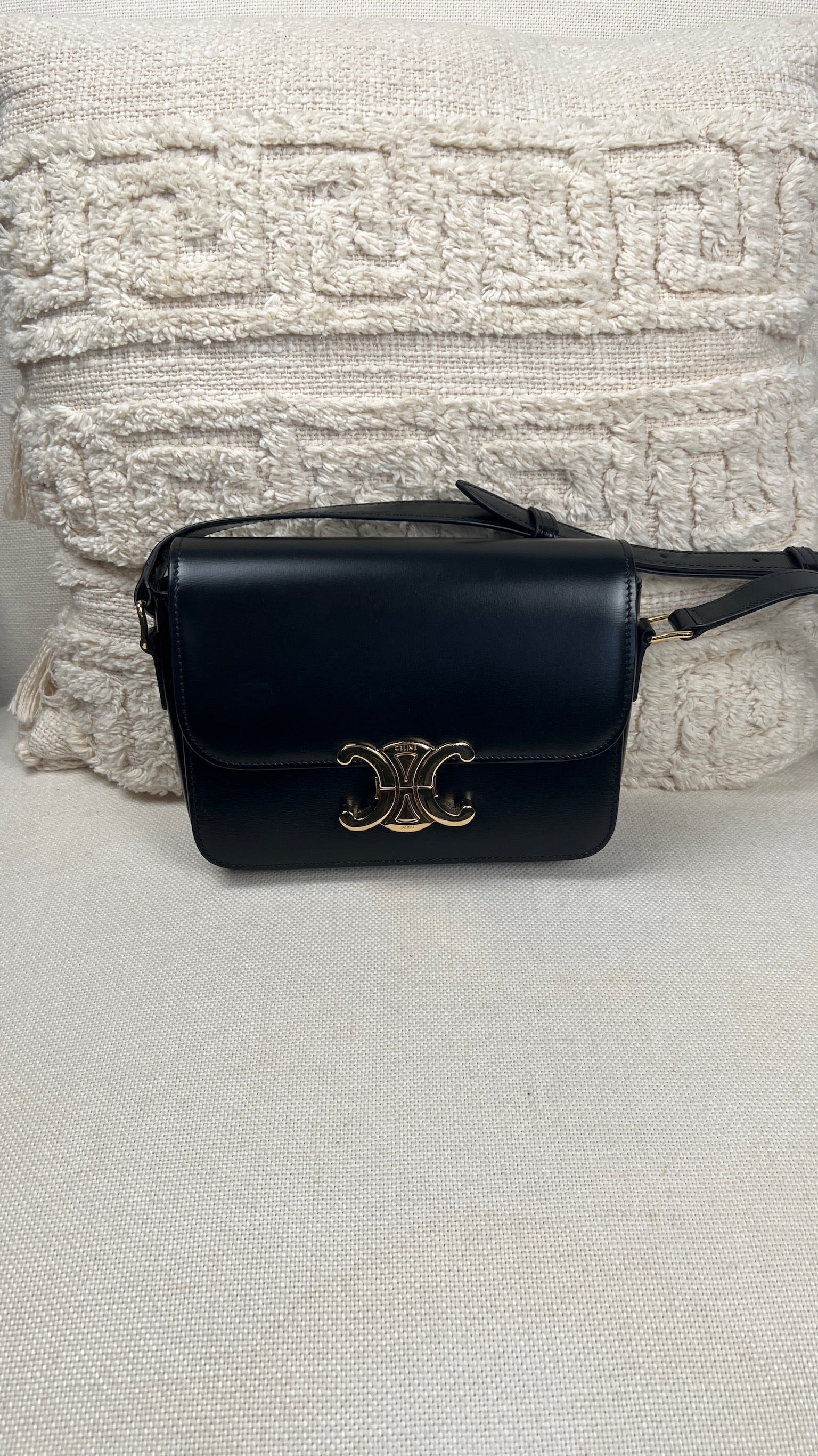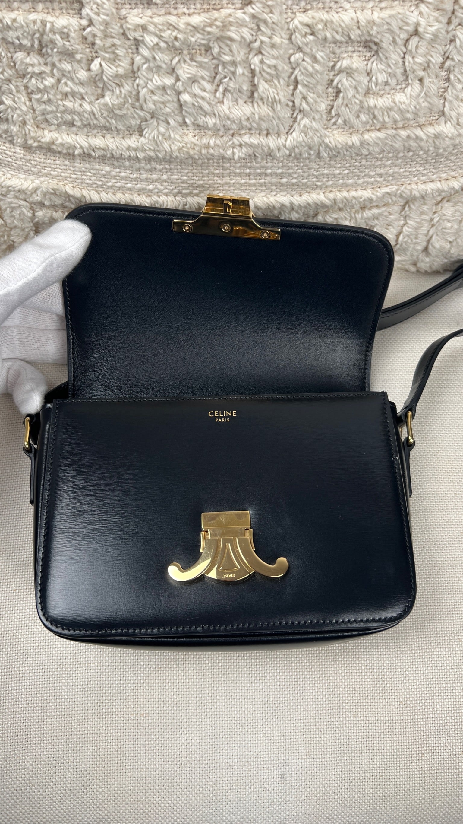 Ce sac Céline Teen Triomphe est quasiment neuf. Le cuir est en très bon état, mais présente de légères traces très très légères. Les coins et la bandoulière sont en très bon état. L'intérieur est en très bon état. La bijouterie présente de petits signes d'usure car nous avons ouvert et fermés plusieurs fois pour les photos etc.