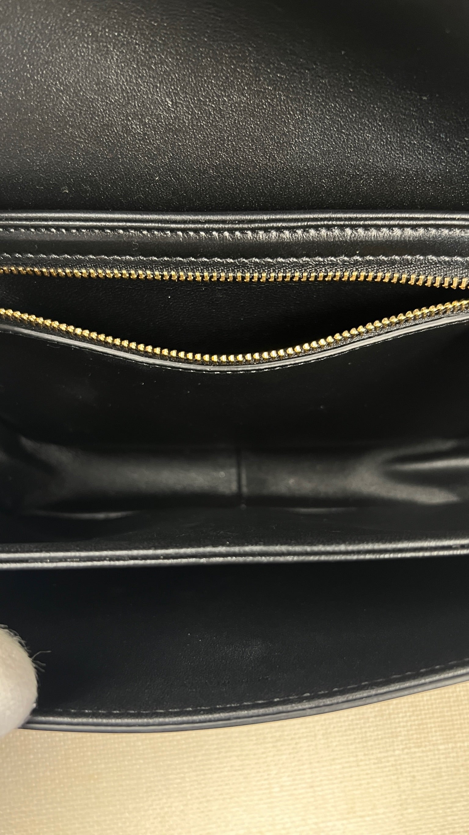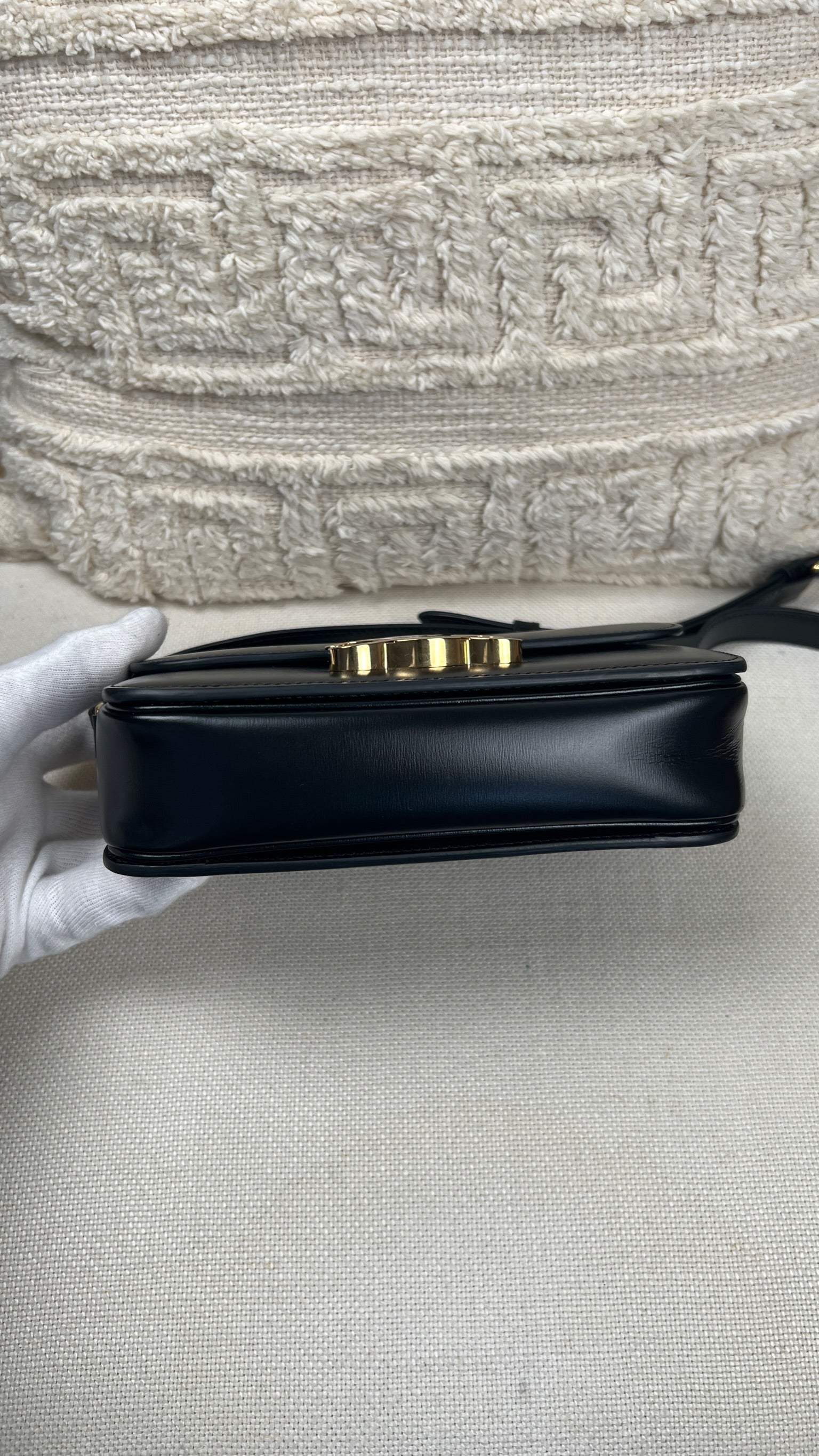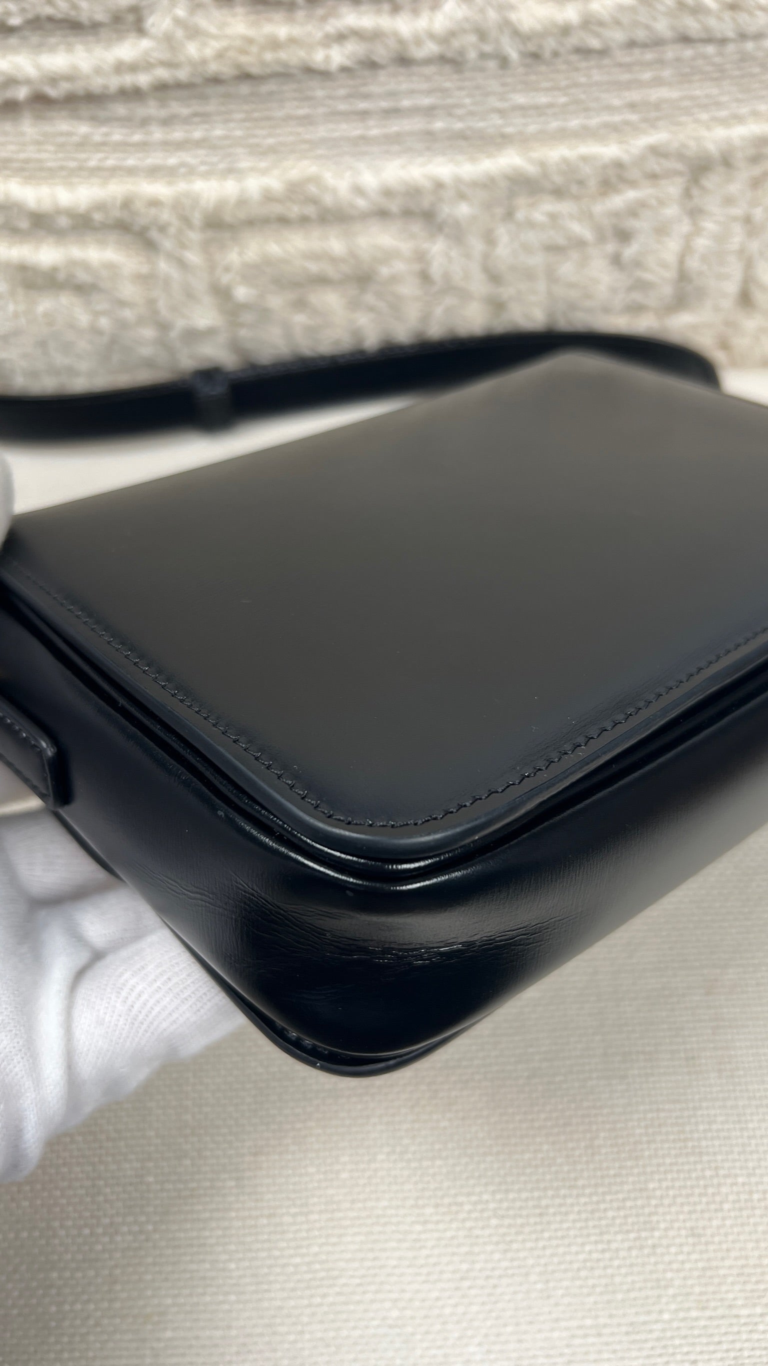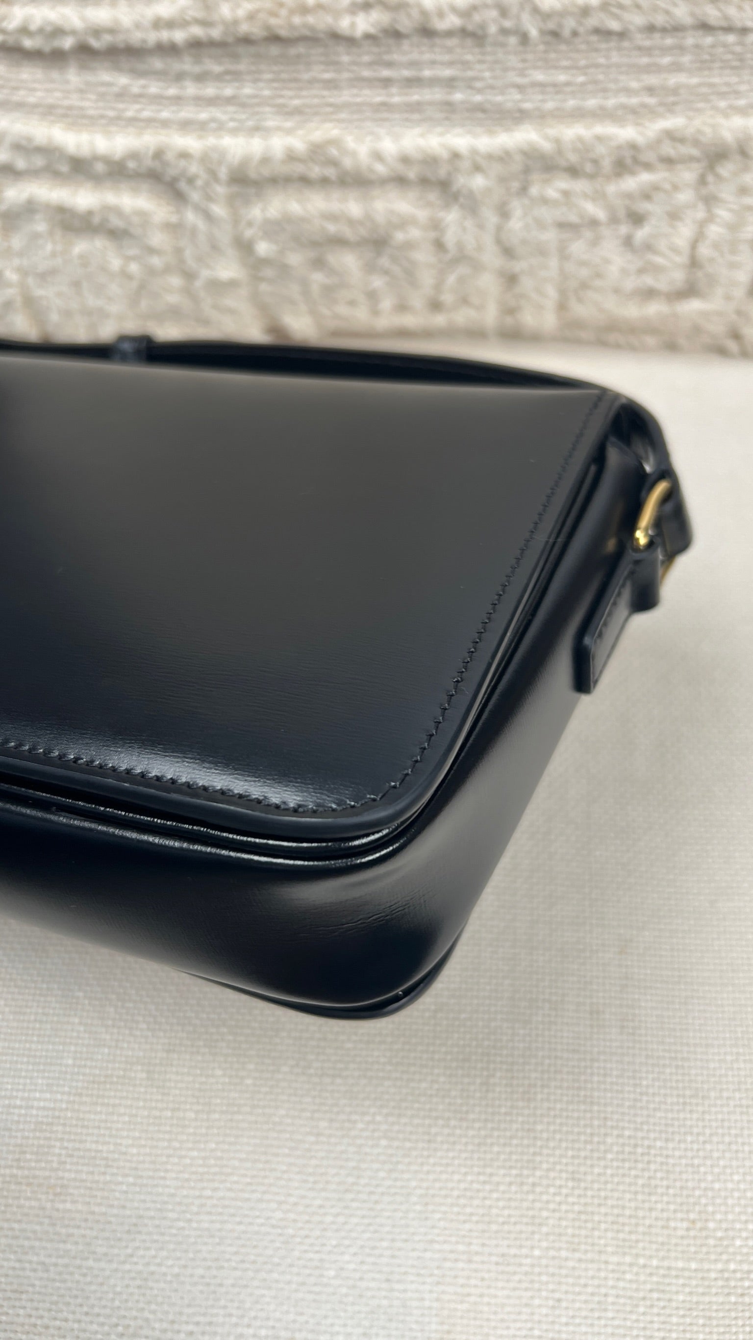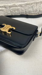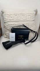 Ce sac Céline Teen Triomphe est quasiment neuf. Le cuir est en très bon état, mais présente de légères traces très très légères. Les coins et la bandoulière sont en très bon état. L'intérieur est en très bon état. La bijouterie présente de petits signes d'usure car nous avons ouvert et fermés plusieurs fois pour les photos etc.