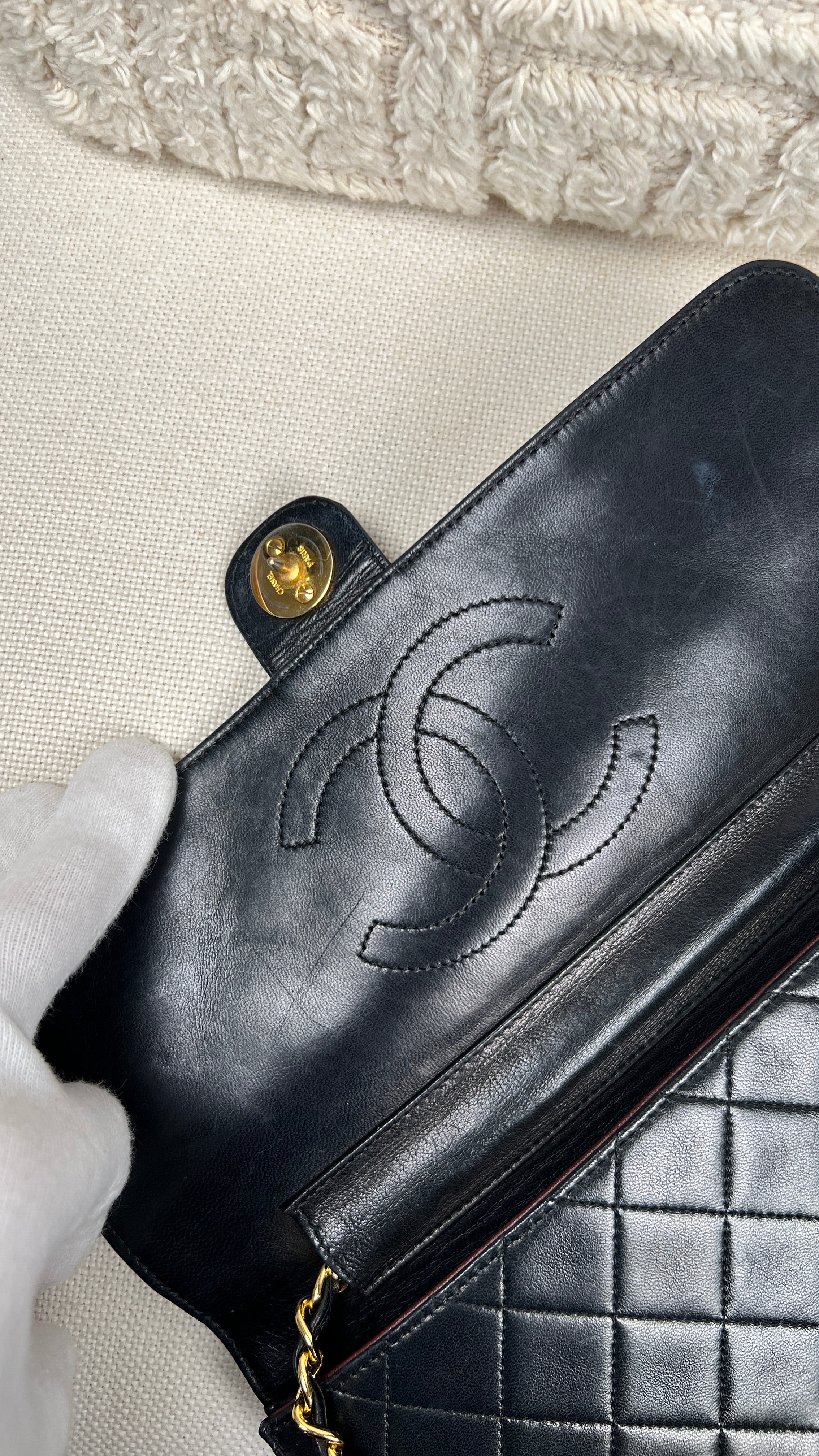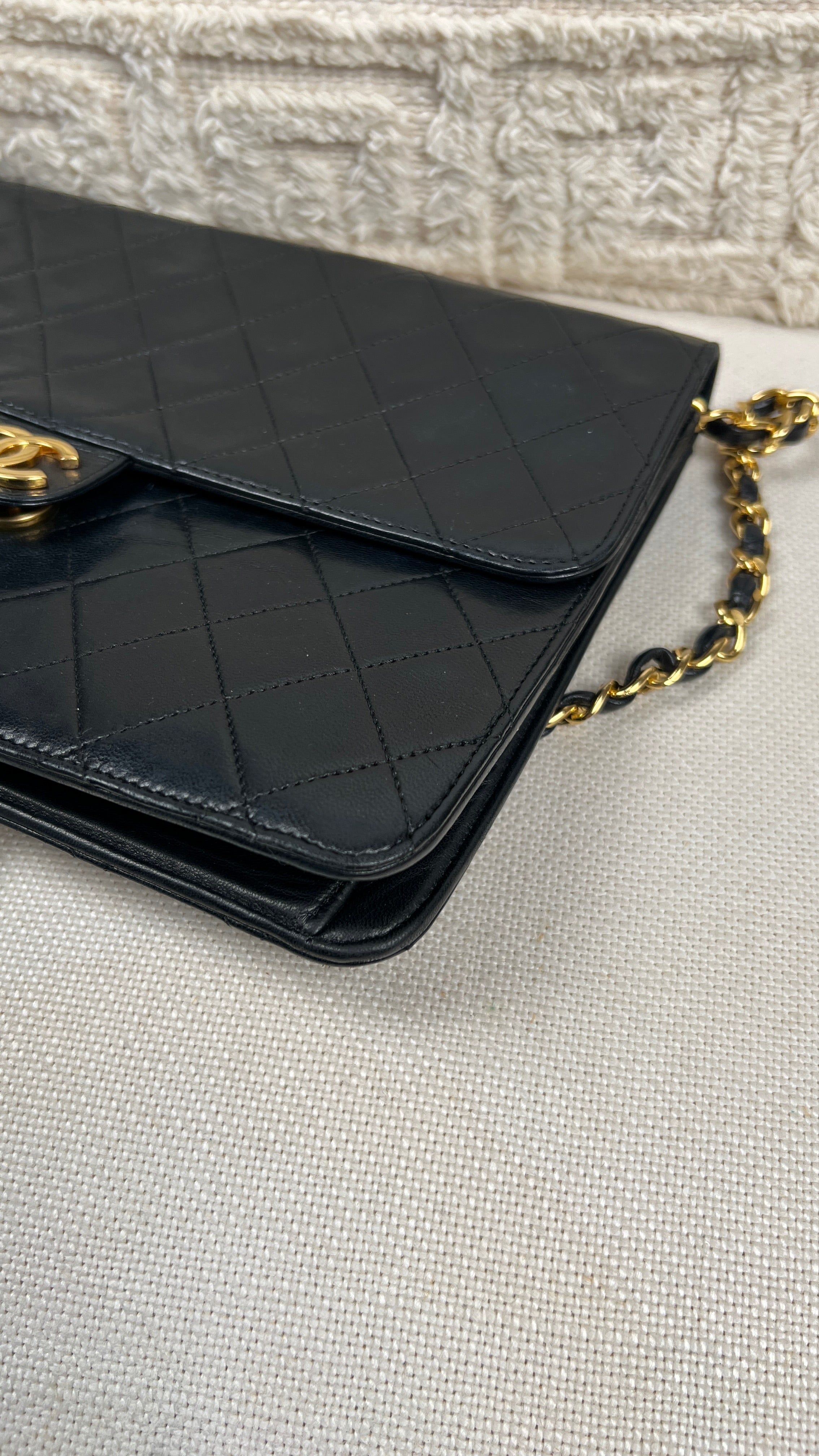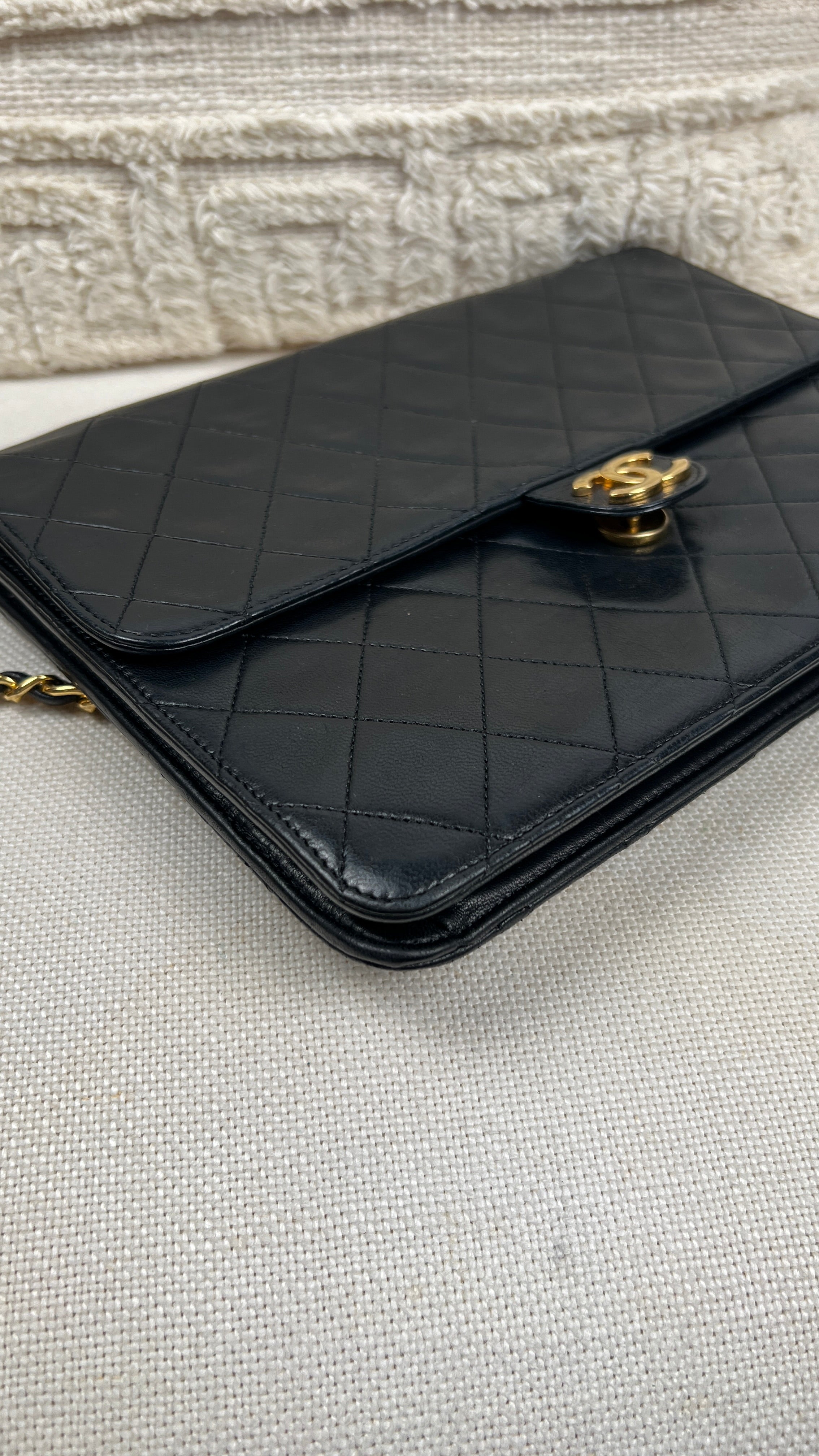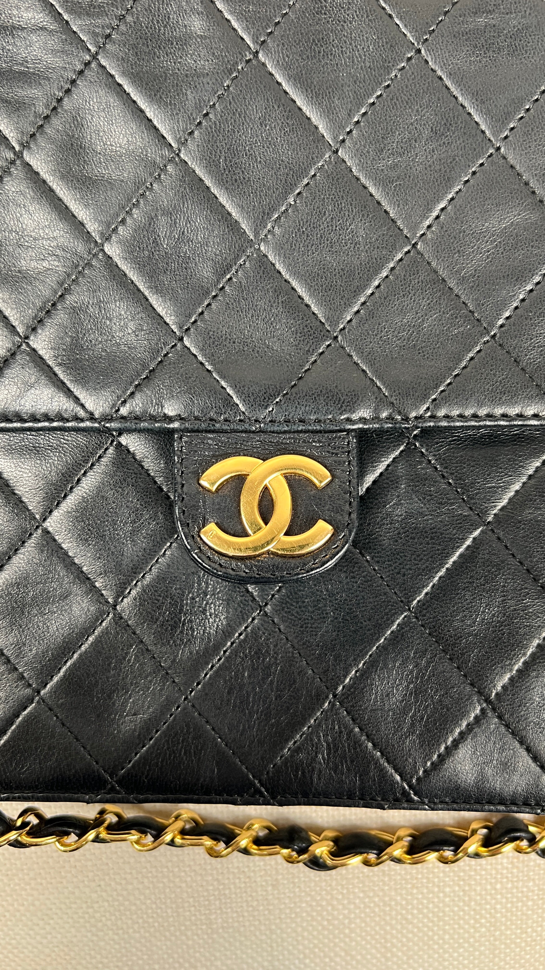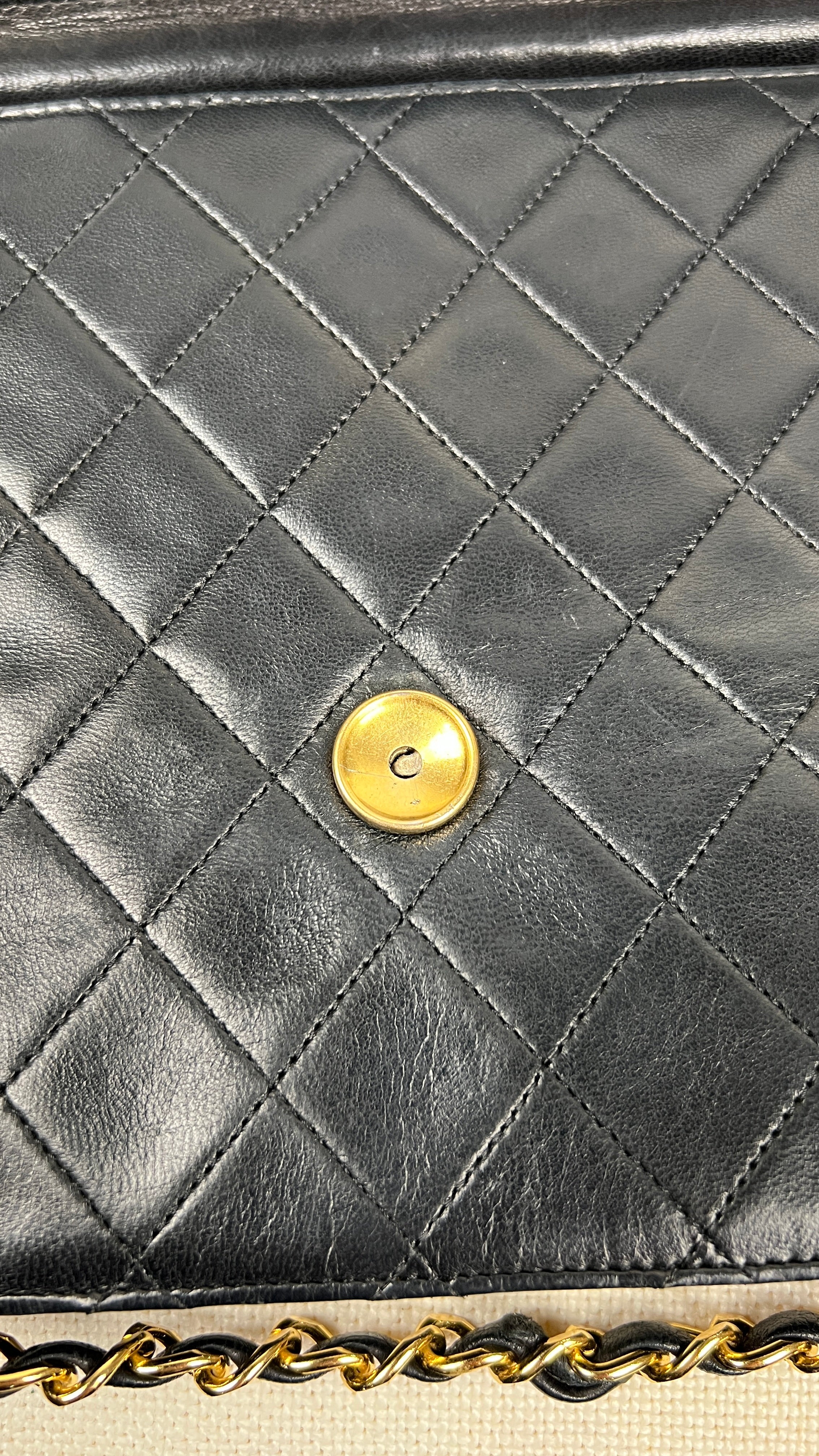 Ce sac Chanel Vintage est en bon état. Le cuir est en très bon état. Les coins sont en bon état. La quincaillerie et le bracelet sont en très bon état. L'intérieur est en très bon état. Le bouton de verrouillage ne fonctionne pas et vous ne pouvez pas fermer le sac. Le matériel est en plaqué or.