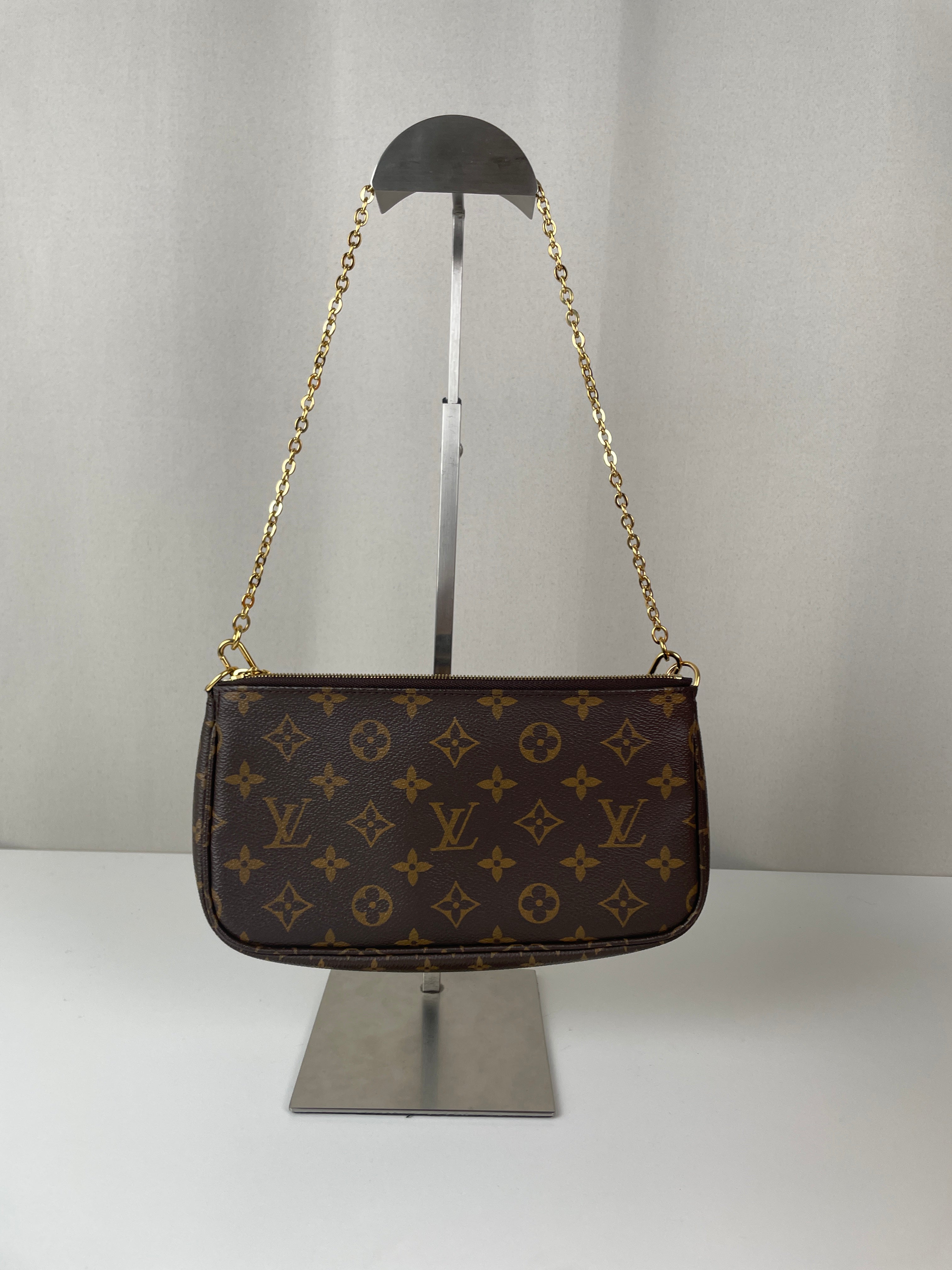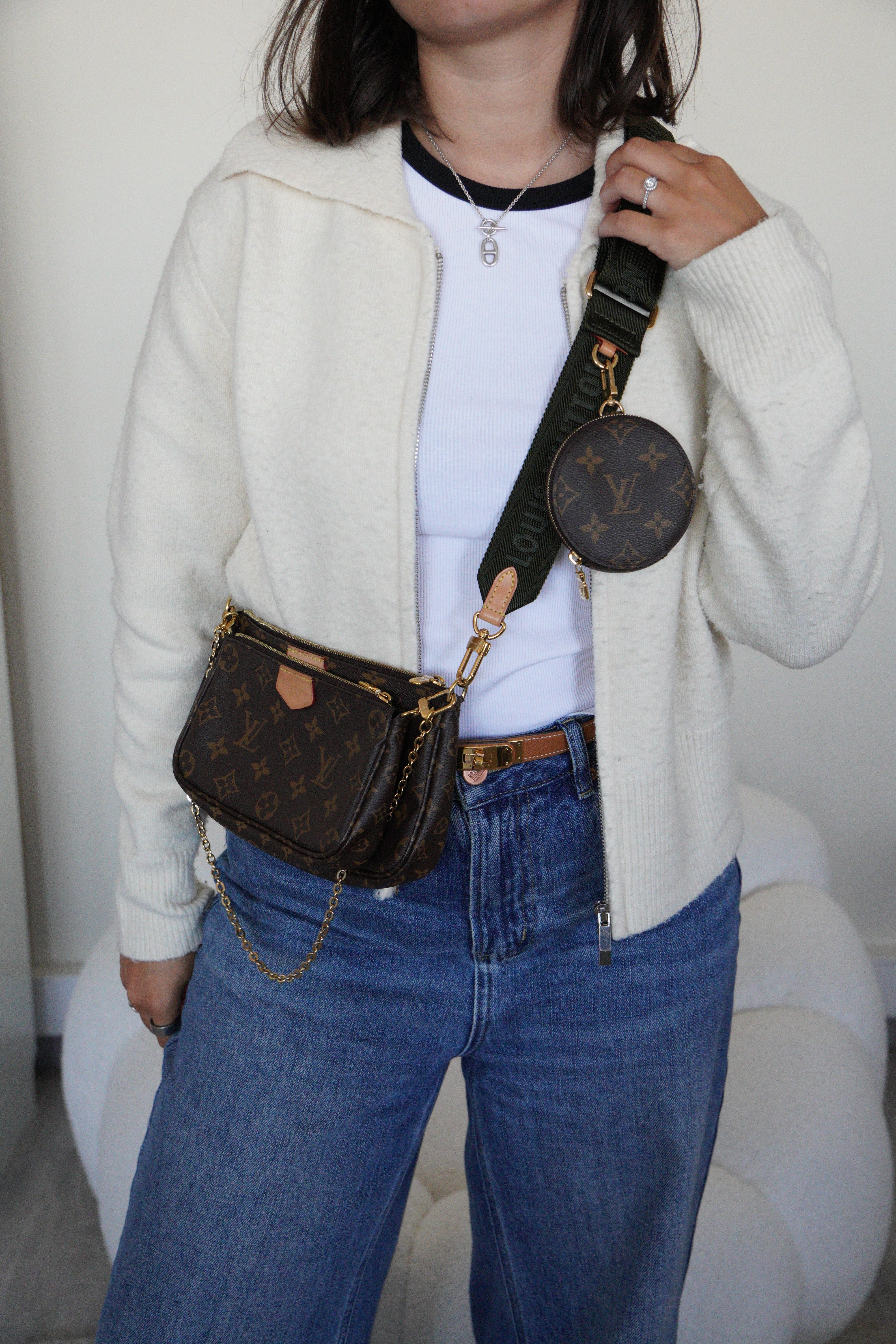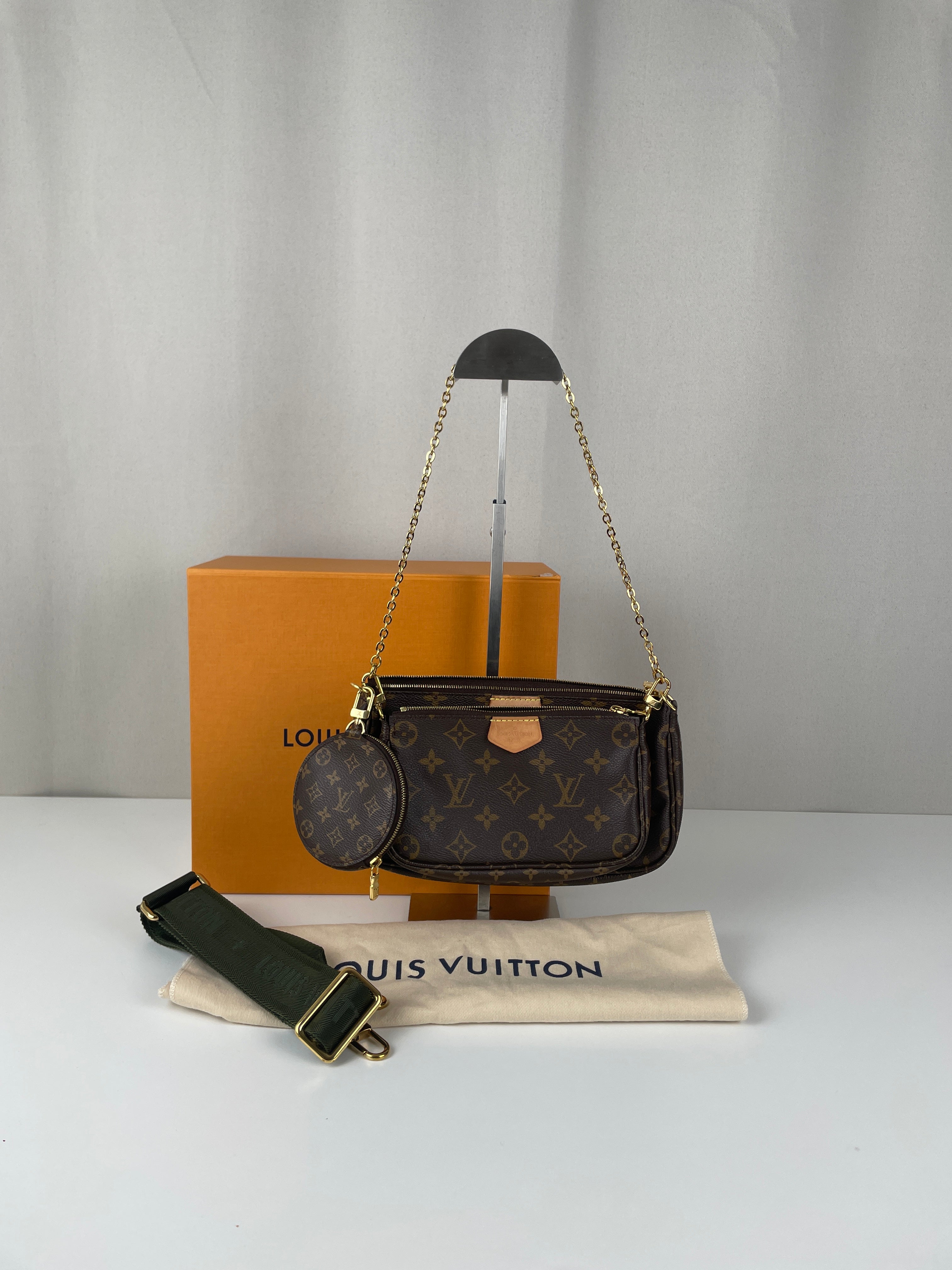 Ce sac Louis Vuitton Multi Pochette Accessoires avec bandoulière kaki est l’un des modèles les plus convoités de la maison. Il comprend la Pochette Accessoires classique et la Mini Pochette Accessoires en toile Monogram, le tout porté par une bandoulière large kaki pour un look à la fois tendance et pratique. Le sac parfait pour un porté croisé stylé au quotidien.