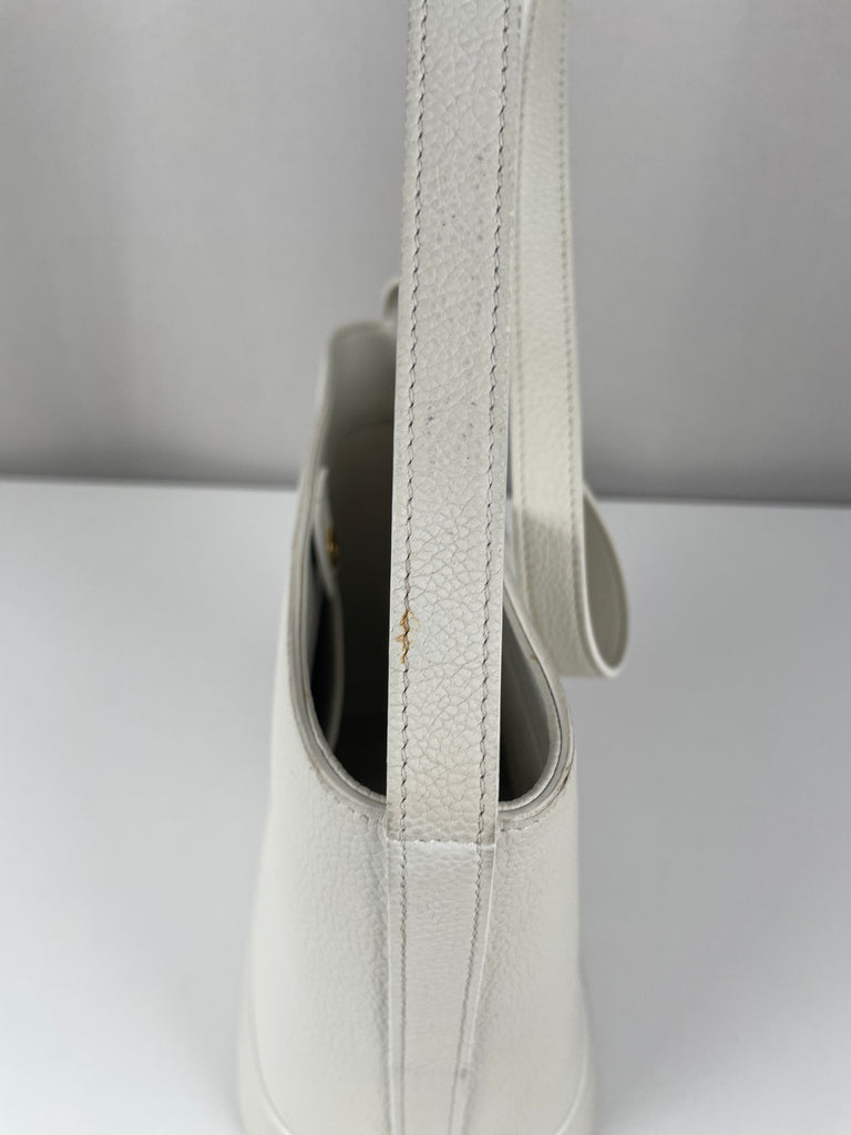 Le Bucket Triomphe est l'un des modèles contemporains les plus distinctifs de Céline. Cette édition en cuir blanc illustre l'approche architecturale du savoir-faire de luxe de la maison. Le cuir reste en bon état dans l'ensemble, bien qu'il présente quelques marques dans certaines zones qui témoignent de son caractère authentique. Les angles conservent un bon état, et les finitions dorées offrent un beau contraste avec le cuir blanc immaculé.