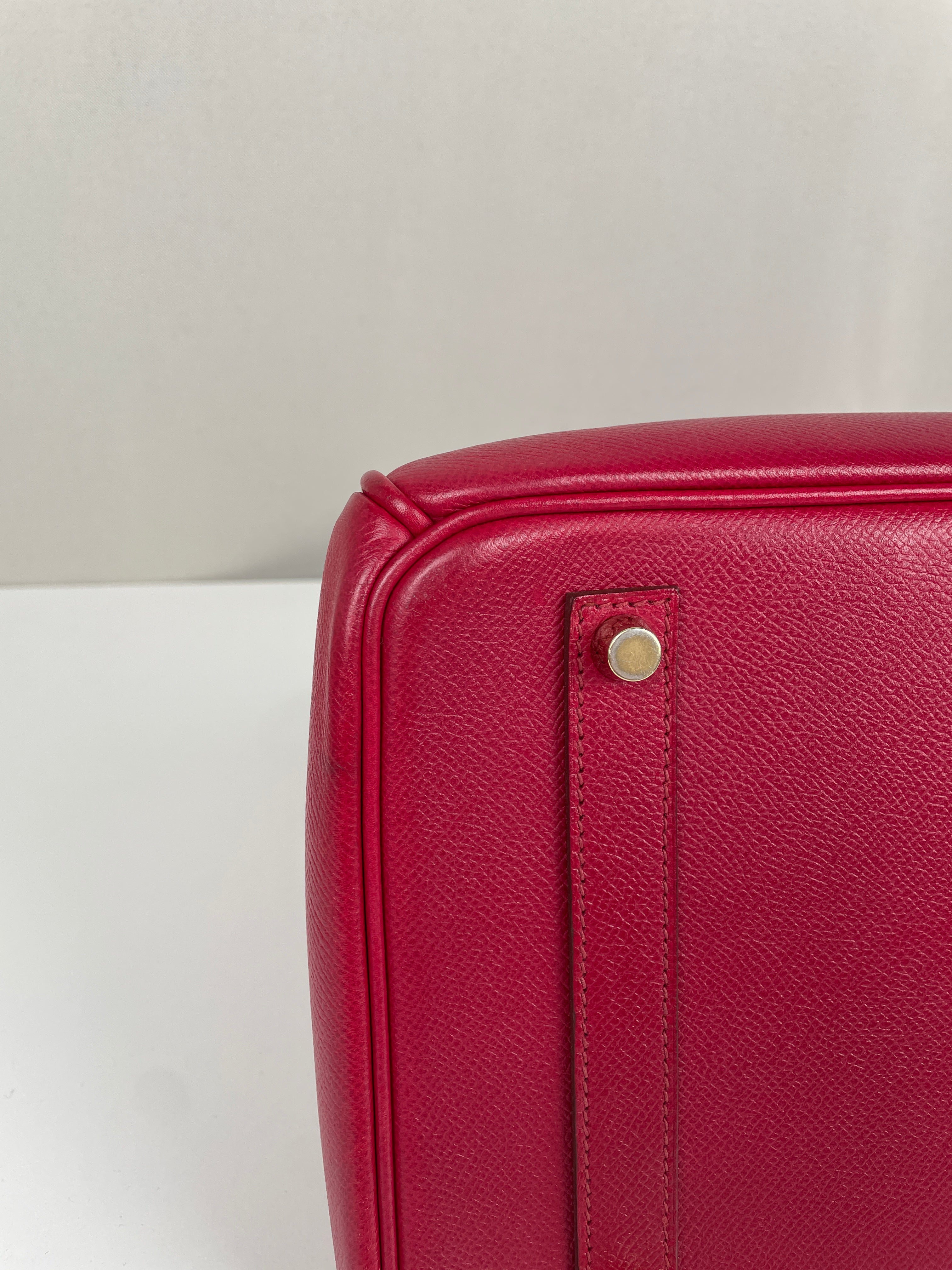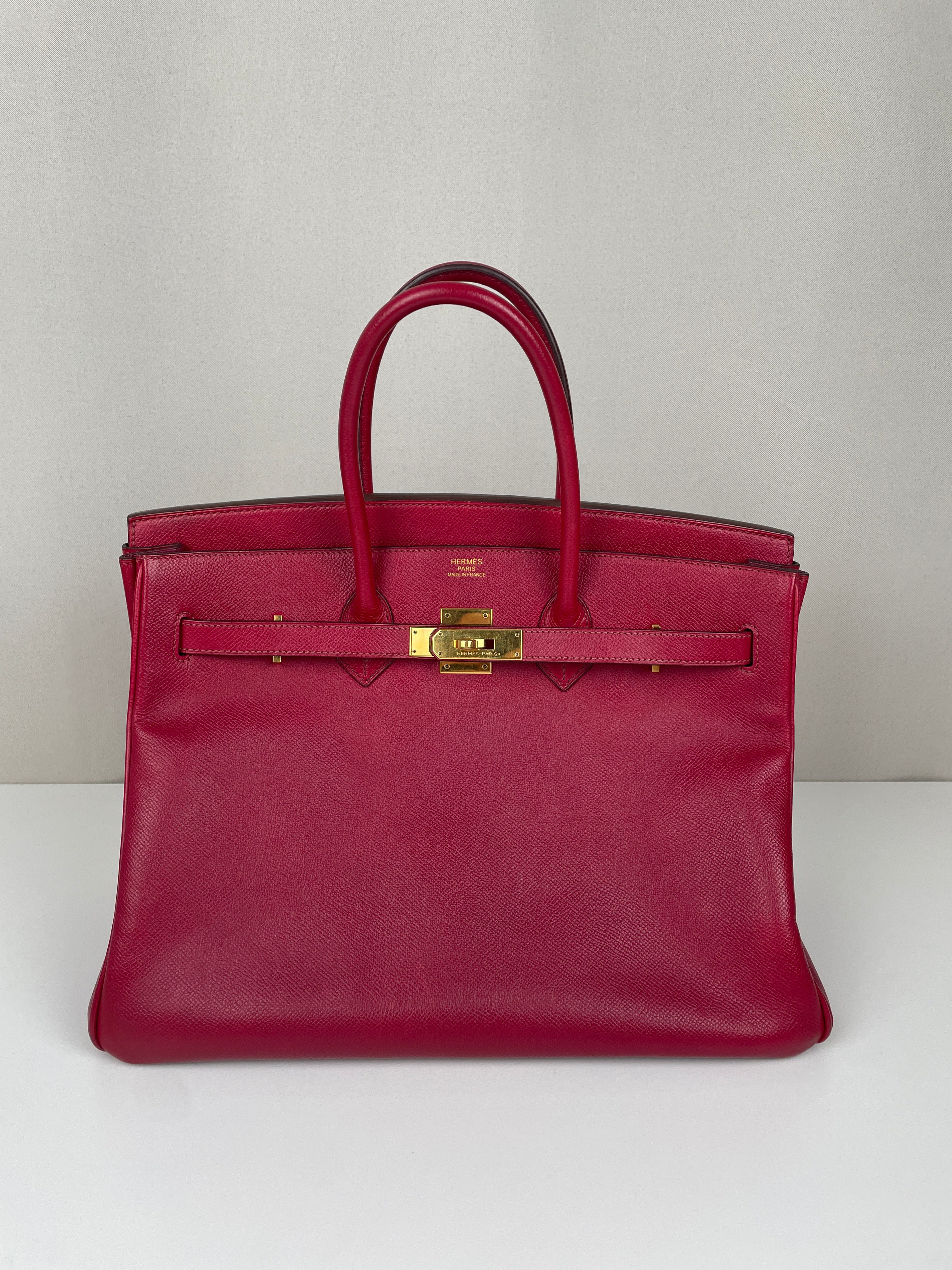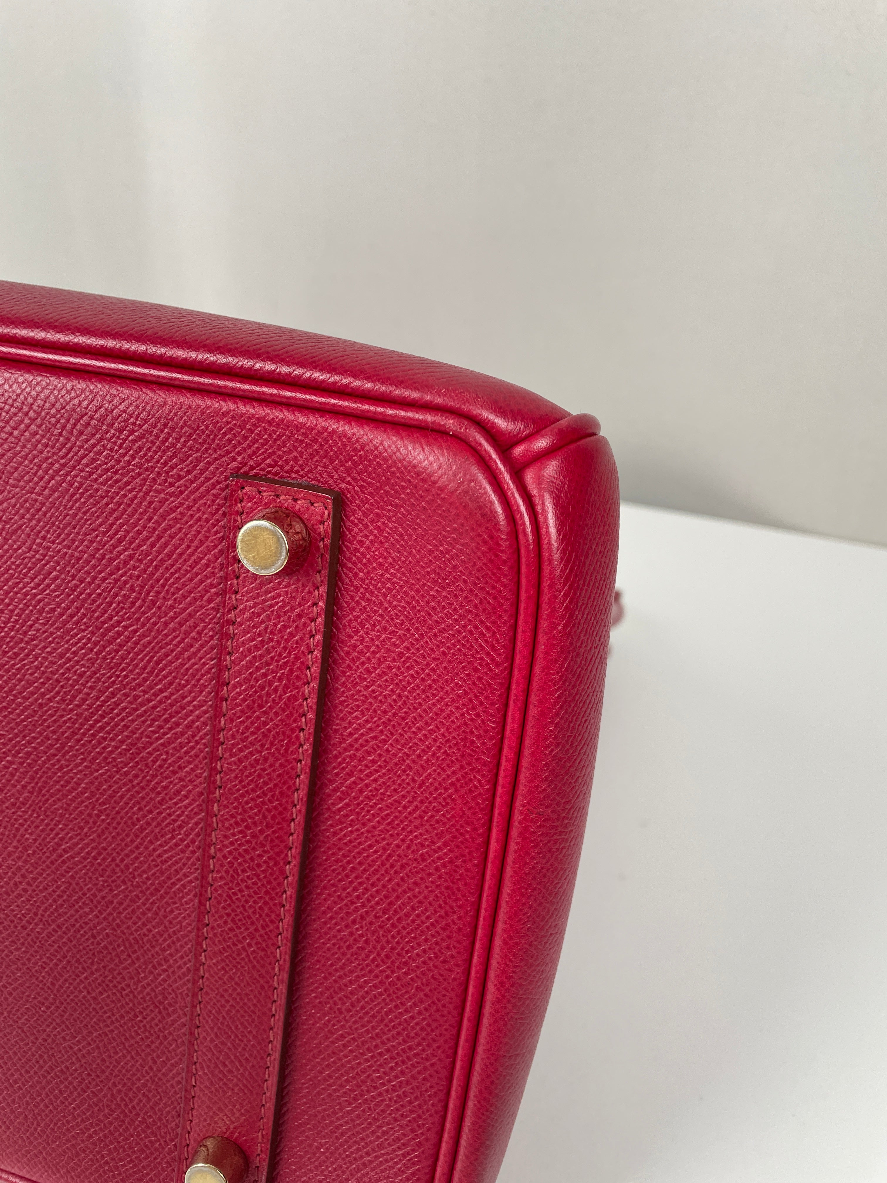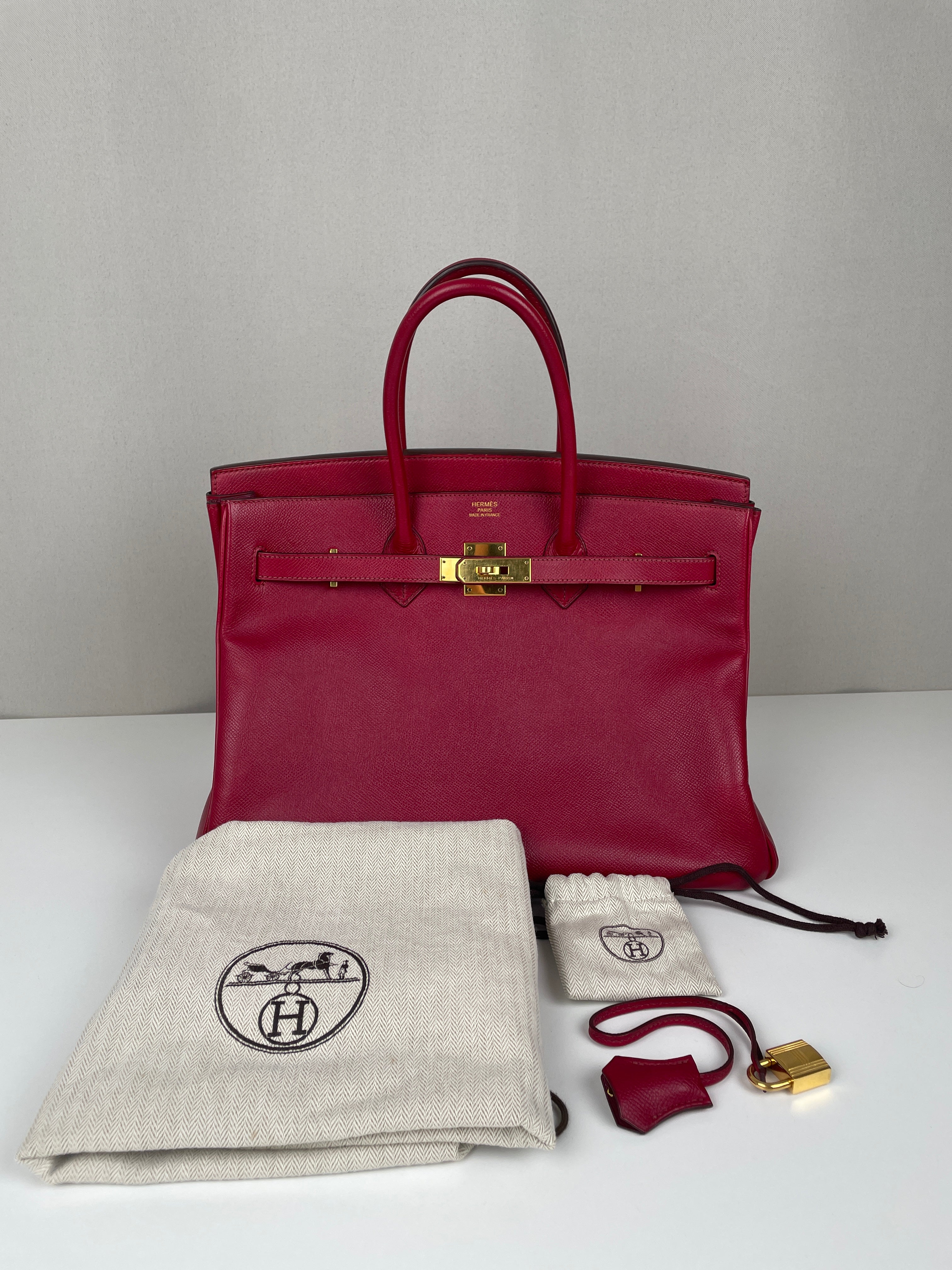 Ce sac Hermès Birkin 35 Epsom framboise et finitions dorées est en très bon état. Le cuir présente quelques traces d'usure minimimes et naturels. Les deux anses en cuir sont également en très bon état. Les coins sont également en très bon état. L'intérieur est en très bon état. La bijouterie est également en très bon état, micro rayure c'est un sac de 2010. Le sac est fourni avec un cadenas, une clé et une housse de protection de la maison le dustbag.