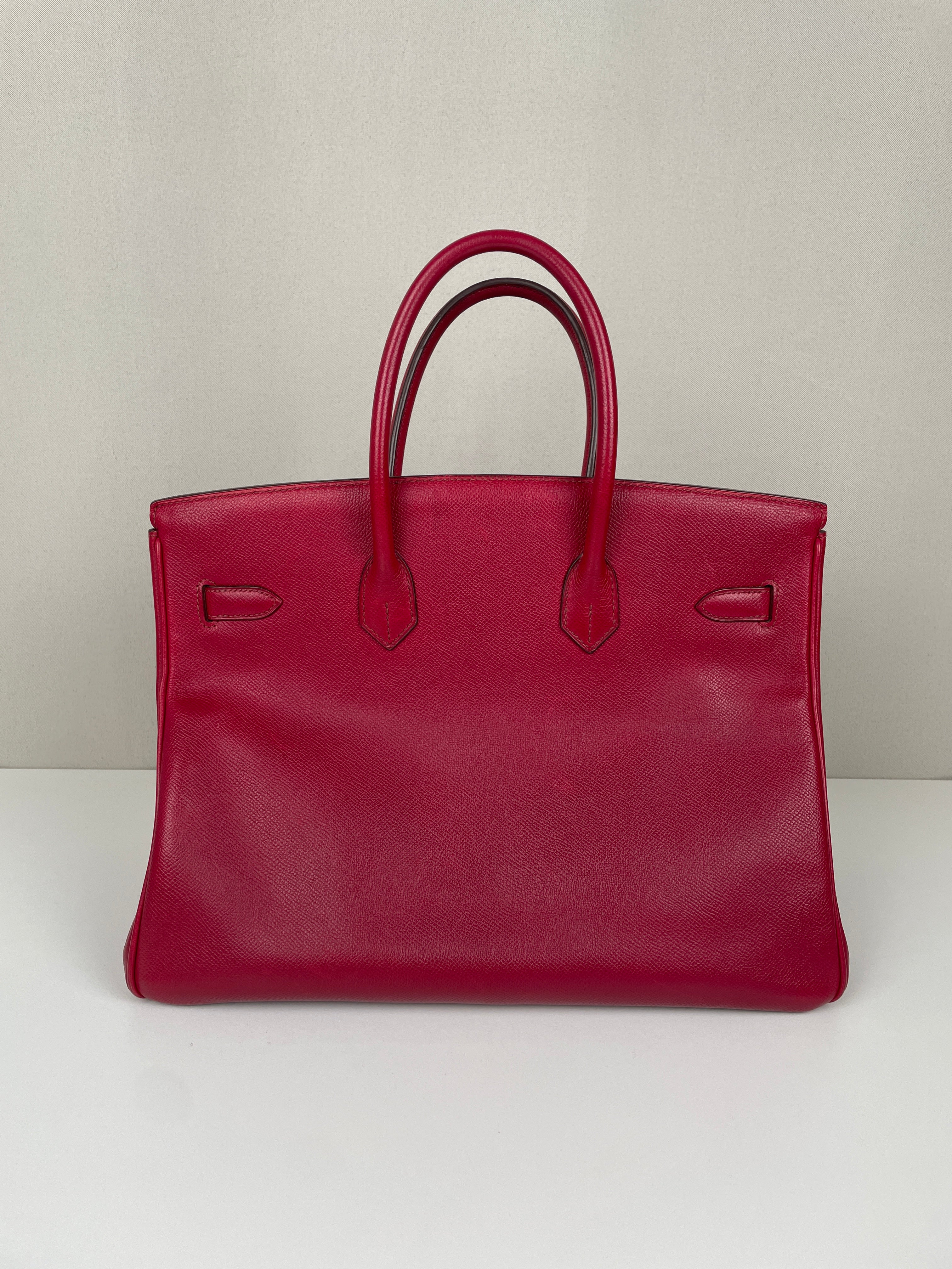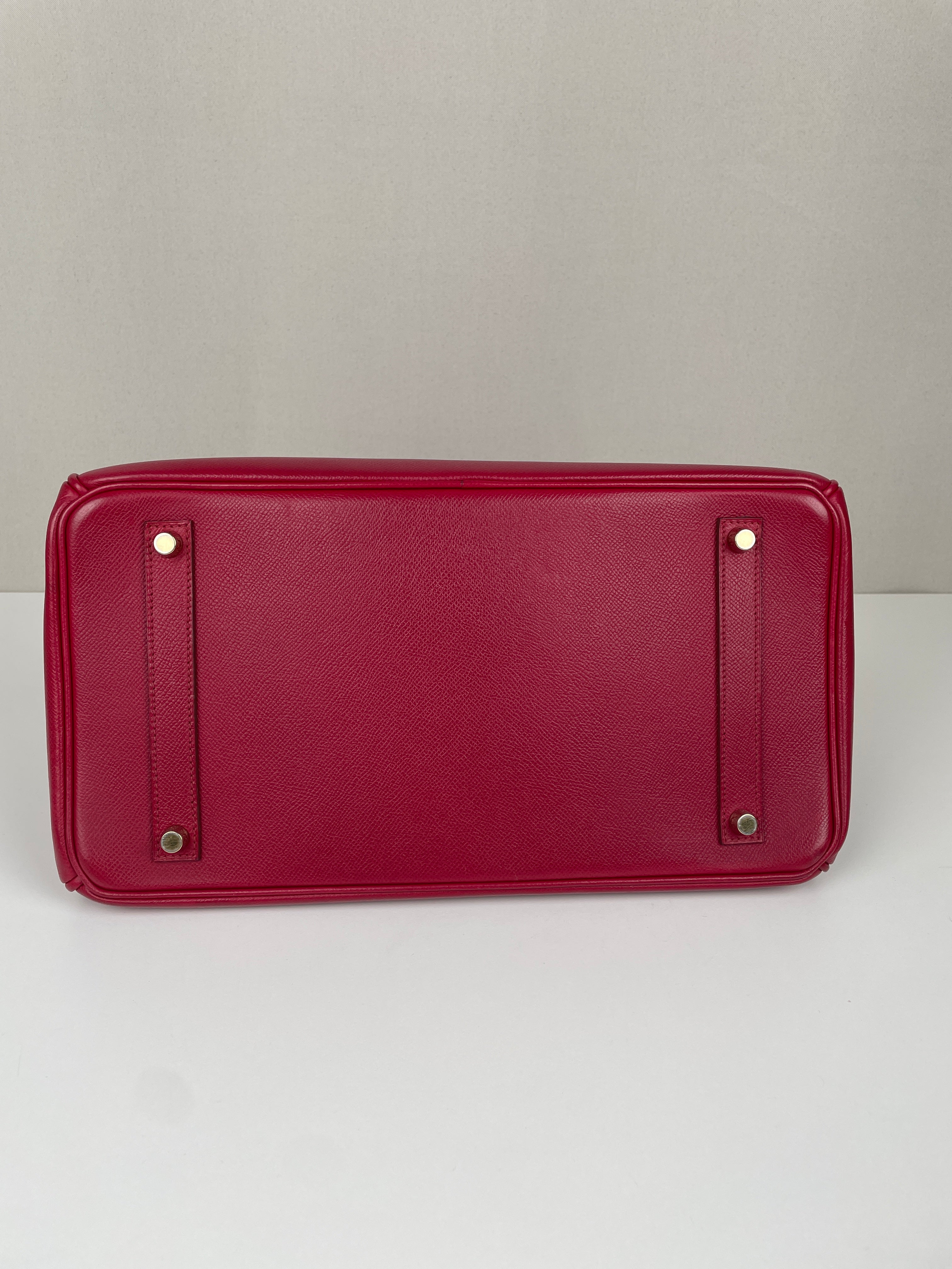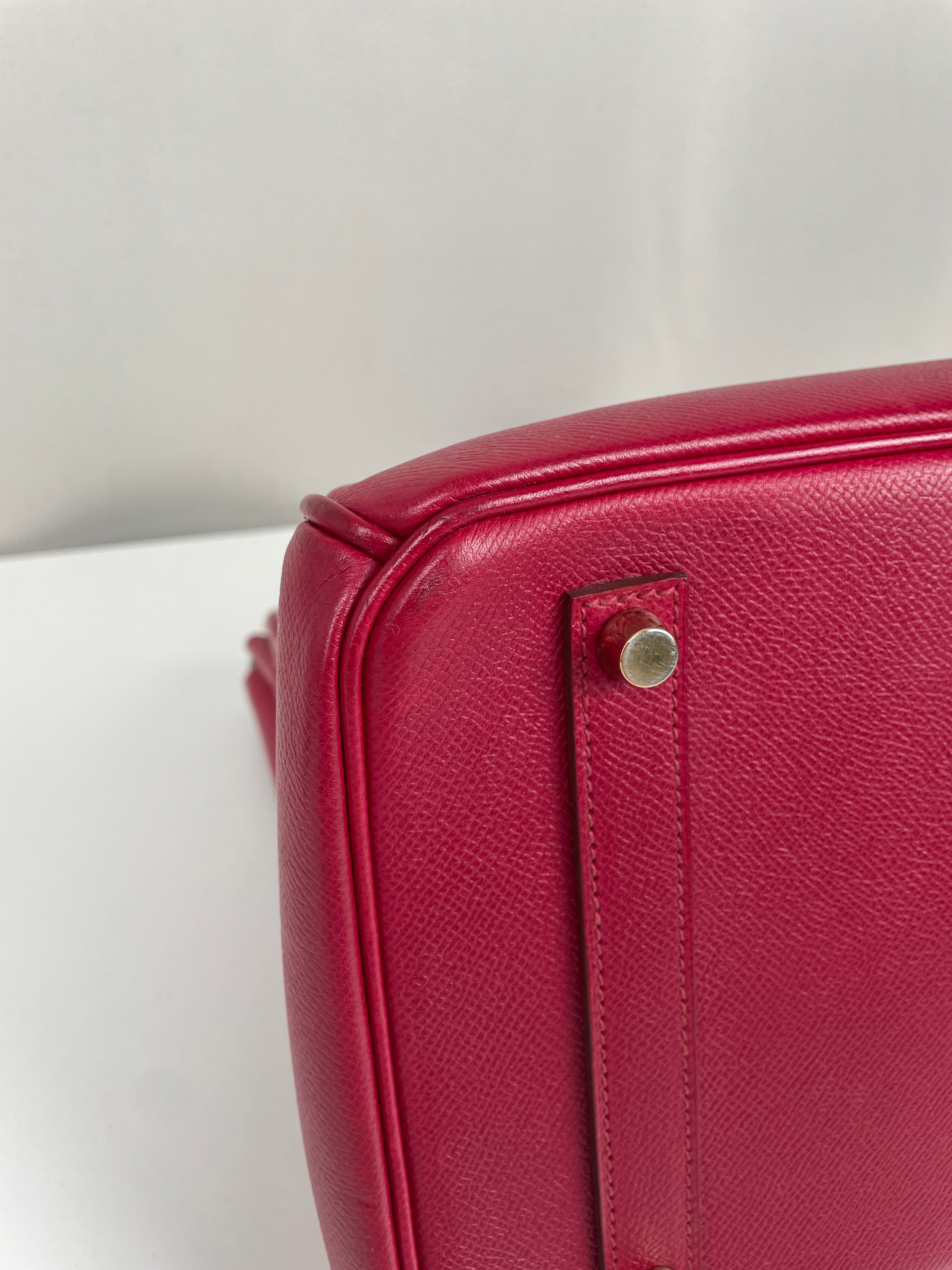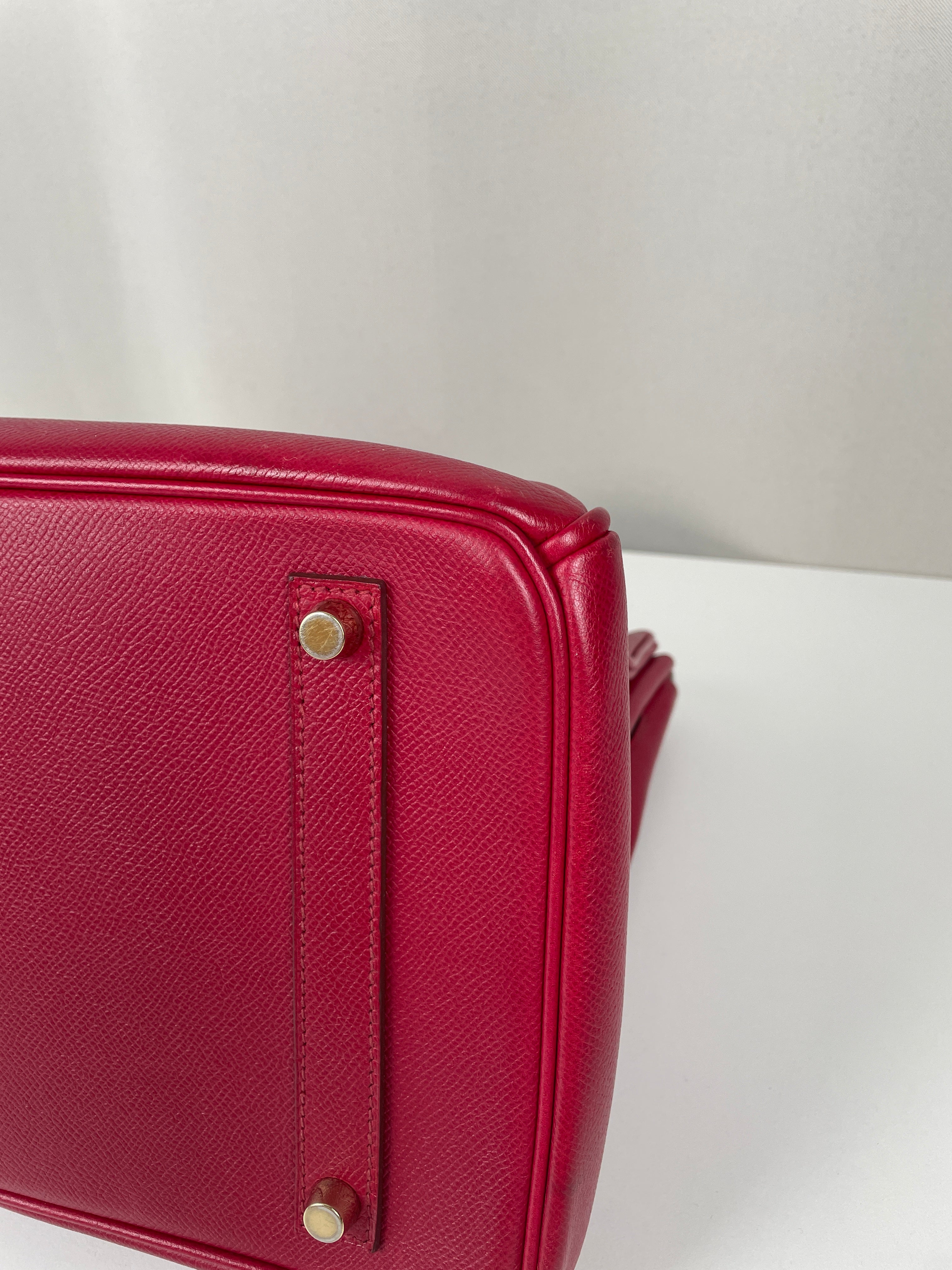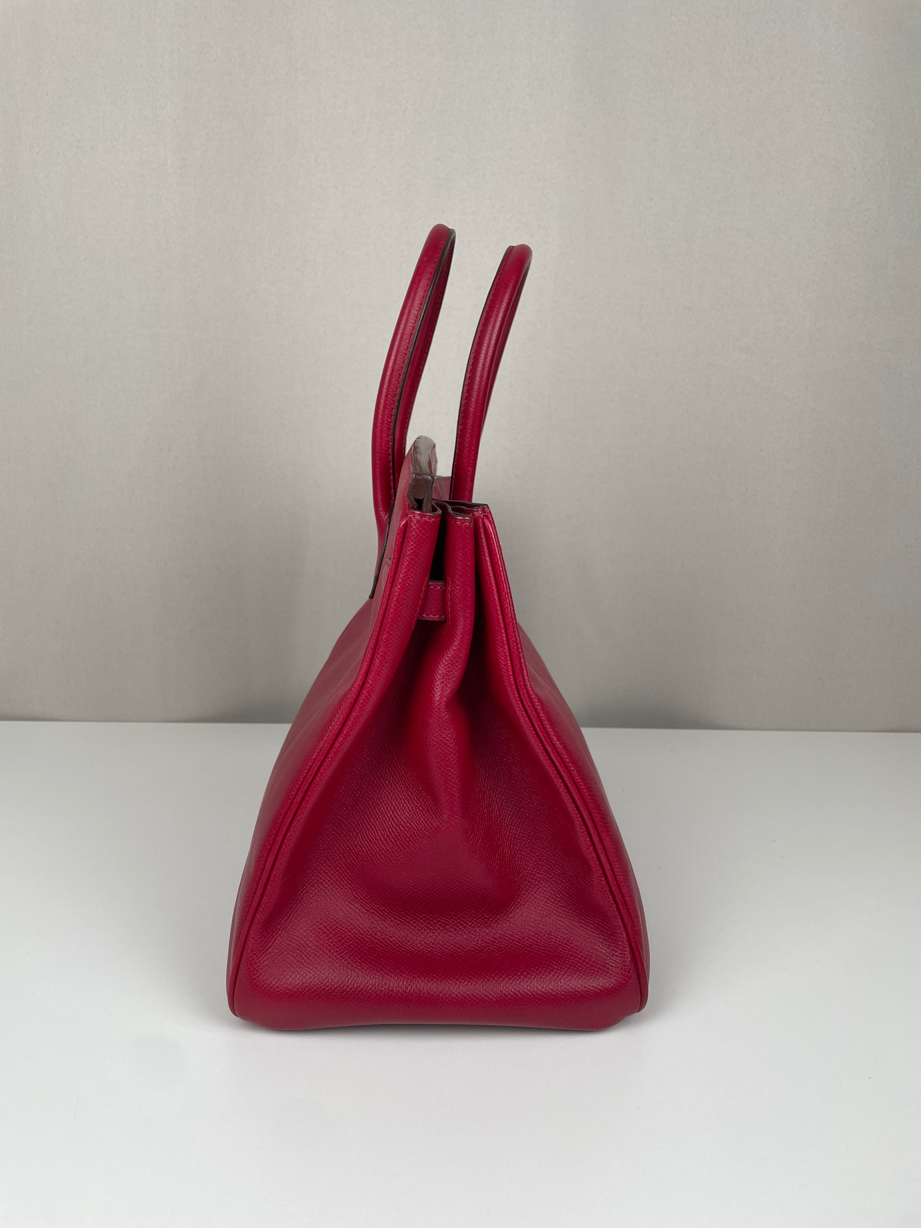 Ce sac Hermès Birkin 35 Epsom framboise et finitions dorées est en très bon état. Le cuir présente quelques traces d'usure minimimes et naturels. Les deux anses en cuir sont également en très bon état. Les coins sont également en très bon état. L'intérieur est en très bon état. La bijouterie est également en très bon état, micro rayure c'est un sac de 2010. Le sac est fourni avec un cadenas, une clé et une housse de protection de la maison le dustbag.