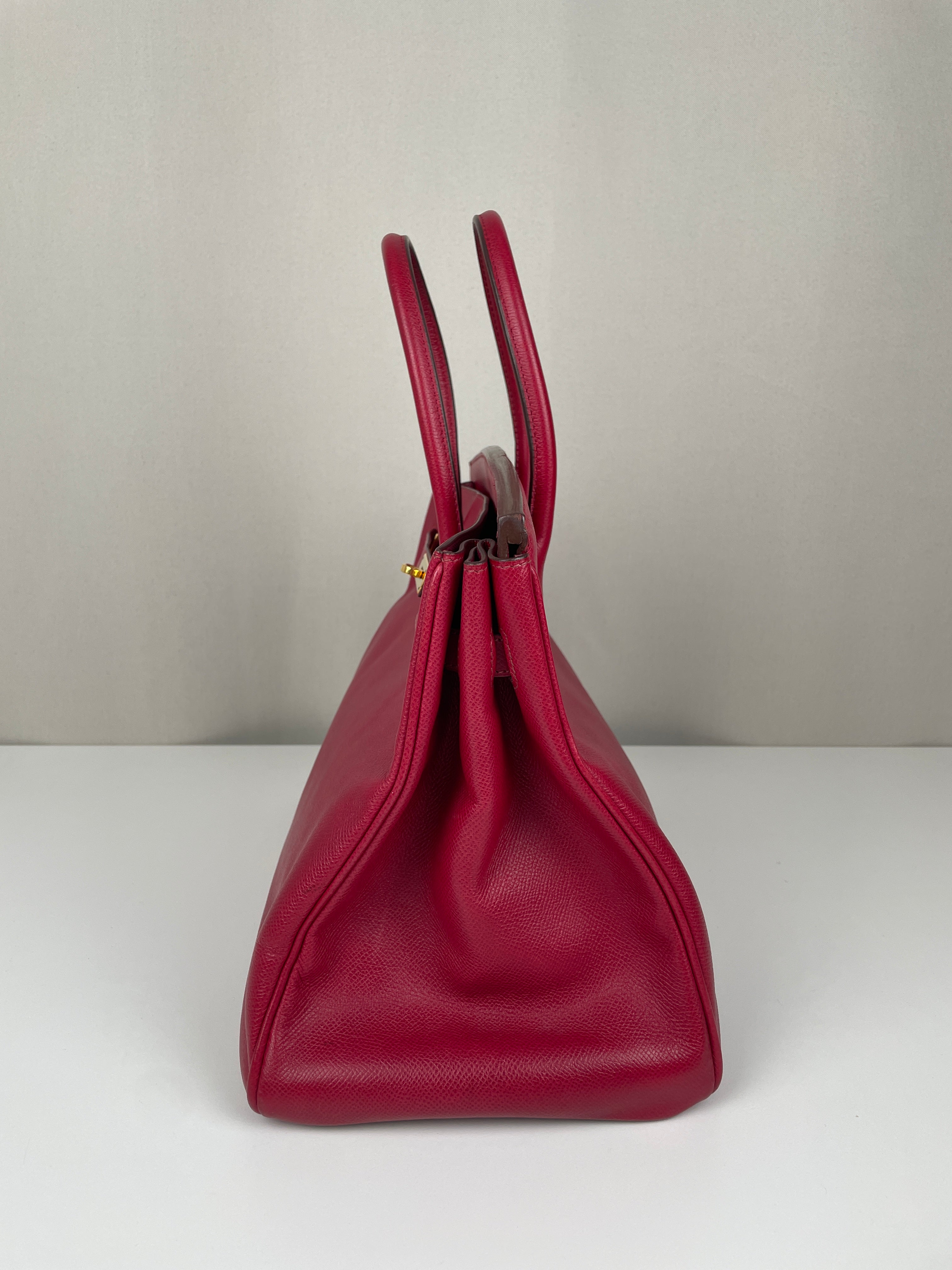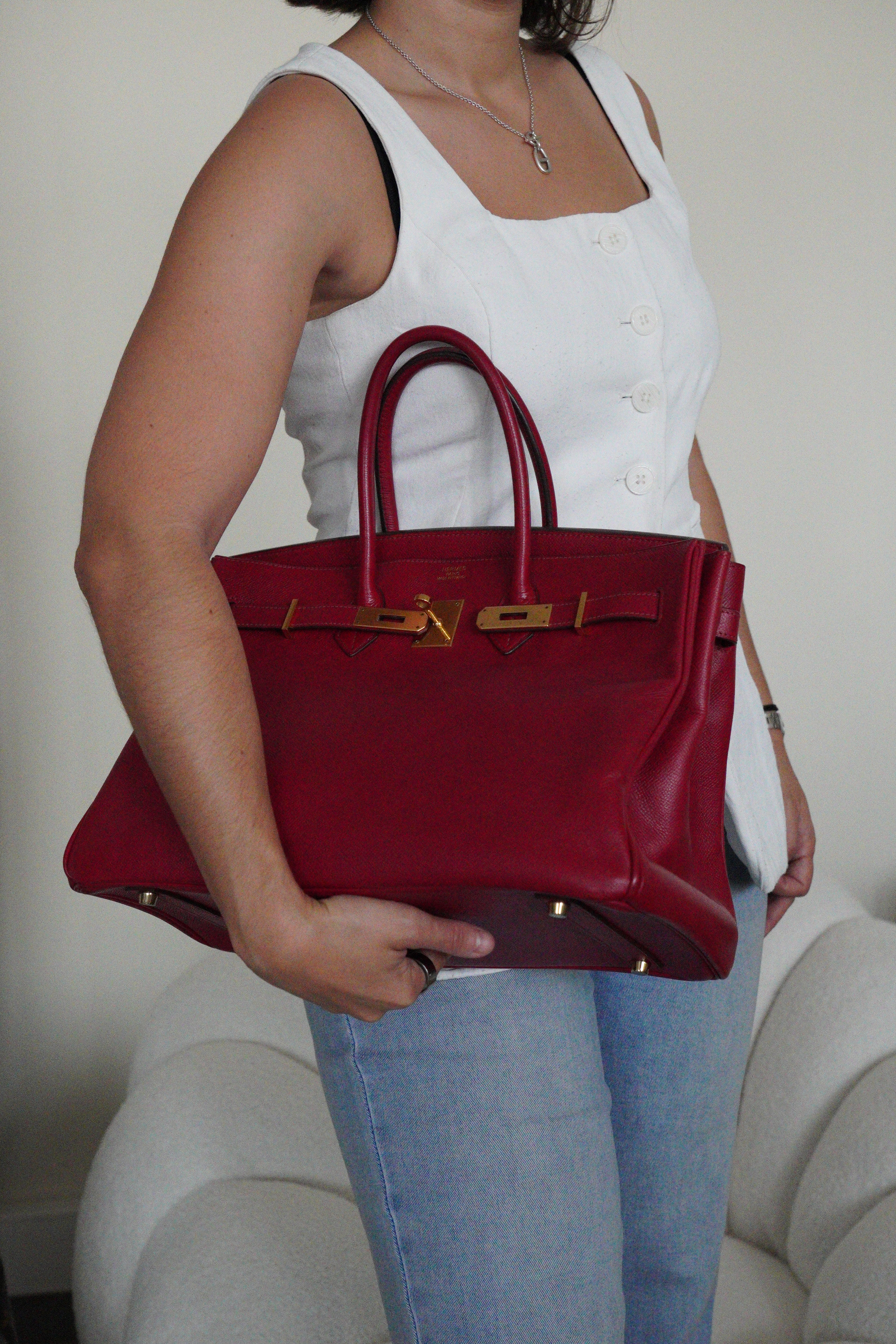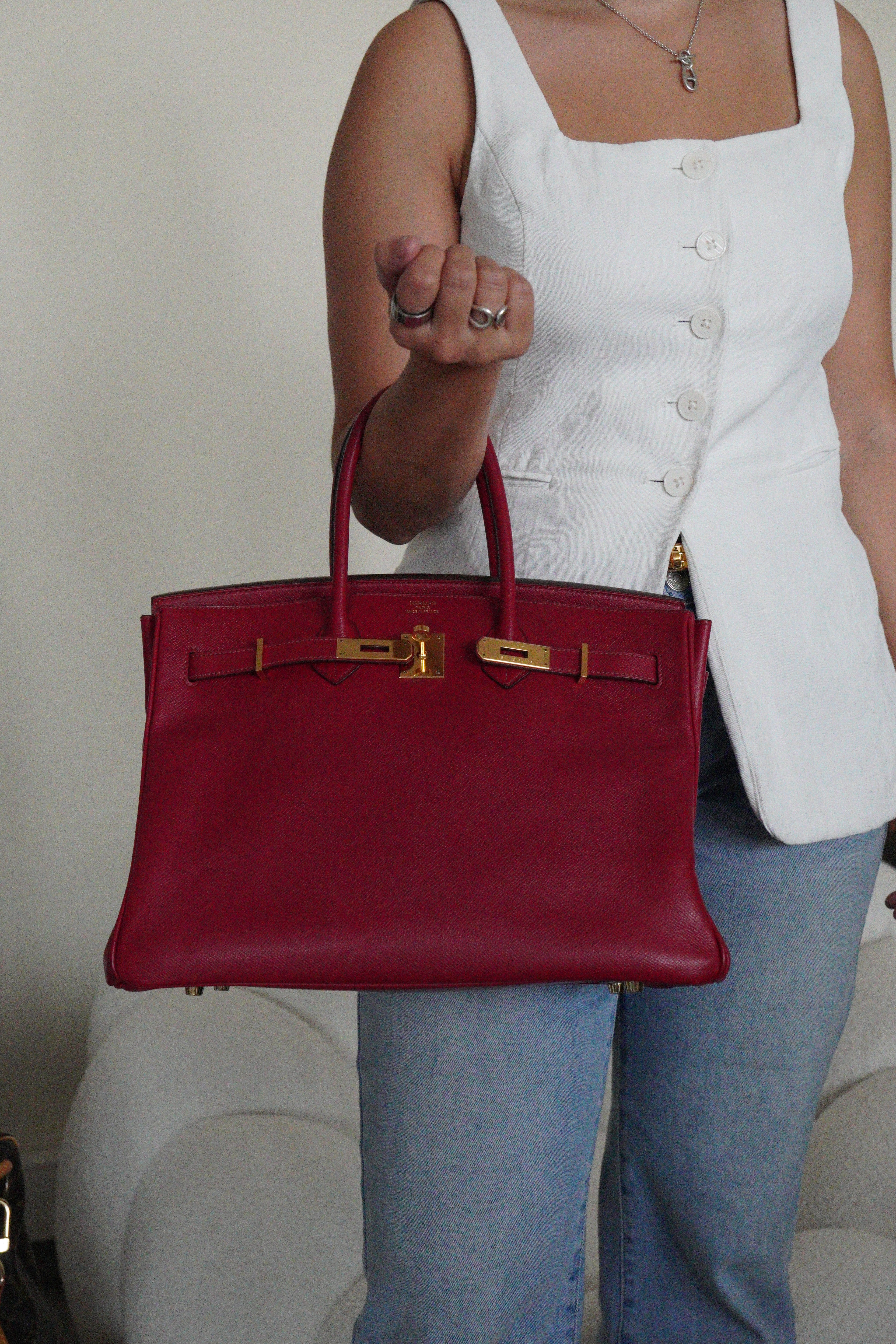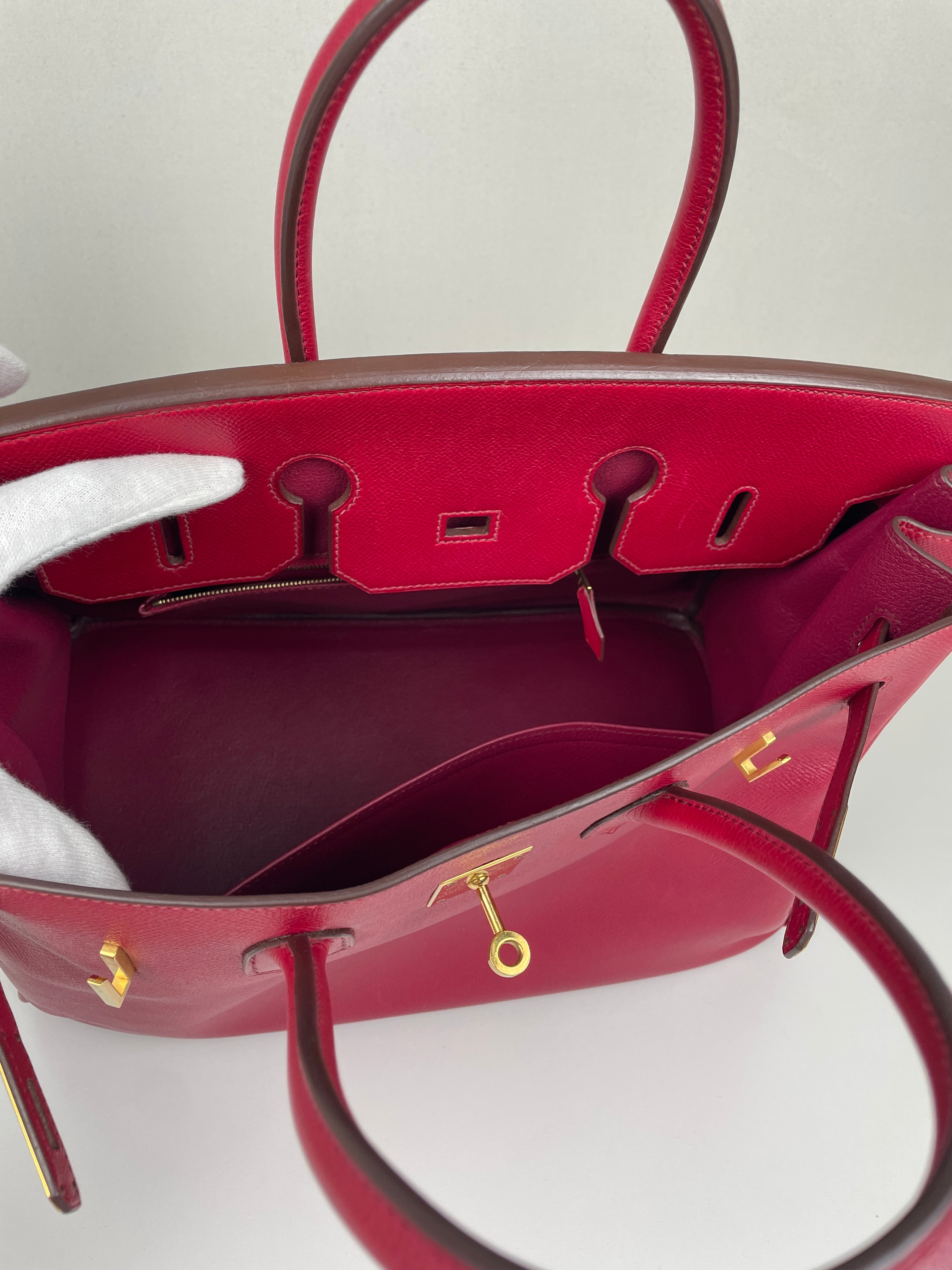 Ce sac Hermès Birkin 35 Epsom framboise et finitions dorées est en très bon état. Le cuir présente quelques traces d'usure minimimes et naturels. Les deux anses en cuir sont également en très bon état. Les coins sont également en très bon état. L'intérieur est en très bon état. La bijouterie est également en très bon état, micro rayure c'est un sac de 2010. Le sac est fourni avec un cadenas, une clé et une housse de protection de la maison le dustbag.