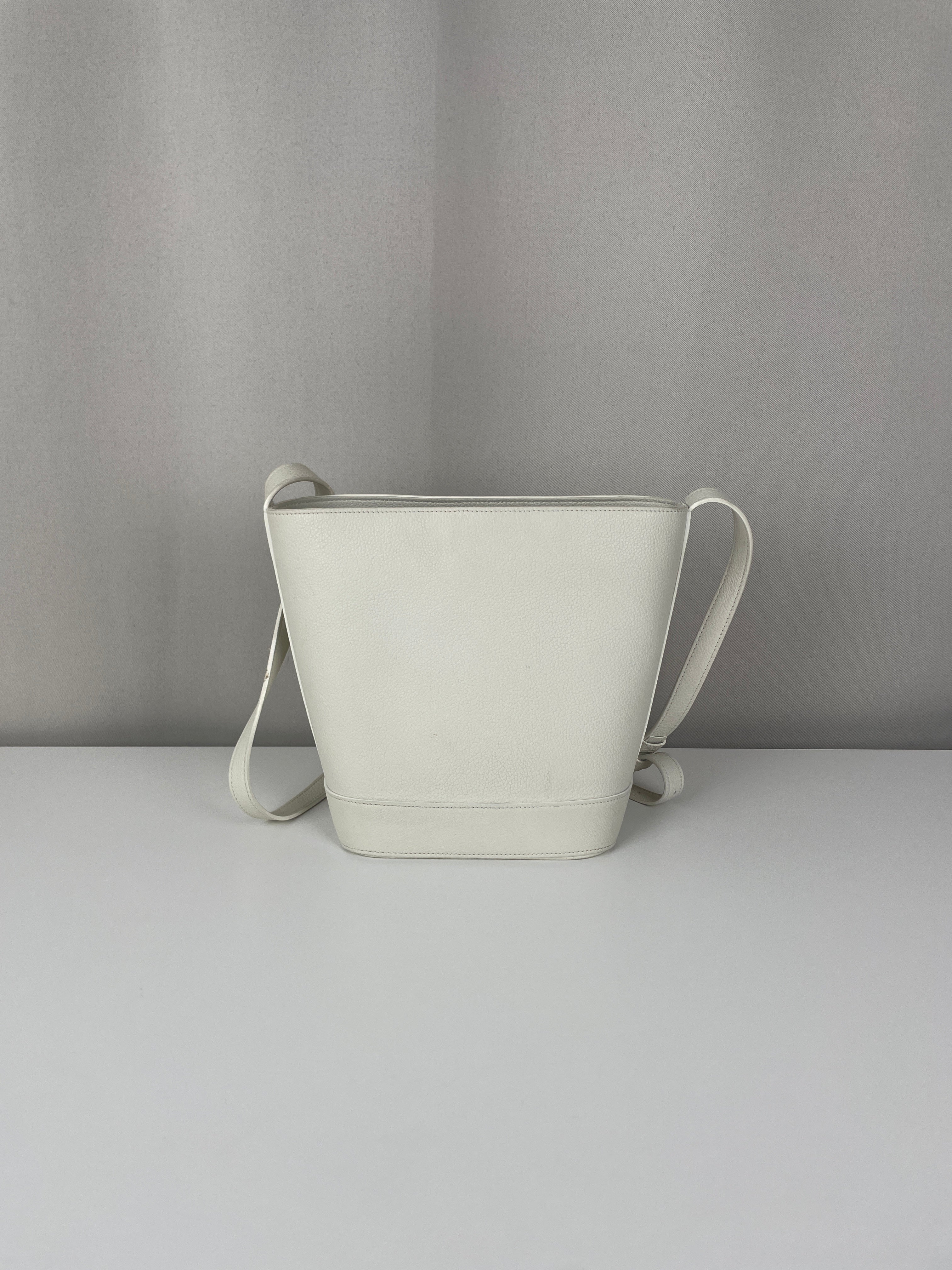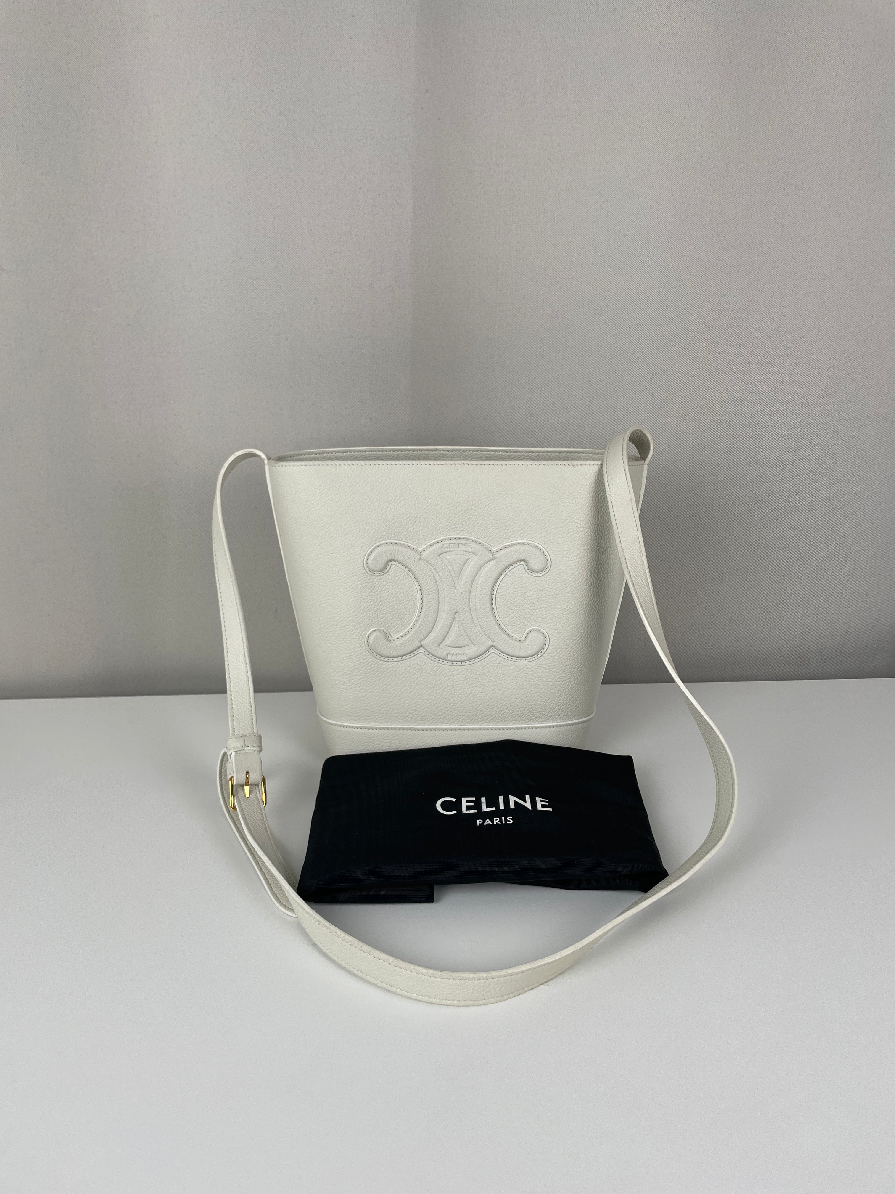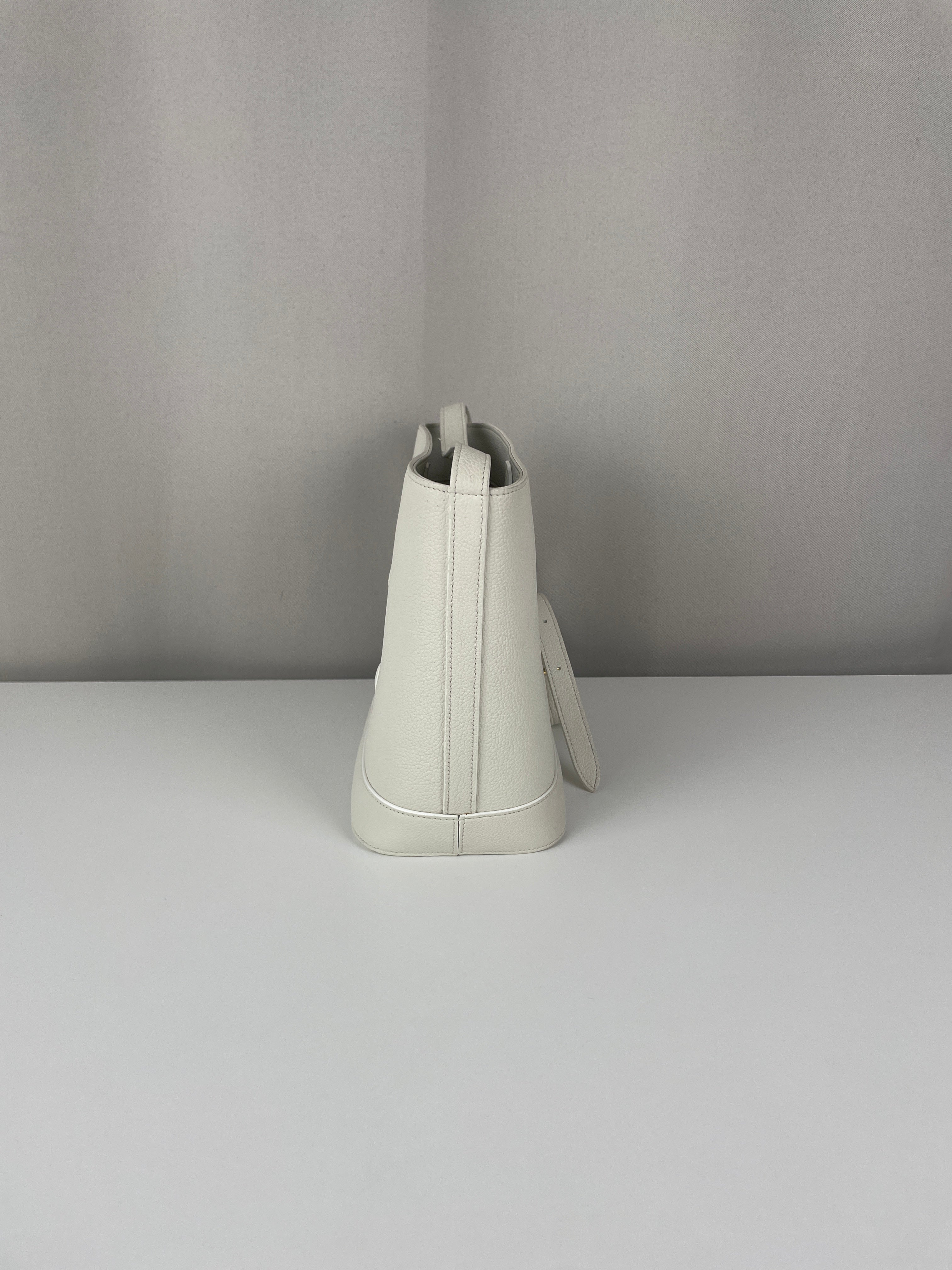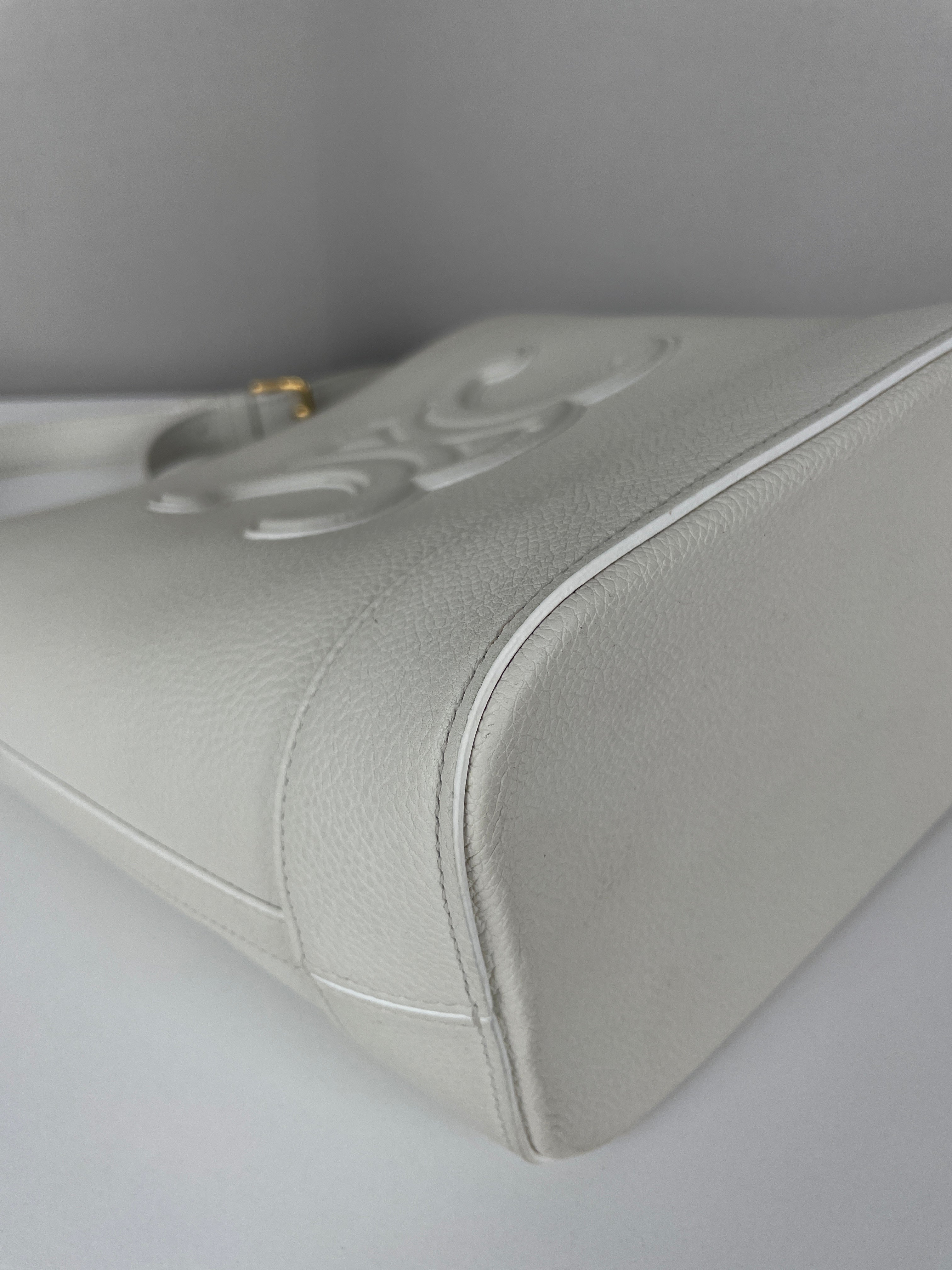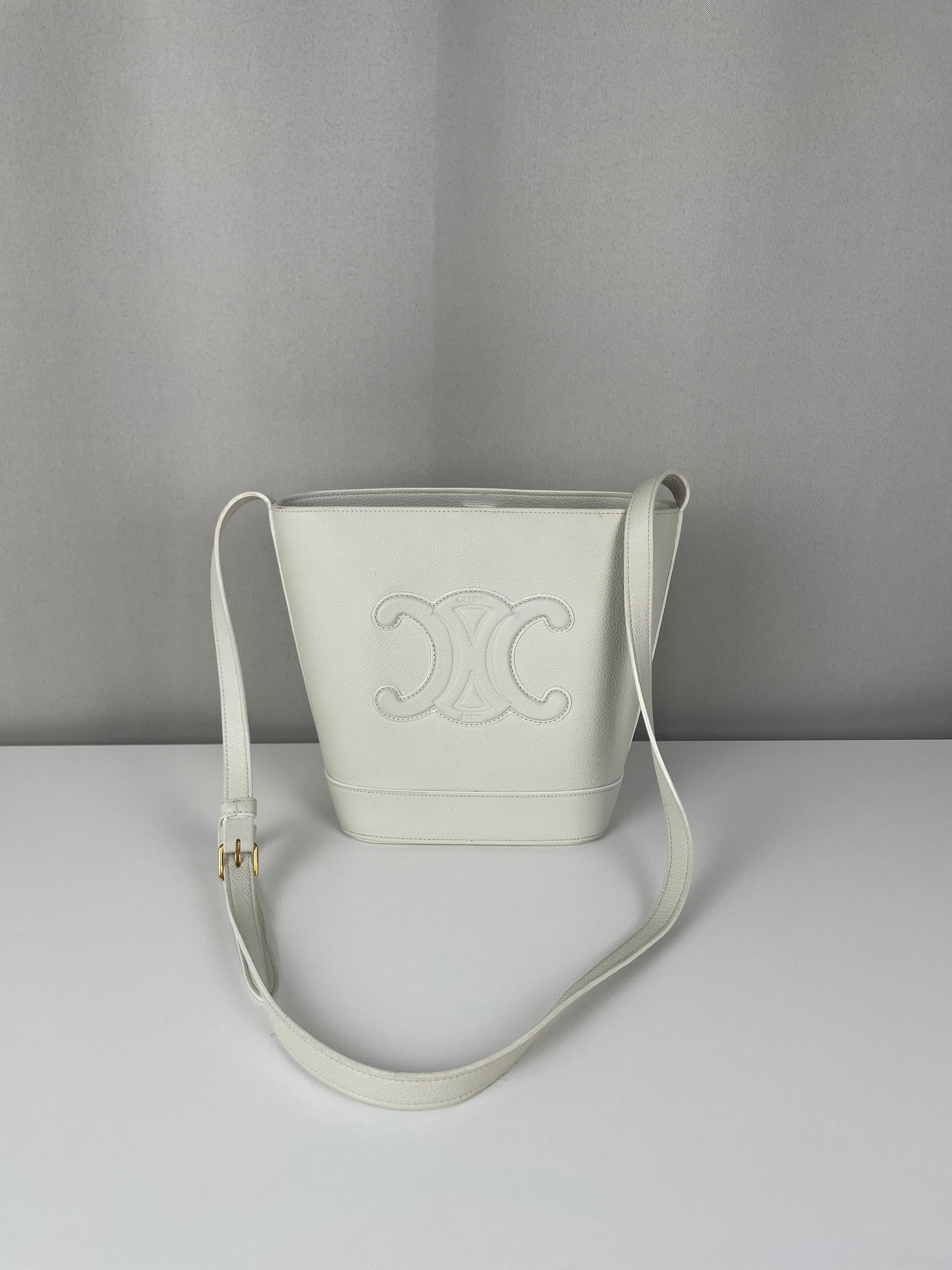 Le Bucket Triomphe est l'un des modèles contemporains les plus distinctifs de Céline. Cette édition en cuir blanc illustre l'approche architecturale du savoir-faire de luxe de la maison. Le cuir reste en bon état dans l'ensemble, bien qu'il présente quelques marques dans certaines zones qui témoignent de son caractère authentique. Les angles conservent un bon état, et les finitions dorées offrent un beau contraste avec le cuir blanc immaculé.