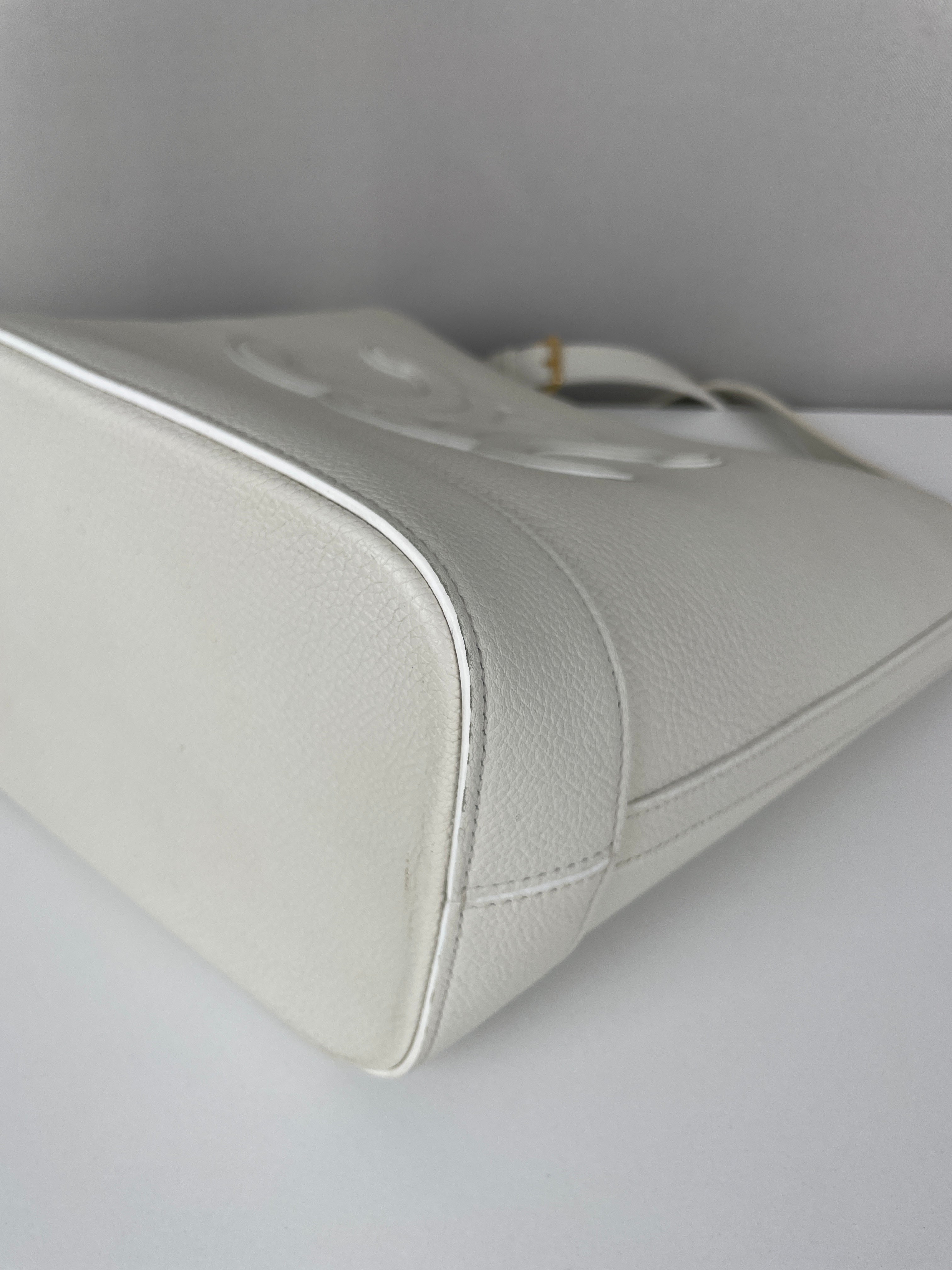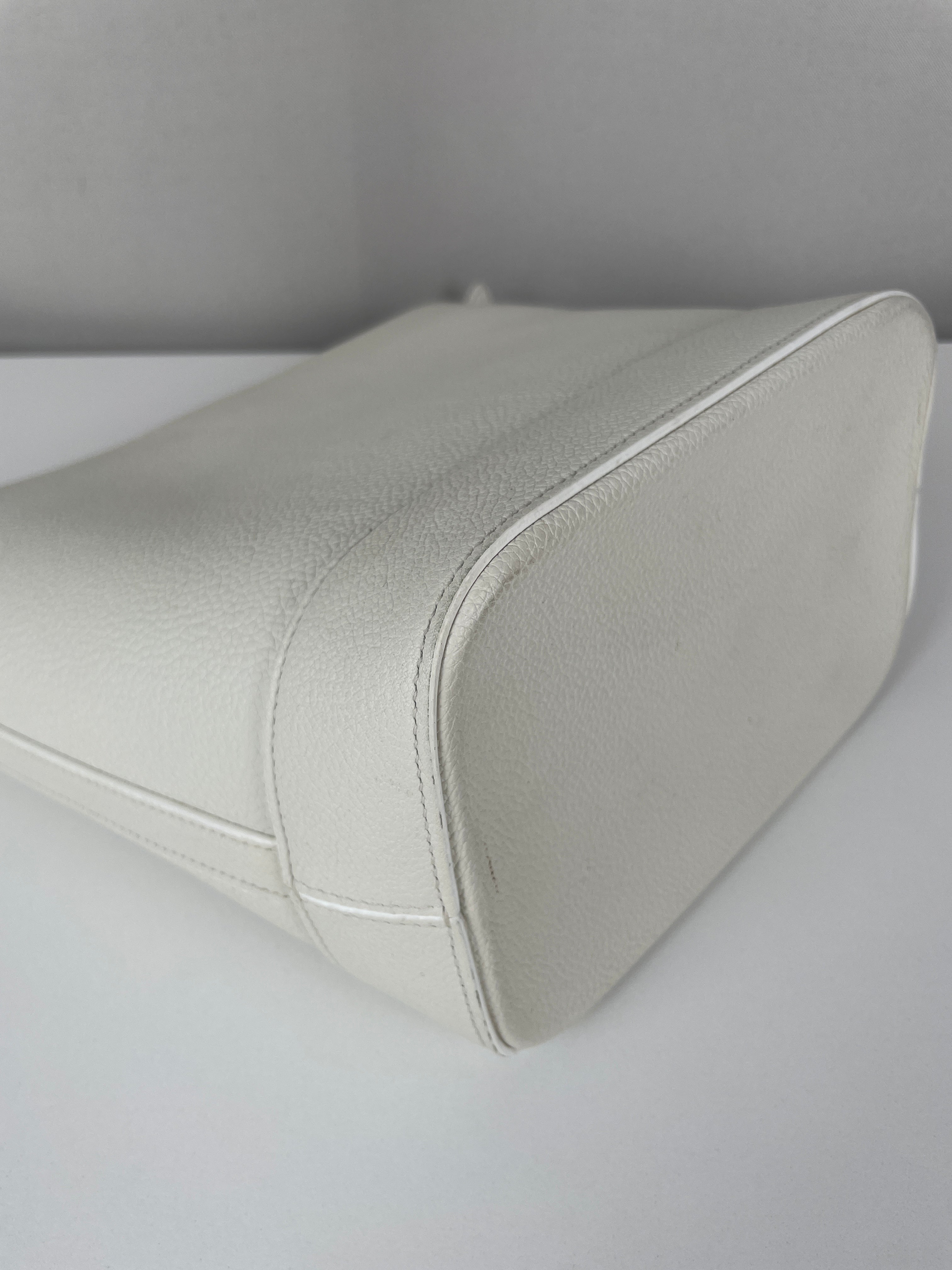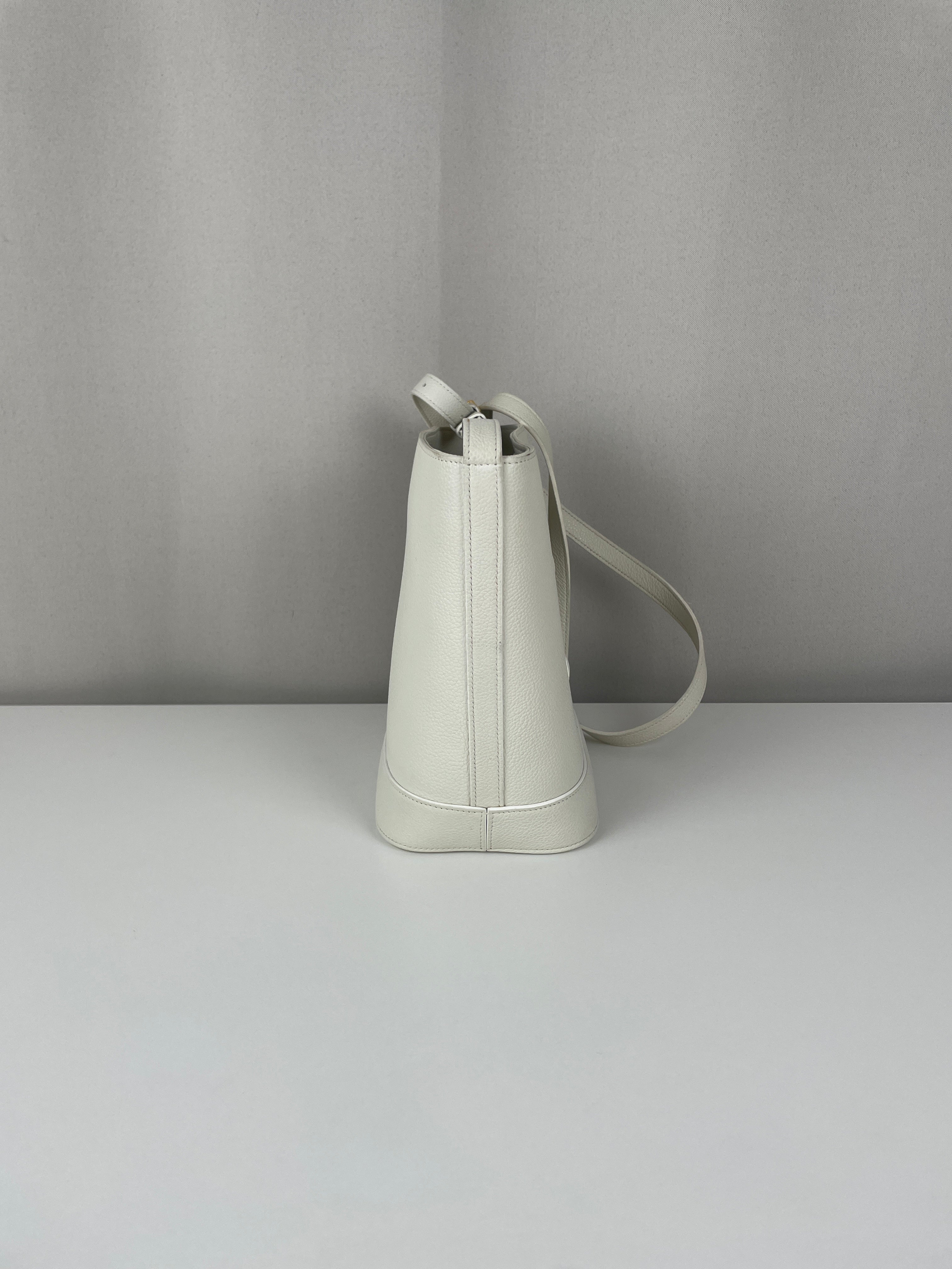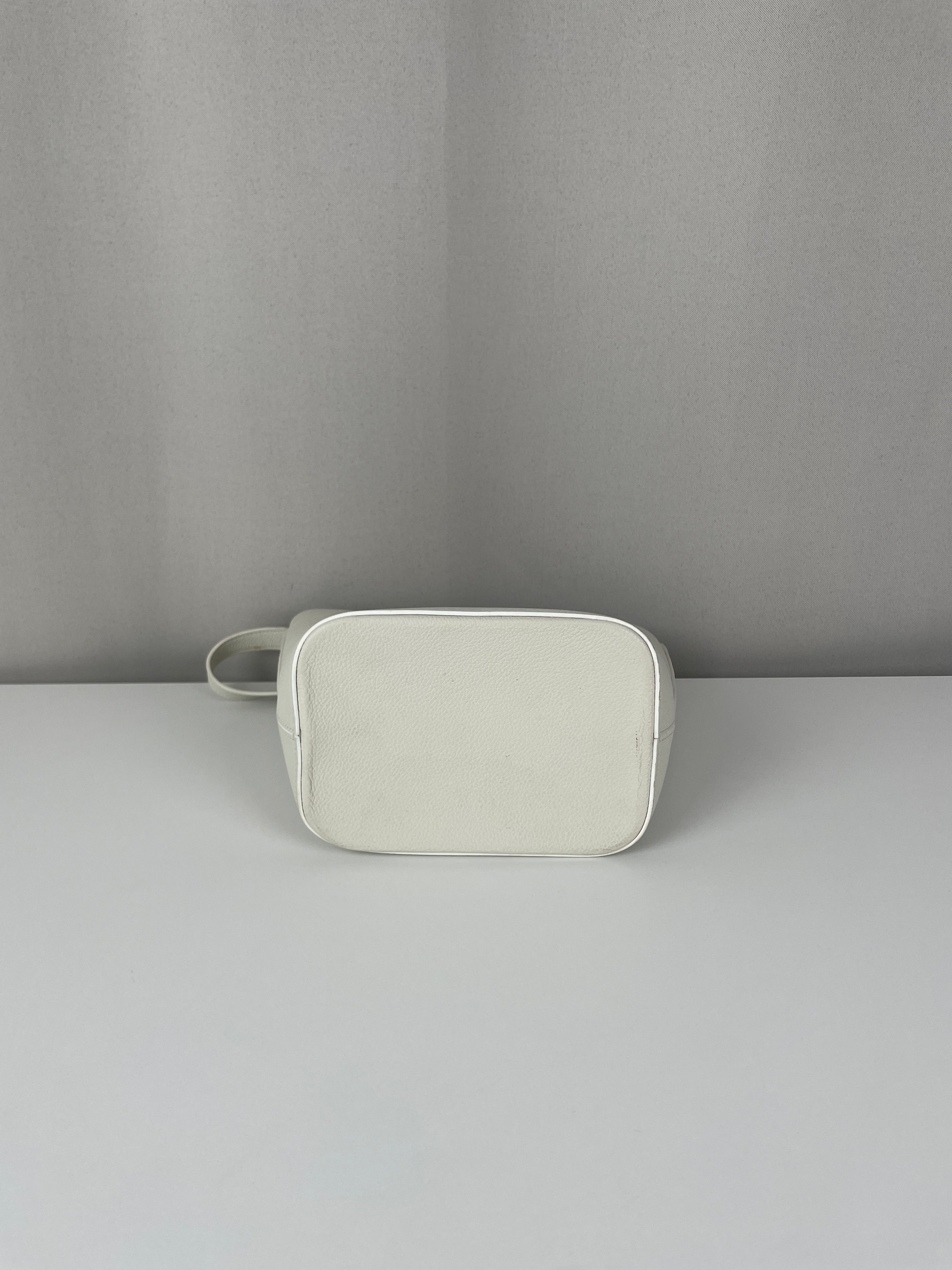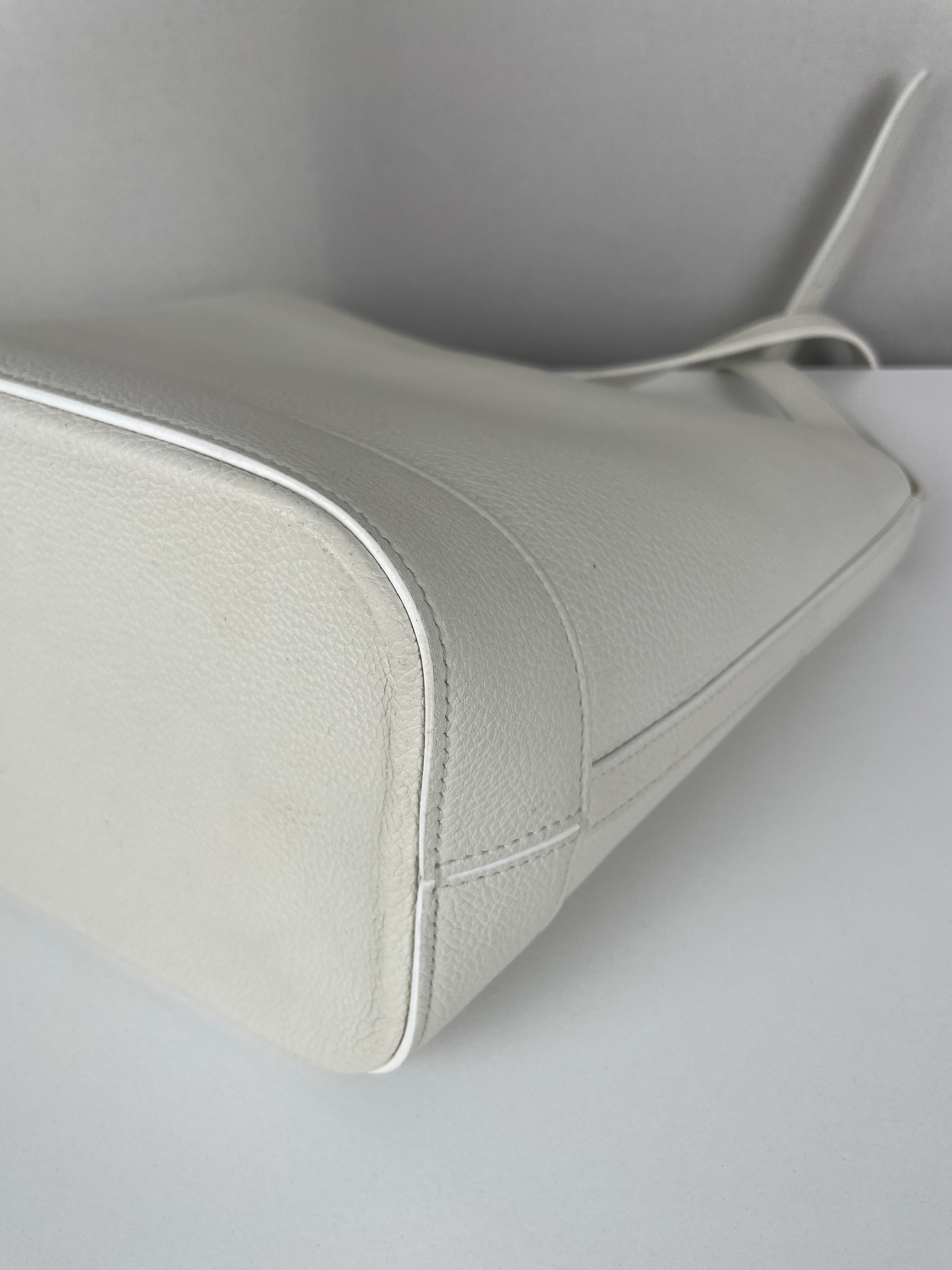 Le Bucket Triomphe est l'un des modèles contemporains les plus distinctifs de Céline. Cette édition en cuir blanc illustre l'approche architecturale du savoir-faire de luxe de la maison. Le cuir reste en bon état dans l'ensemble, bien qu'il présente quelques marques dans certaines zones qui témoignent de son caractère authentique. Les angles conservent un bon état, et les finitions dorées offrent un beau contraste avec le cuir blanc immaculé.