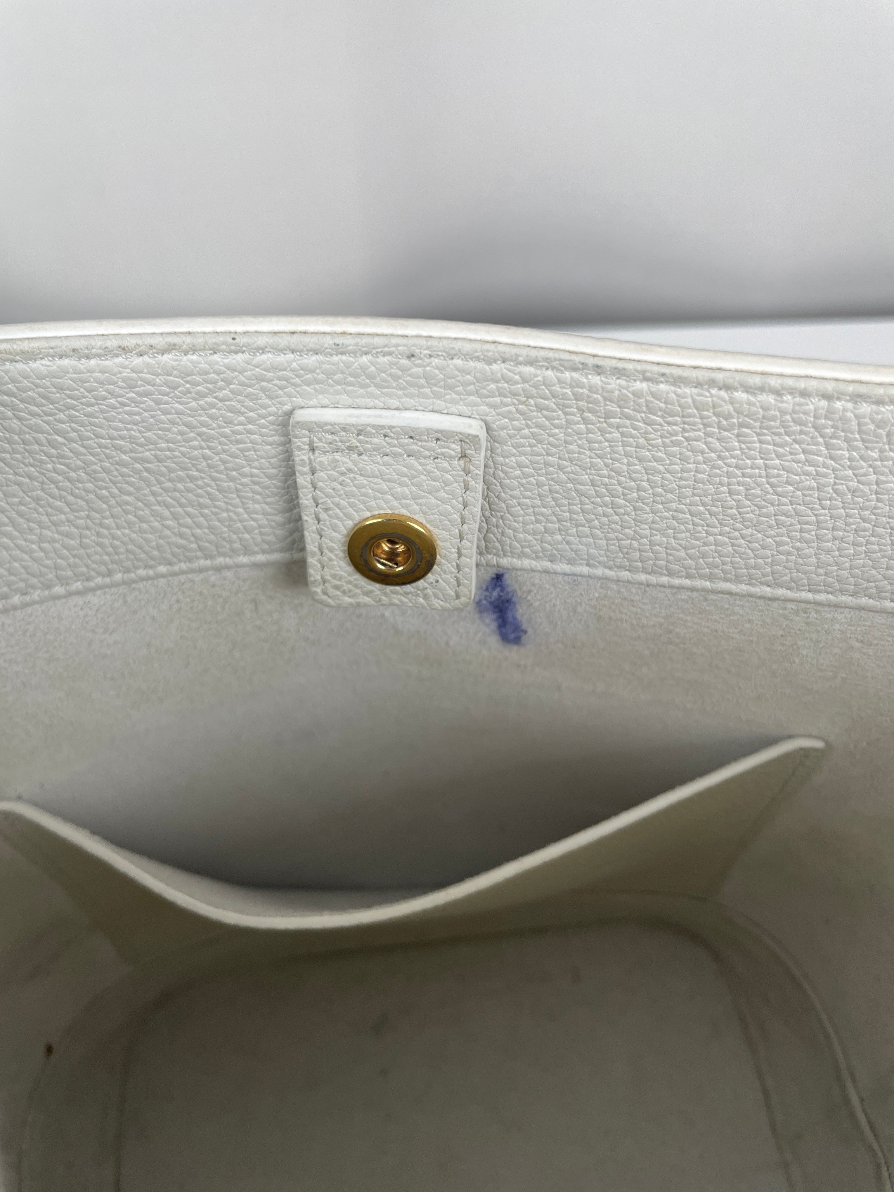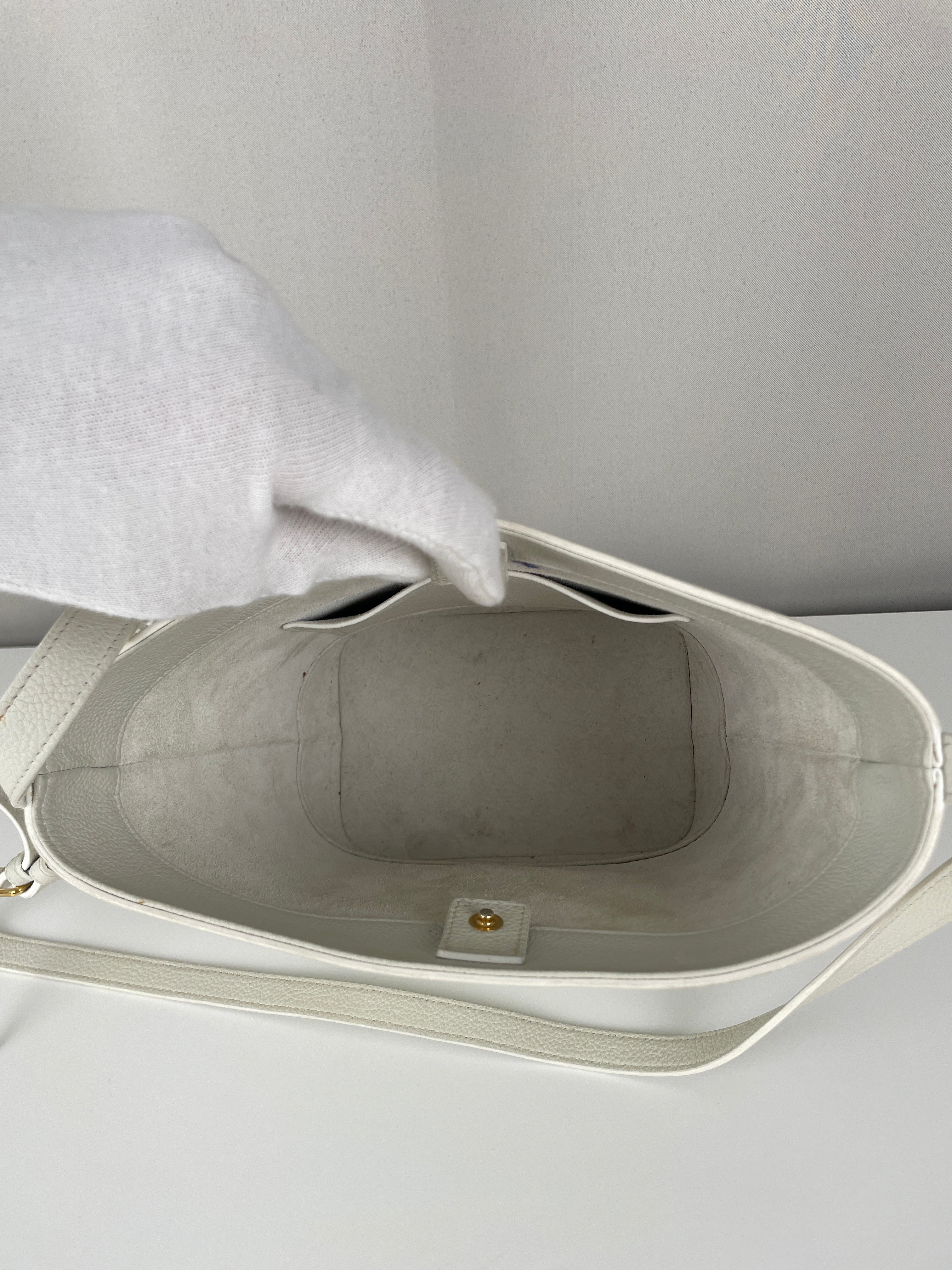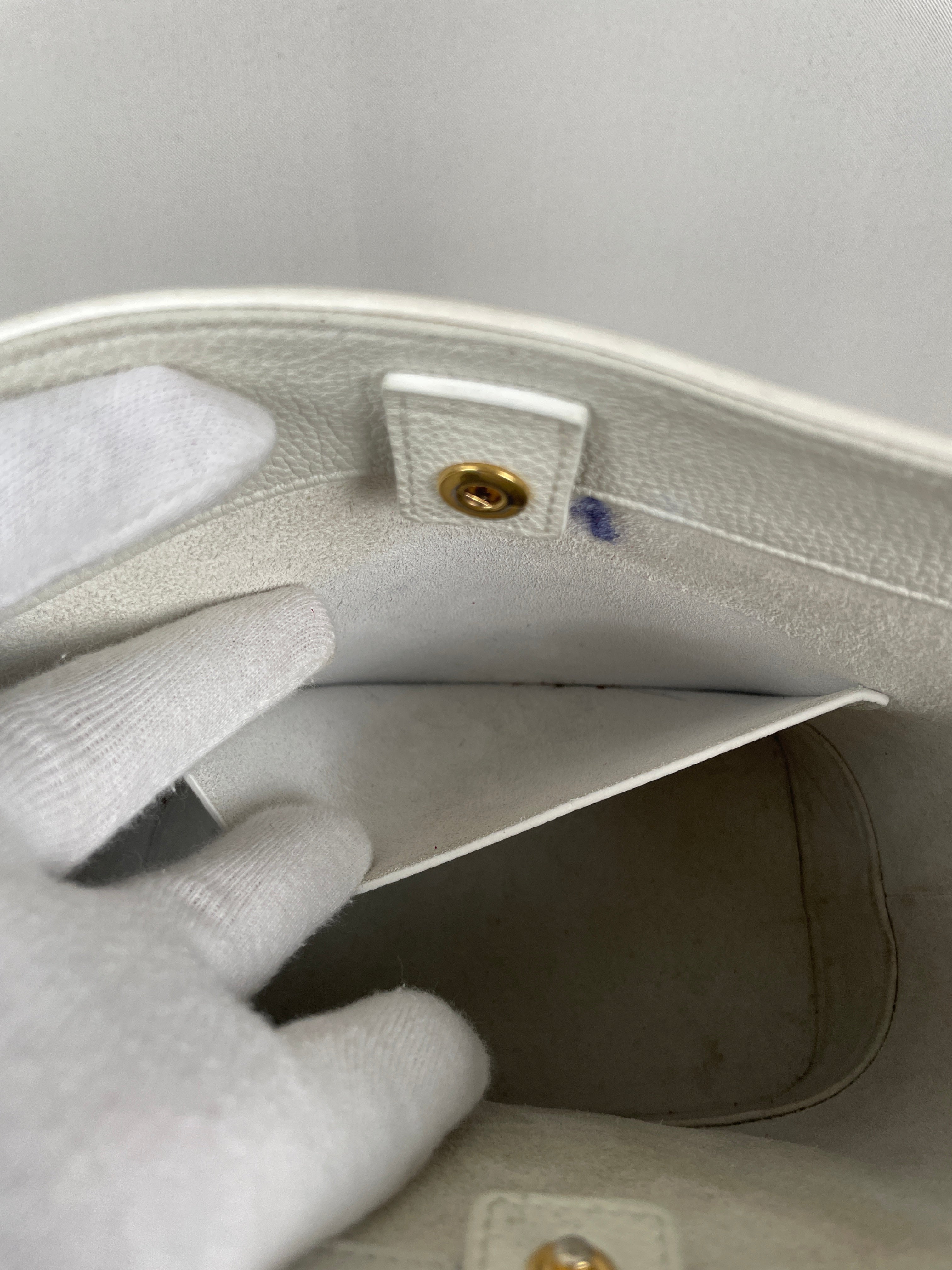 L'intérieur montre des signes d'usure incluant une marque de stylo qui ajoute à son charme vécu. La bandoulière présente quelques signes légers d'usure dus à un usage délicat. Une pièce remarquable qui incarne la sophistication moderne et l'élégance minimaliste de Céline dans un blanc saisissant.