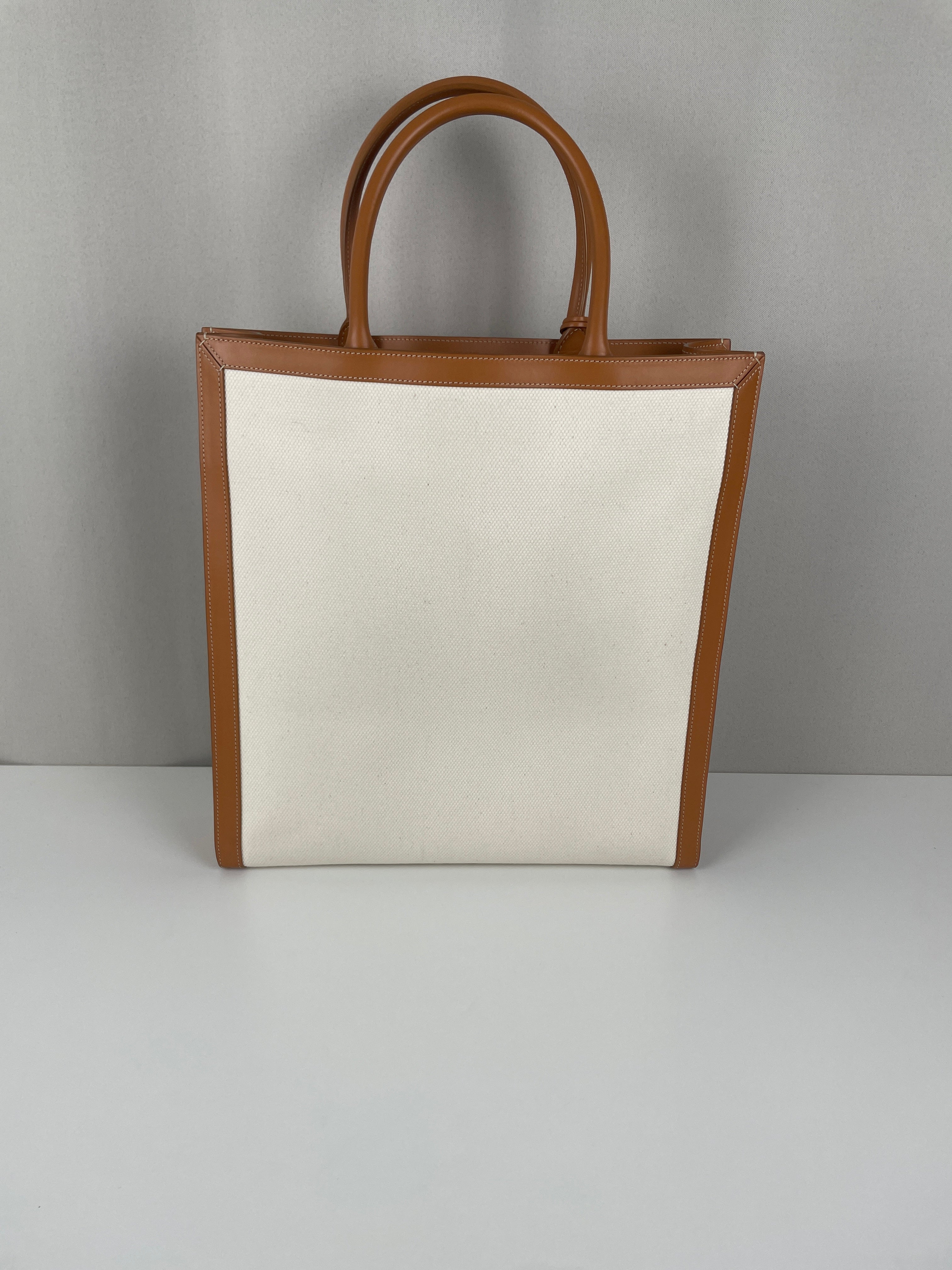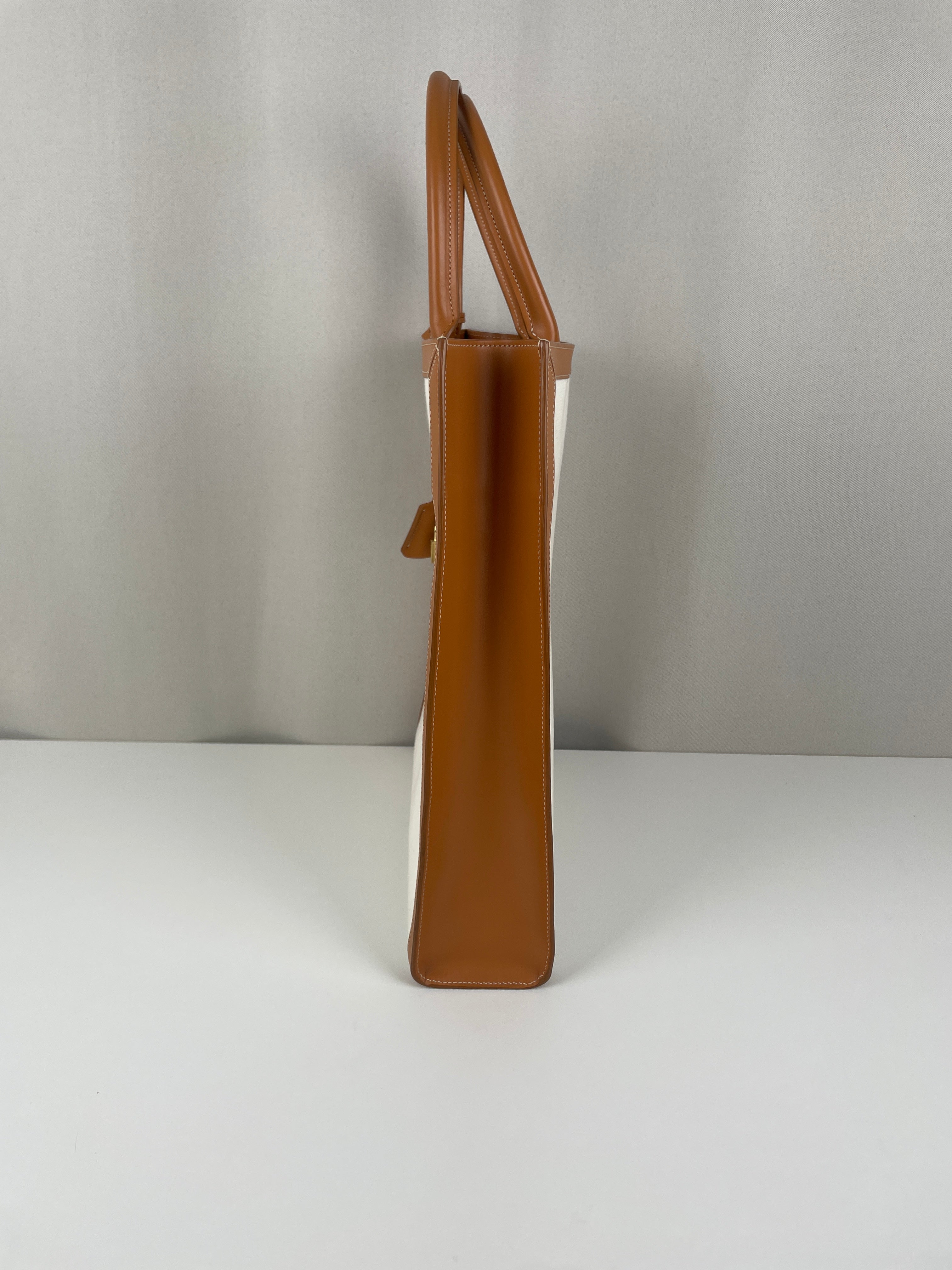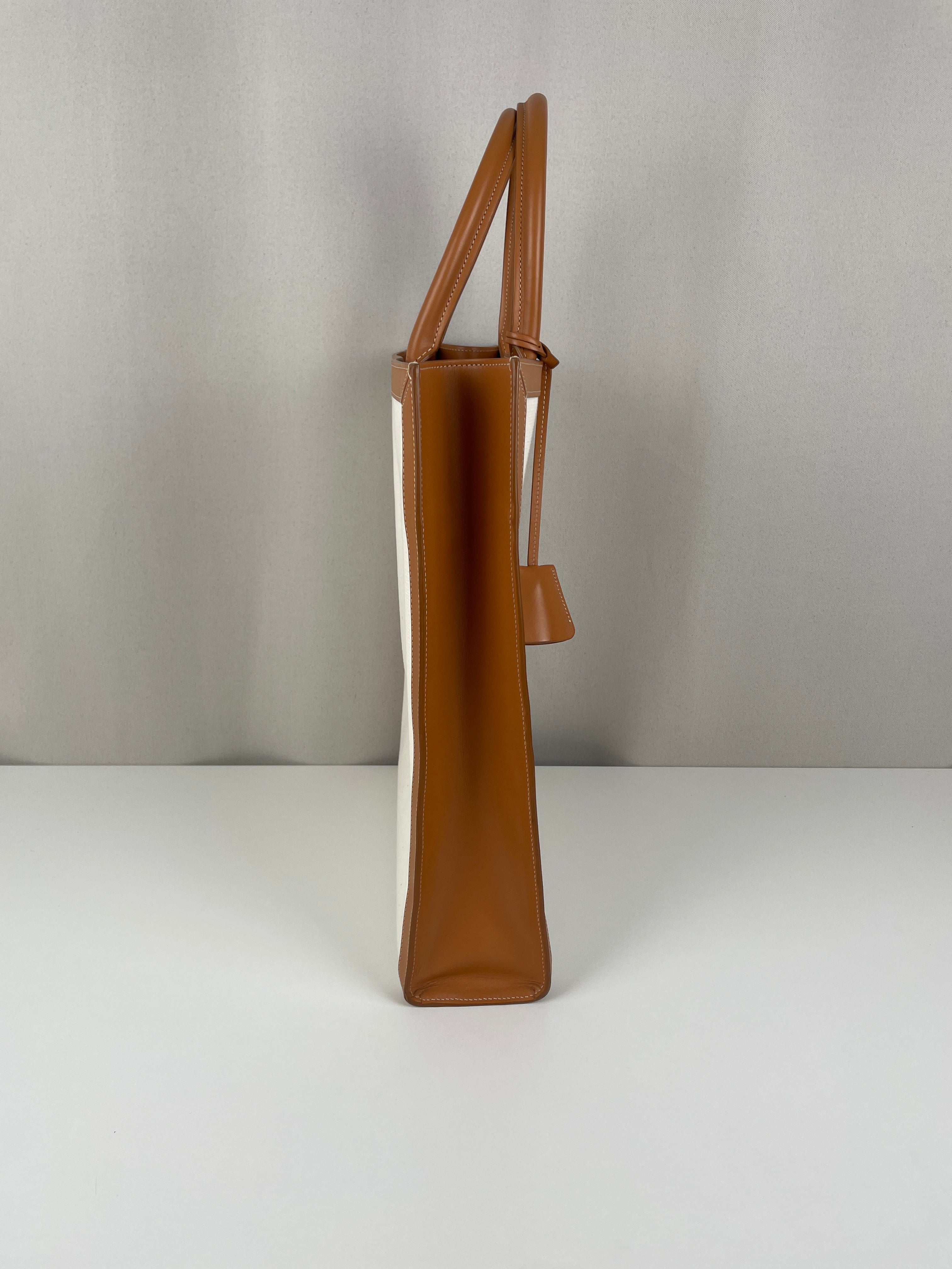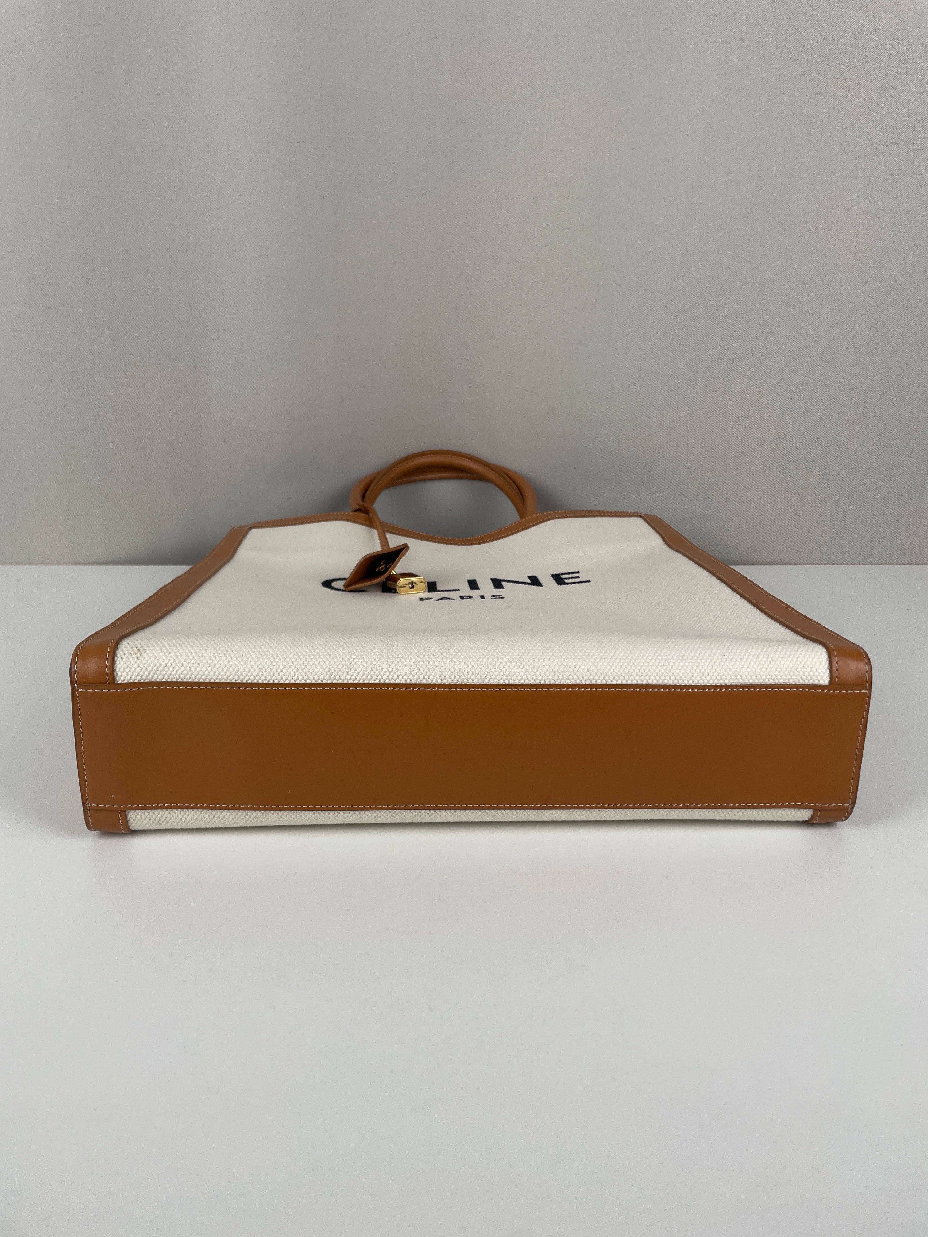 Sac Céline cabas vertical en tissu crème et cuir marron