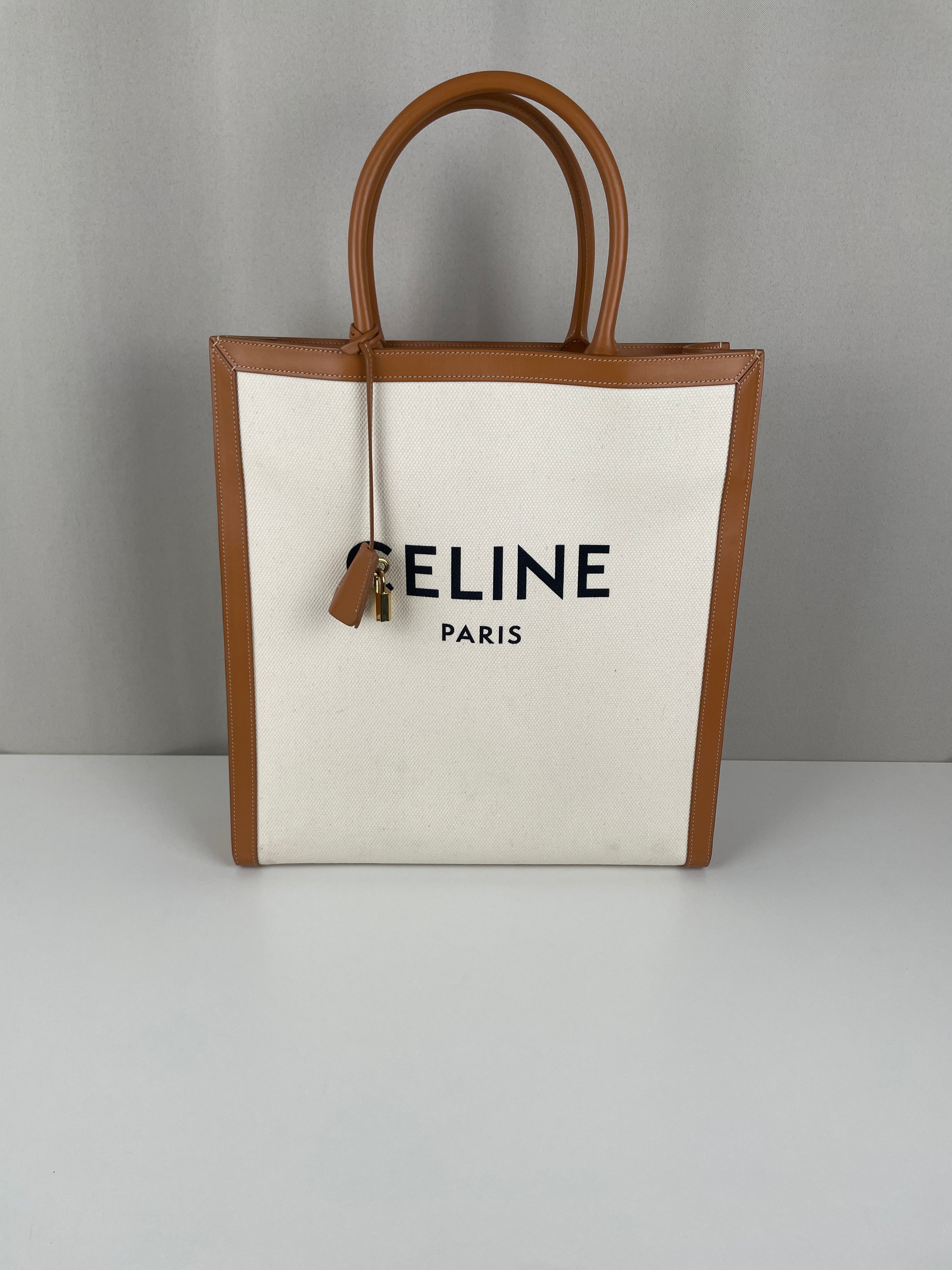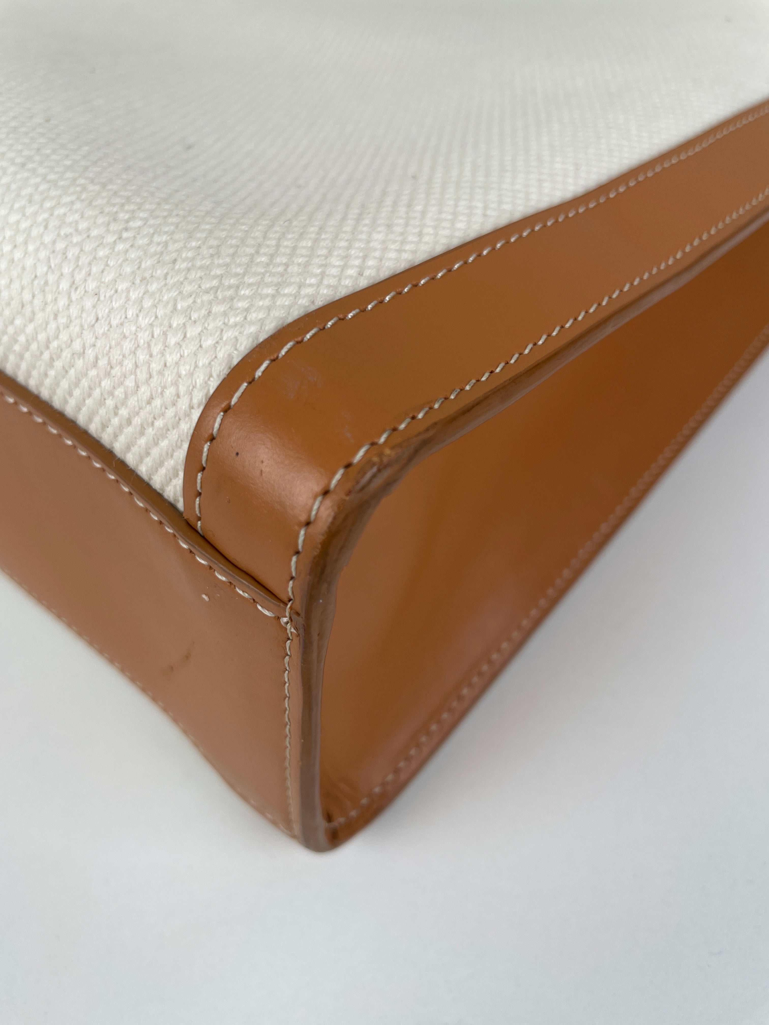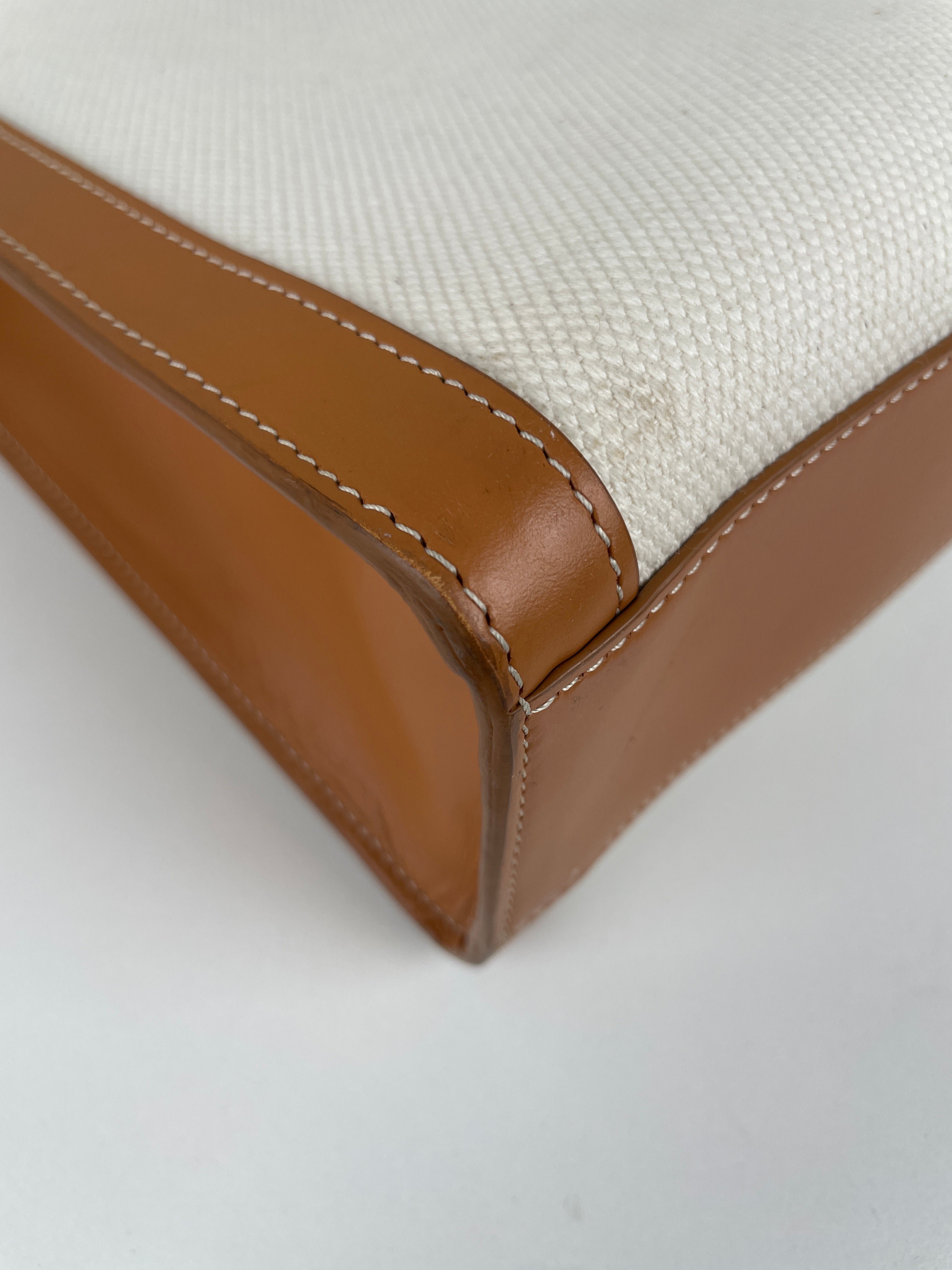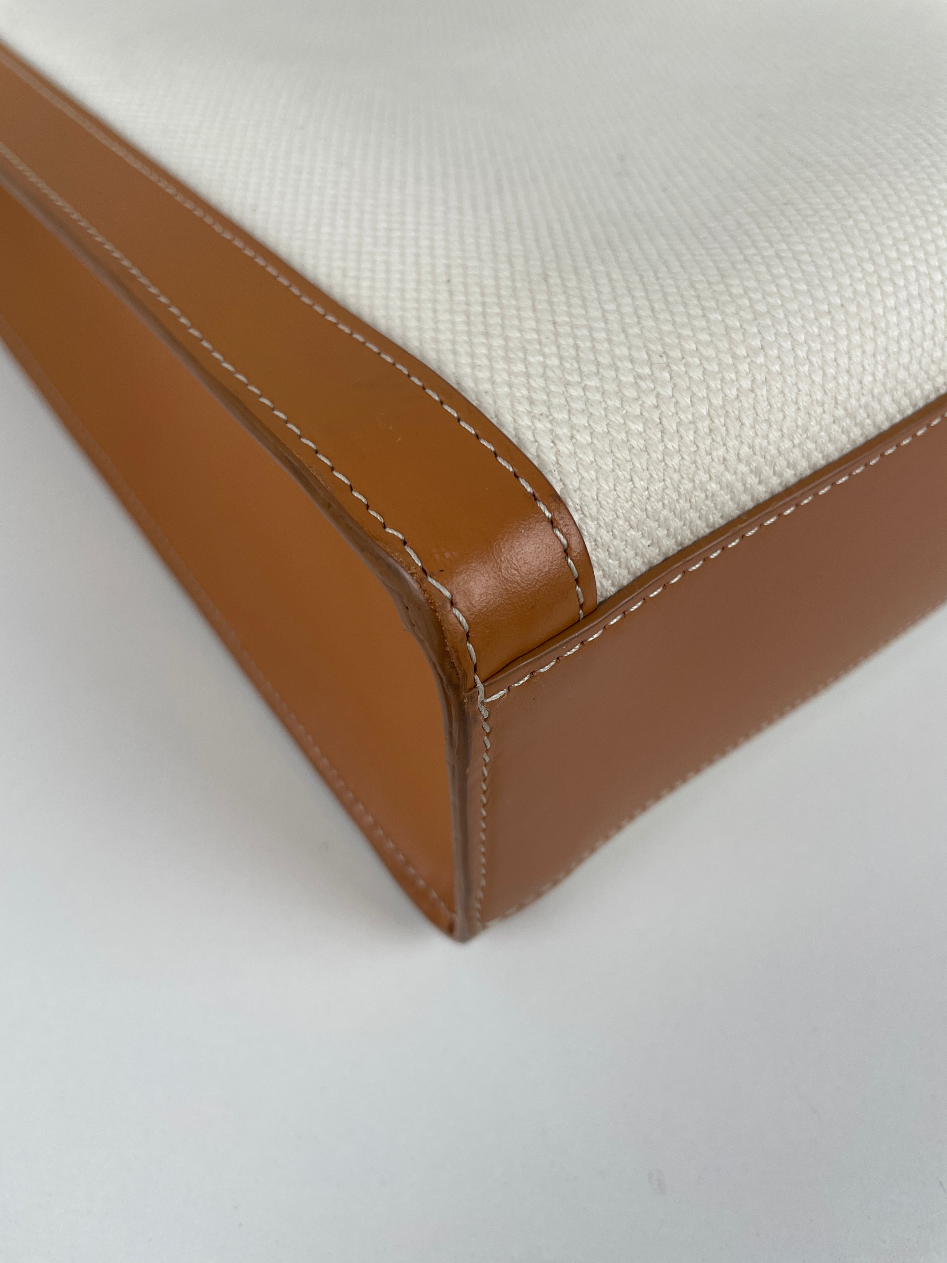 Sac Céline cabas vertical en tissu crème et cuir marron