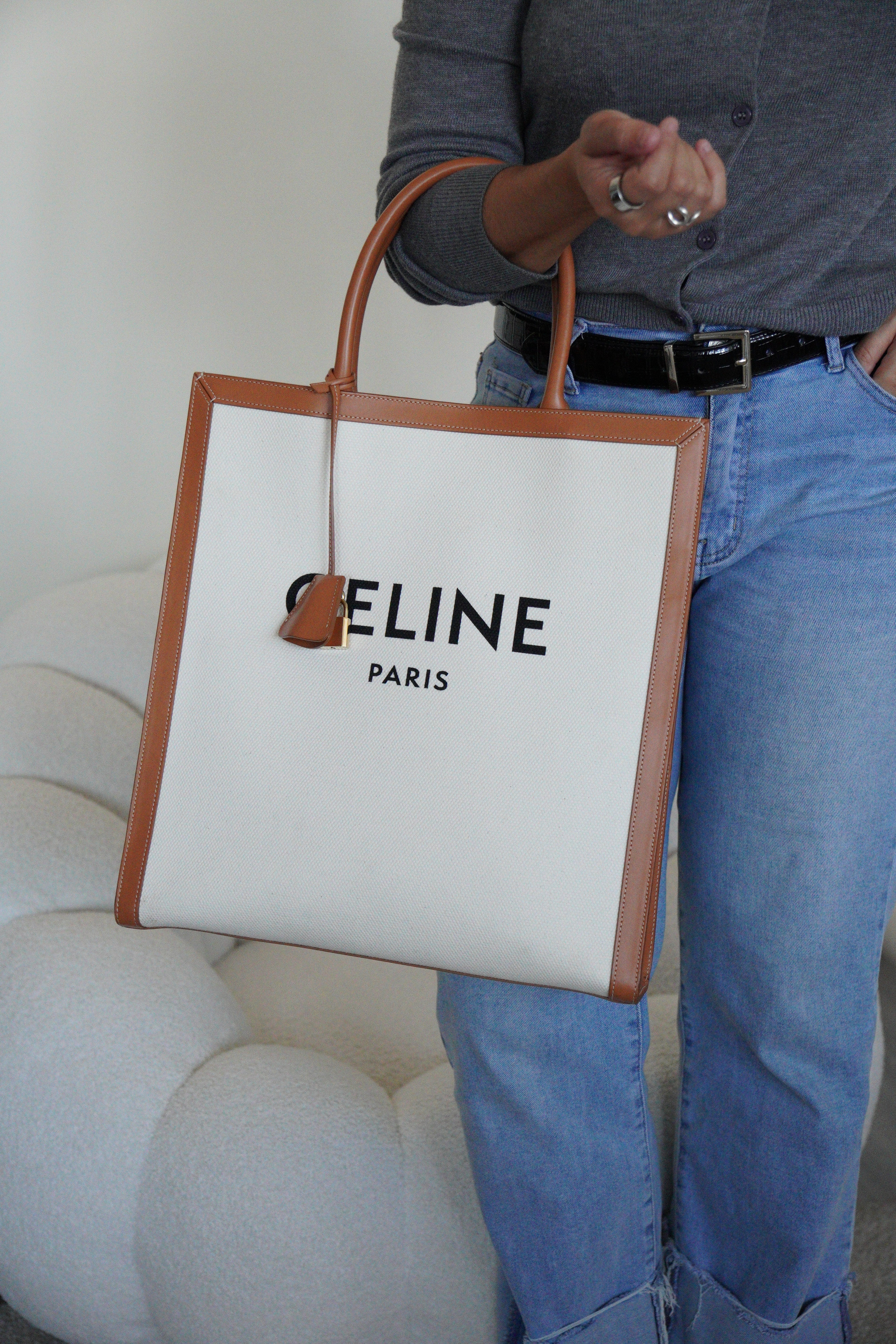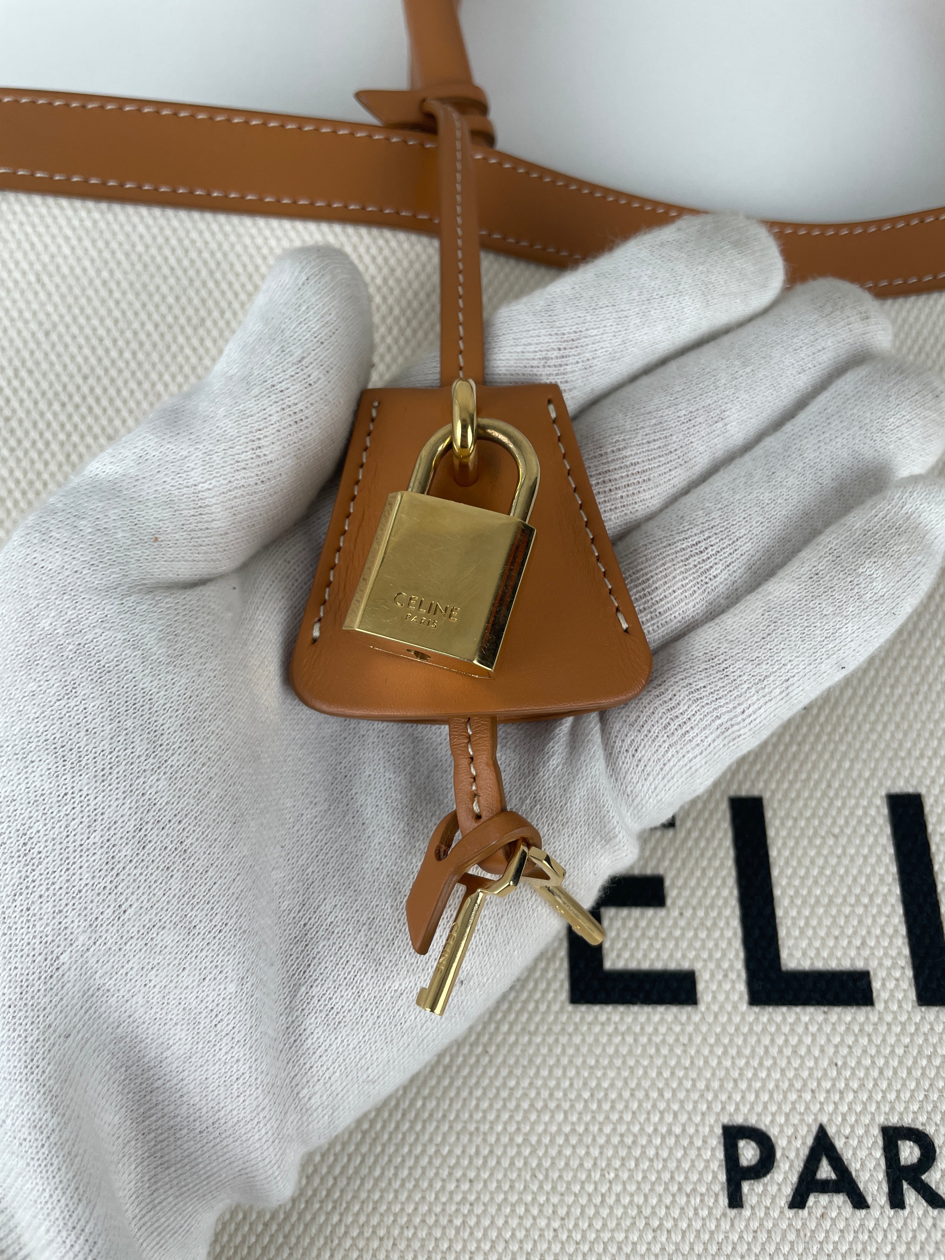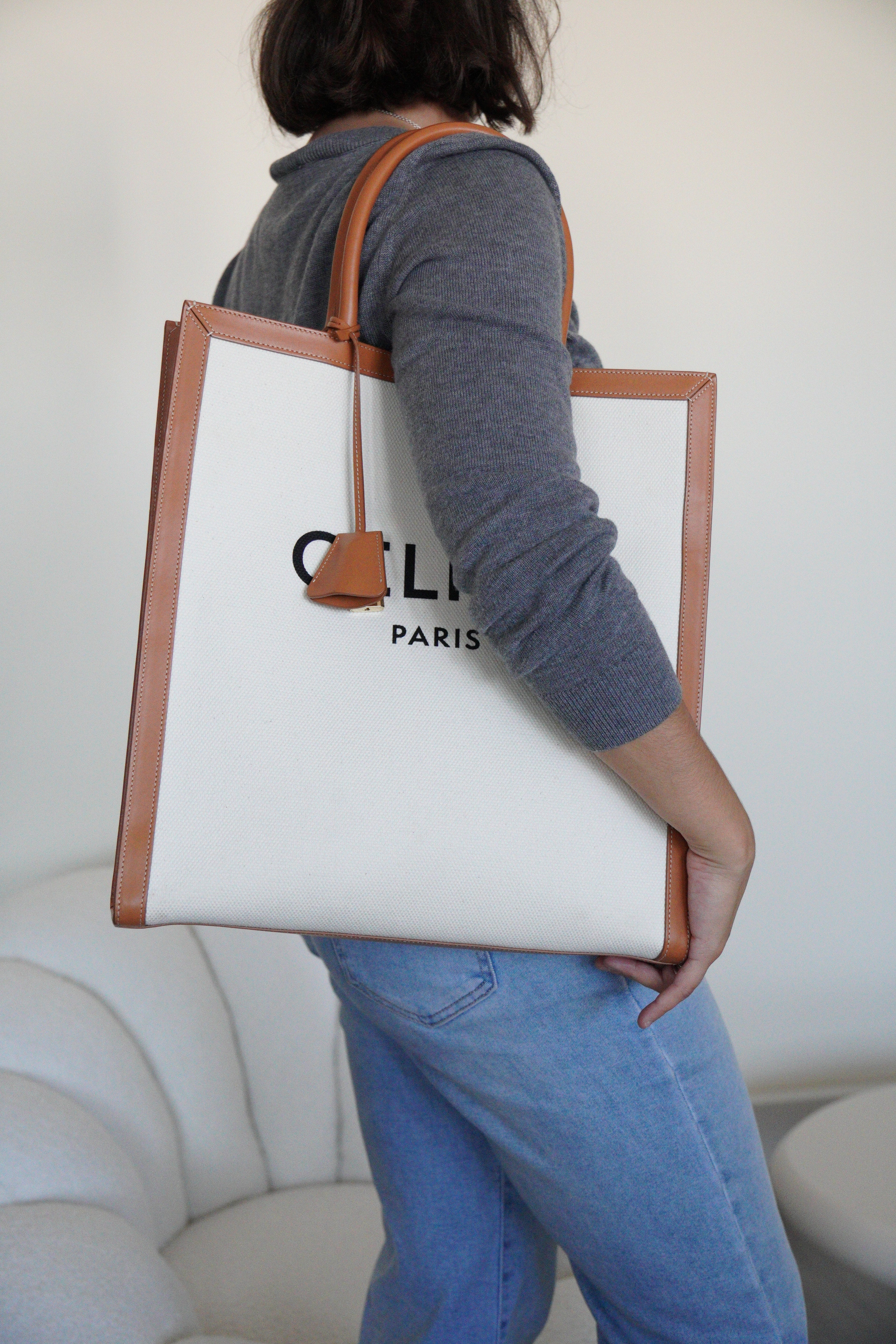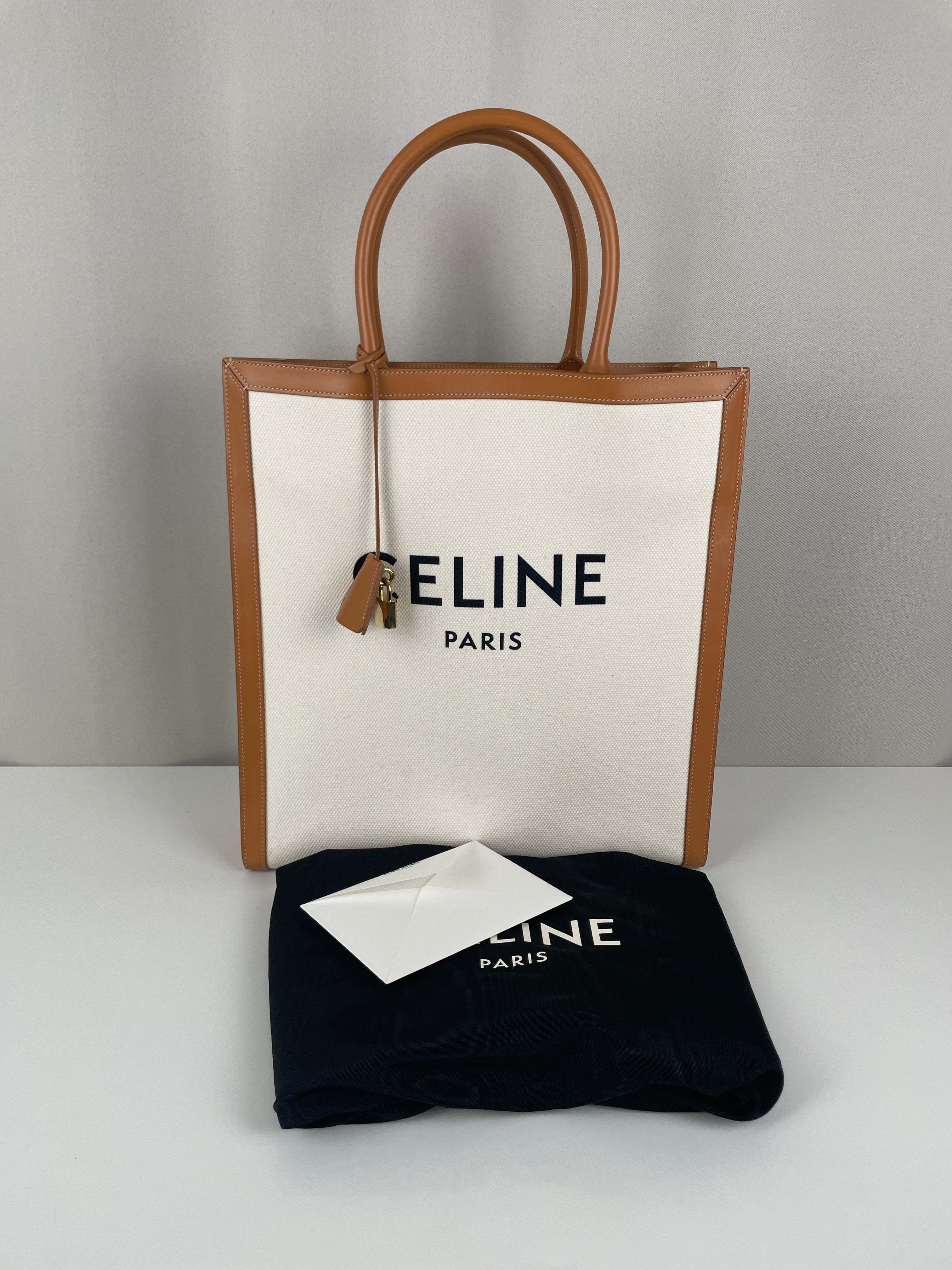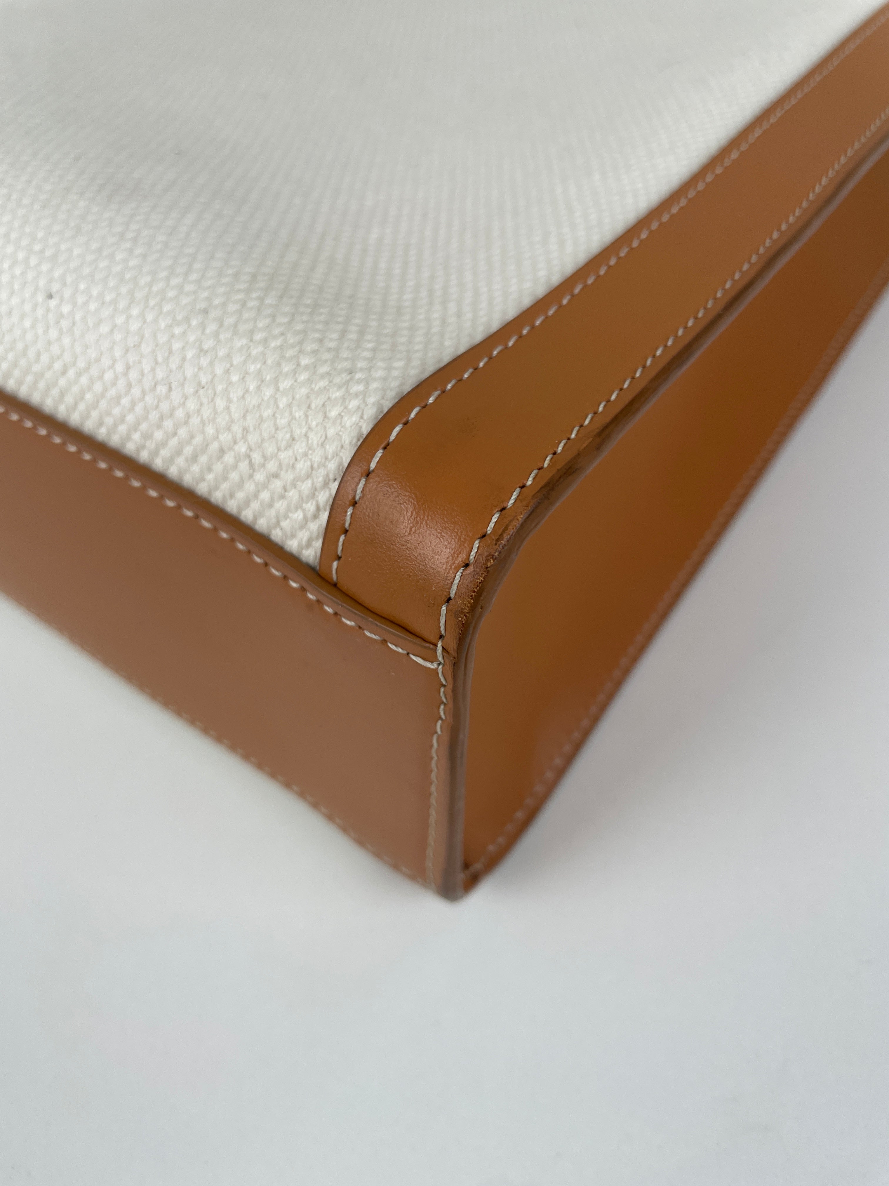 Sac Céline cabas vertical en tissu crème et cuir marron