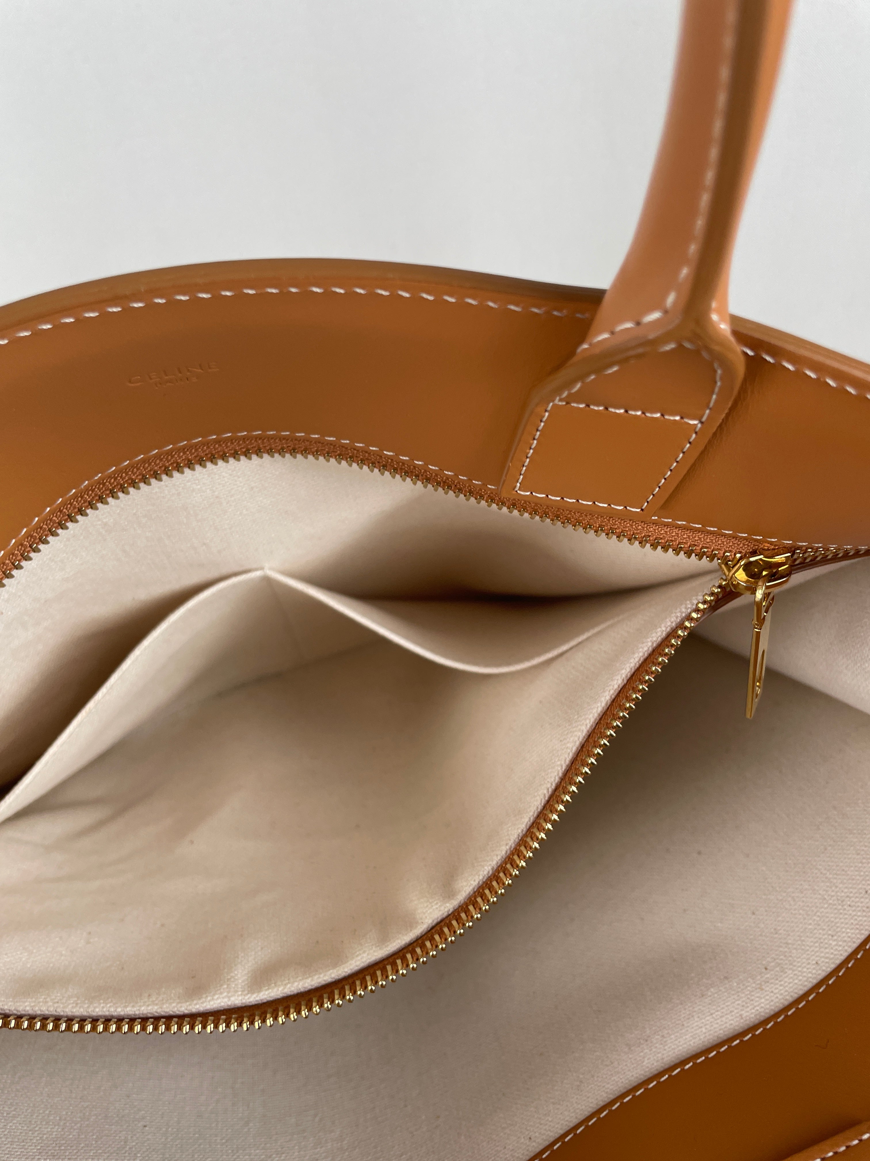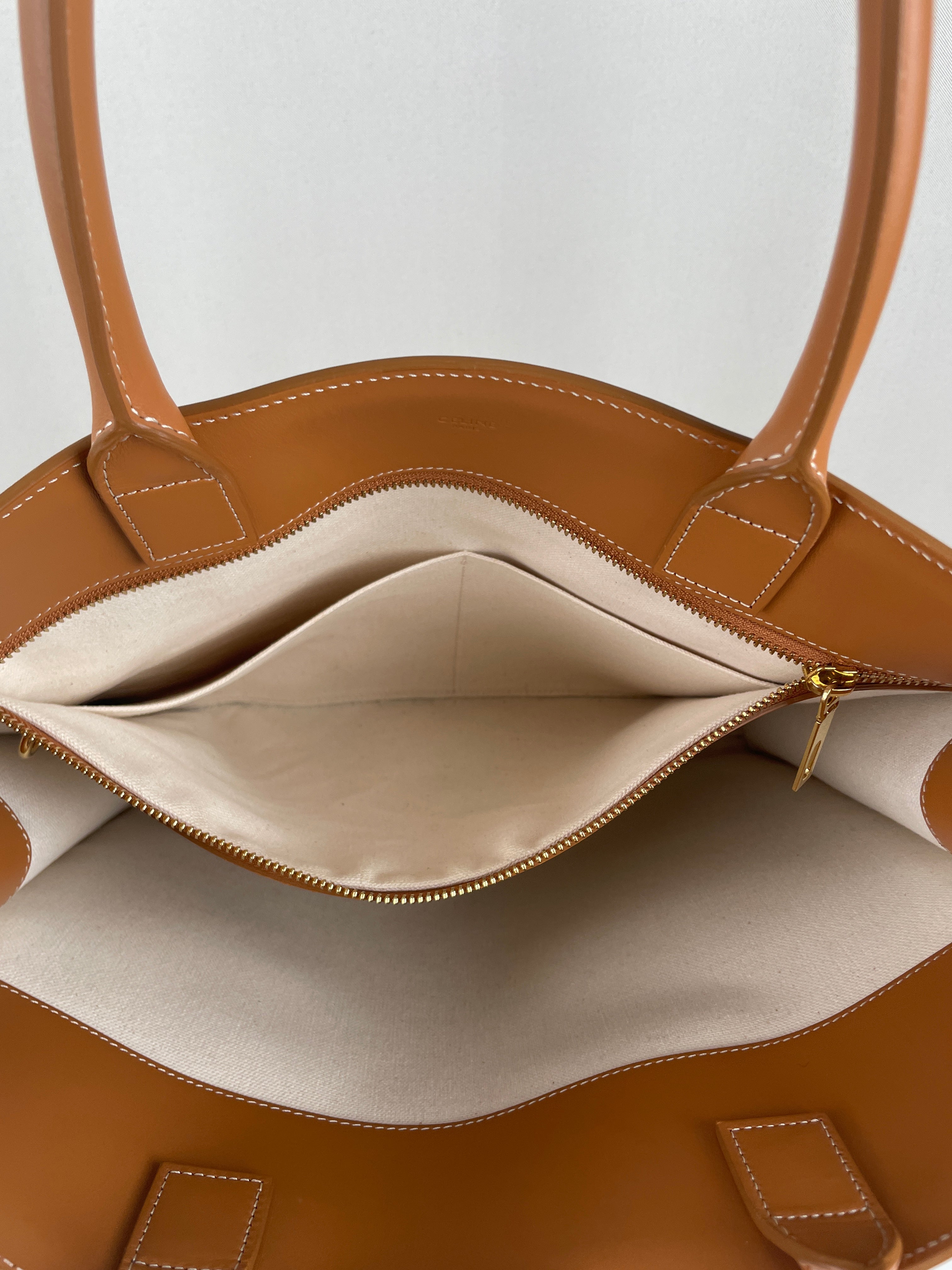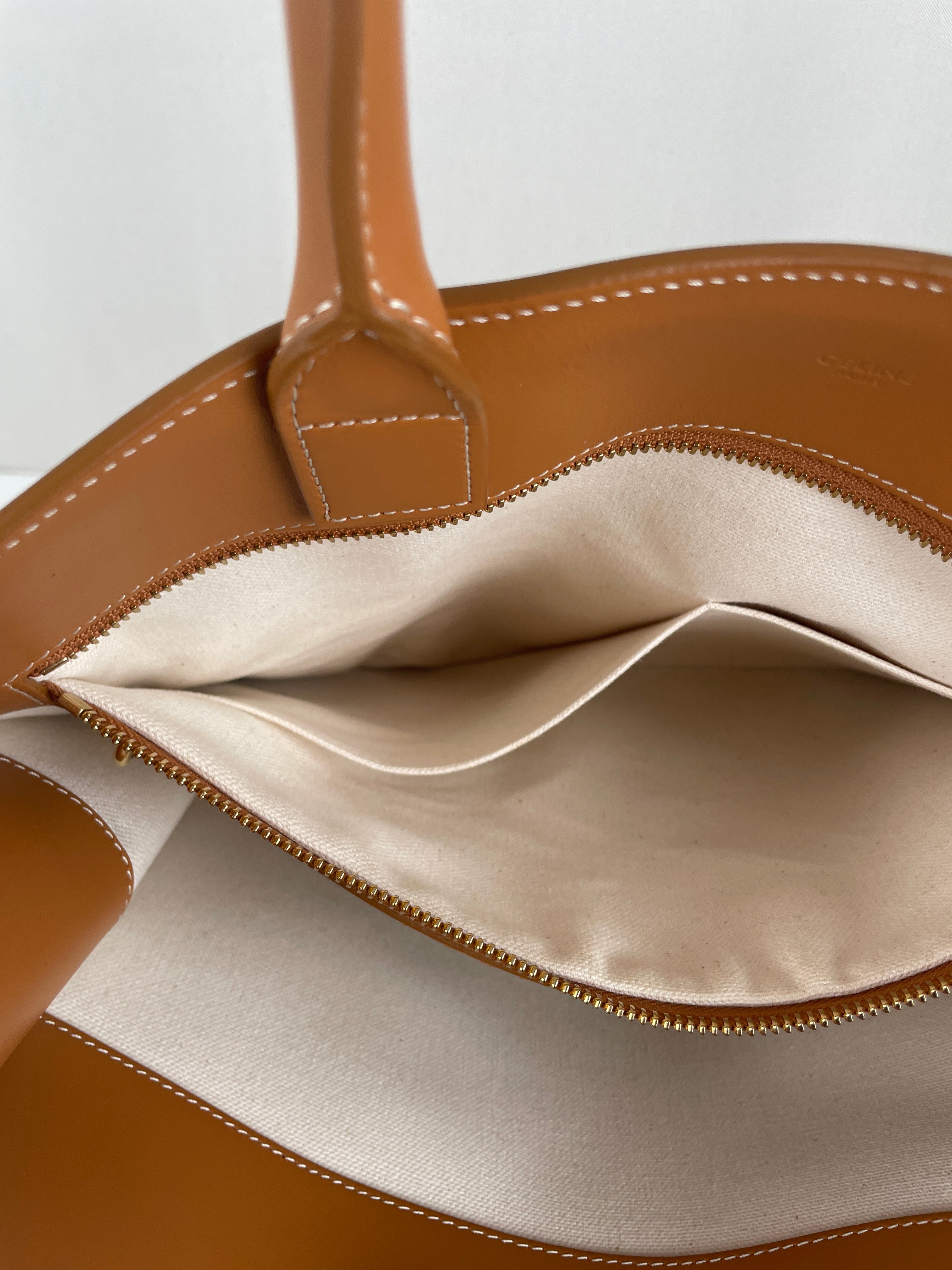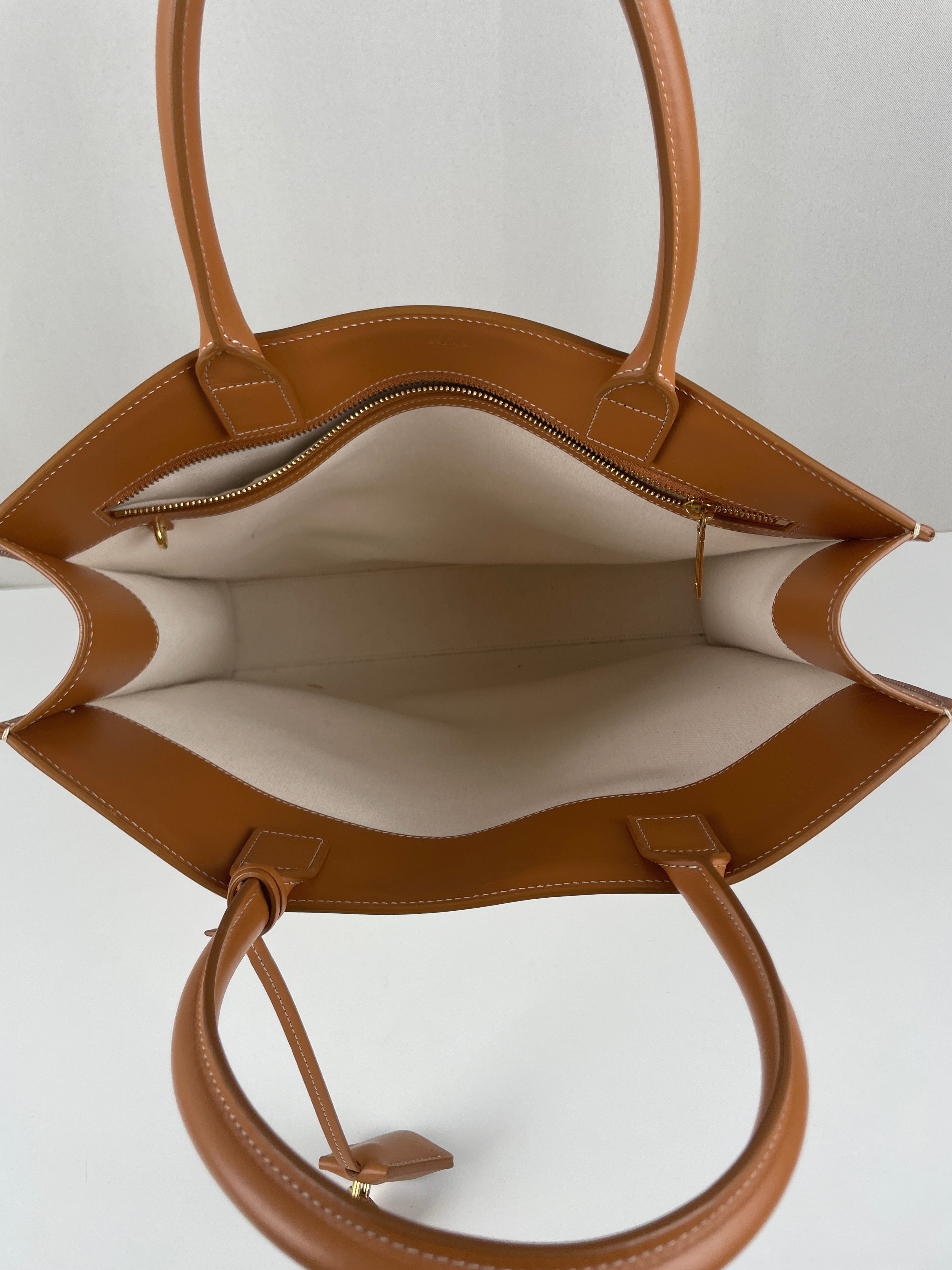 Sac Céline cabas vertical en tissu crème et cuir marron