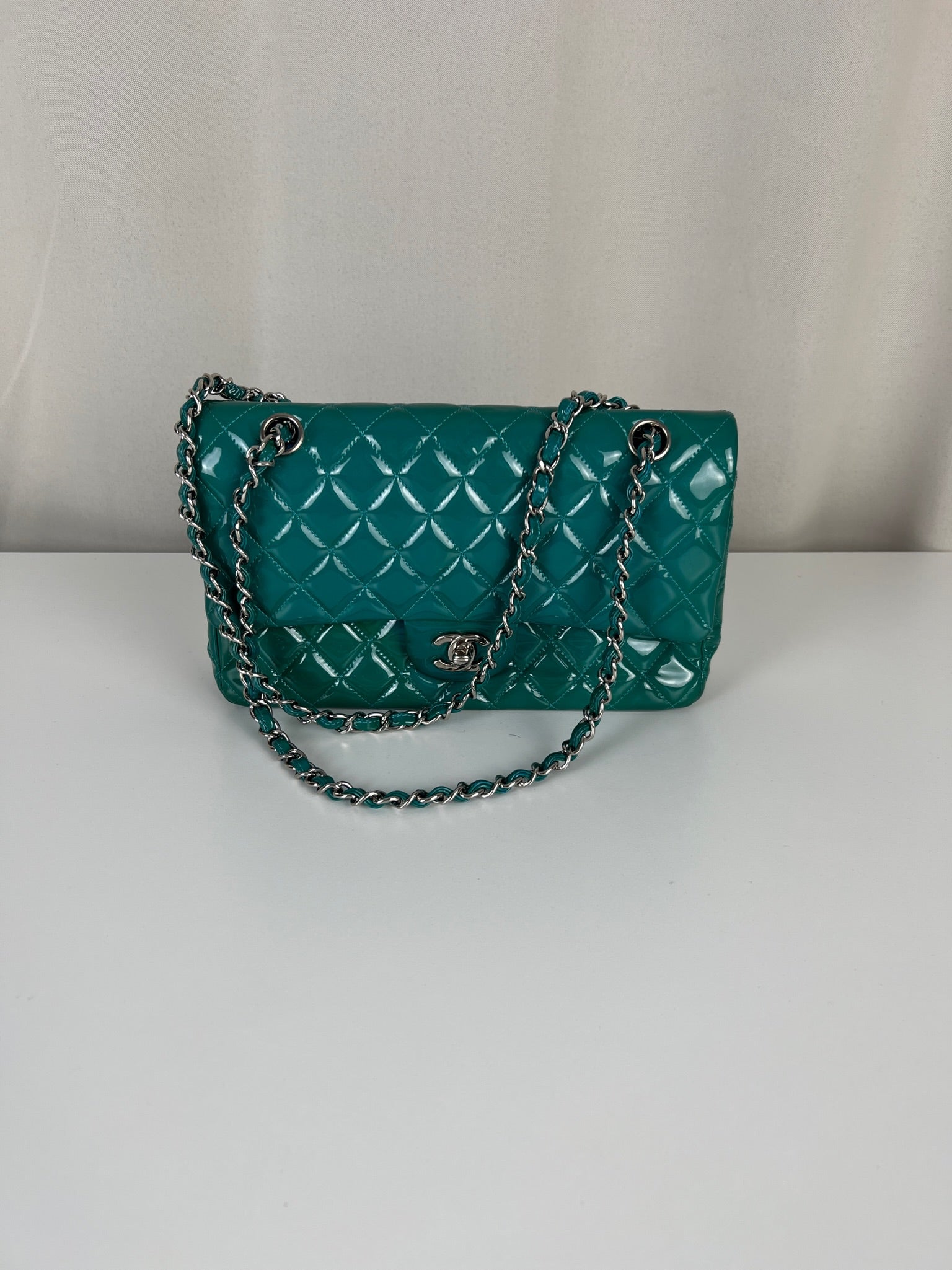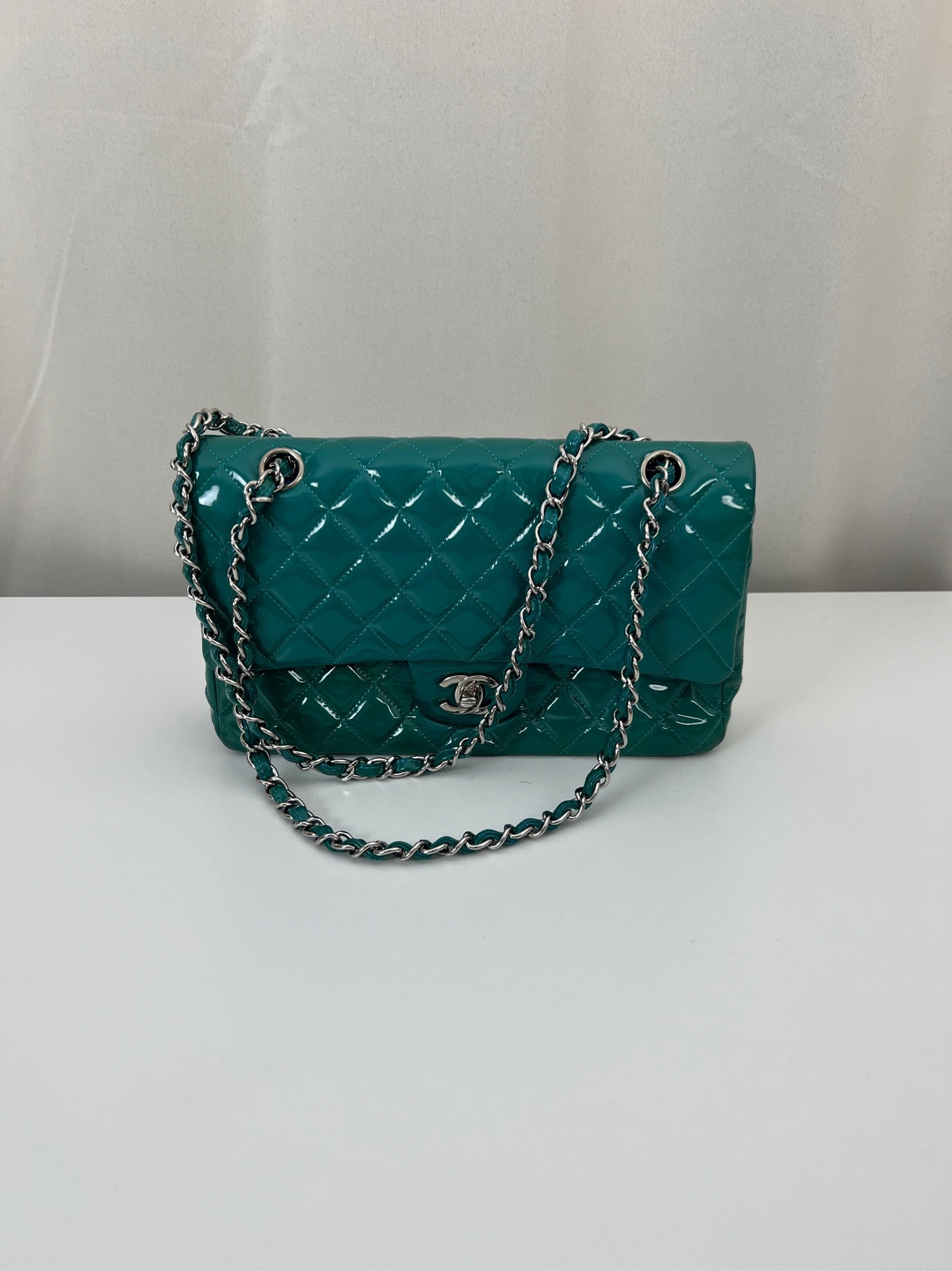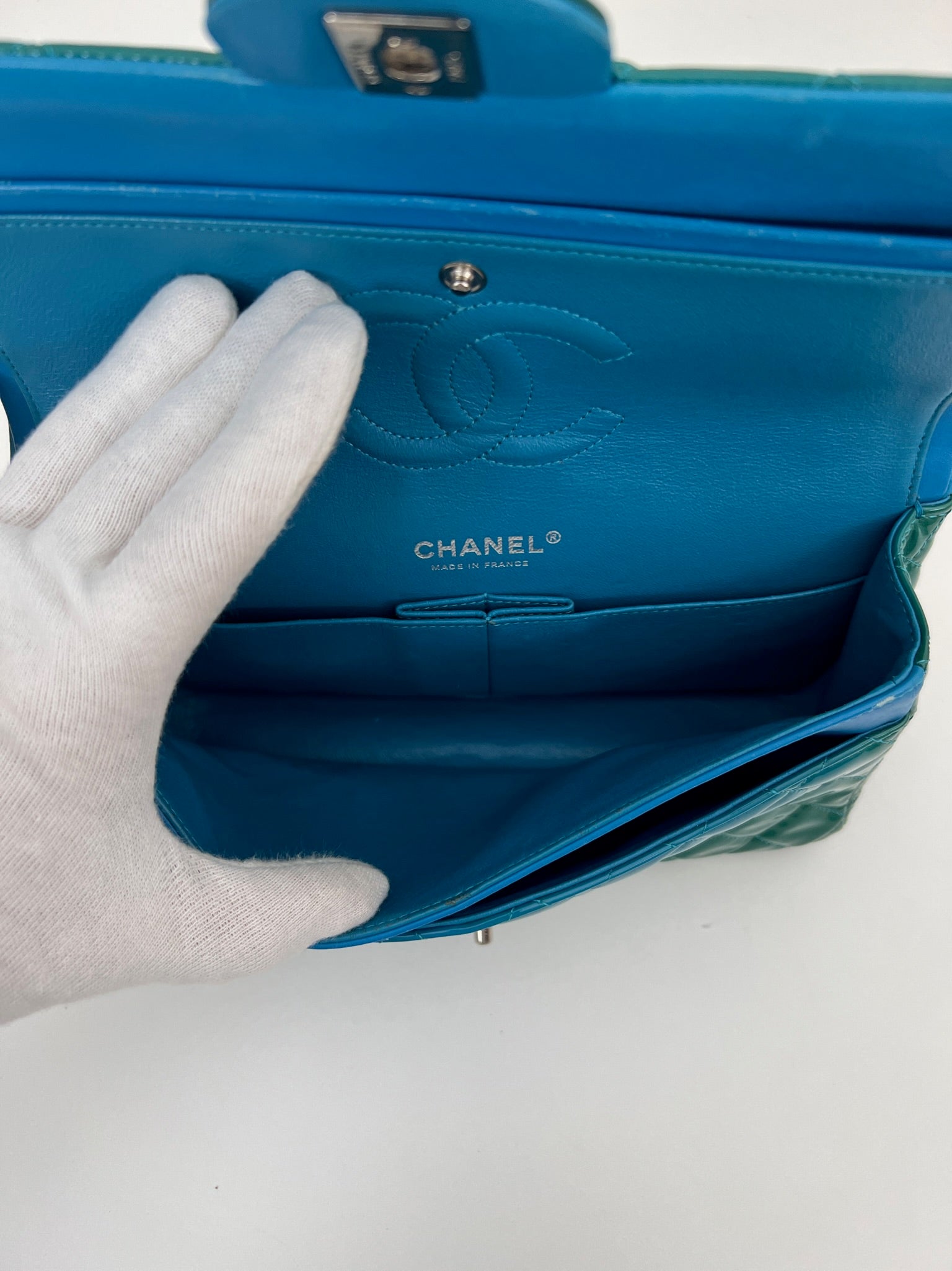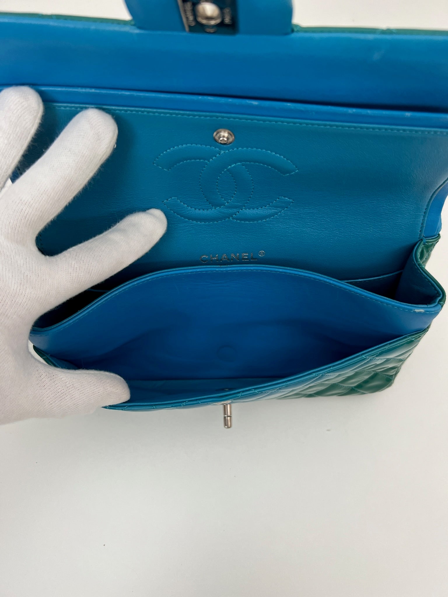 Ce sac Chanel Timeless 25 est en bon état. Le cuir verni est décoloré (comme vous pouvez le voir sur les photos) il est assez bien décoloré donc on ne le voit pas vraiment à moins d'ouvrir le sac. Il y a de très très petites taches sur le cuir. Les coins sont en bon état. La quincaillerie est en très bon état. L'intérieur est en très bon état. On peut voir des traces d'usure sur le rabat intérieur dues à la fermeture éclair (très fréquent sur les rabats classiques).