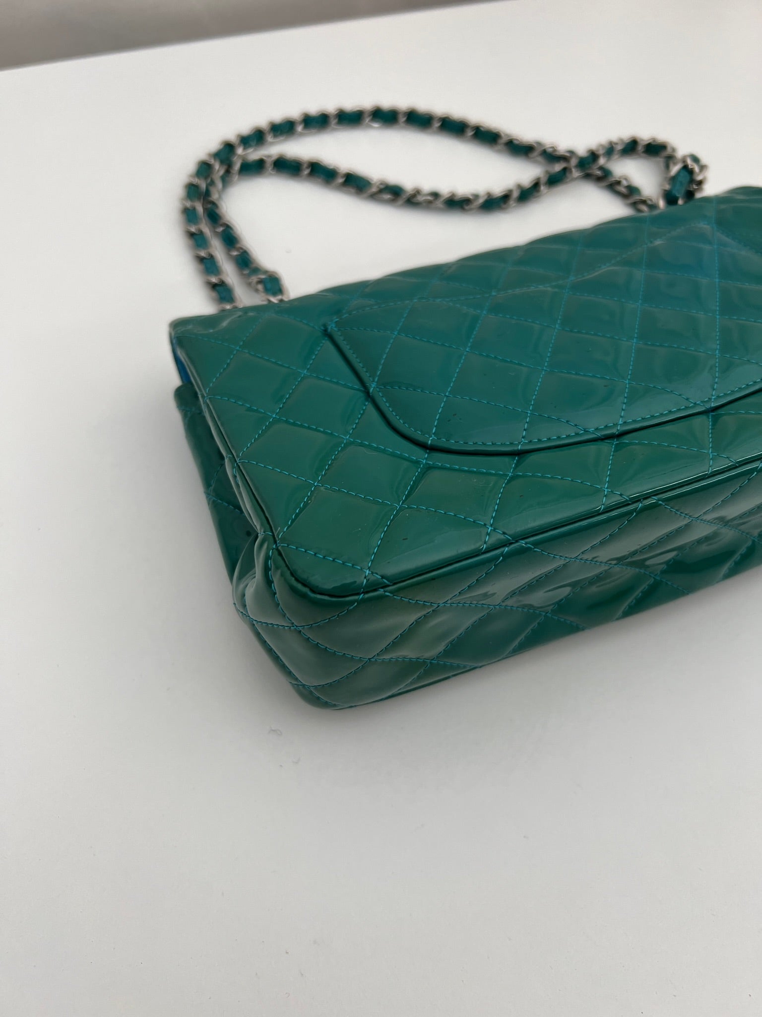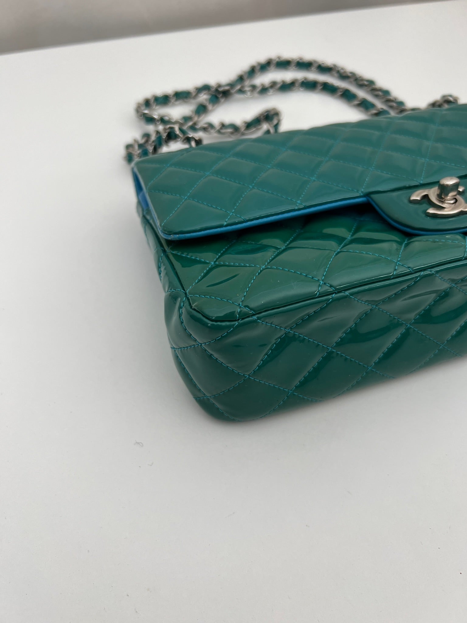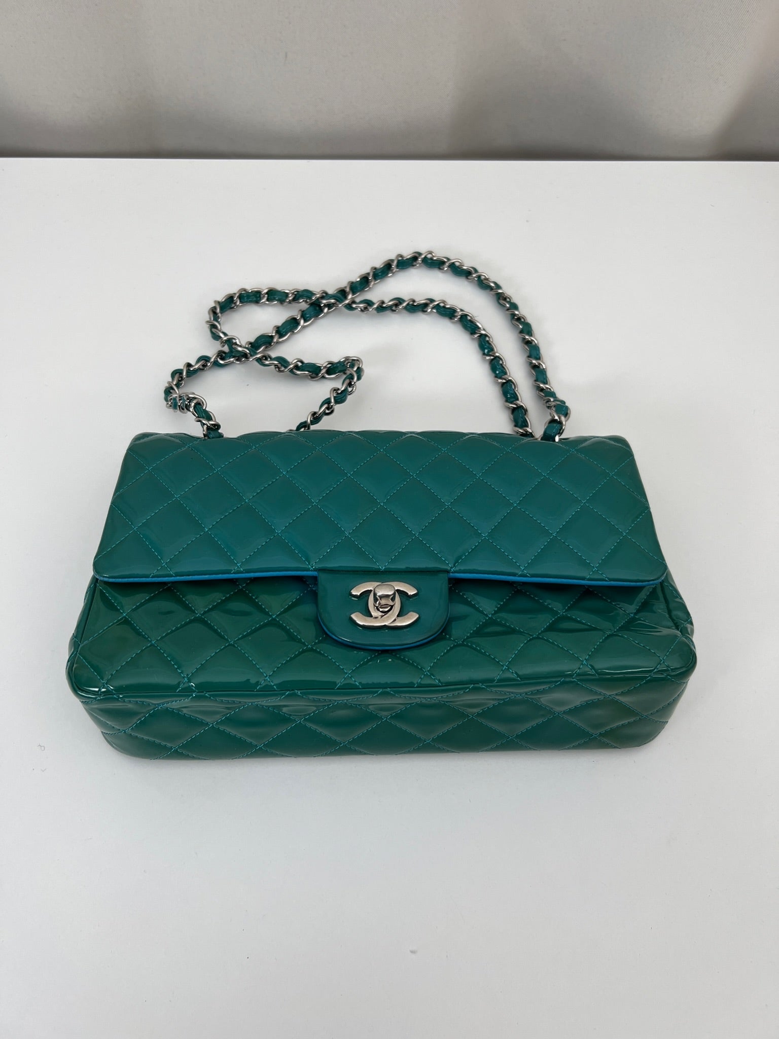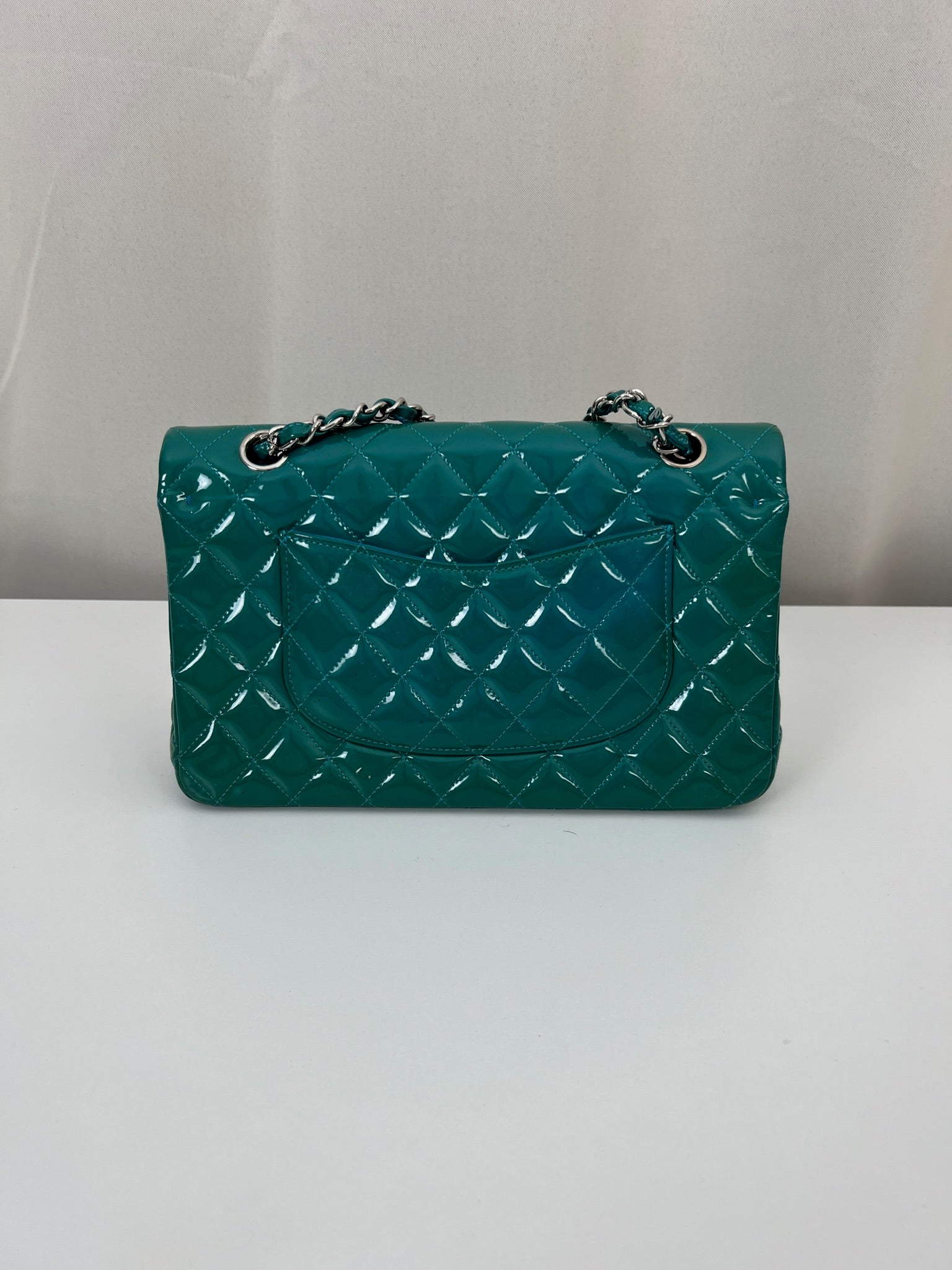 Ce sac Chanel Timeless 25 est en bon état. Le cuir verni est décoloré (comme vous pouvez le voir sur les photos) il est assez bien décoloré donc on ne le voit pas vraiment à moins d'ouvrir le sac. Il y a de très très petites taches sur le cuir. Les coins sont en bon état. La quincaillerie est en très bon état. L'intérieur est en très bon état. On peut voir des traces d'usure sur le rabat intérieur dues à la fermeture éclair (très fréquent sur les rabats classiques).