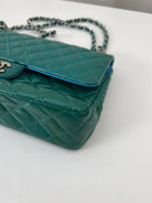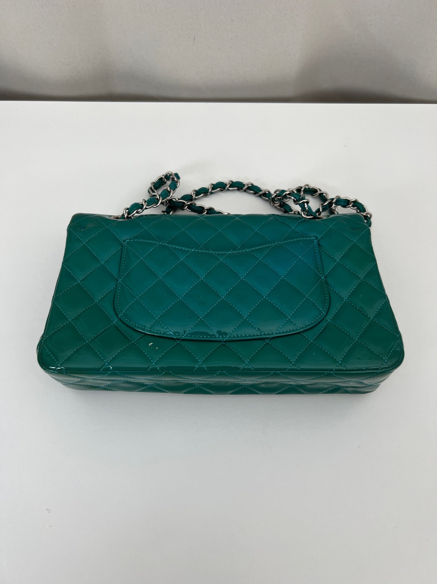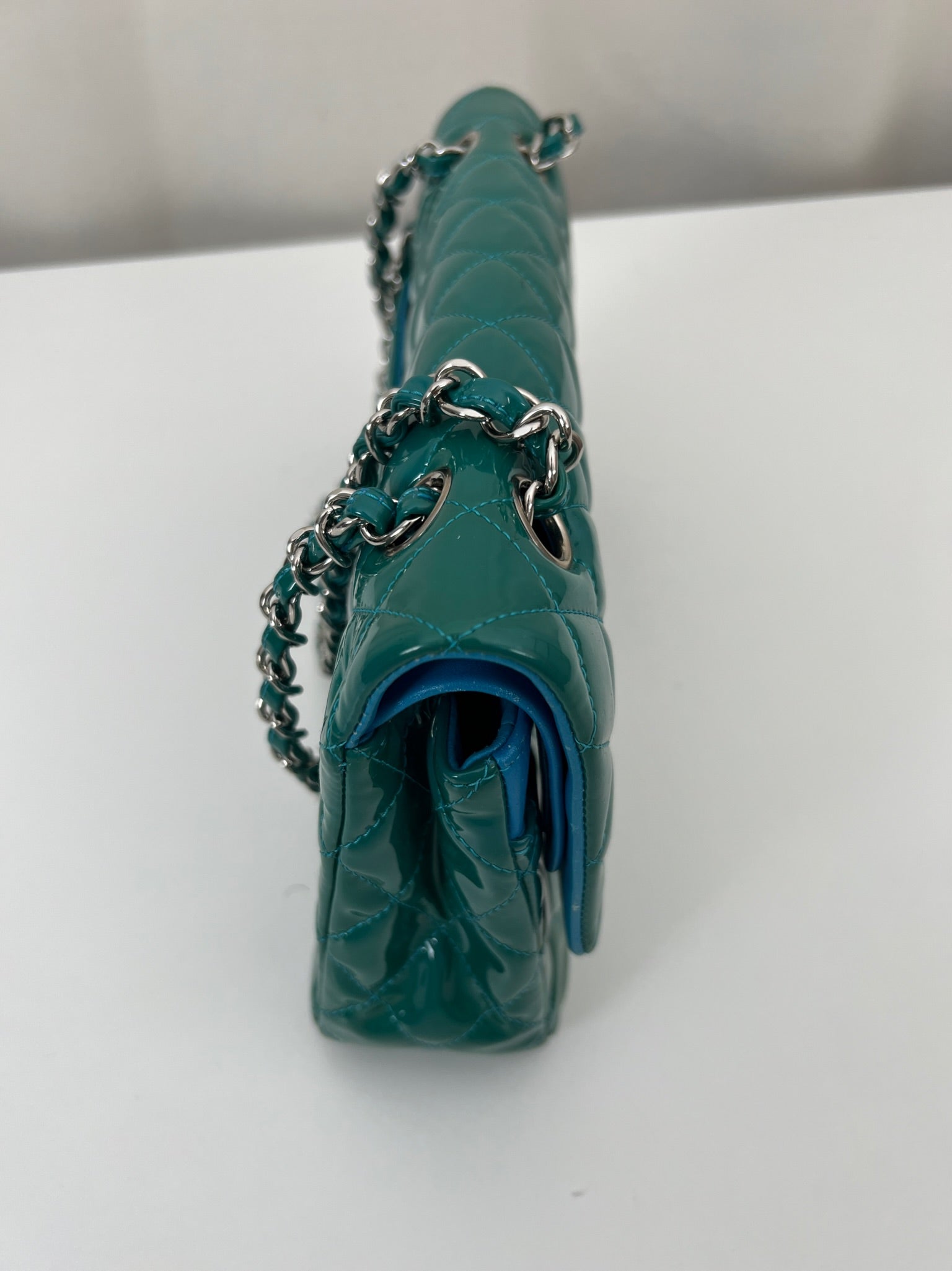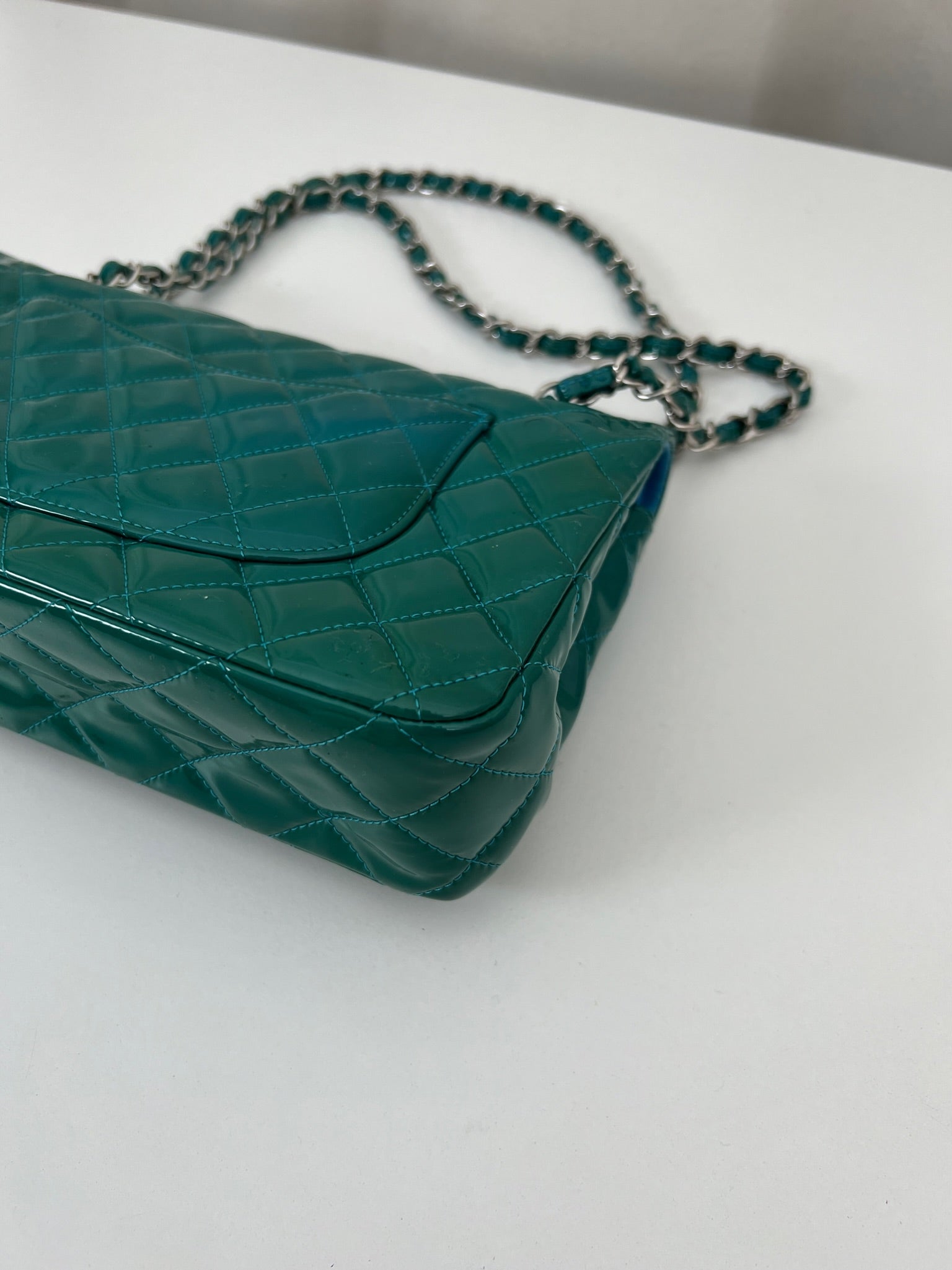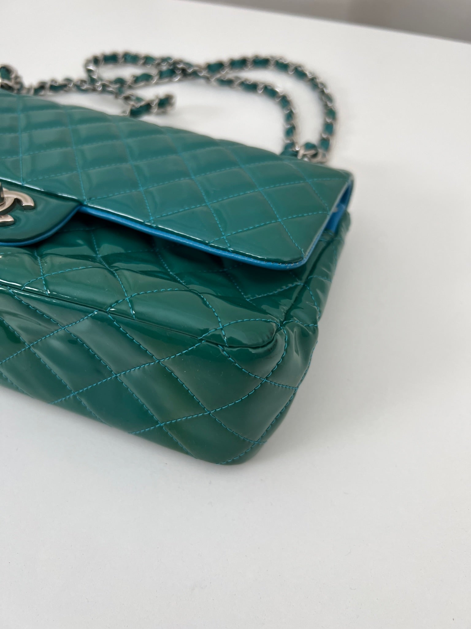 Ce sac Chanel Timeless 25 est en bon état. Le cuir verni est décoloré (comme vous pouvez le voir sur les photos) il est assez bien décoloré donc on ne le voit pas vraiment à moins d'ouvrir le sac. Il y a de très très petites taches sur le cuir. Les coins sont en bon état. La quincaillerie est en très bon état. L'intérieur est en très bon état. On peut voir des traces d'usure sur le rabat intérieur dues à la fermeture éclair (très fréquent sur les rabats classiques).