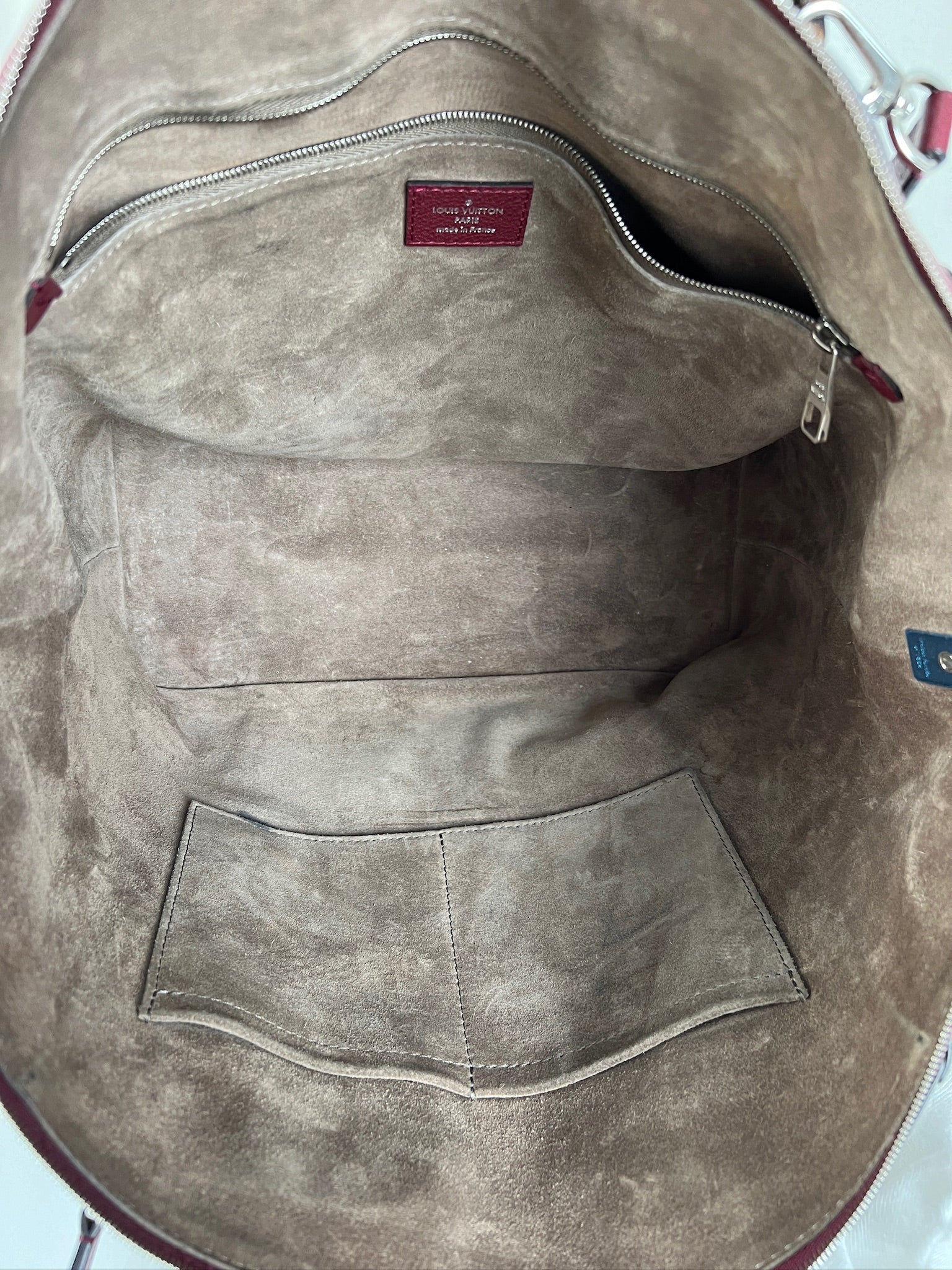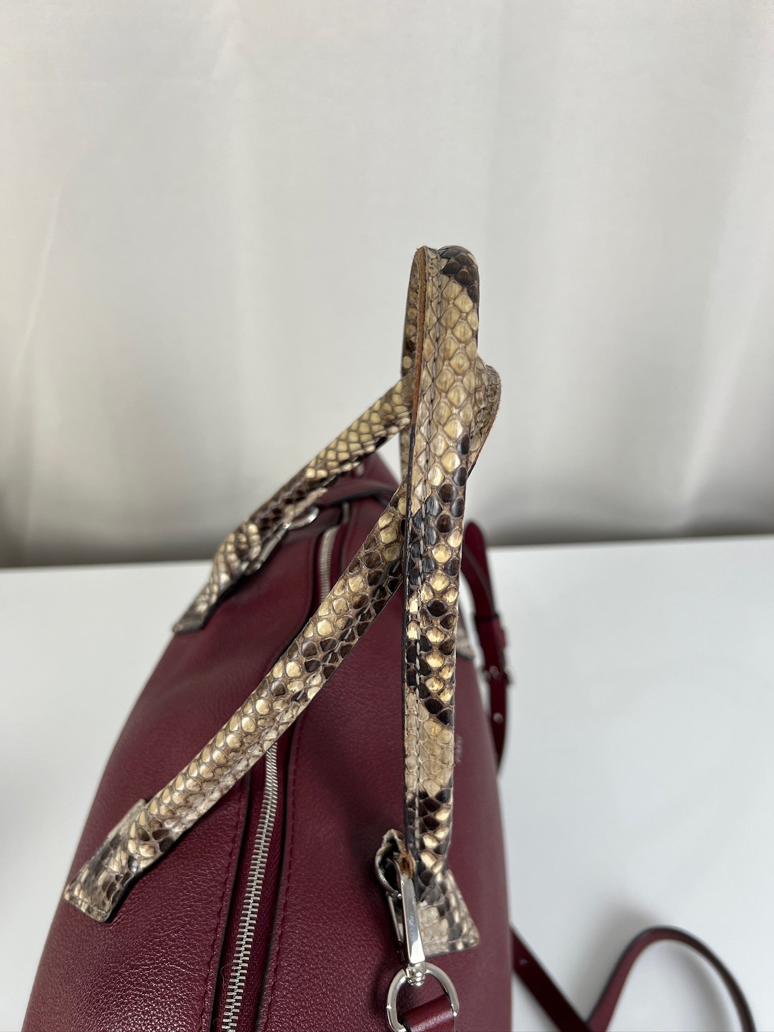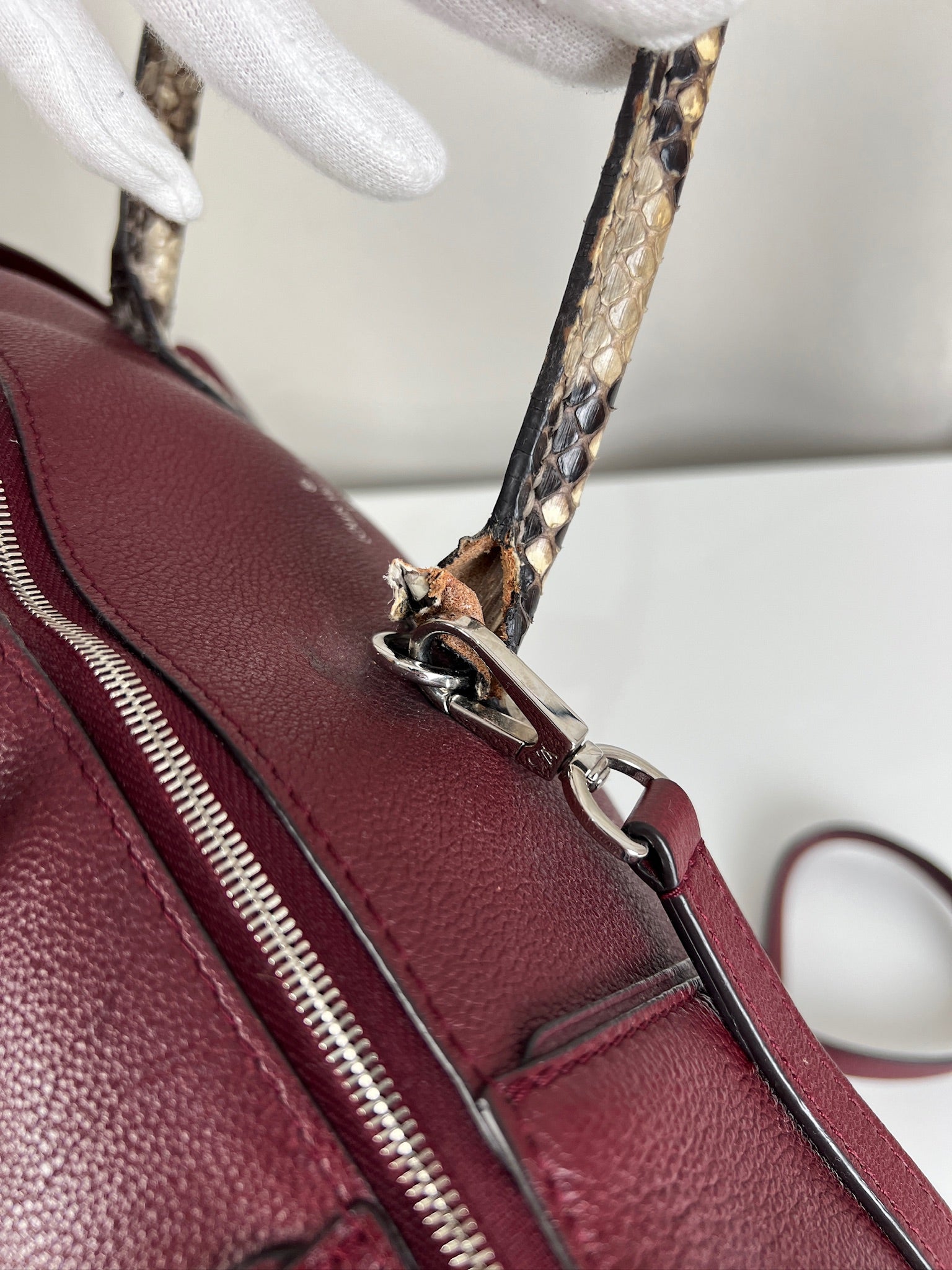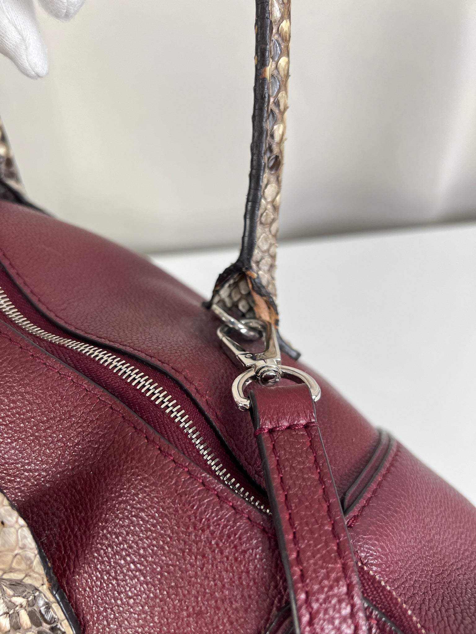 Ce Louis Vuitton Lockit Bordeaux est en bon état. Le cuir est en bon état, quelques traces d'usure sous le sac. Les anses sont en Python Reticulatus et sont en bon état. La base des anses est un peu abîmée à cause de la bandoulière. Les coins sont un peu usés. La bandoulière est en bon état et réglable. L'intérieur est en bon état, quelques petites traces d'usure. Pas de cadenas.