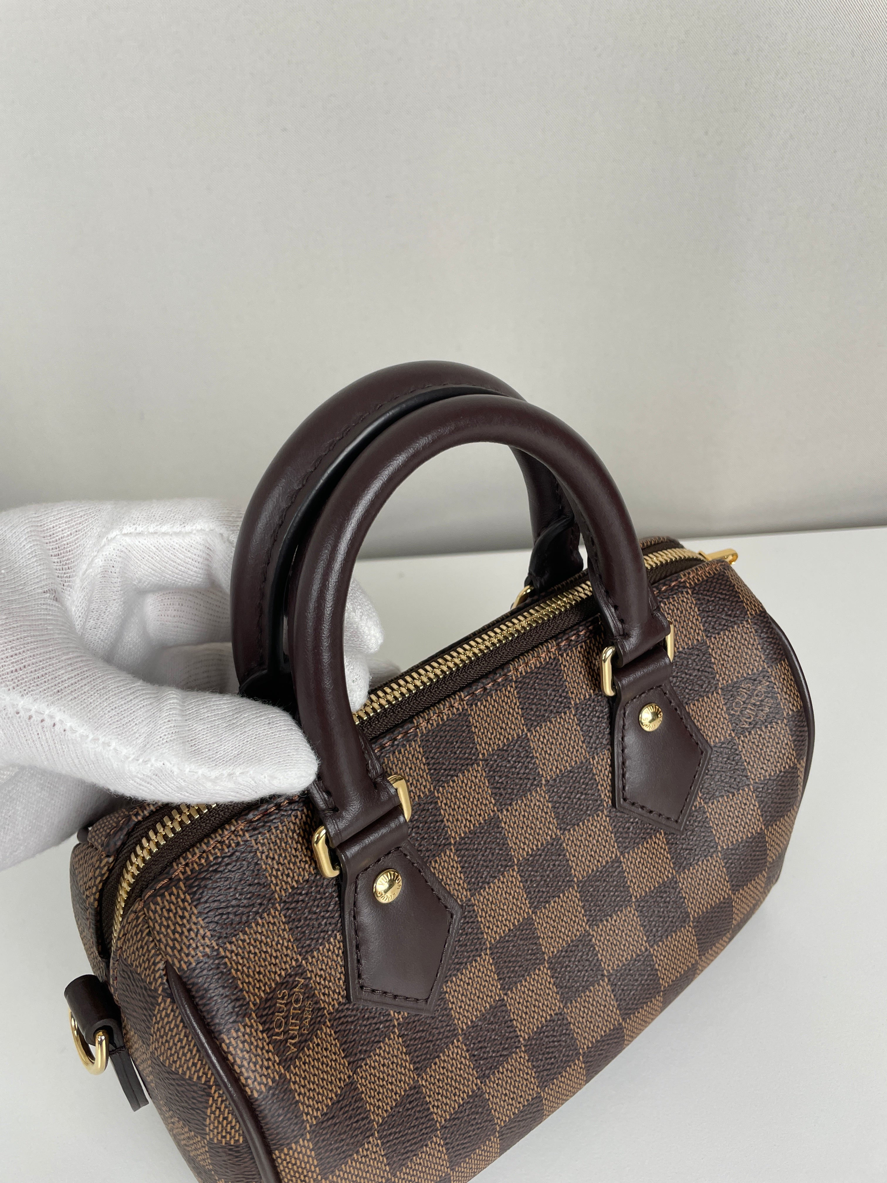 Ce sac Louis Vuitton Speedy 20 Damier Ébene est quasiment neuf. La toile et les coins sont en parfait état. La bandoulière est en très bon état et s'ajuste. La bijouterie est en très bon état. L'intérieur est en très bon état vous avez juste une petite trace à l'intérieur sur un côté très petit.