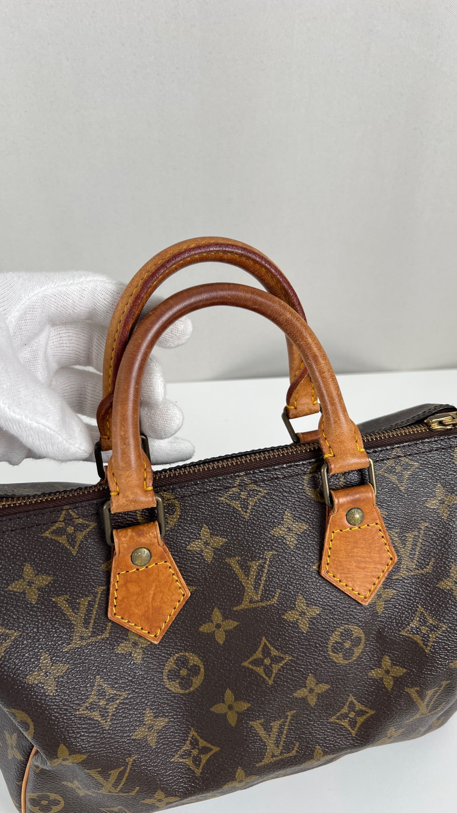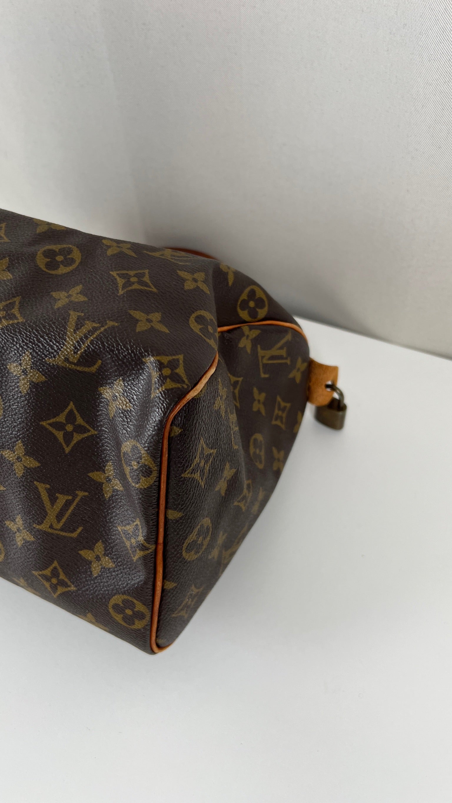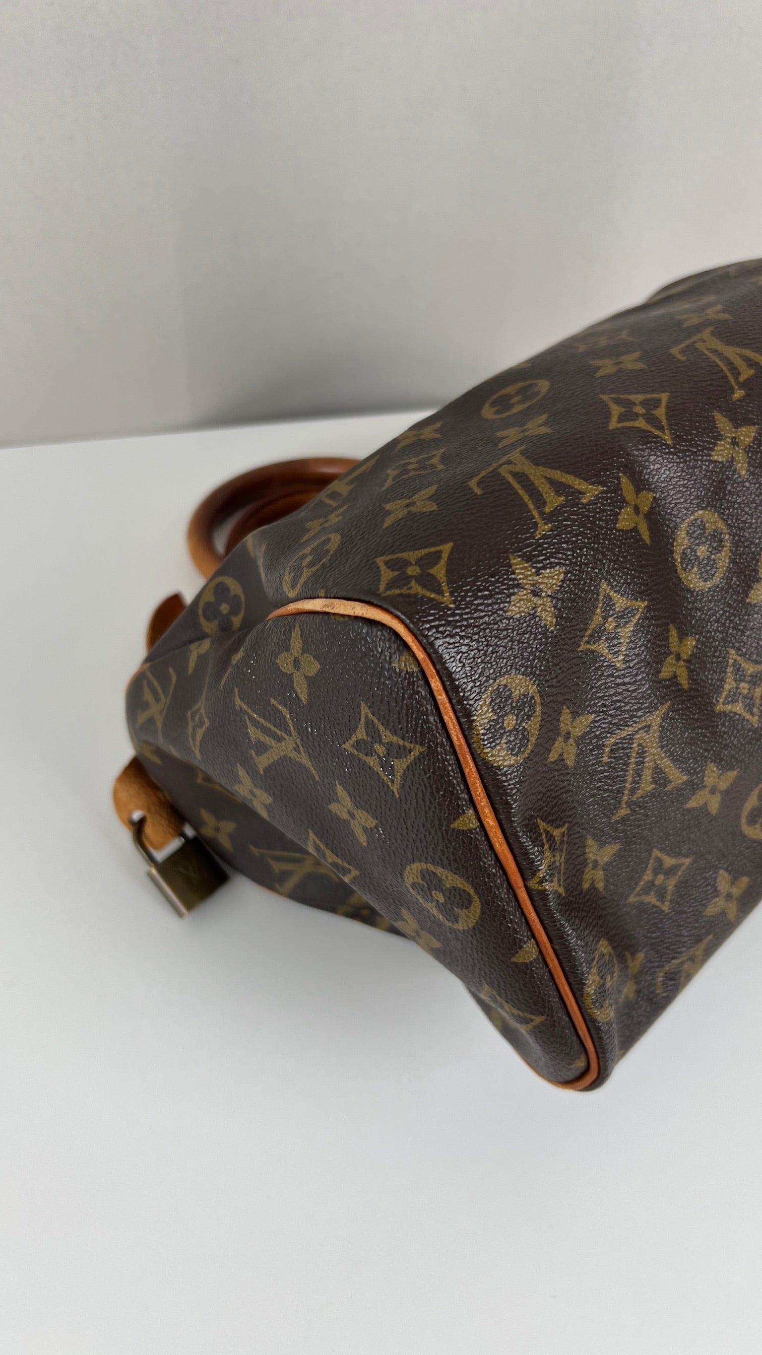 Ce Louis Vuitton Speedy 25 Monogram est en état d'occasion/bon état. La toile est en très bon état. Les coins sont frottés. Les parties en cuir sont tannées et usées. L'intérieur présente quelques petites traces d'usure + Une partie de la poche intérieure est abîmée et détachée / décousu. On peut la réparer directement chez la marque donc le prix est très très bon. Petite odeur très peu.