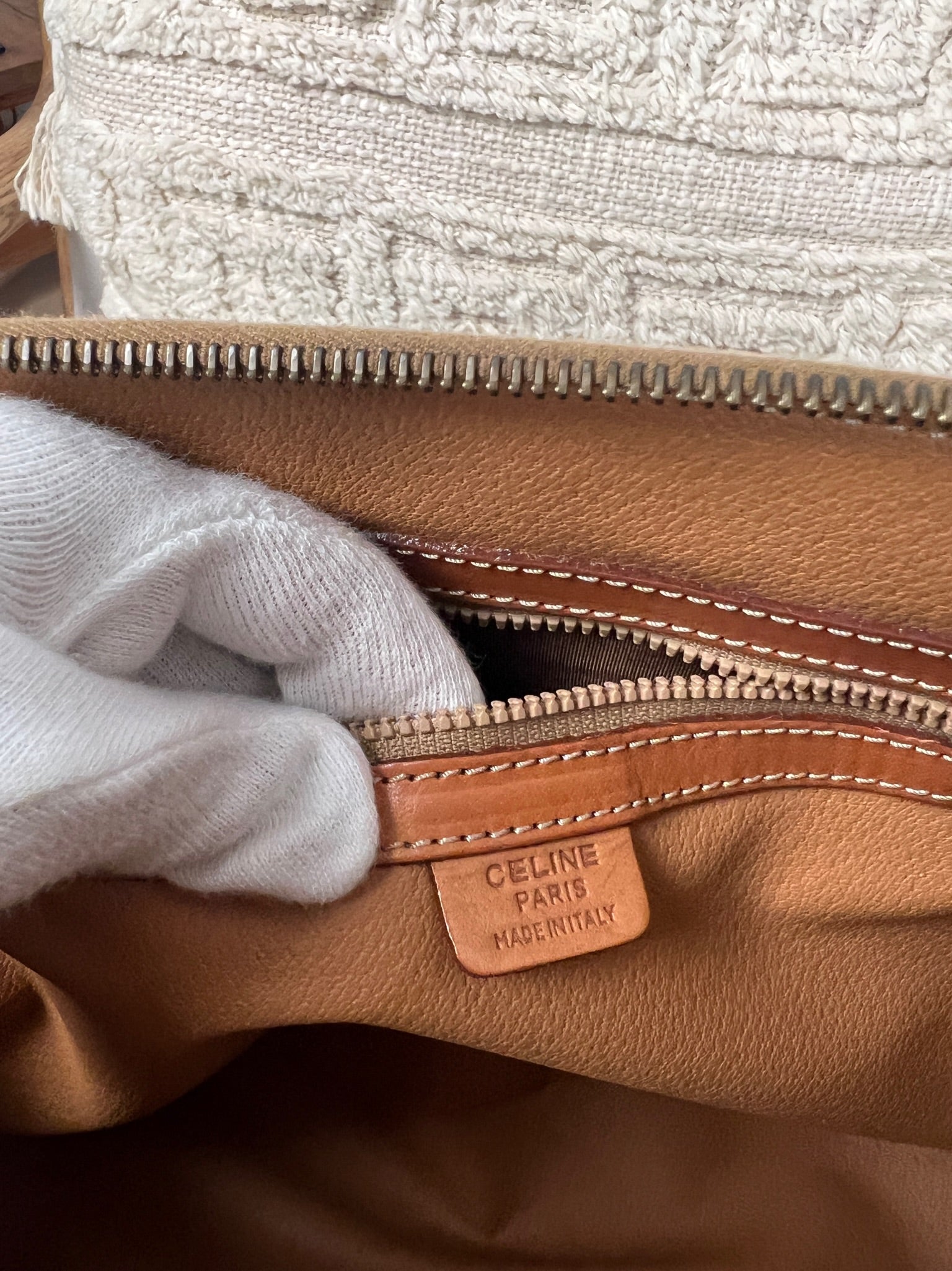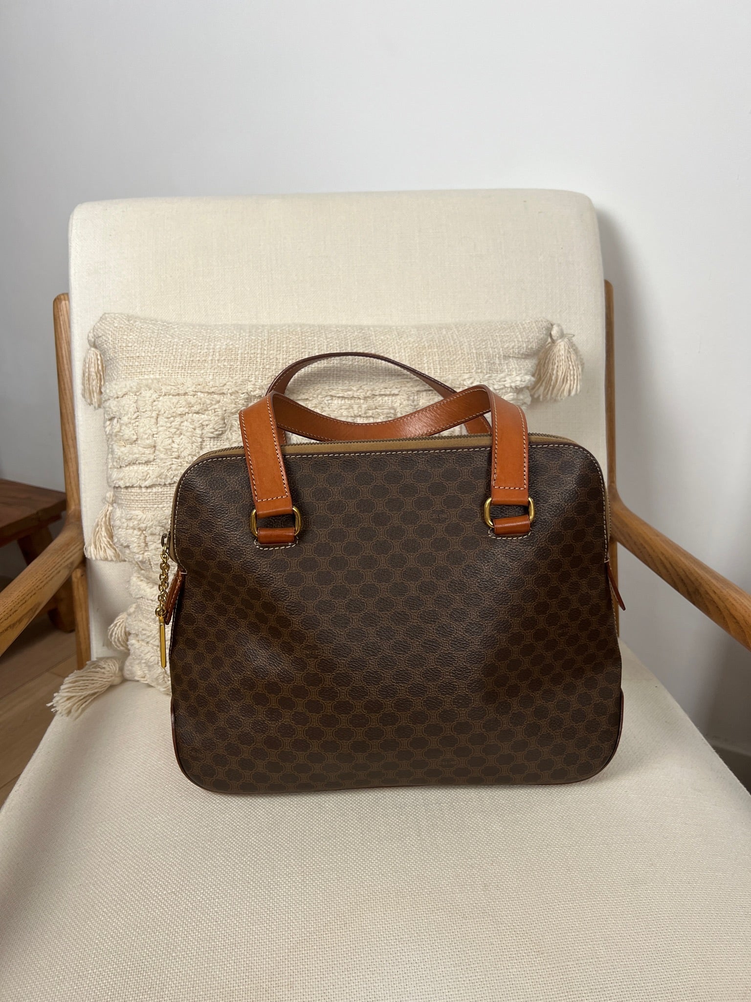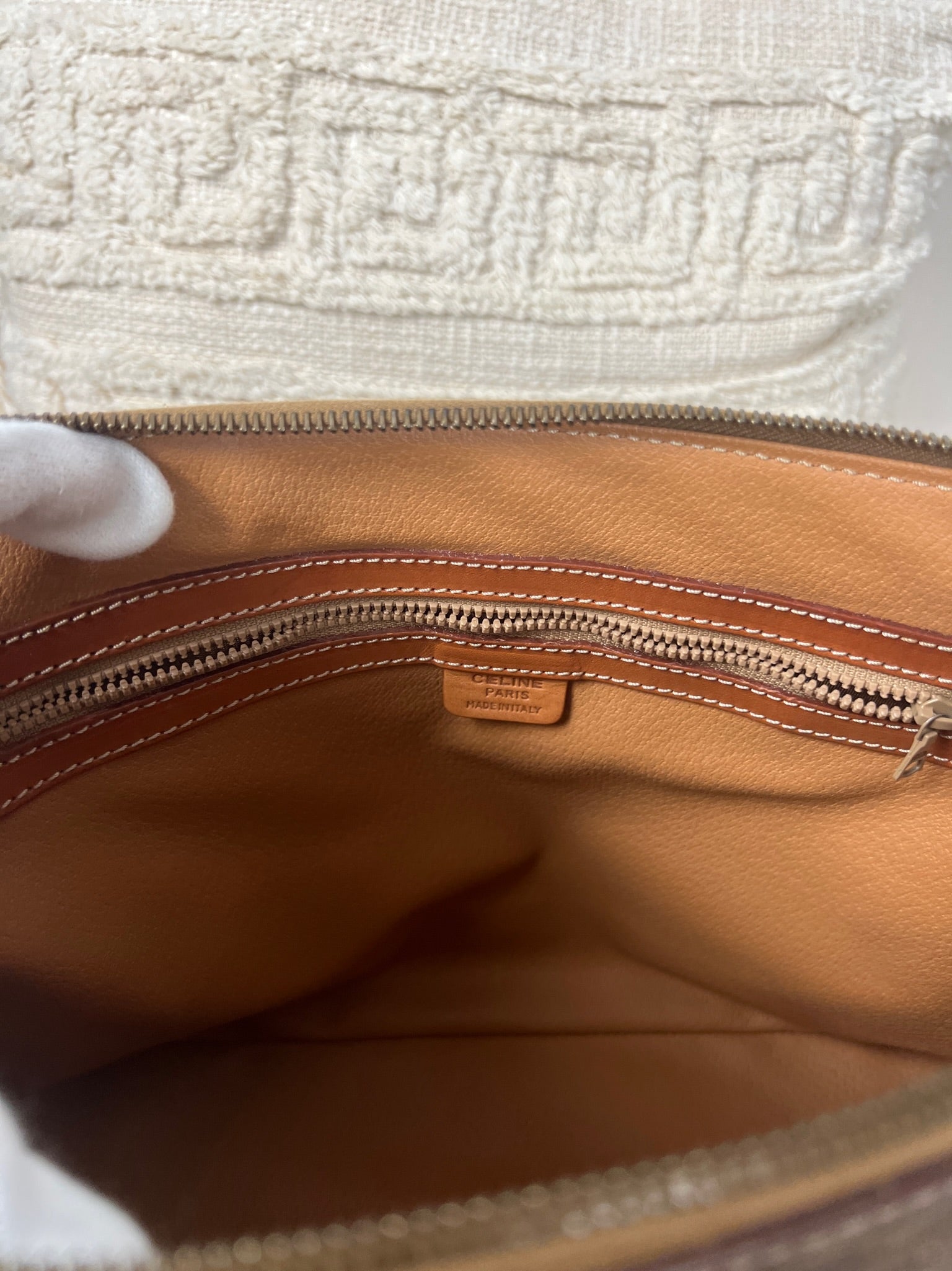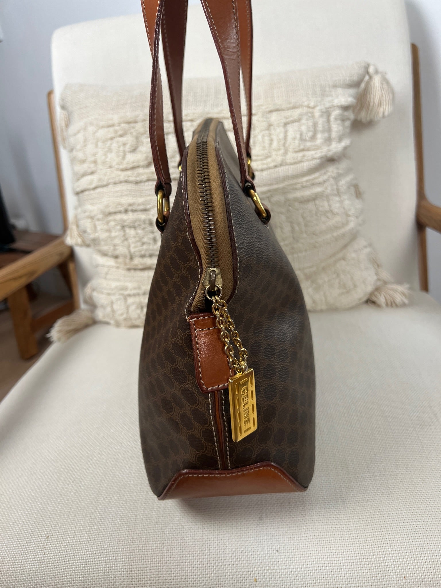 Ce sac Céline est en très bon état. Le cuir est tanné. La toile est en très bon état avec juste un peu usée sur le bas. Les poignées sont en bon état. L'intérieur est en très bon état seule la poche zippée présente de petites taches. Le matériel est usé suite à une utilisation normale. La fermeture éclair est un peu dure car c'est vintage.