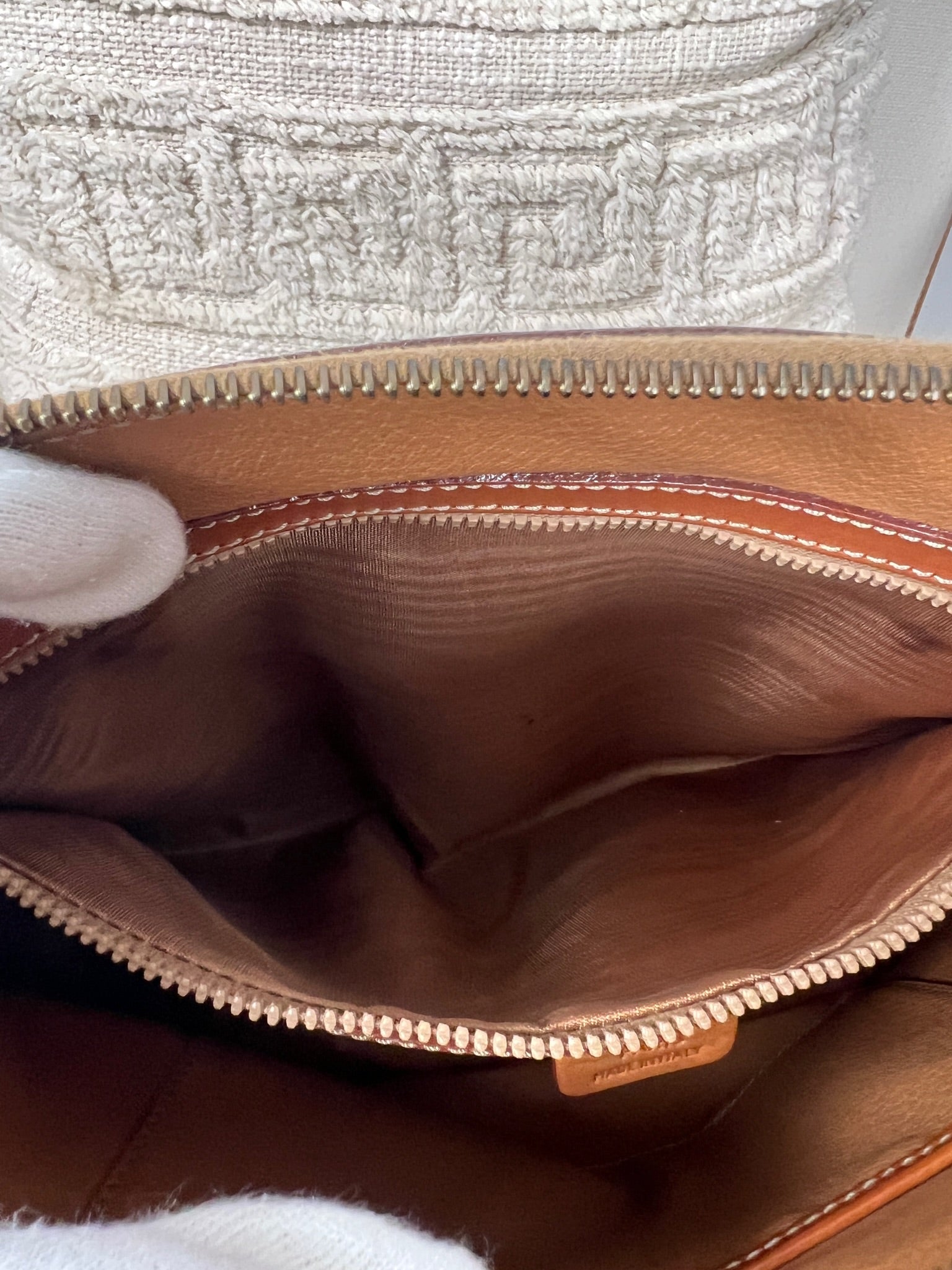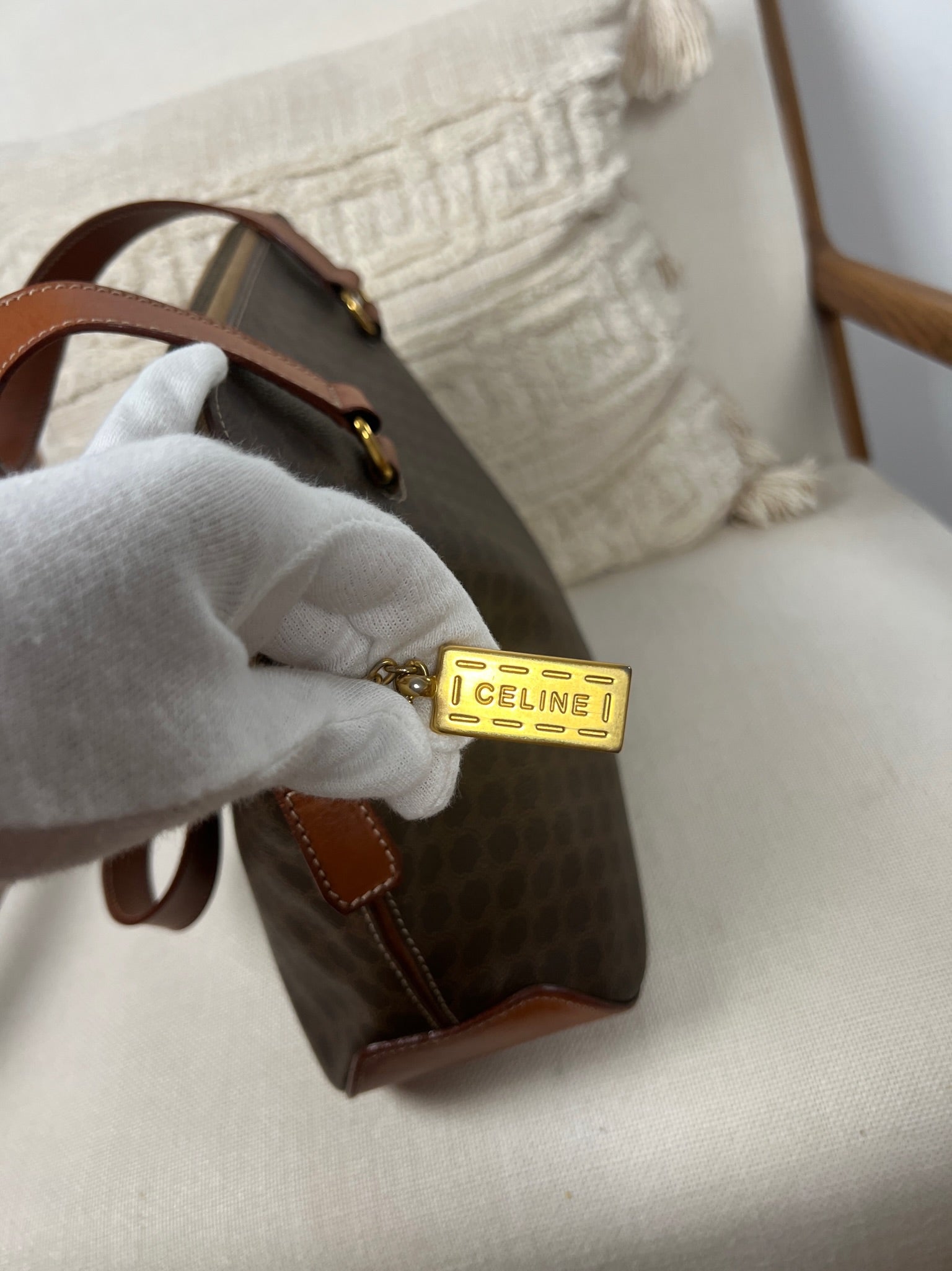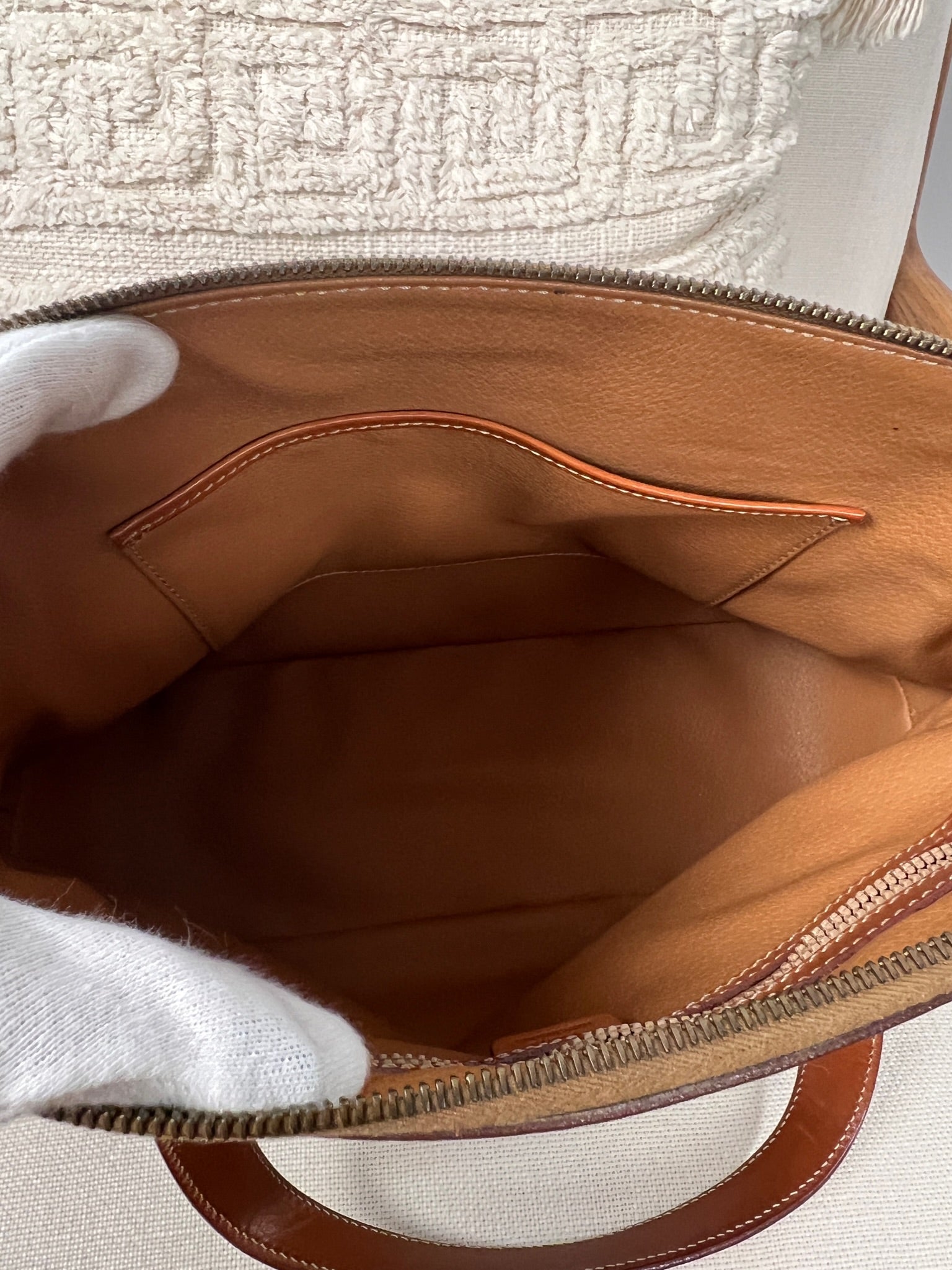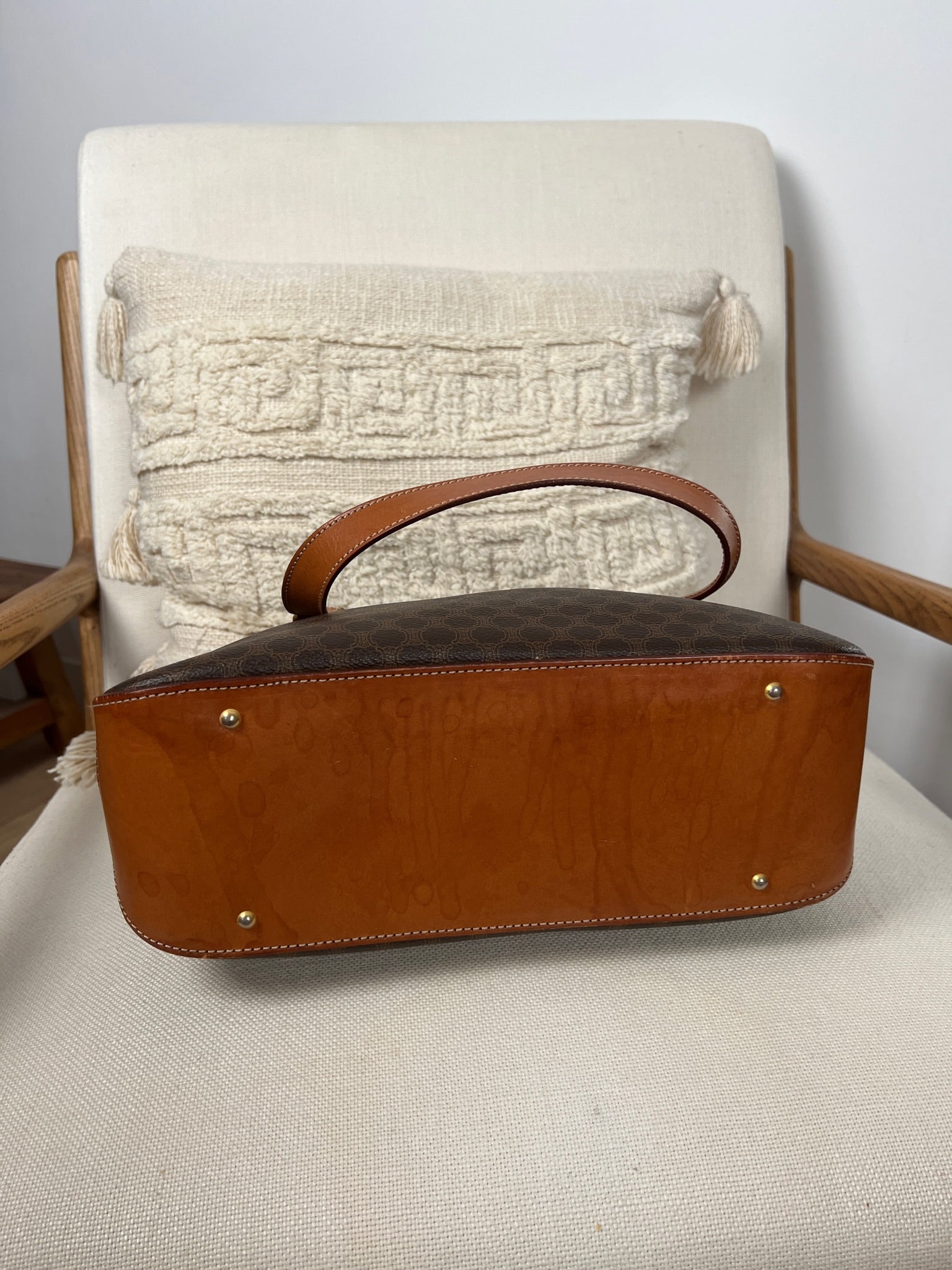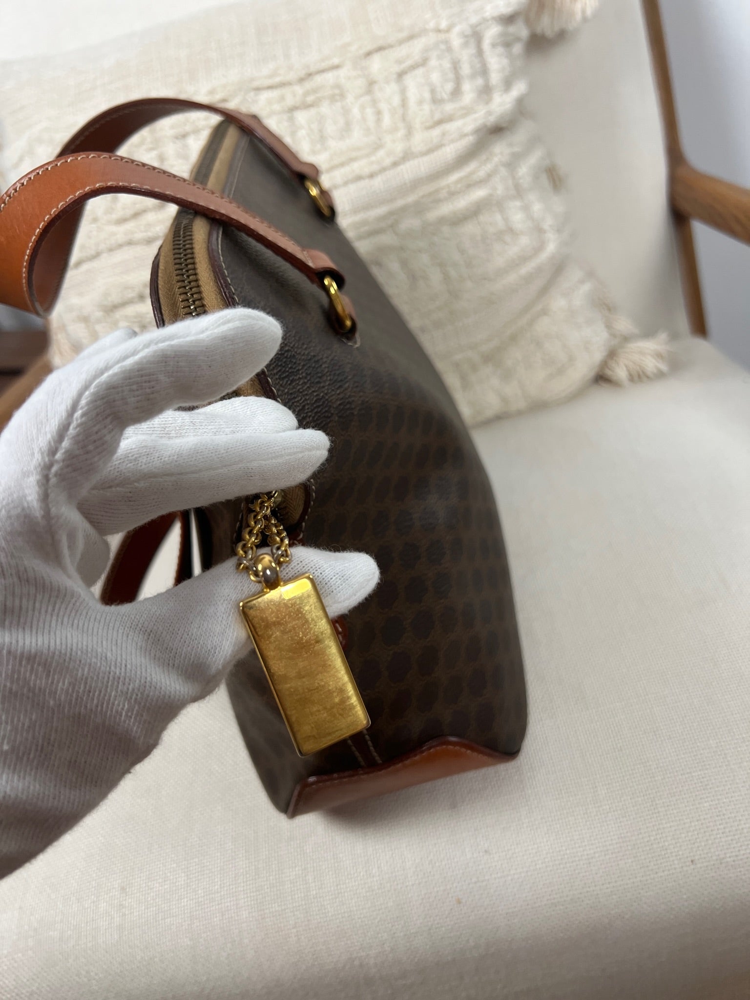 Ce sac Céline est en très bon état. Le cuir est tanné. La toile est en très bon état avec juste un peu usée sur le bas. Les poignées sont en bon état. L'intérieur est en très bon état seule la poche zippée présente de petites taches. Le matériel est usé suite à une utilisation normale. La fermeture éclair est un peu dure car c'est vintage.