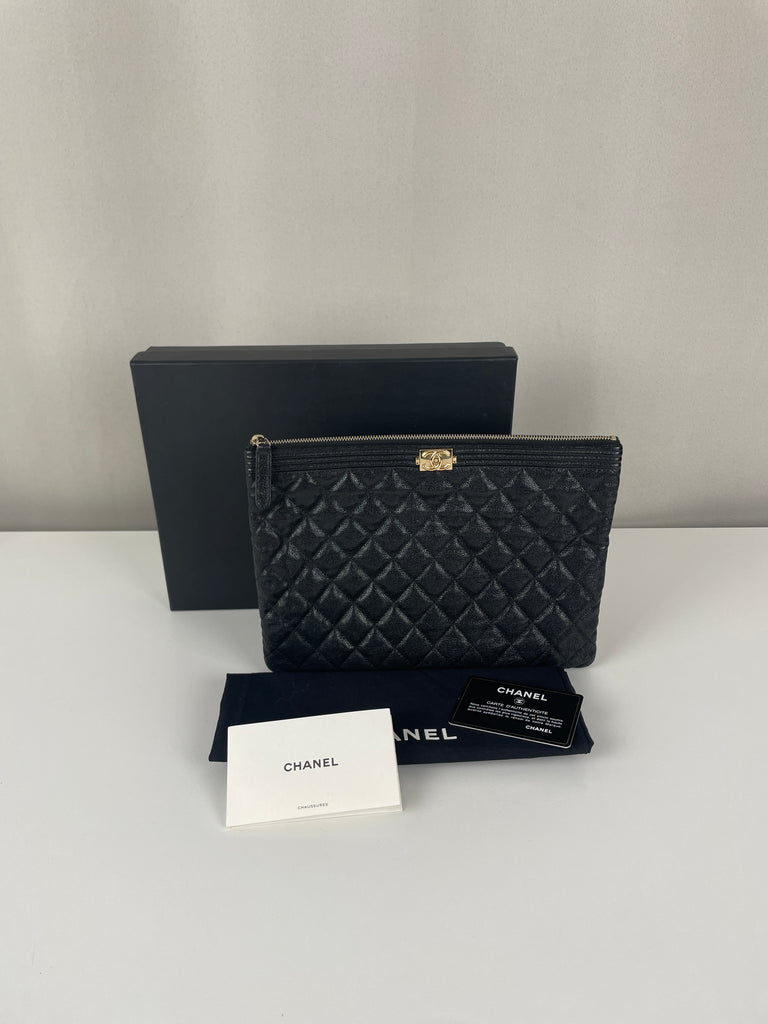 Pochette Chanel boy en cuir caviar noir bijouterie dorée