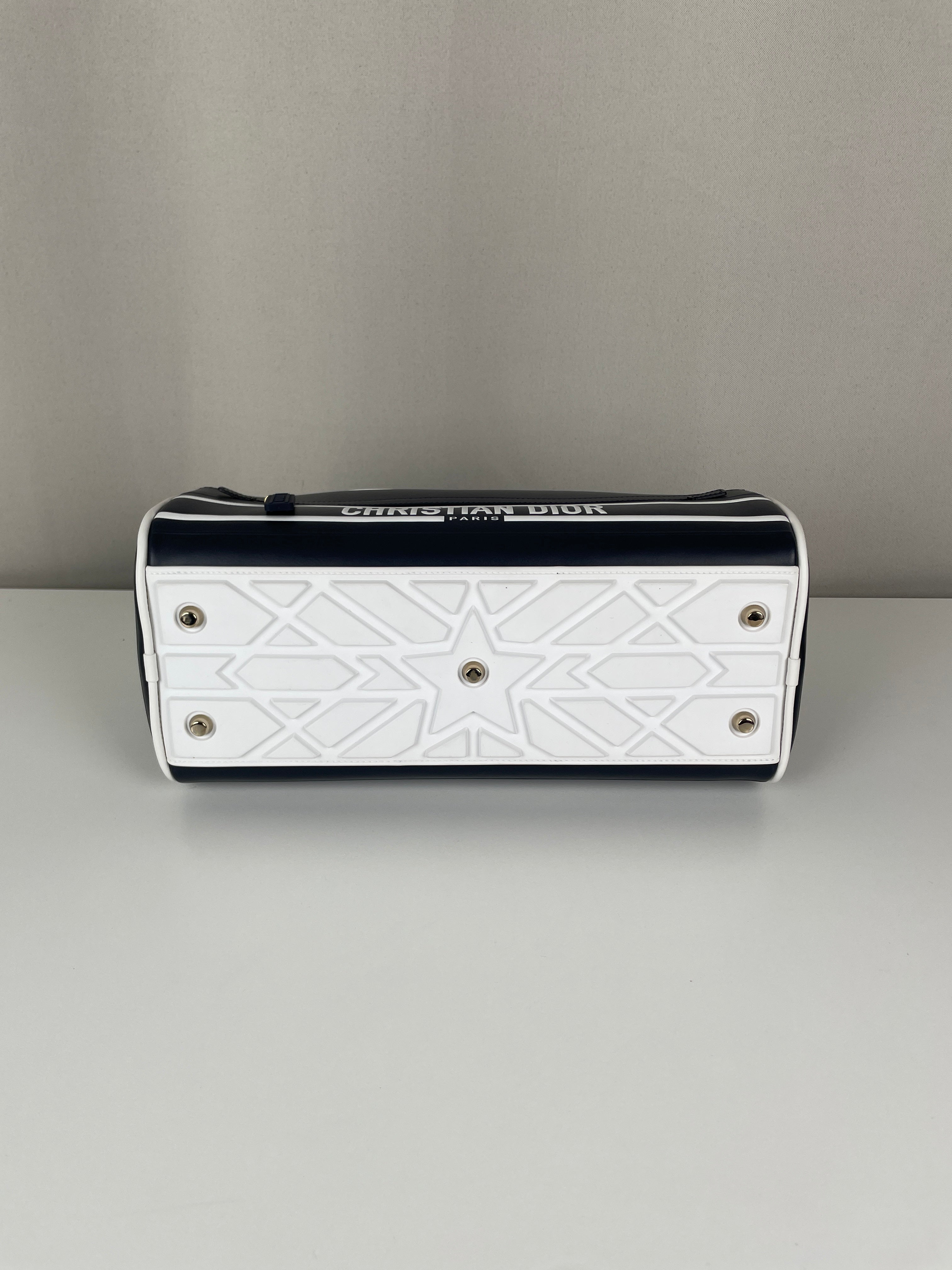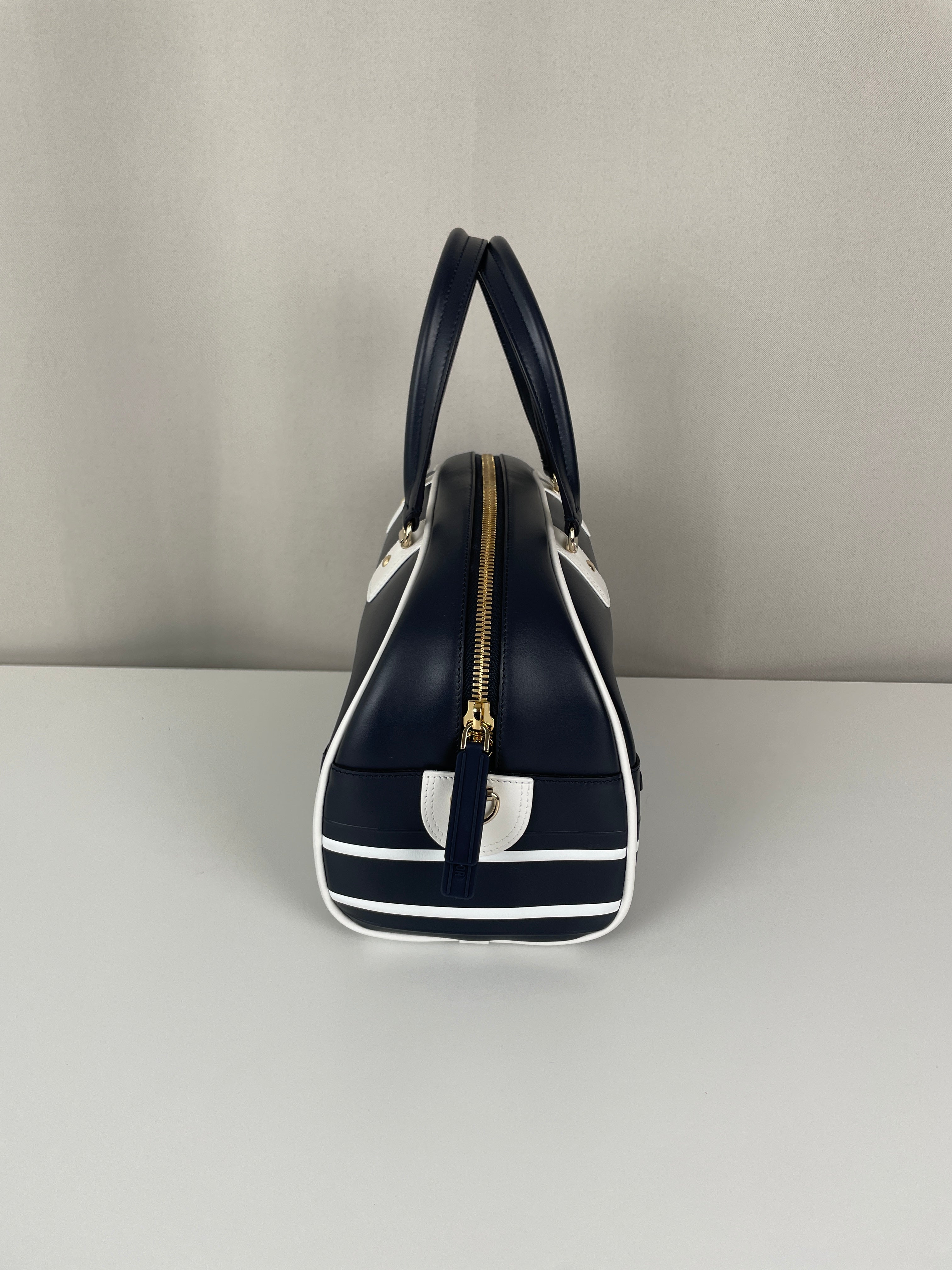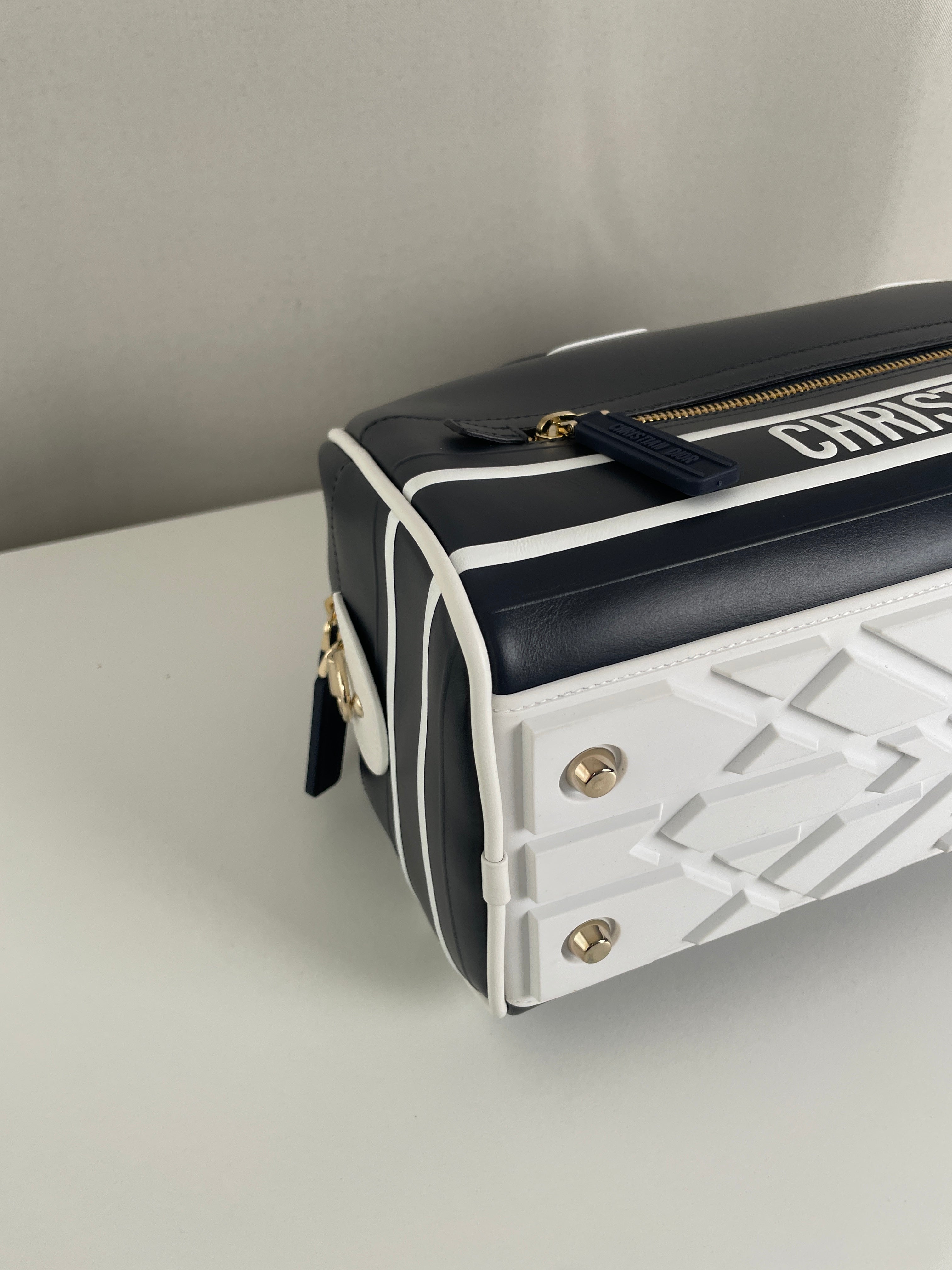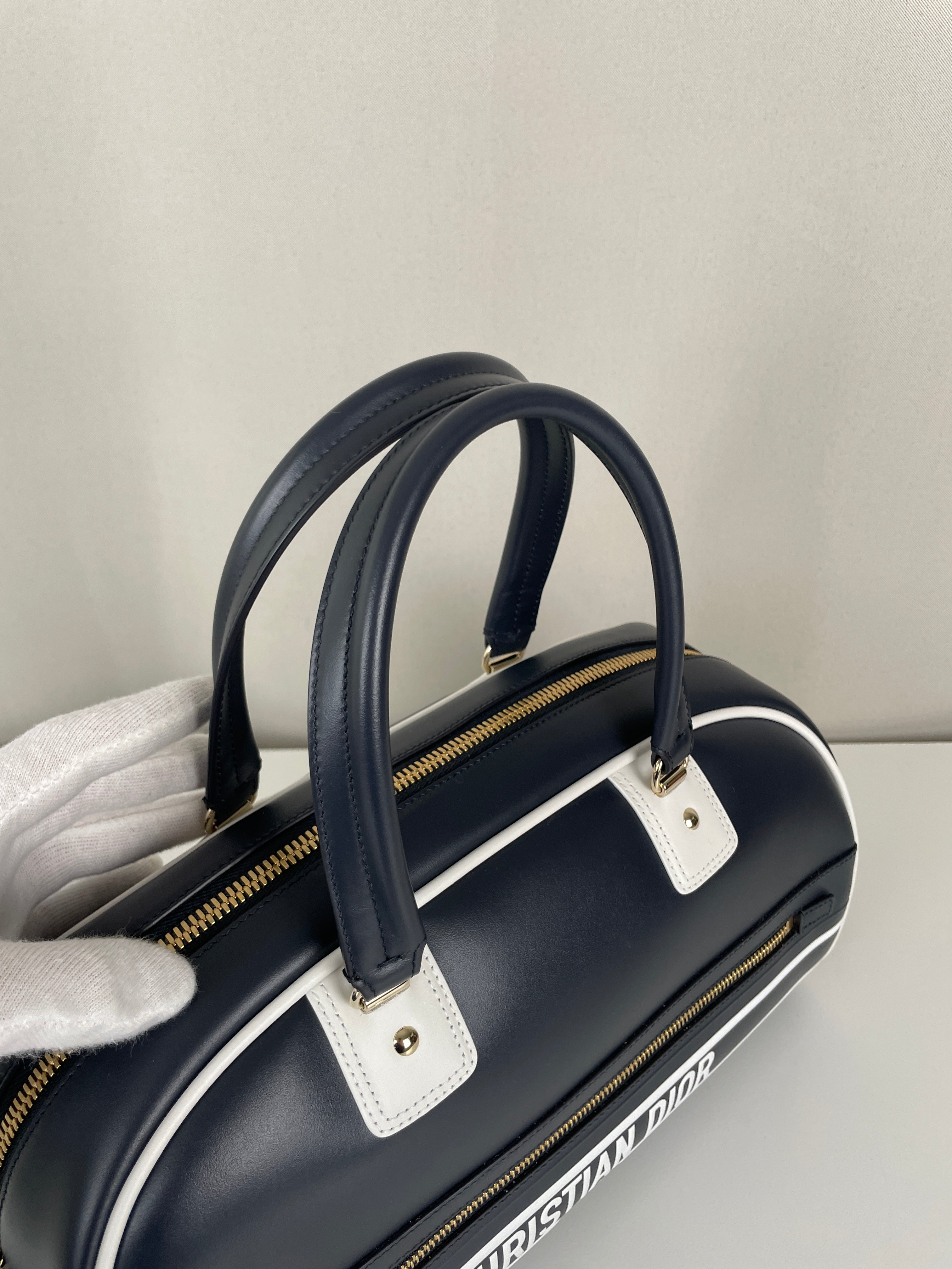 This Dior vibe bowling bag is in very good condition almost as new. The leather and the corners are in excellent condition. The hardware is in very good condition. The inside is in very good condition.