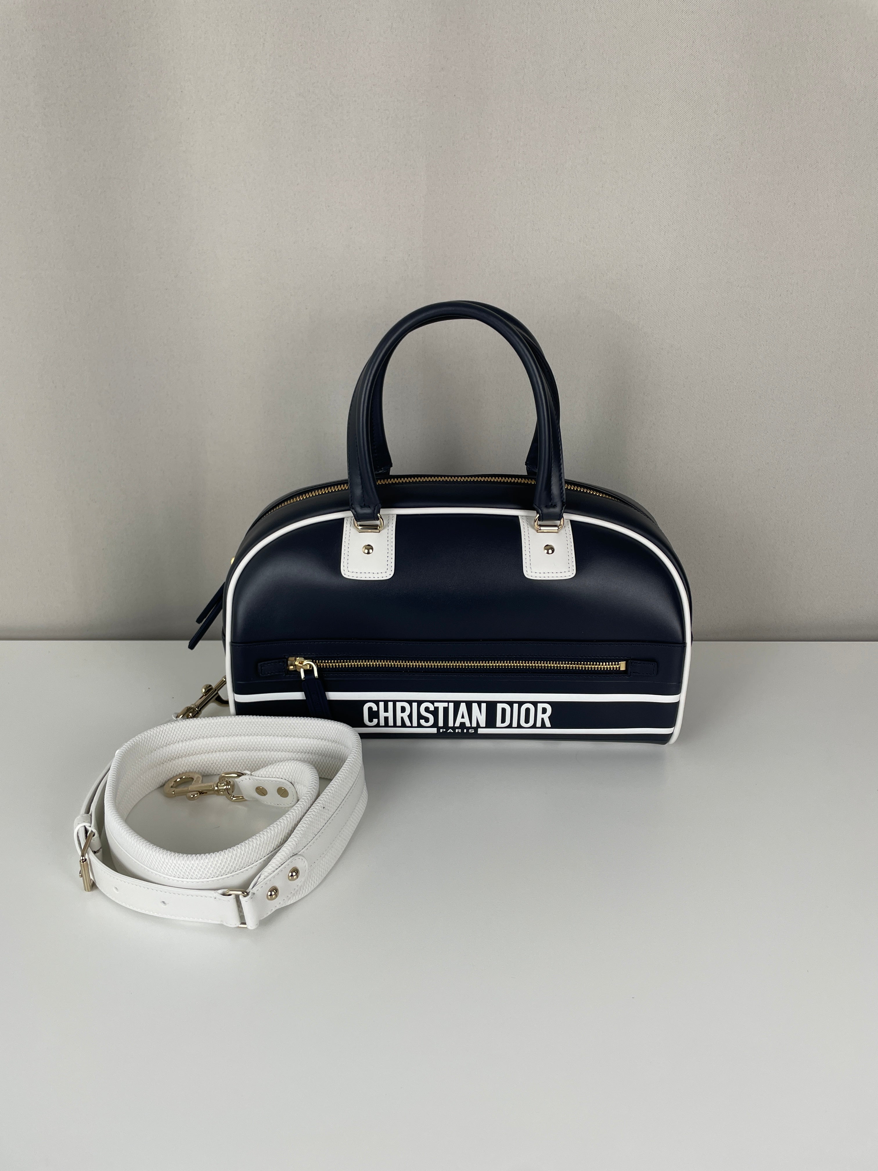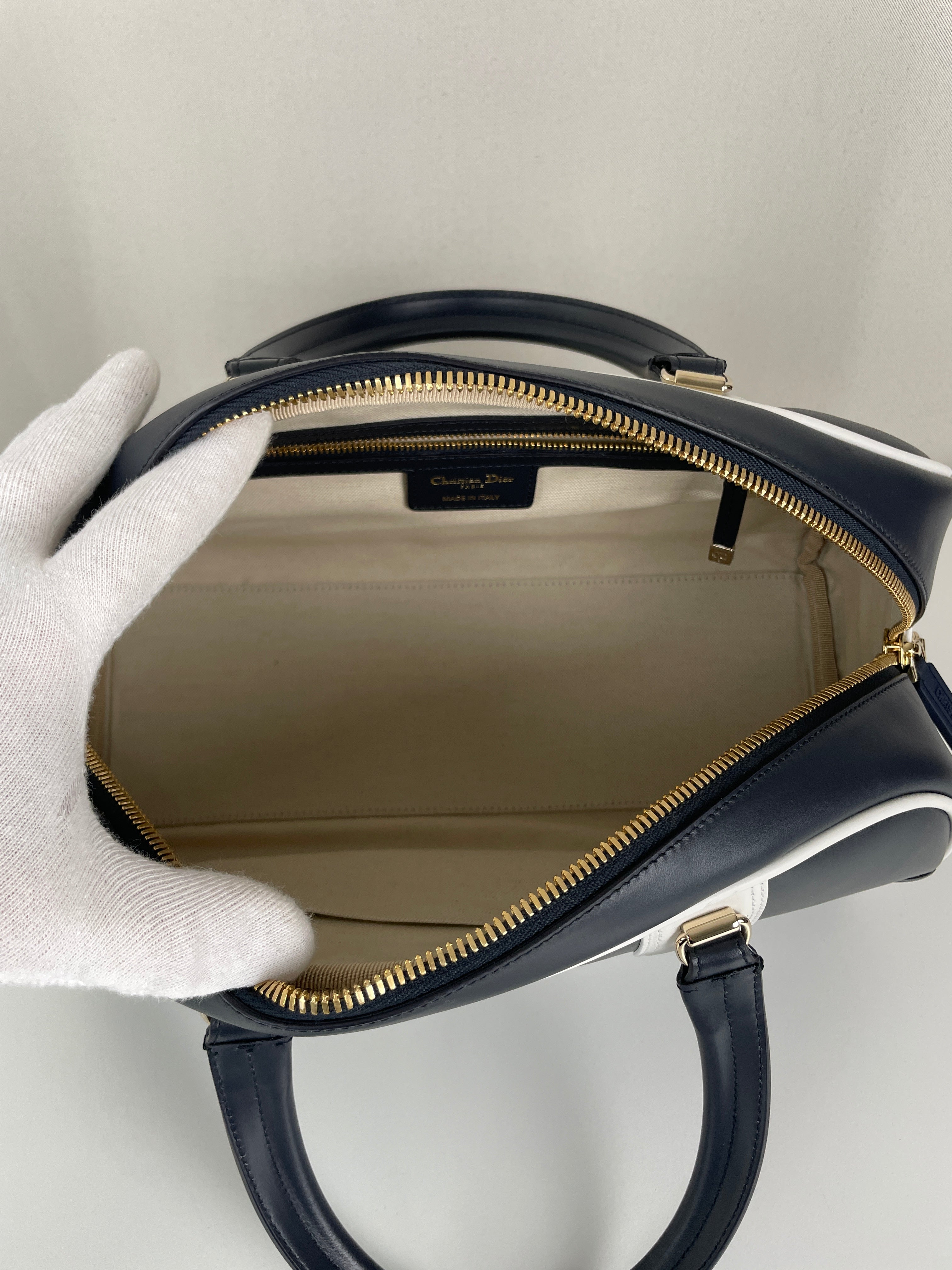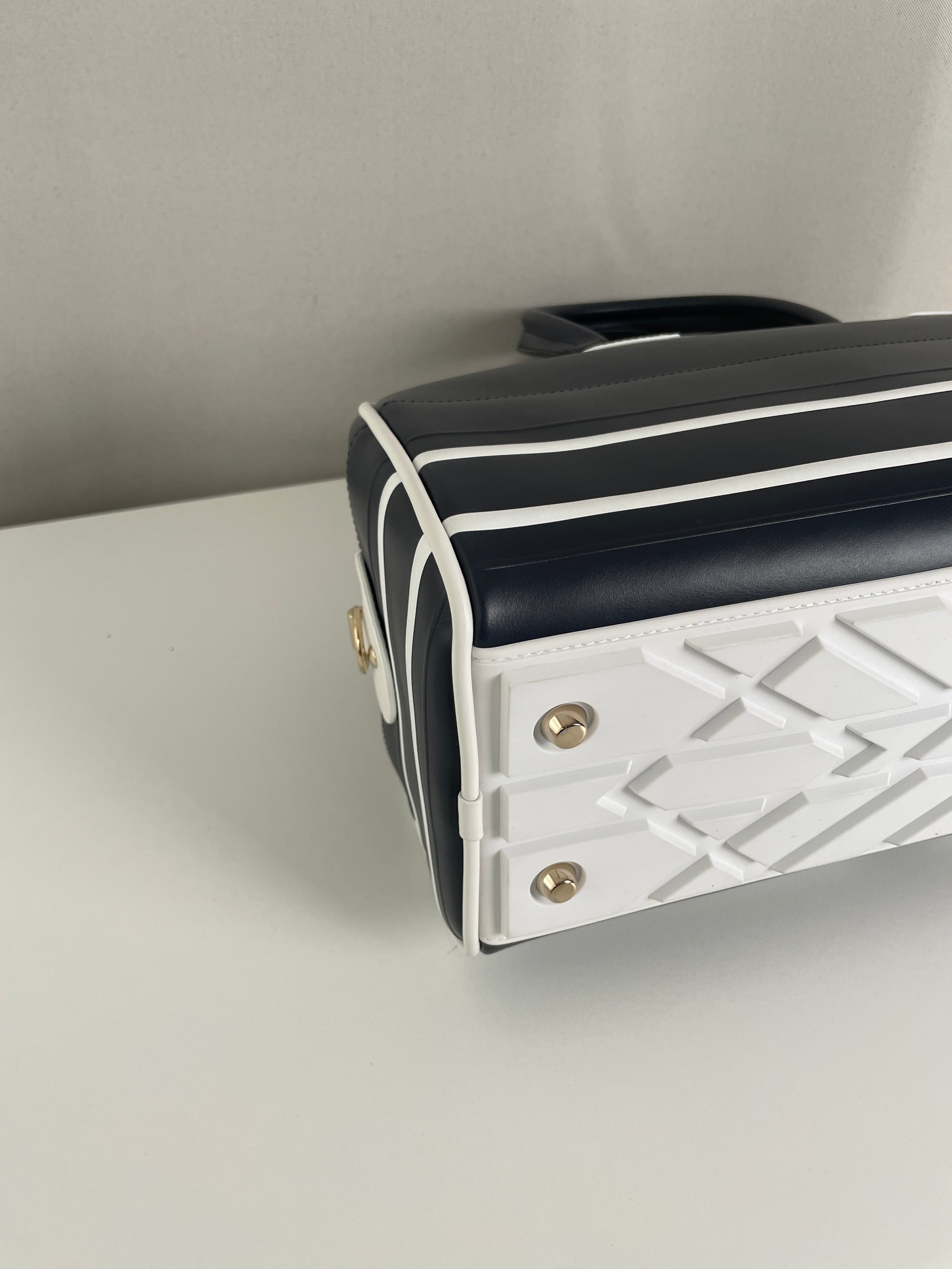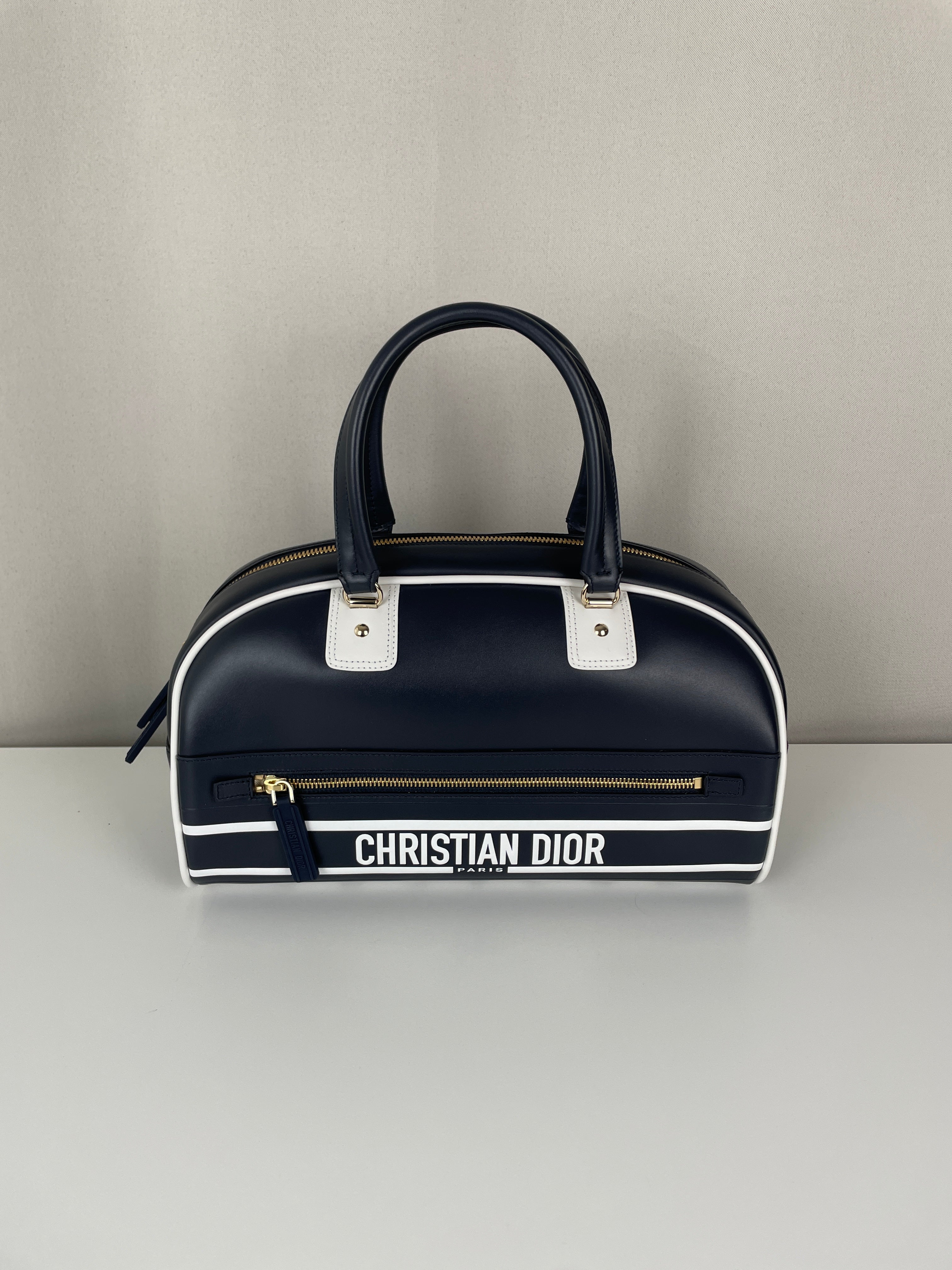 This Dior vibe bowling bag is in very good condition almost as new. The leather and the corners are in excellent condition. The hardware is in very good condition. The inside is in very good condition.