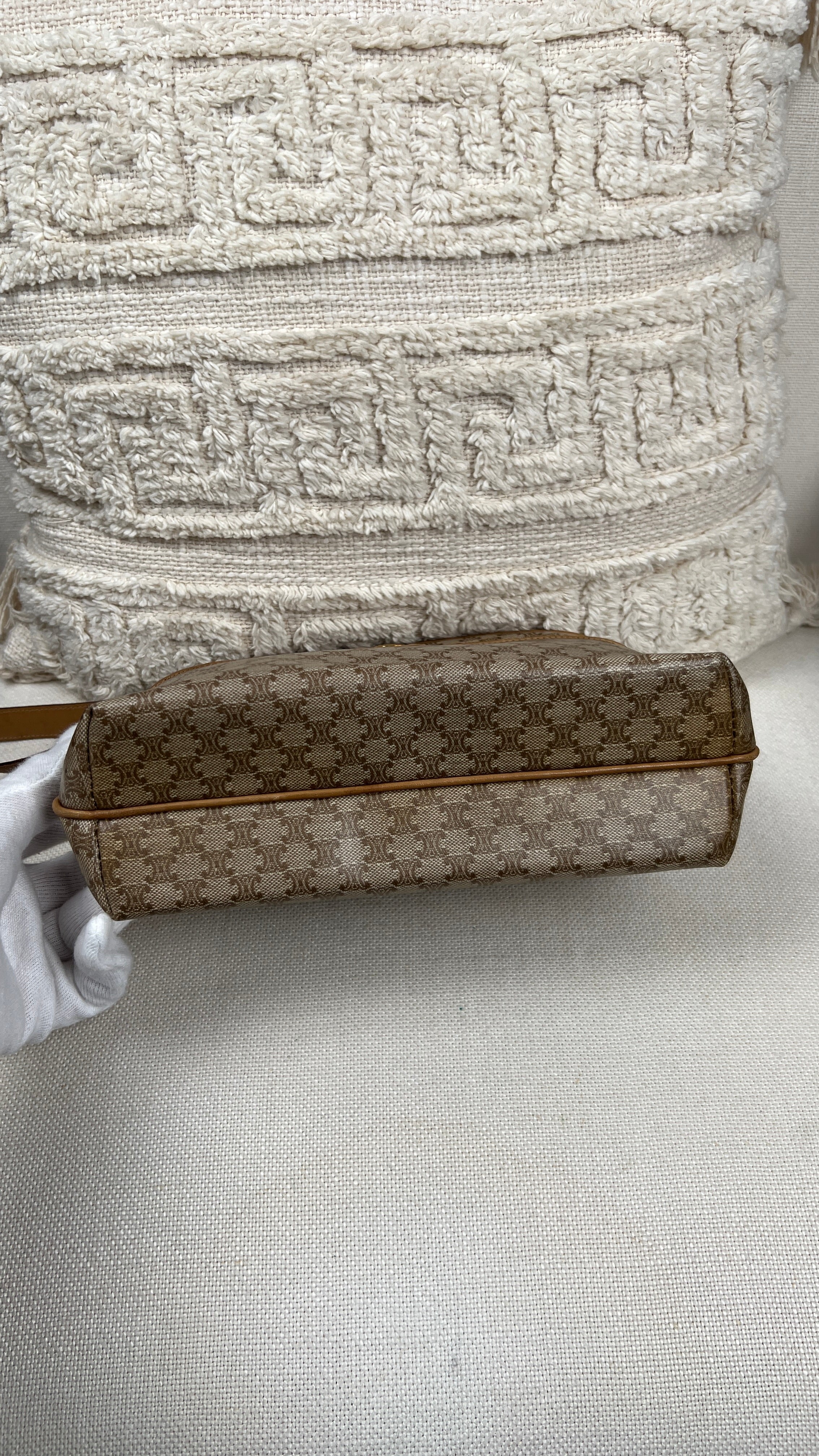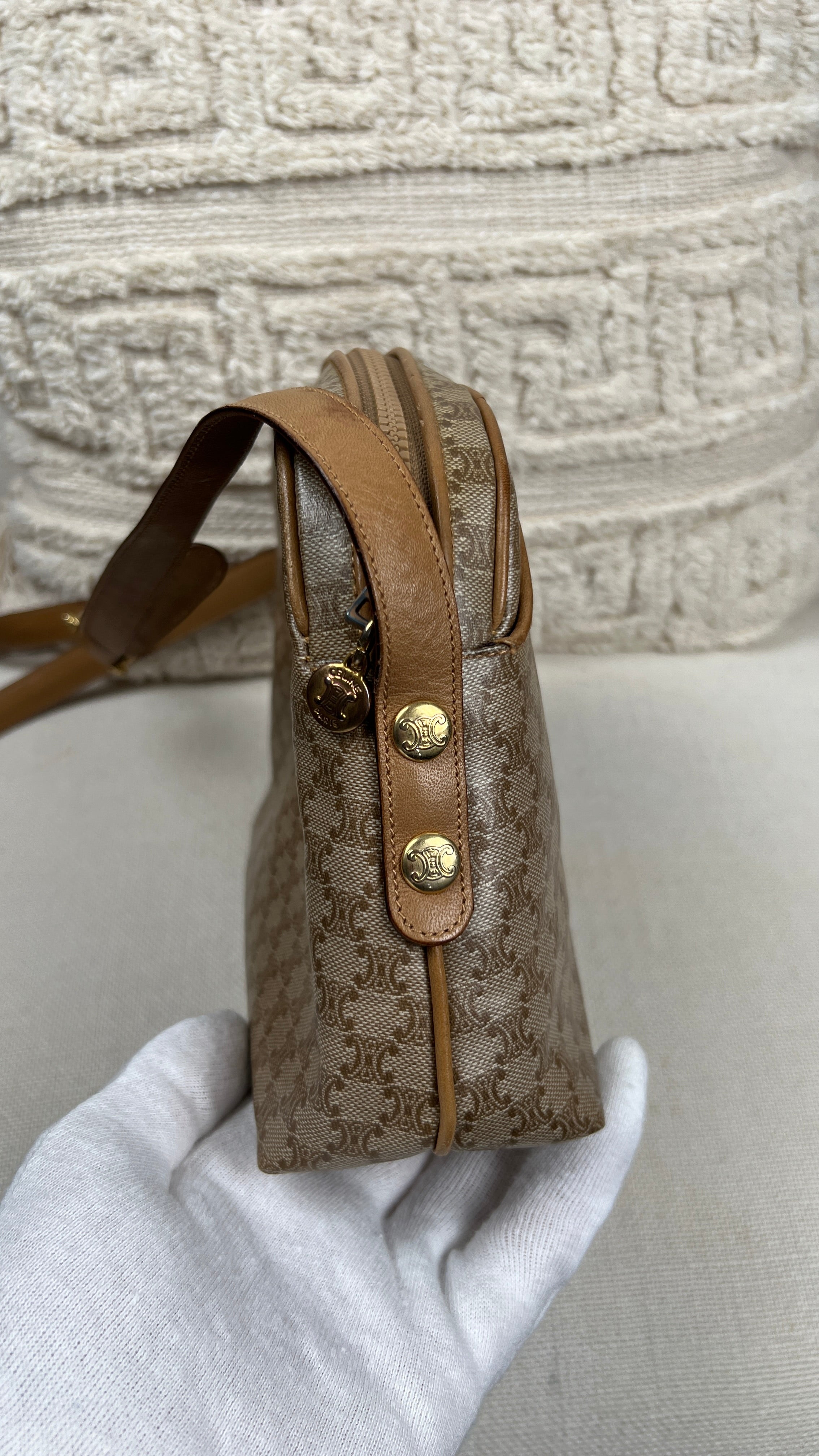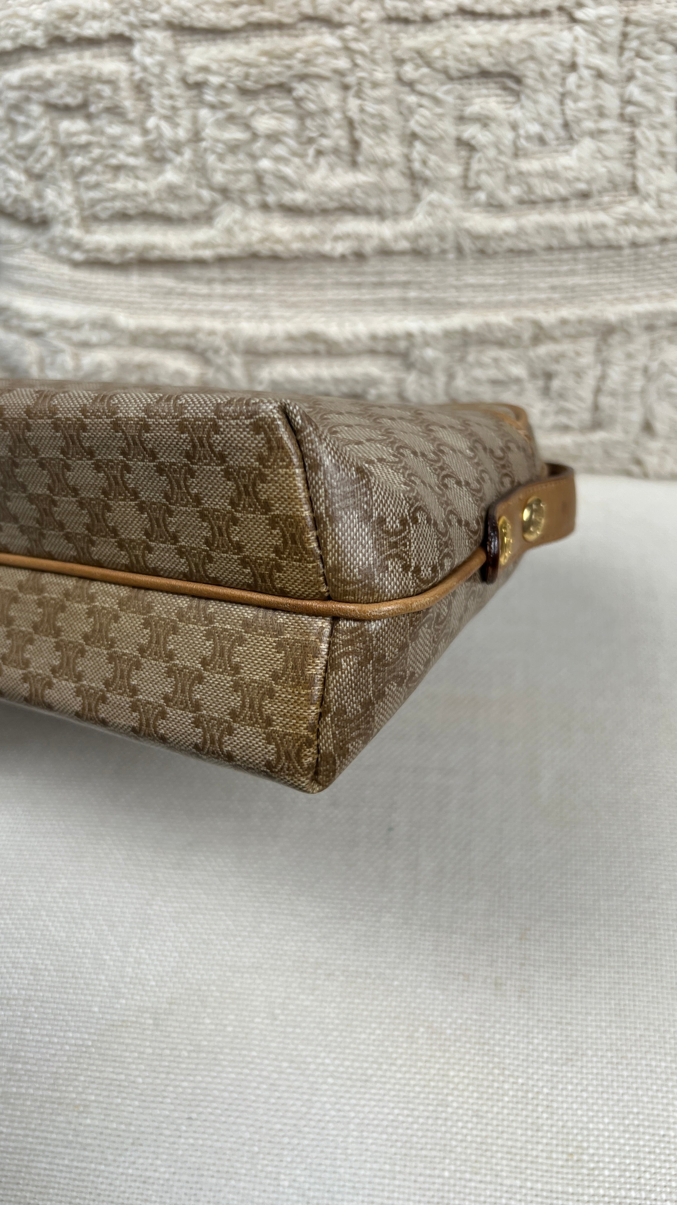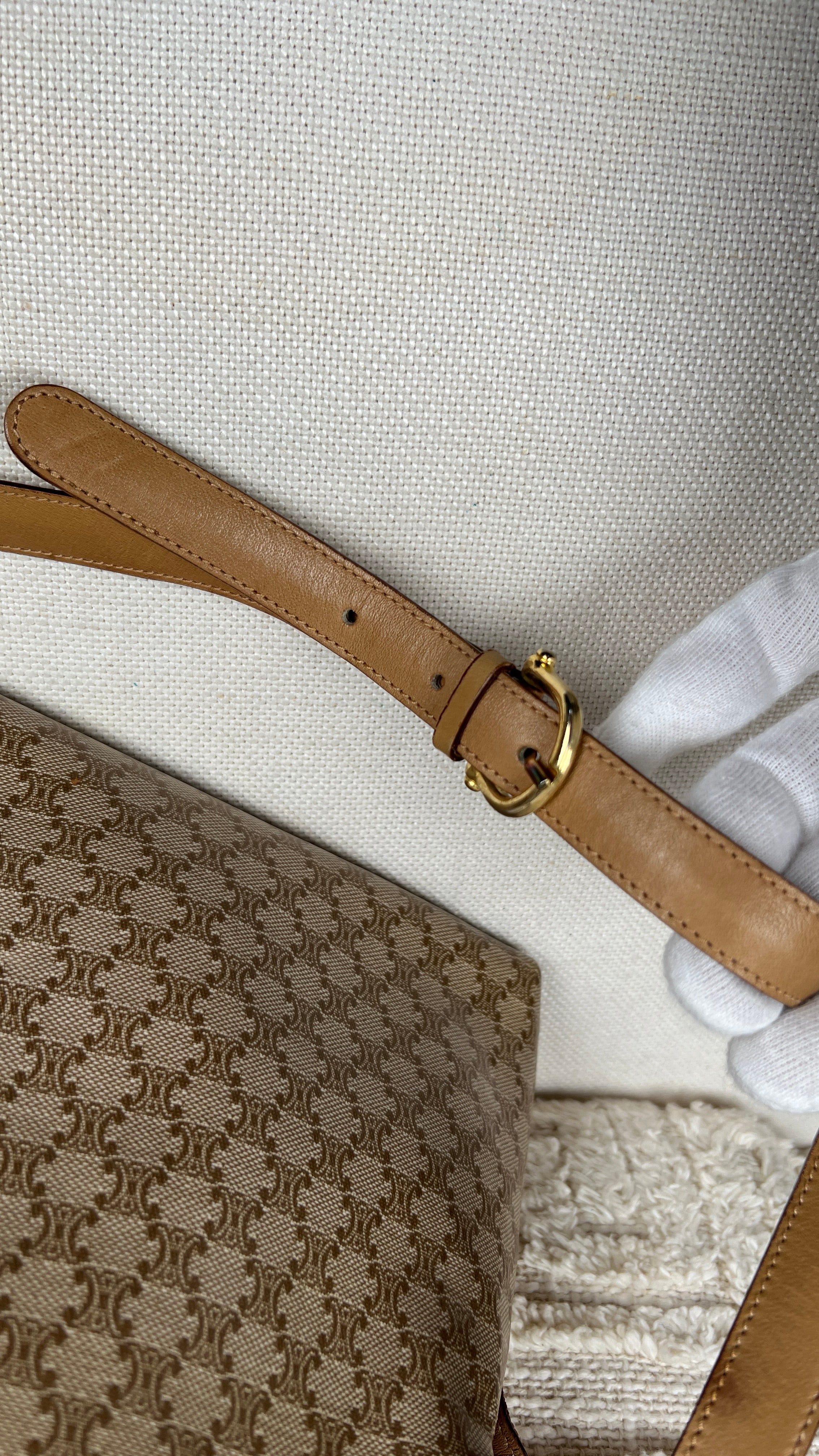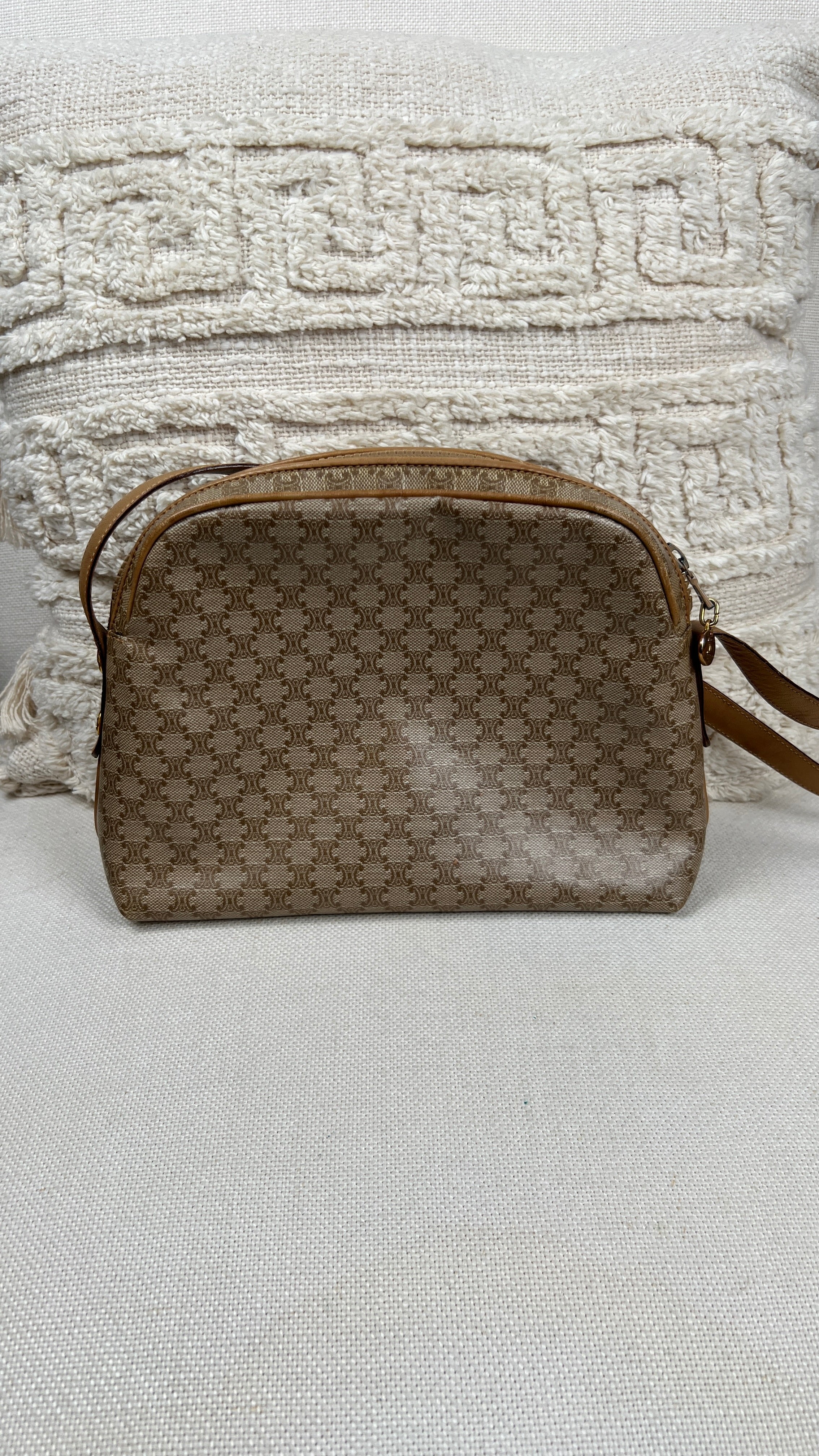 This Celine macadam is in very good condition. The canva, leather parts and corners are in very good condition. The interior is in very good condition, the inside zipper pocket is in very good condition too. The strap is in very good condition you only have few minor stains.