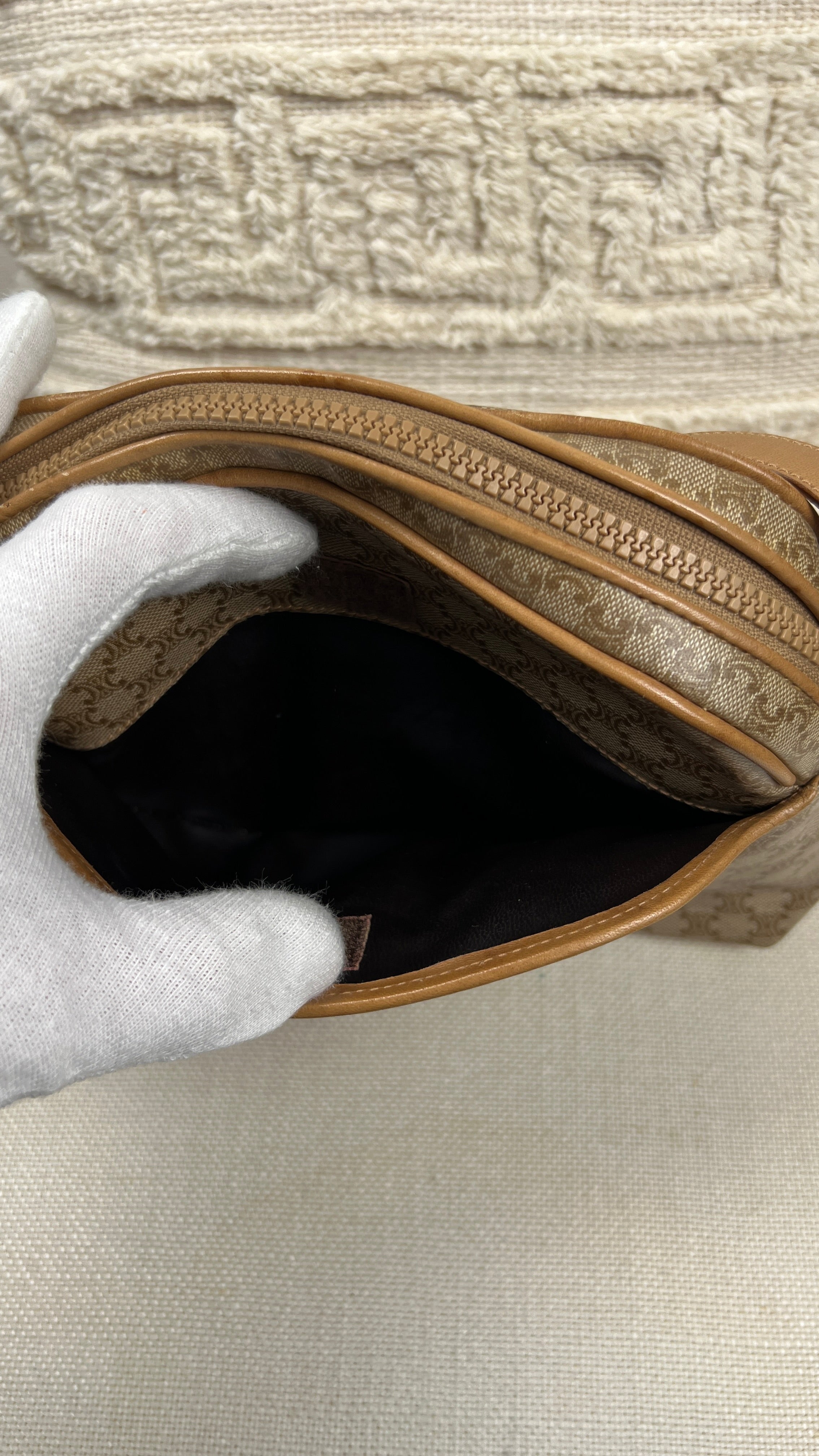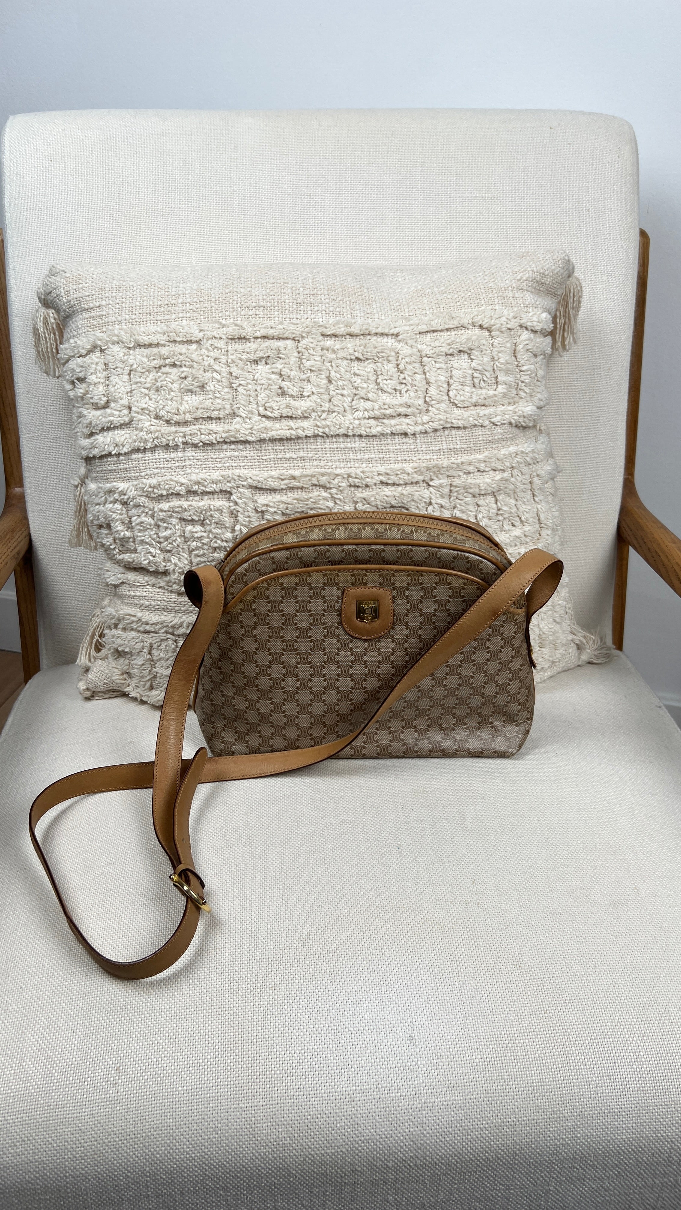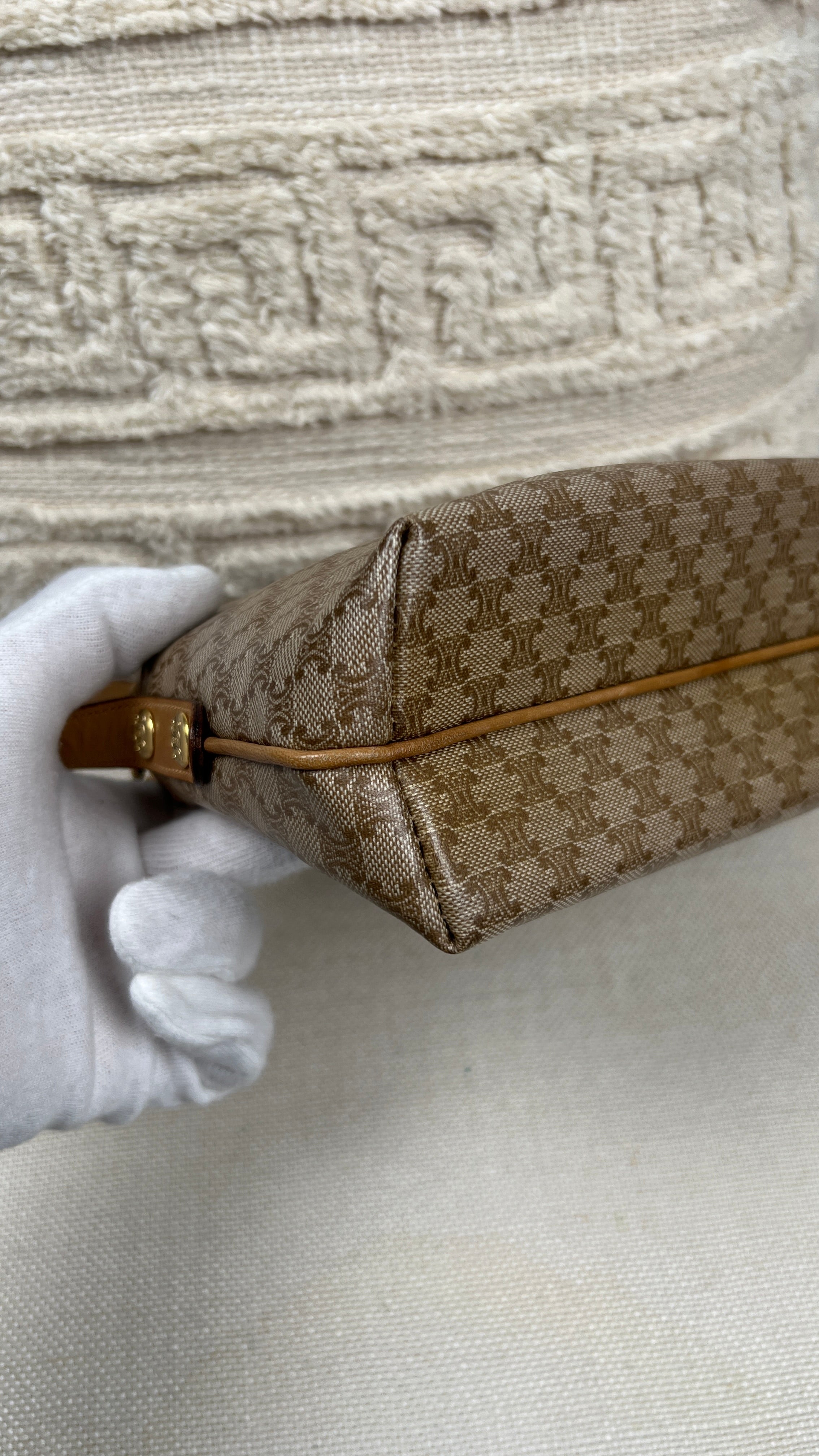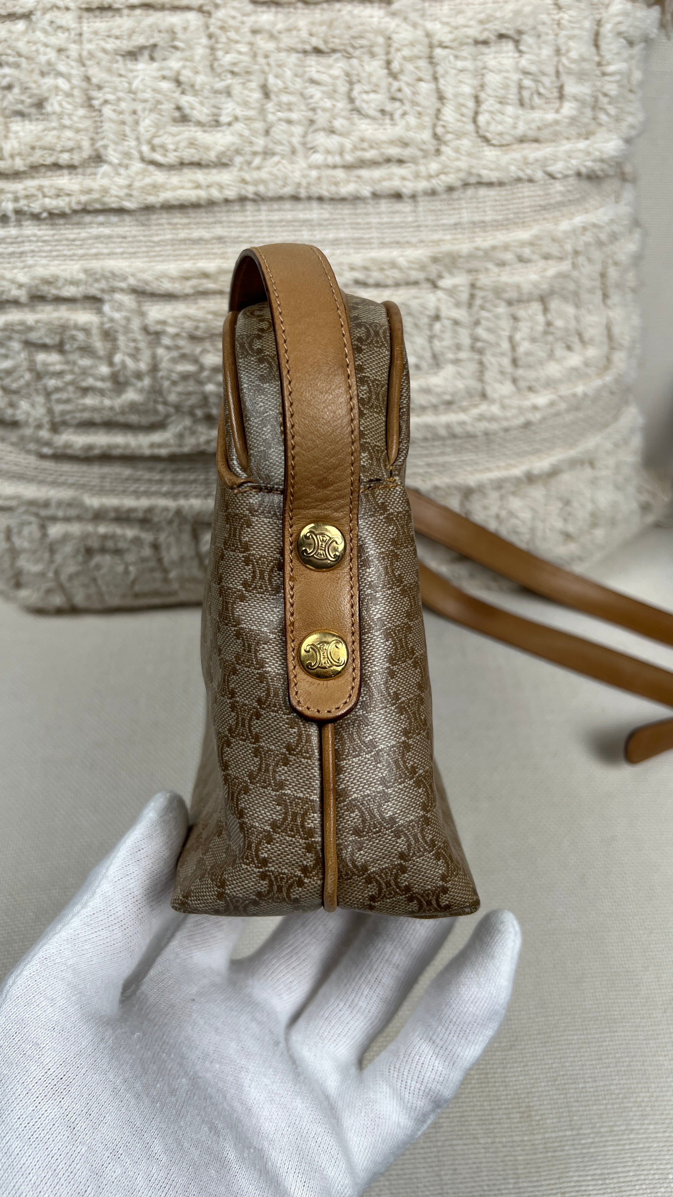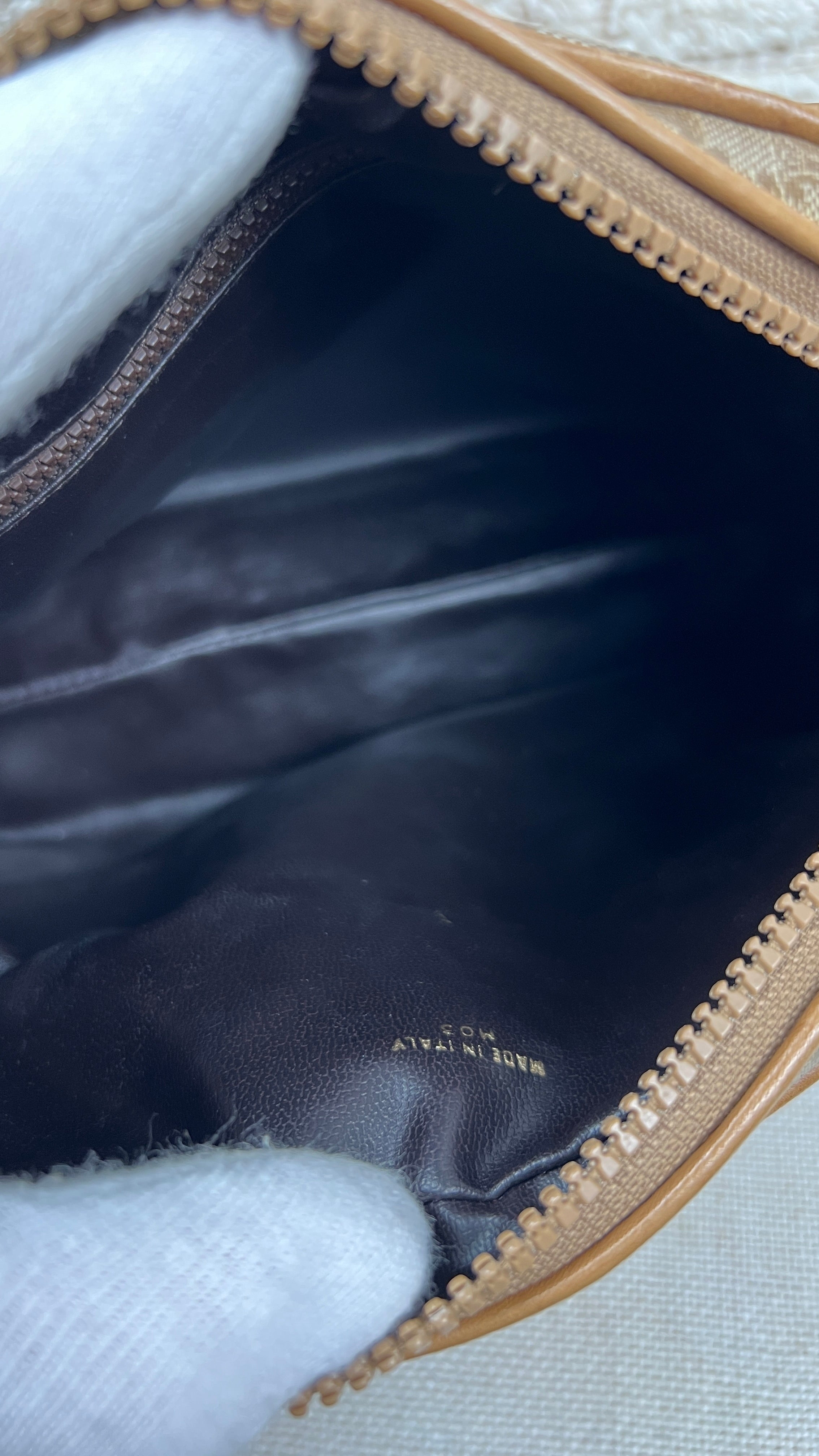 This Celine macadam is in very good condition. The canva, leather parts and corners are in very good condition. The interior is in very good condition, the inside zipper pocket is in very good condition too. The strap is in very good condition you only have few minor stains.
