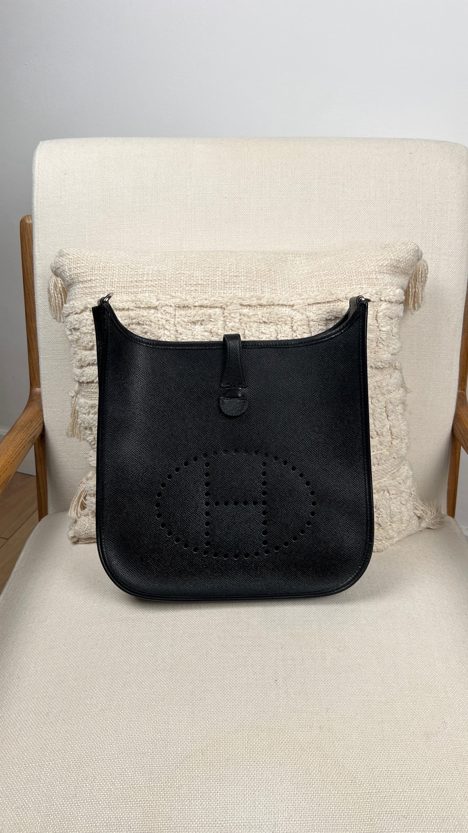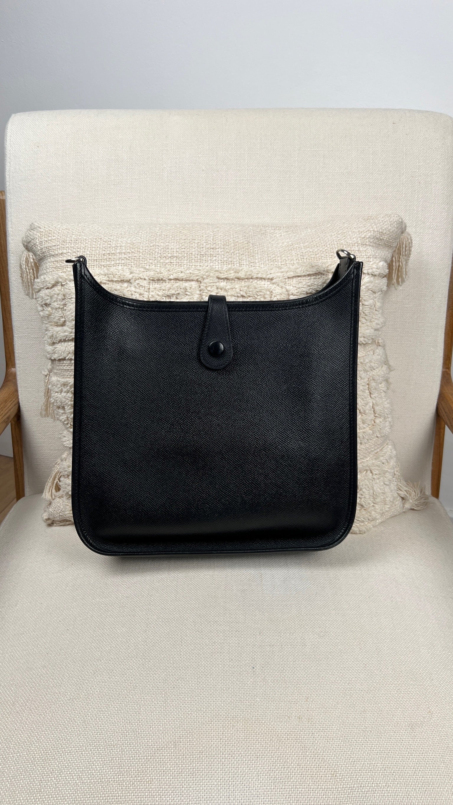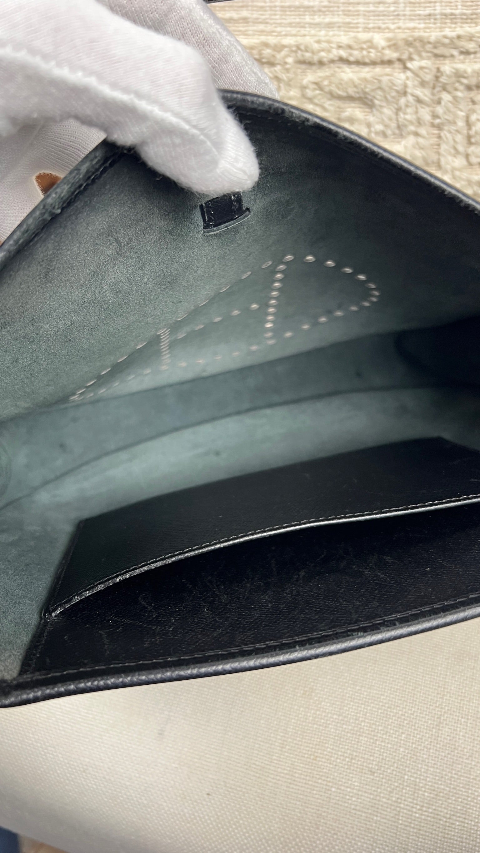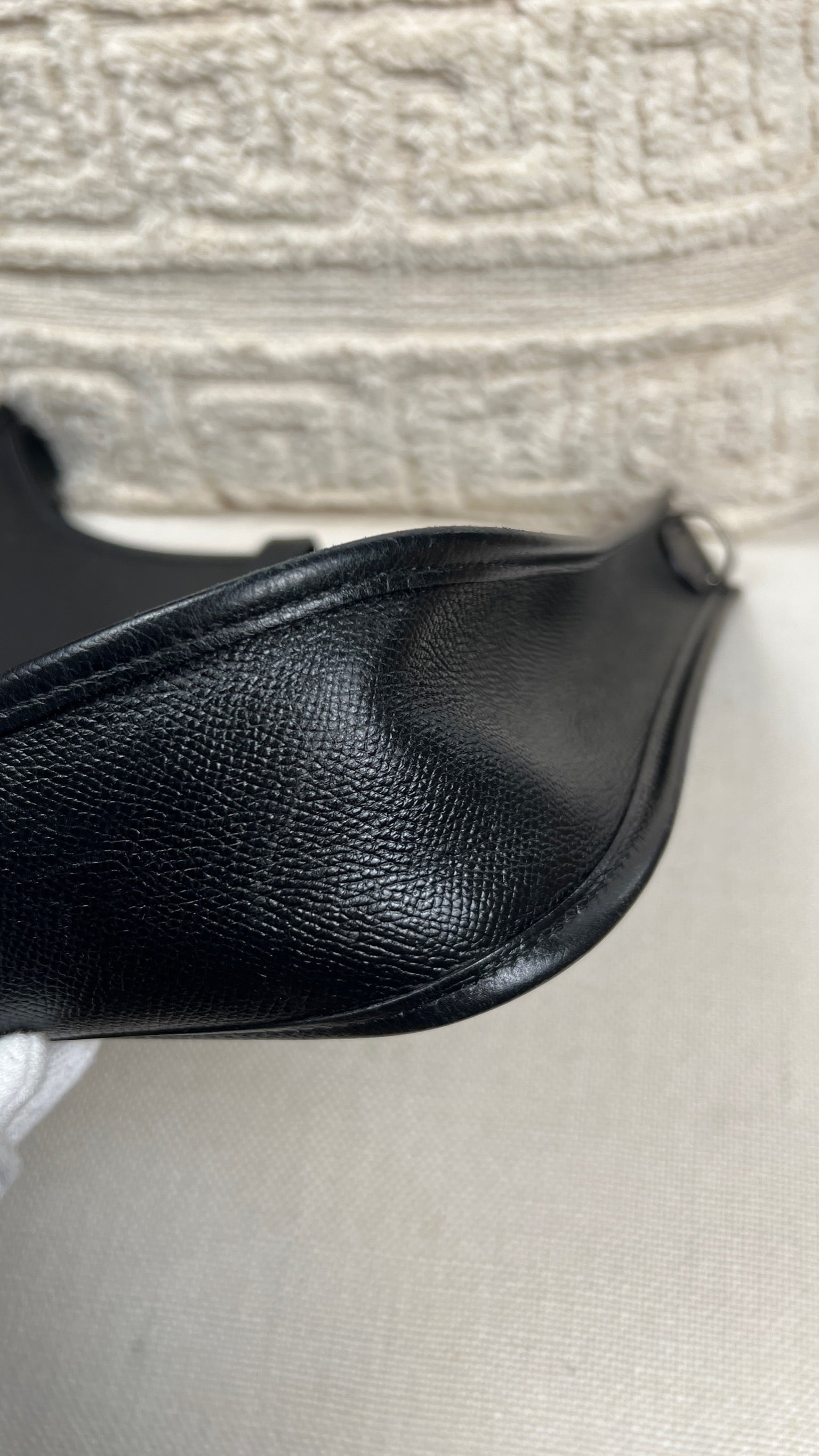 This Hermes Evelyn 29 is in very good condition. The leather is in very good condition, but there are small scratches. The right corner where the bag opens is damaged and a little worn. The interior is in very good condition, few little stains. The strap is in good condition with only minor signs of wear.