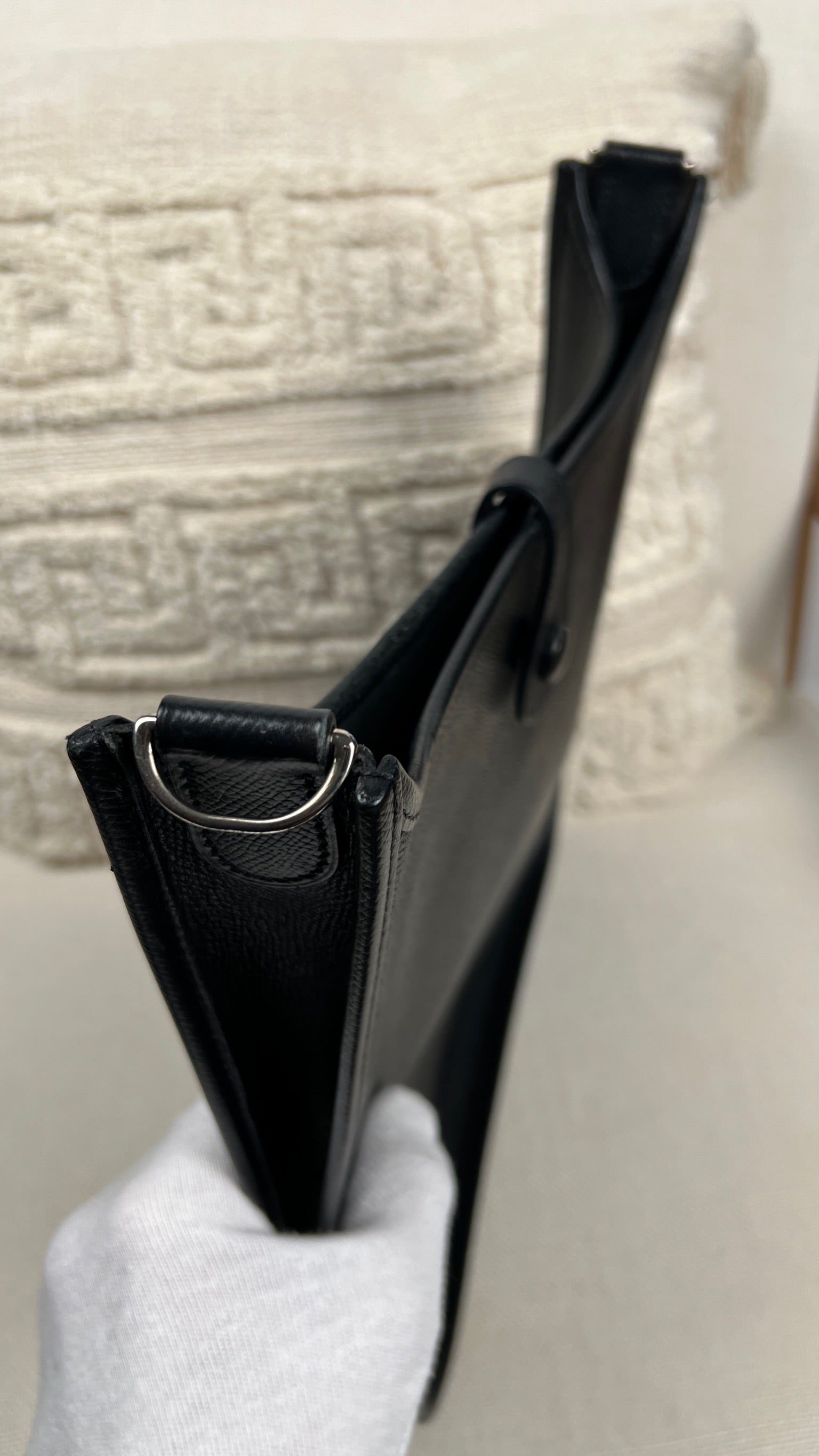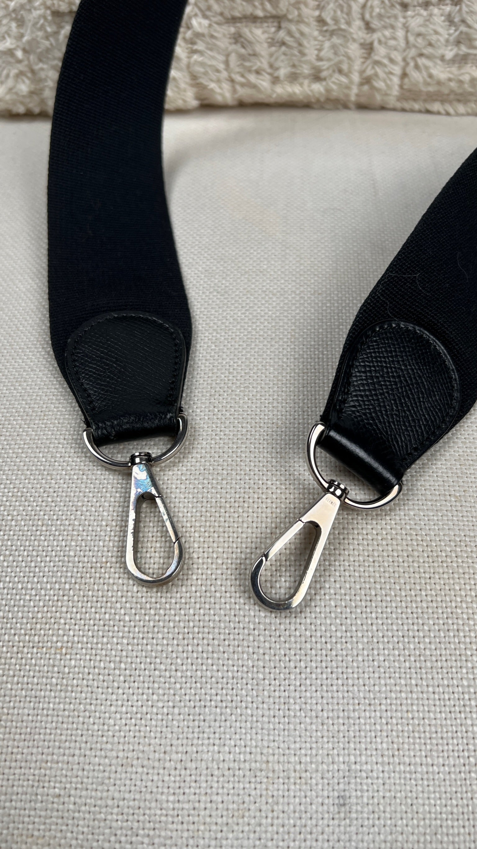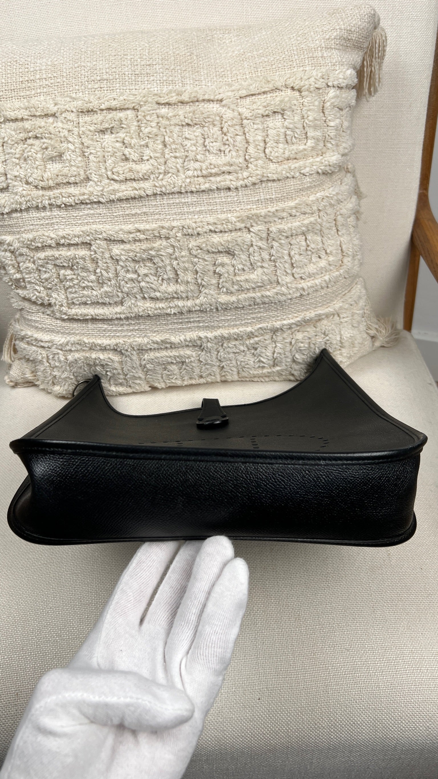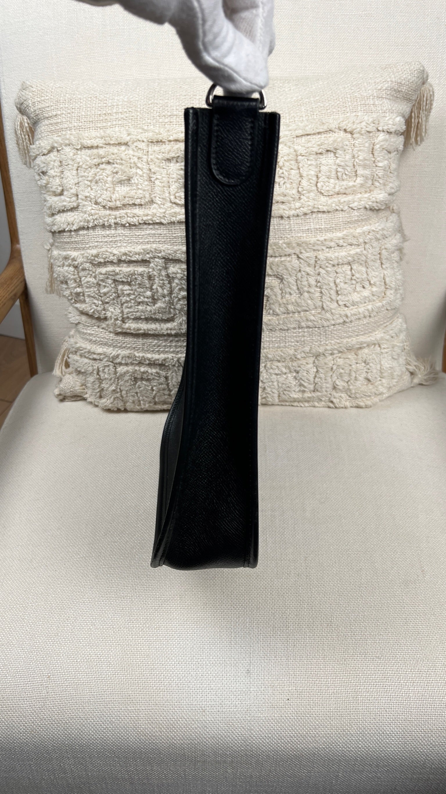 This Hermes Evelyn 29 is in very good condition. The leather is in very good condition, but there are small scratches. The right corner where the bag opens is damaged and a little worn. The interior is in very good condition, few little stains. The strap is in good condition with only minor signs of wear.