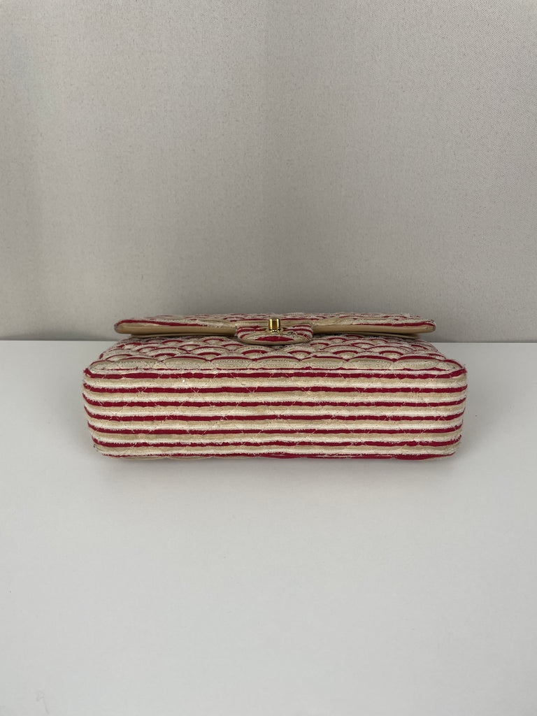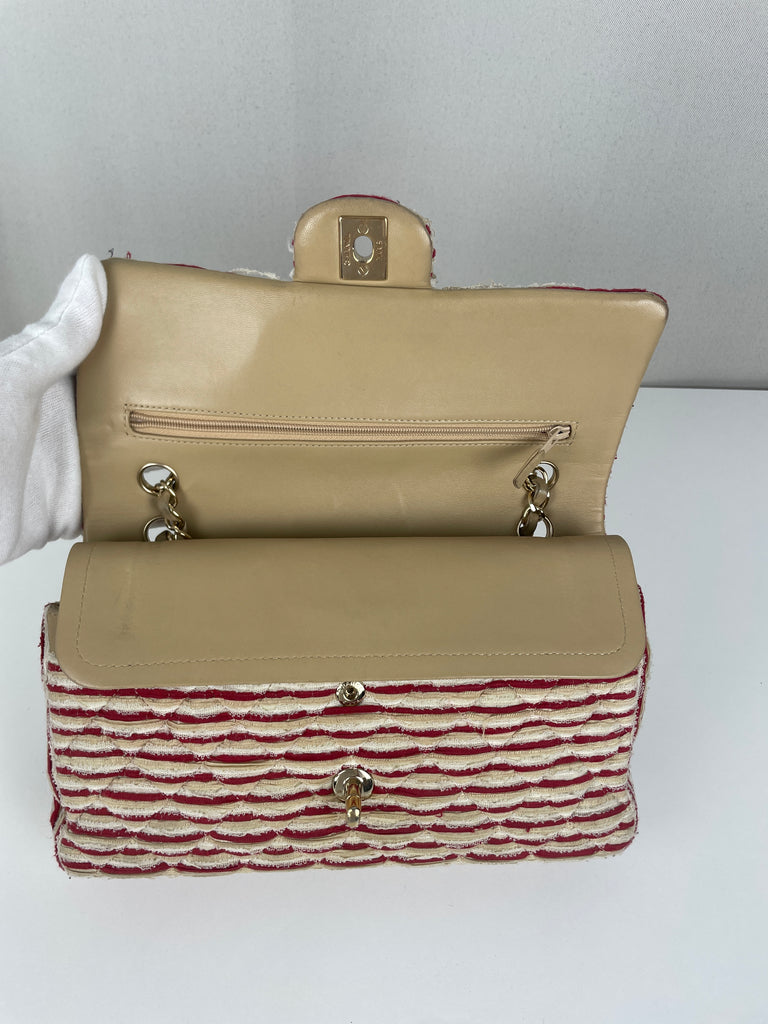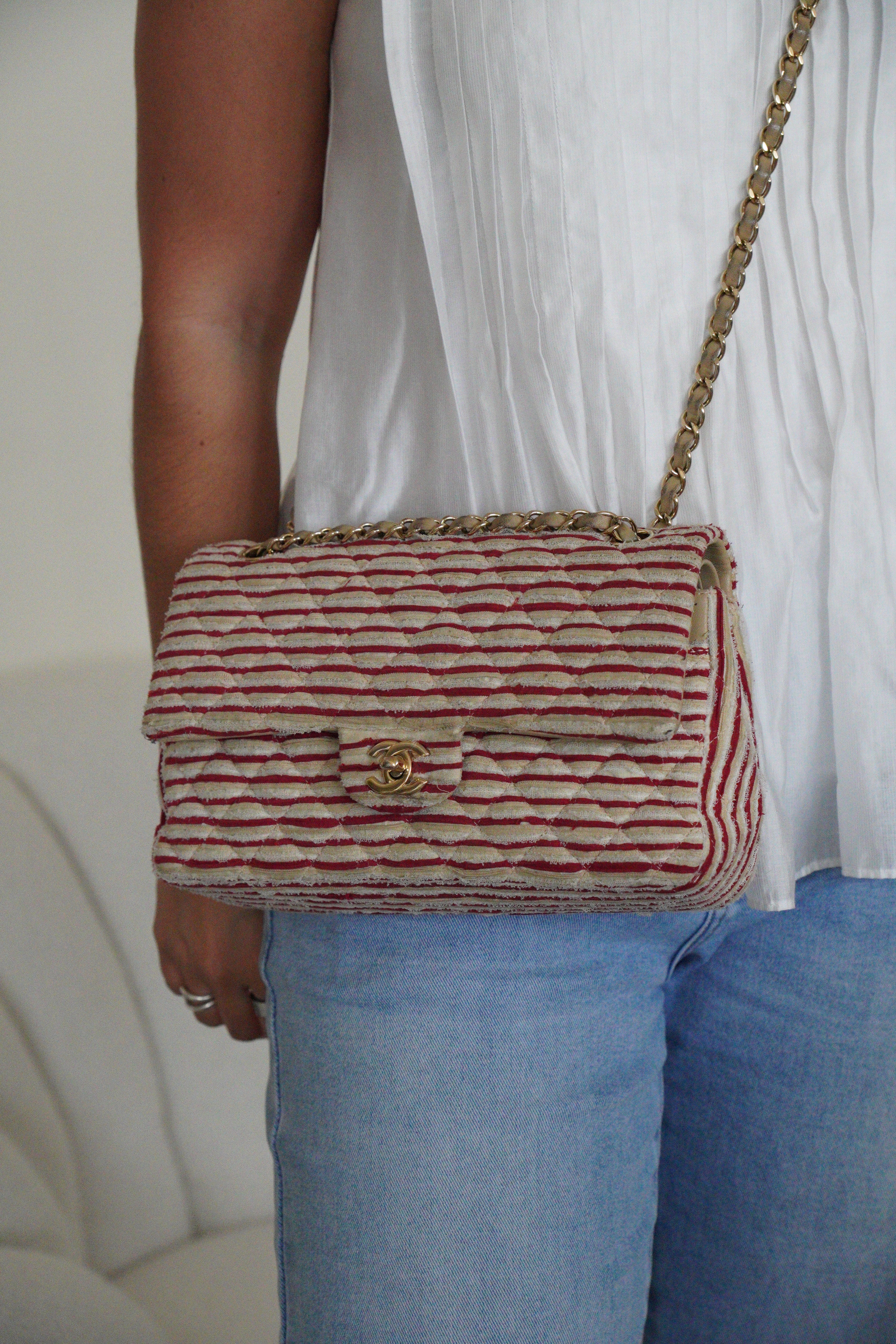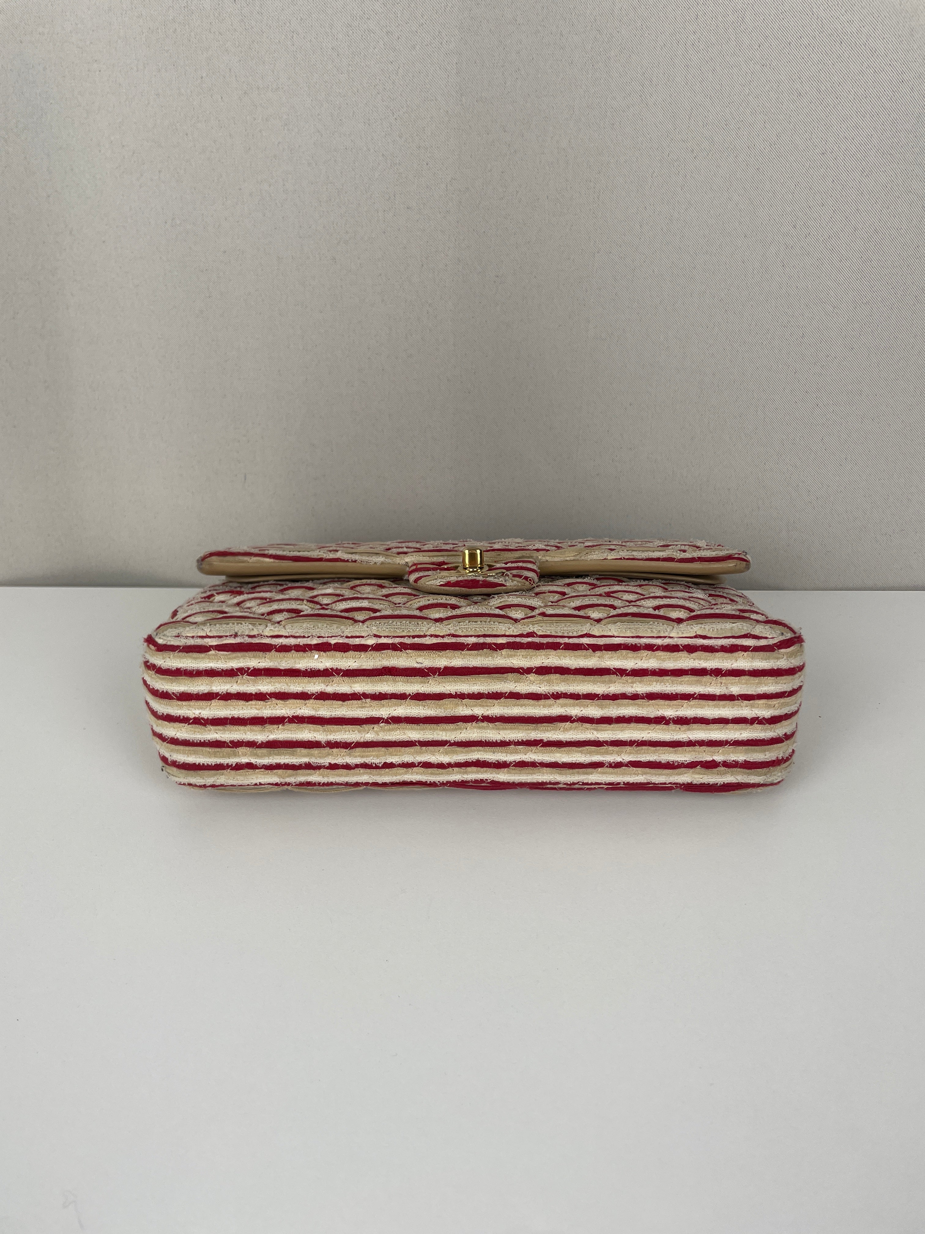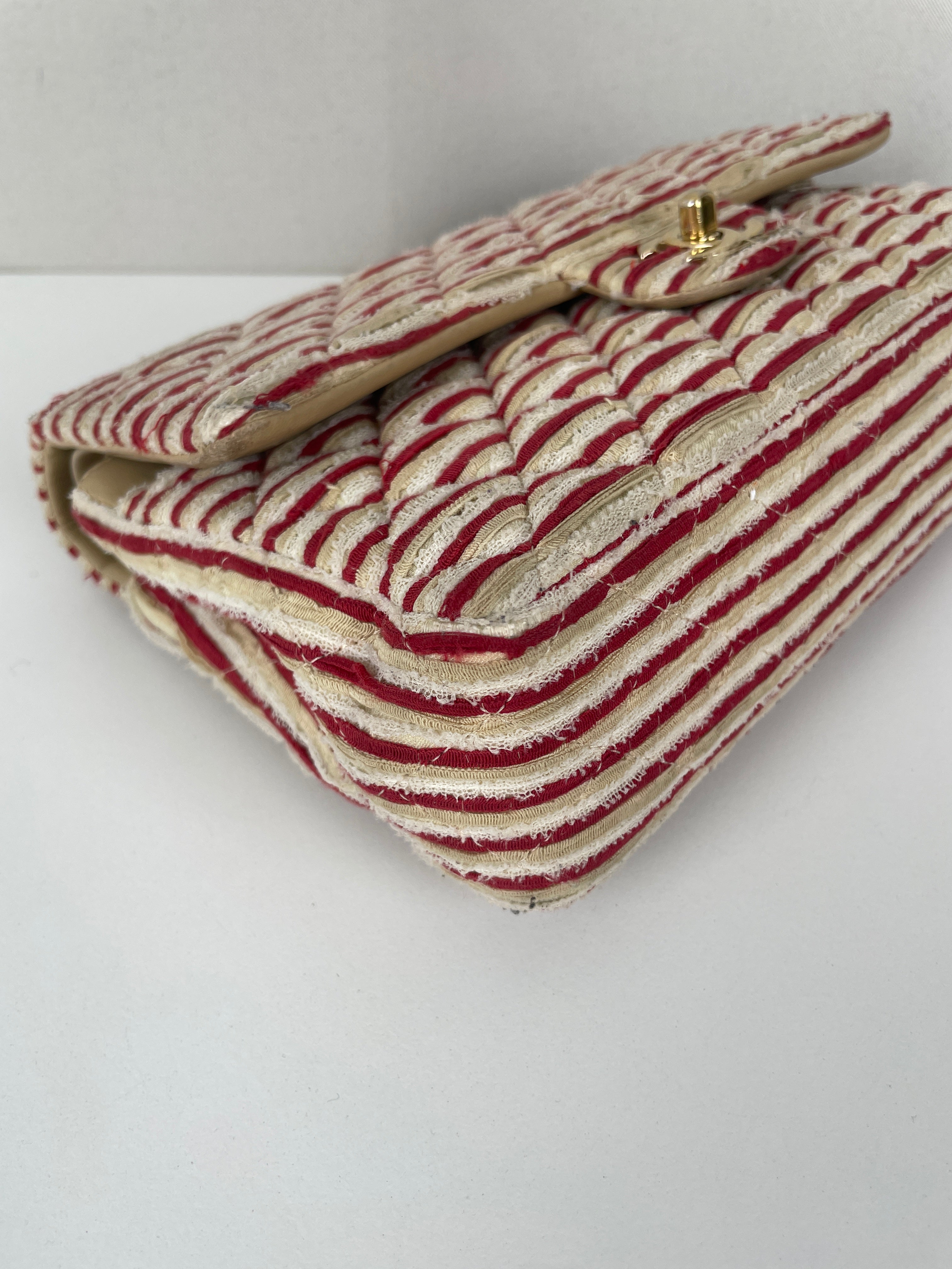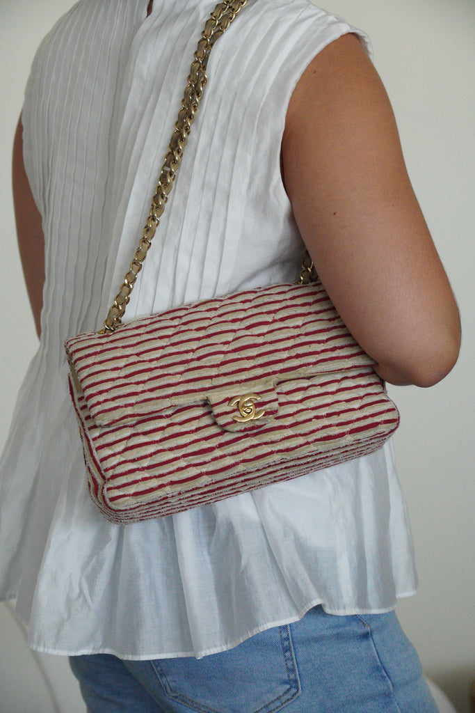 The Timeless Sailor is one of Chanel's most distinctive and charming seasonal designs. This fabric edition from 2014 showcases the maison's nautical-inspired craftsmanship in a beautiful white, beige and red colorway with over a decade of authentic character. A unique piece that embodies Chanel's creative heritage and represents the perfect blend of maritime elegance with timeless sophistication.