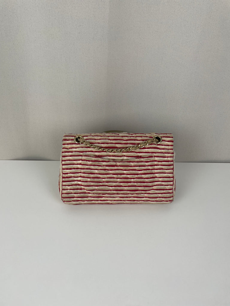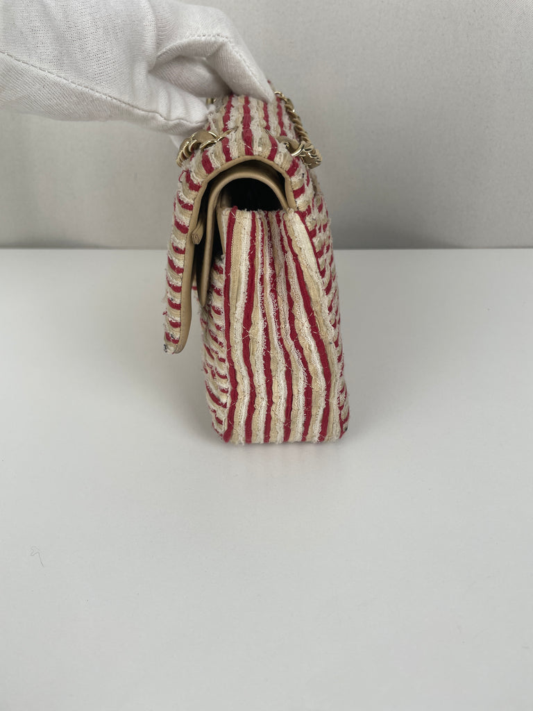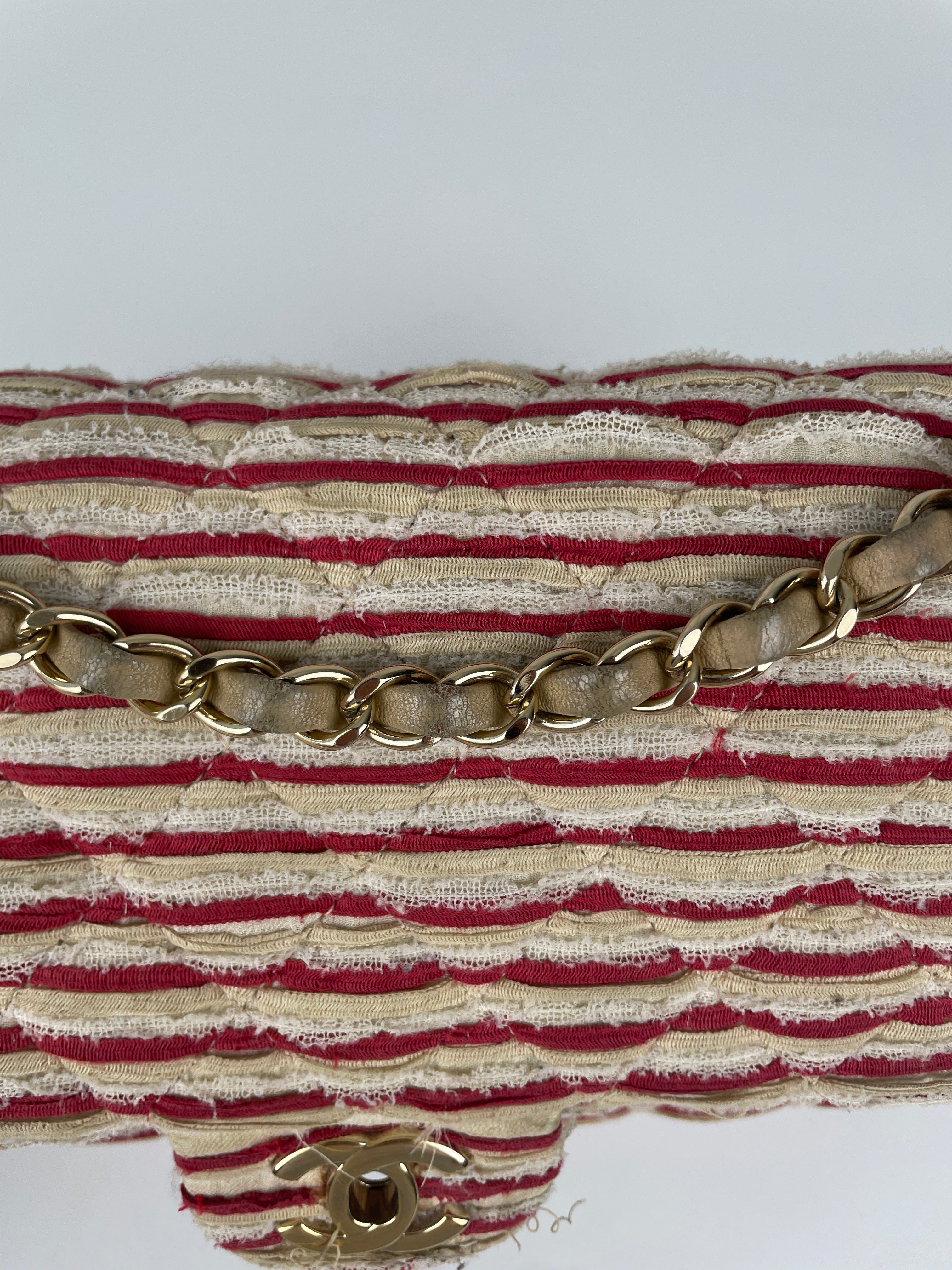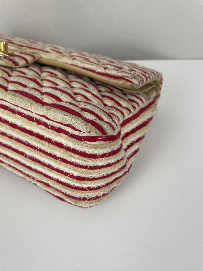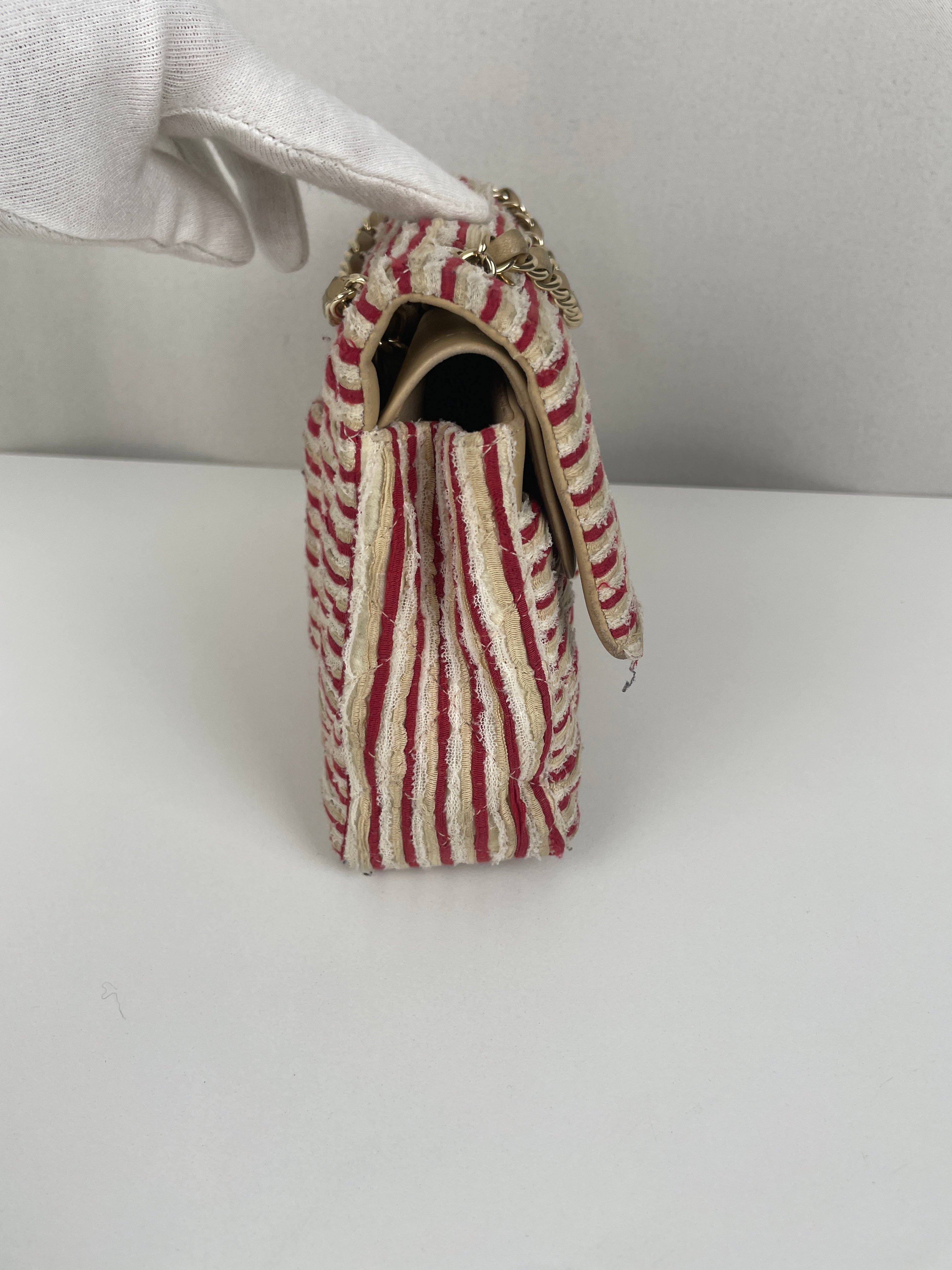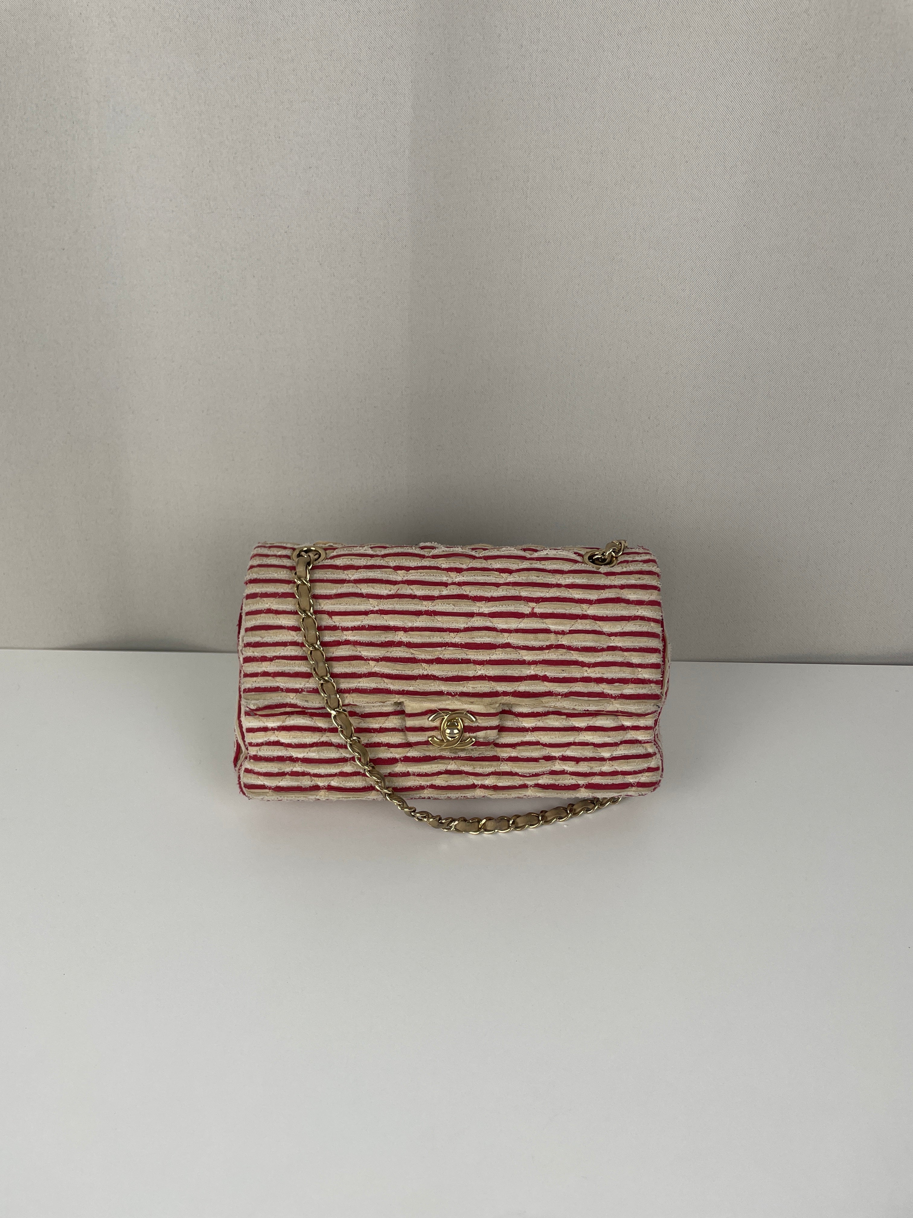 The Timeless Sailor is one of Chanel's most distinctive and charming seasonal designs. This fabric edition from 2014 showcases the maison's nautical-inspired craftsmanship in a beautiful white, beige and red colorway with over a decade of authentic character. A unique piece that embodies Chanel's creative heritage and represents the perfect blend of maritime elegance with timeless sophistication.