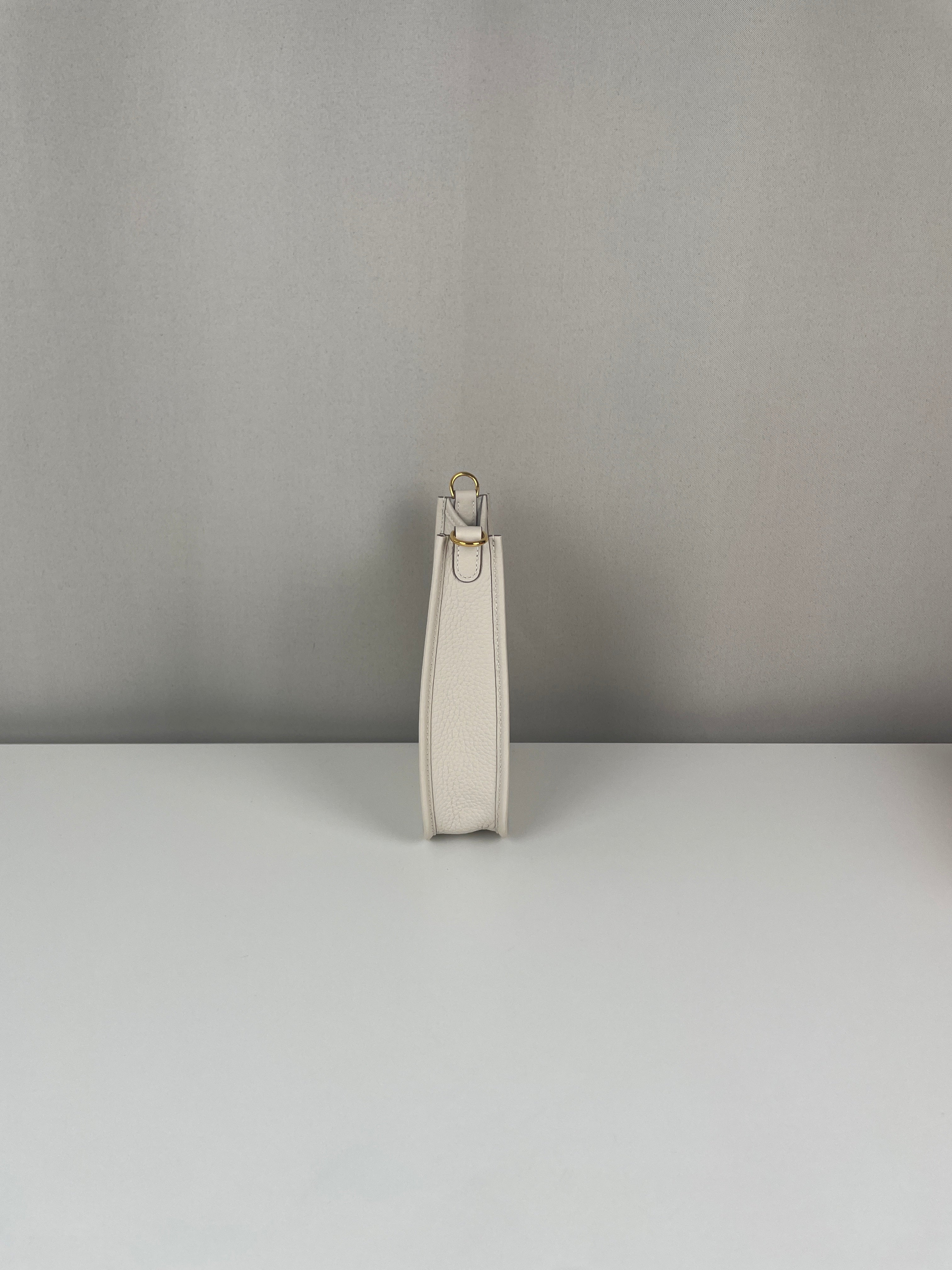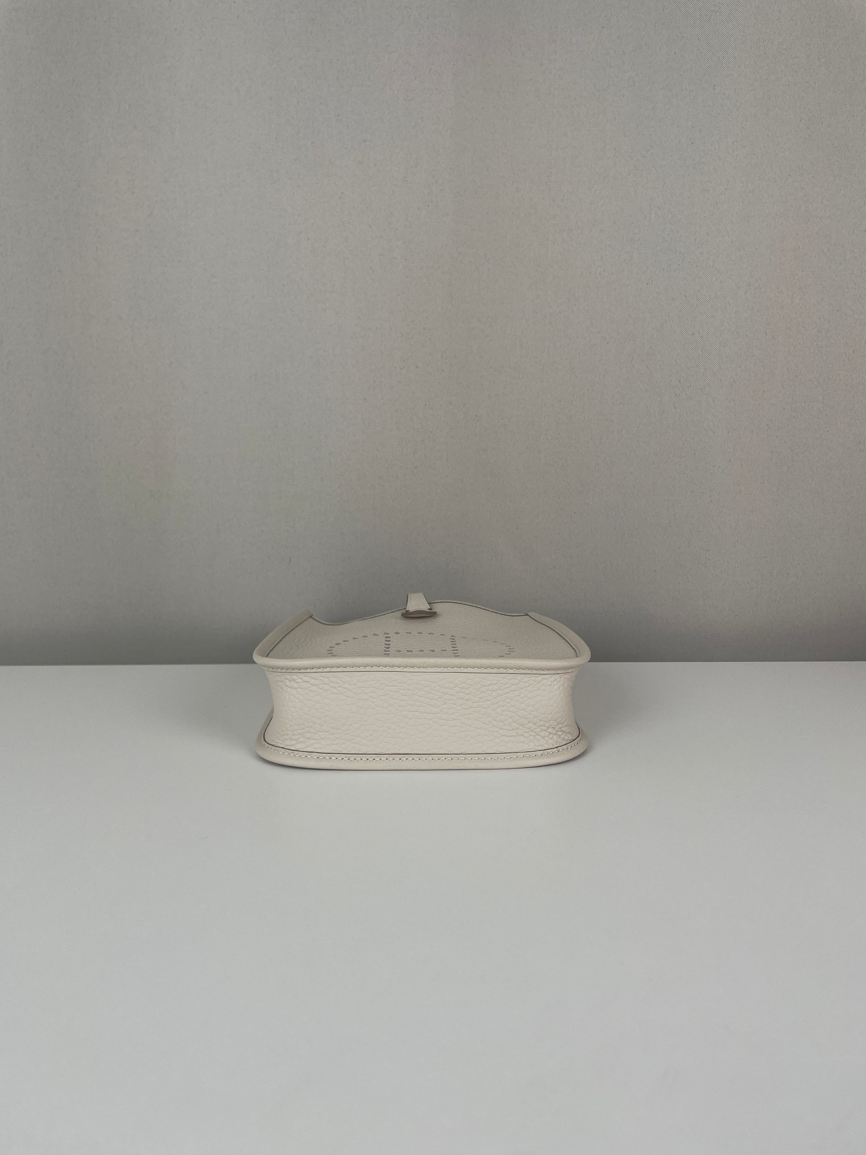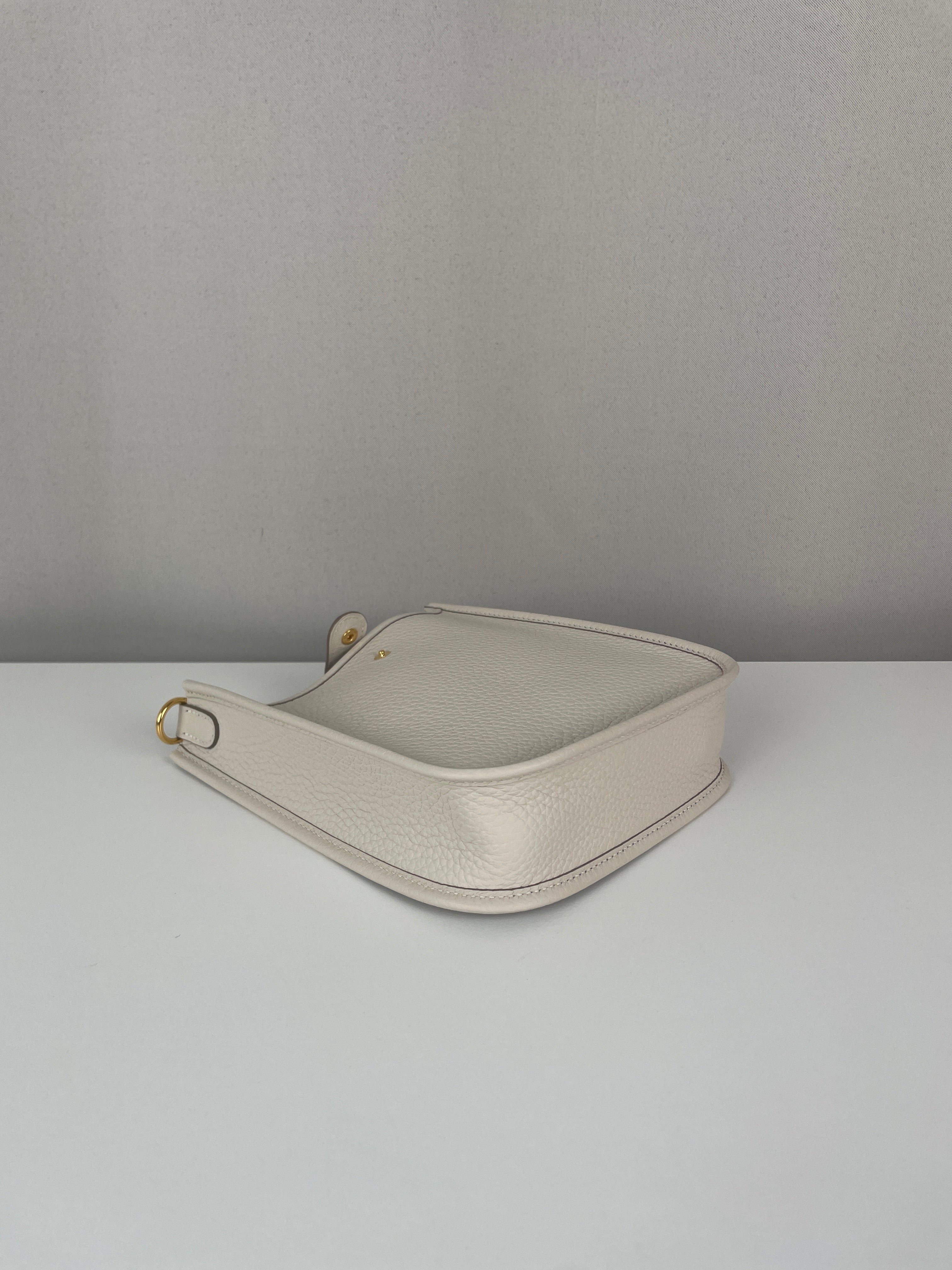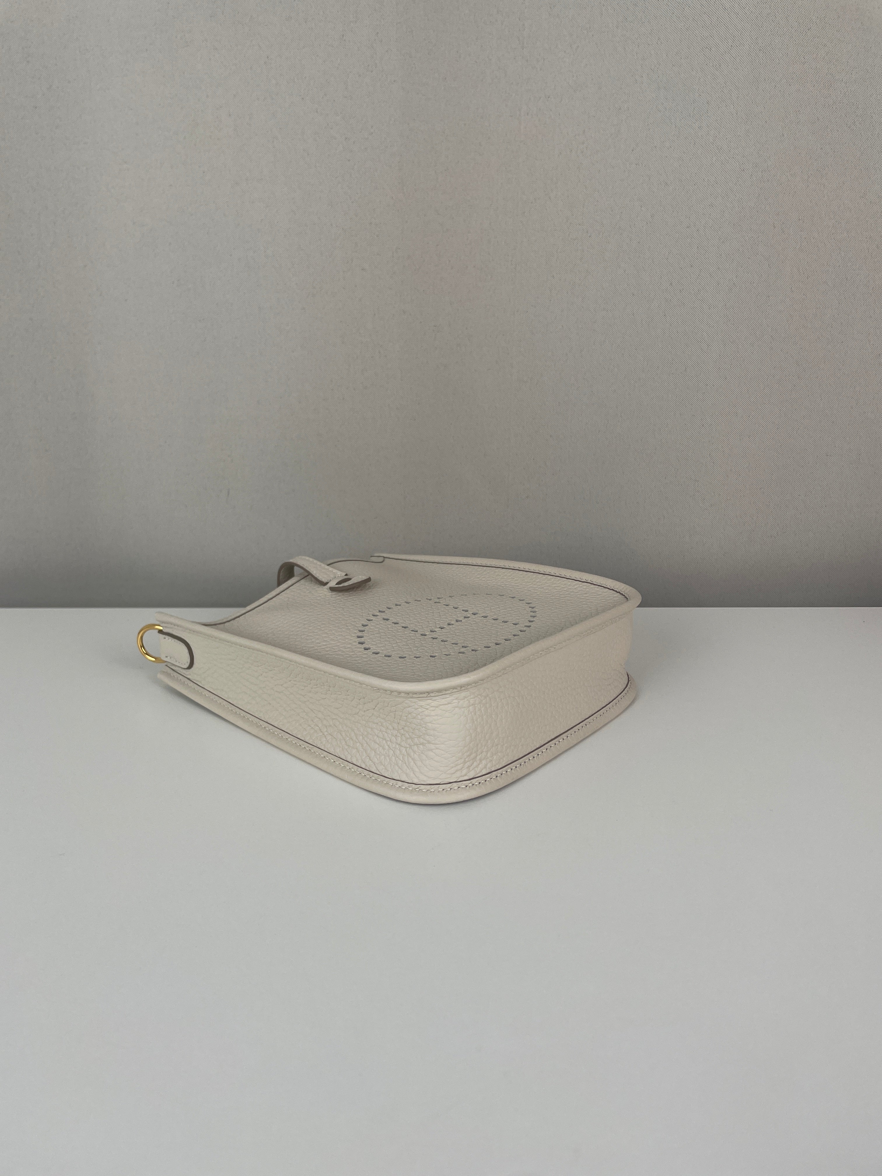 This Hermès Evelyne TPM in grey and off-white leather is in near-new condition. Crafted from a beautiful, supple leather with exceptional structure, this mini crossbody is perfect for everyday wear or a minimalist luxury statement. The contrast between the cream tones and gold hardware gives it a soft elegance. A highly sought-after size and colourway, ready to wear and collect.