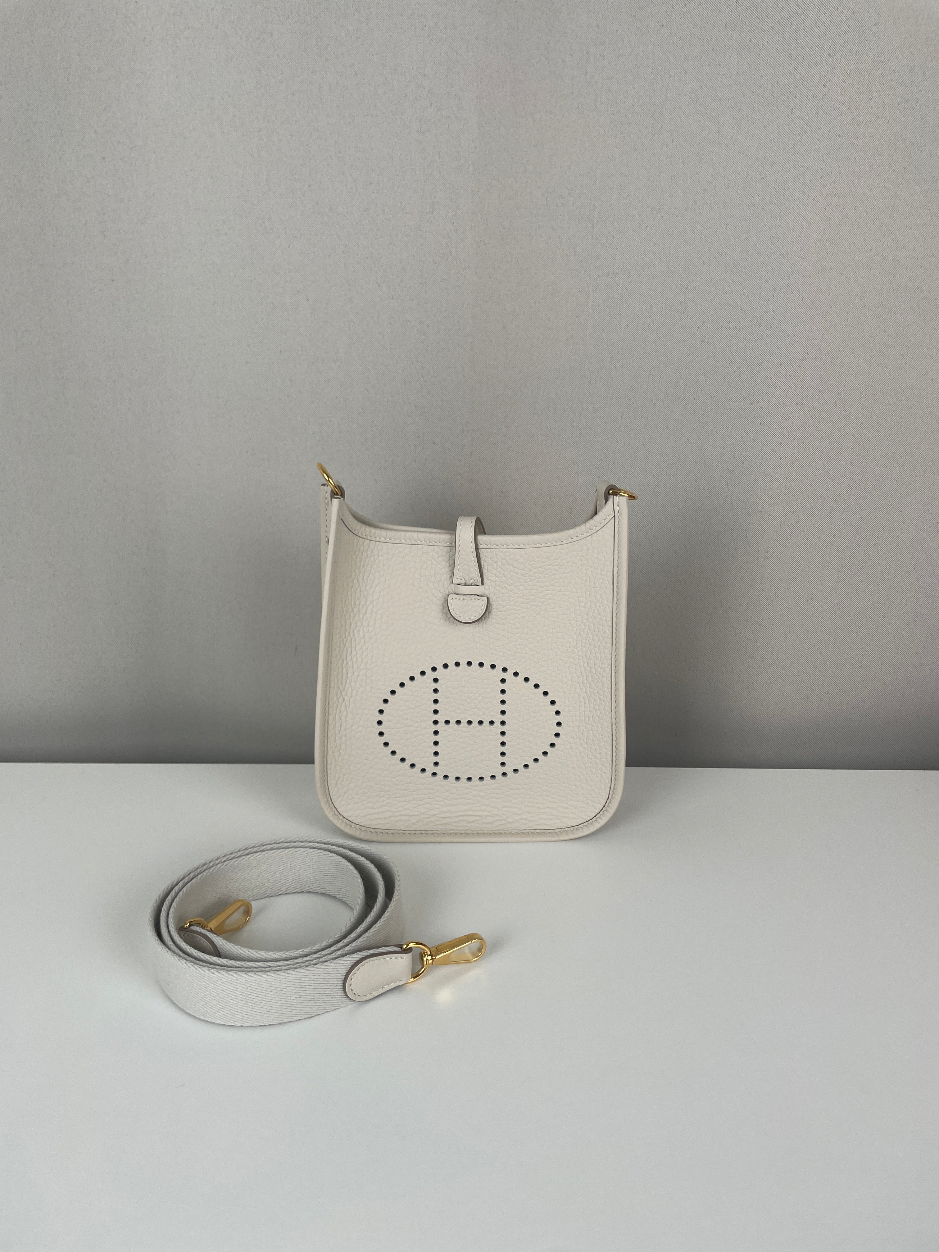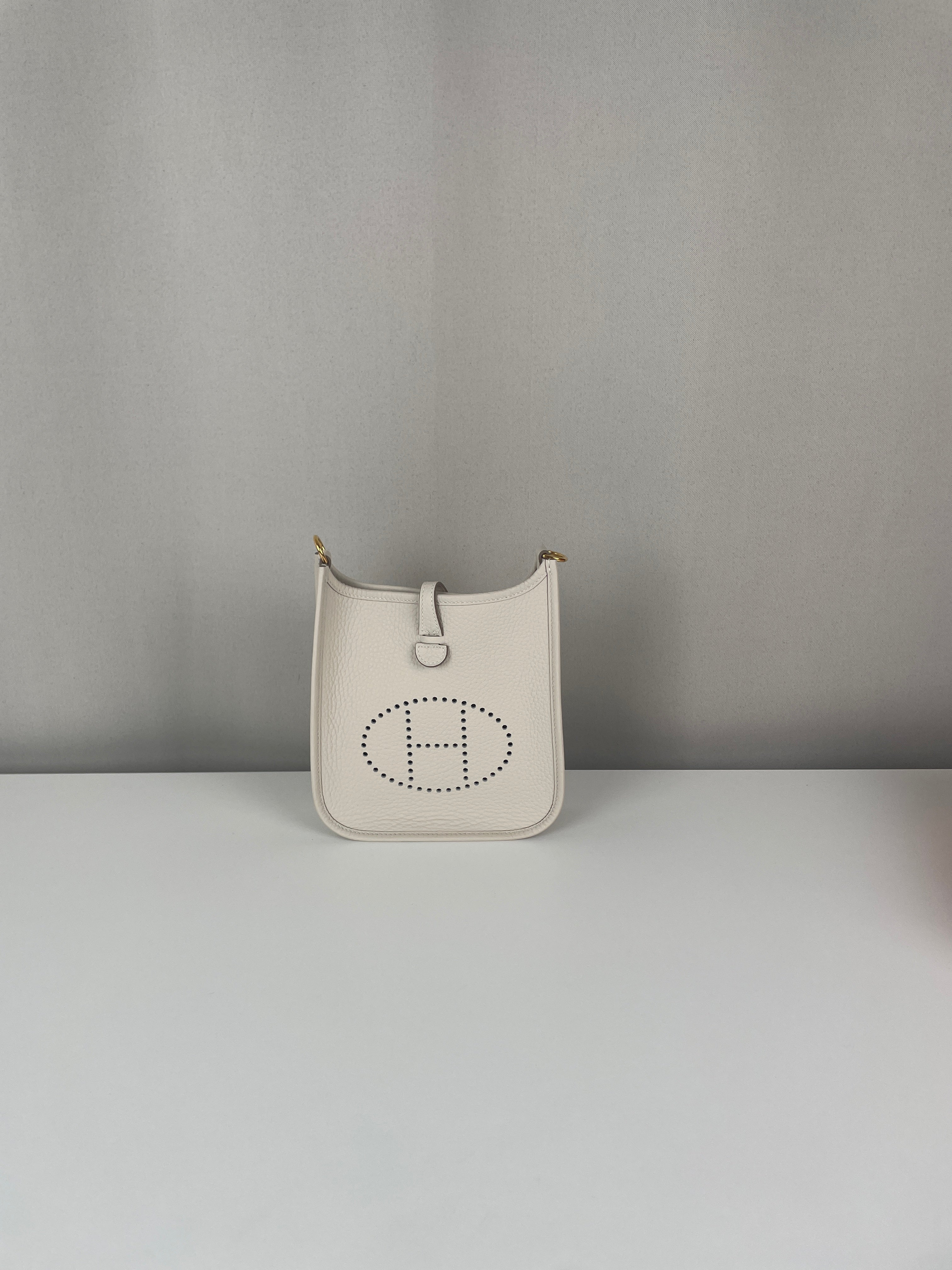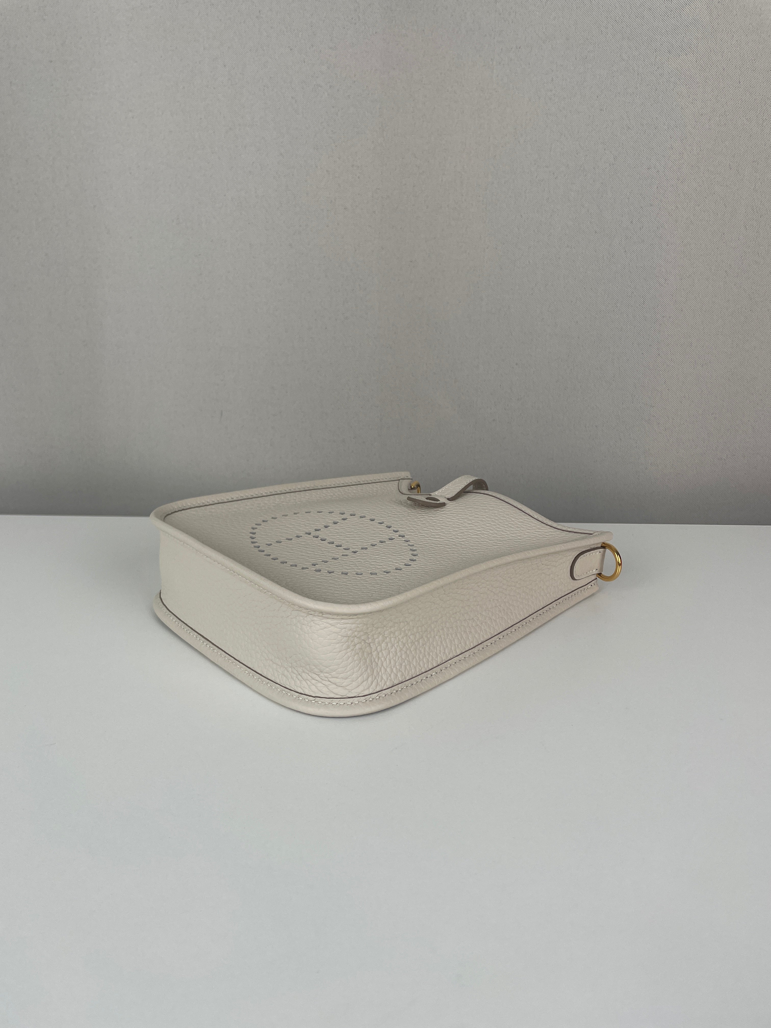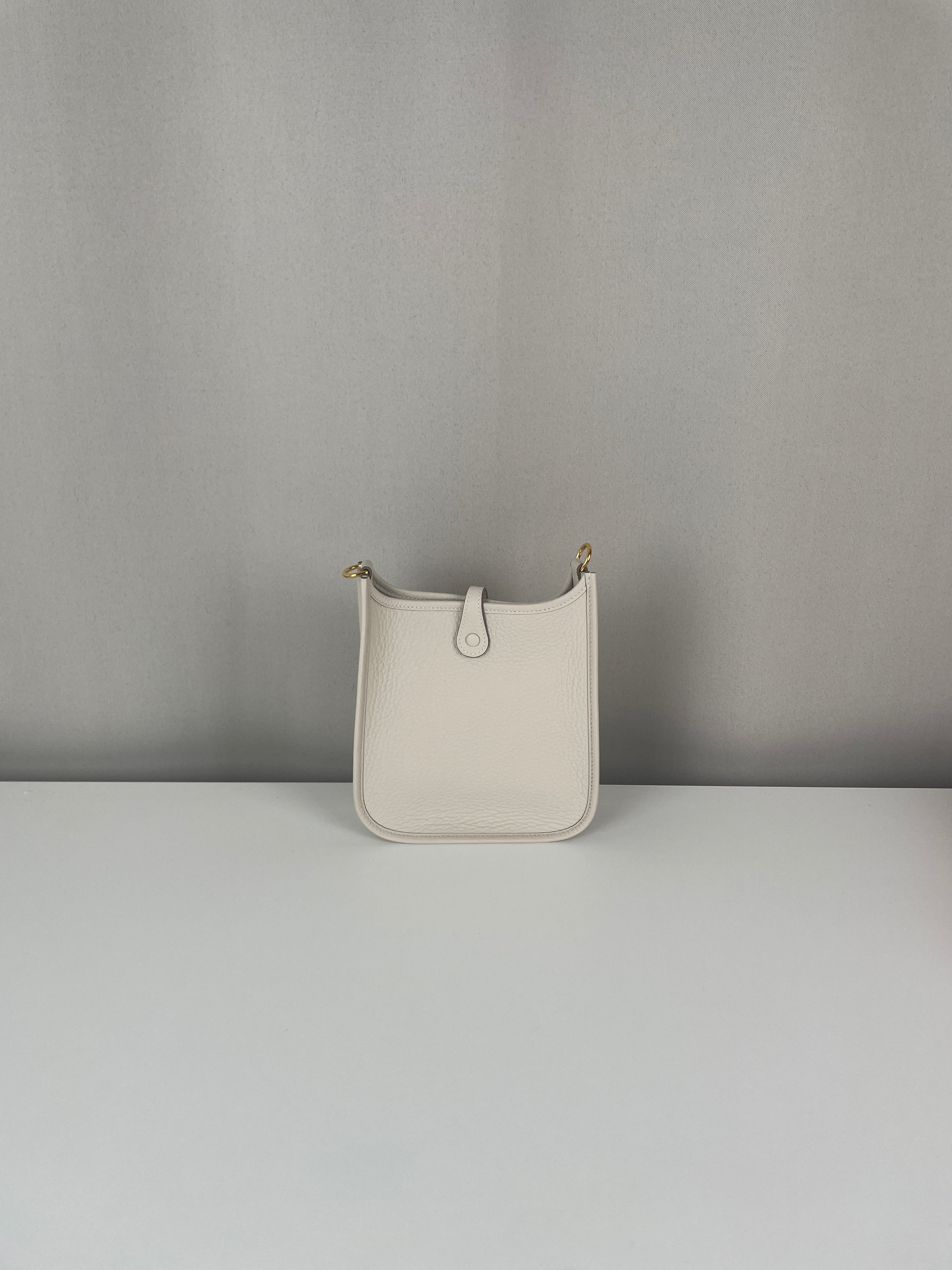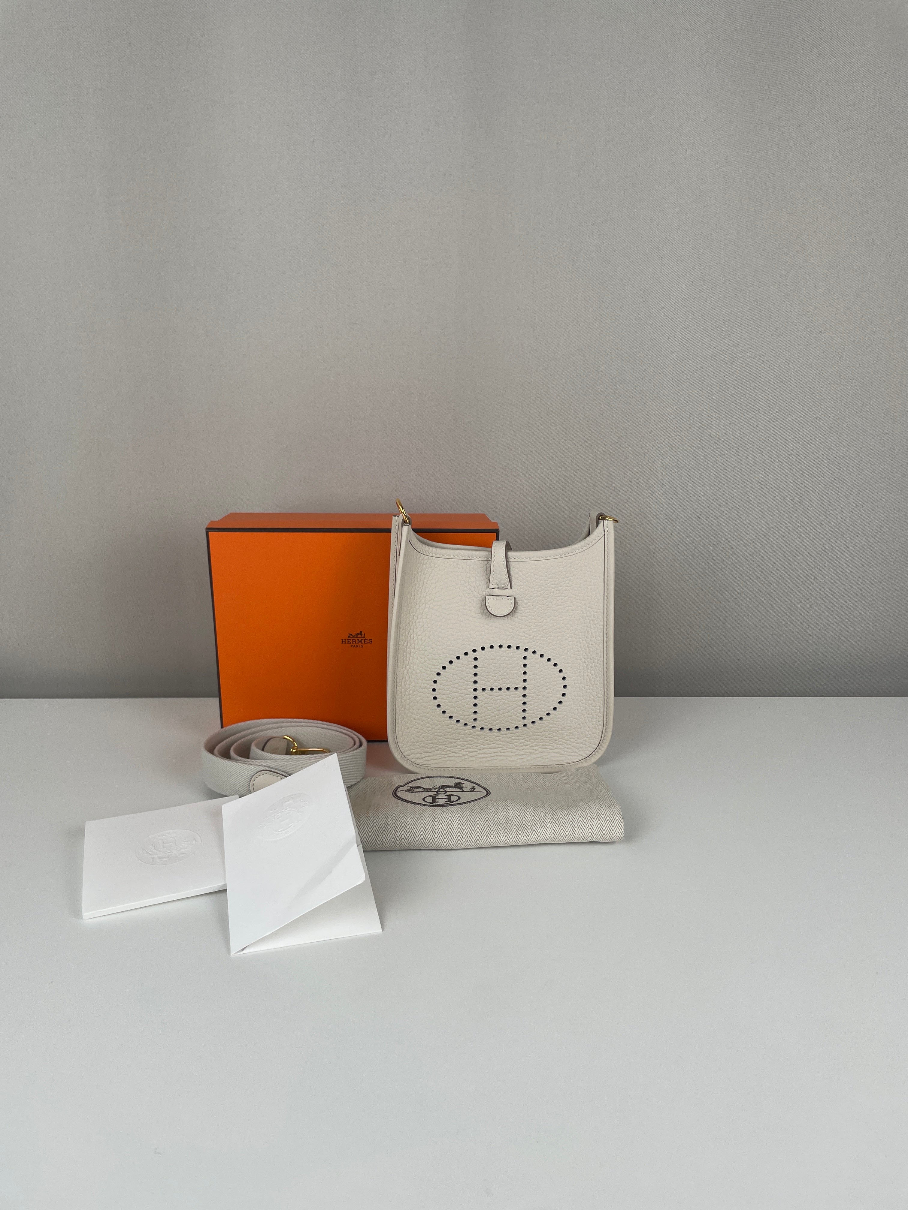 This Hermès Evelyne TPM in grey and off-white leather is in near-new condition. Crafted from a beautiful, supple leather with exceptional structure, this mini crossbody is perfect for everyday wear or a minimalist luxury statement. The contrast between the cream tones and gold hardware gives it a soft elegance. A highly sought-after size and colourway, ready to wear and collect.