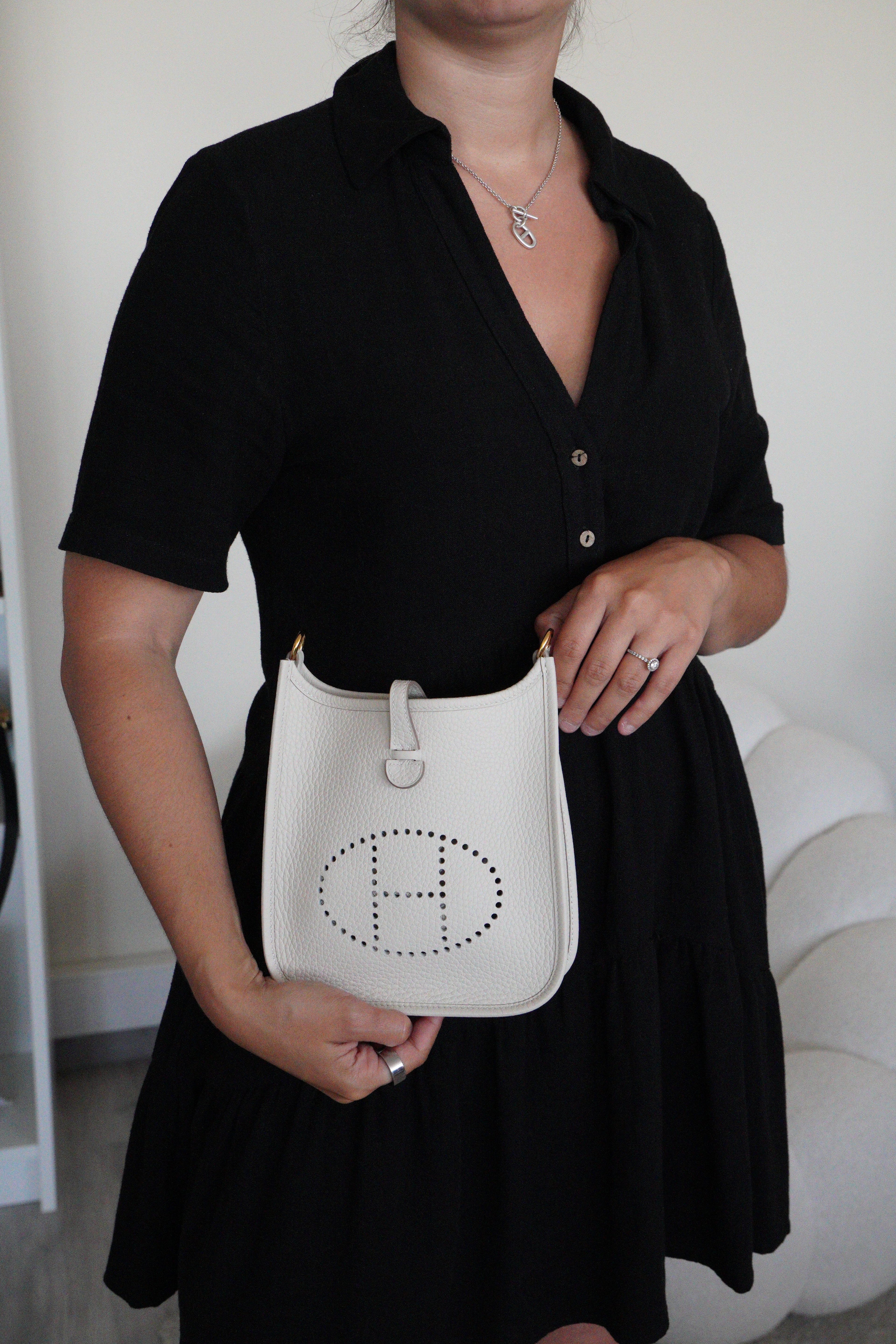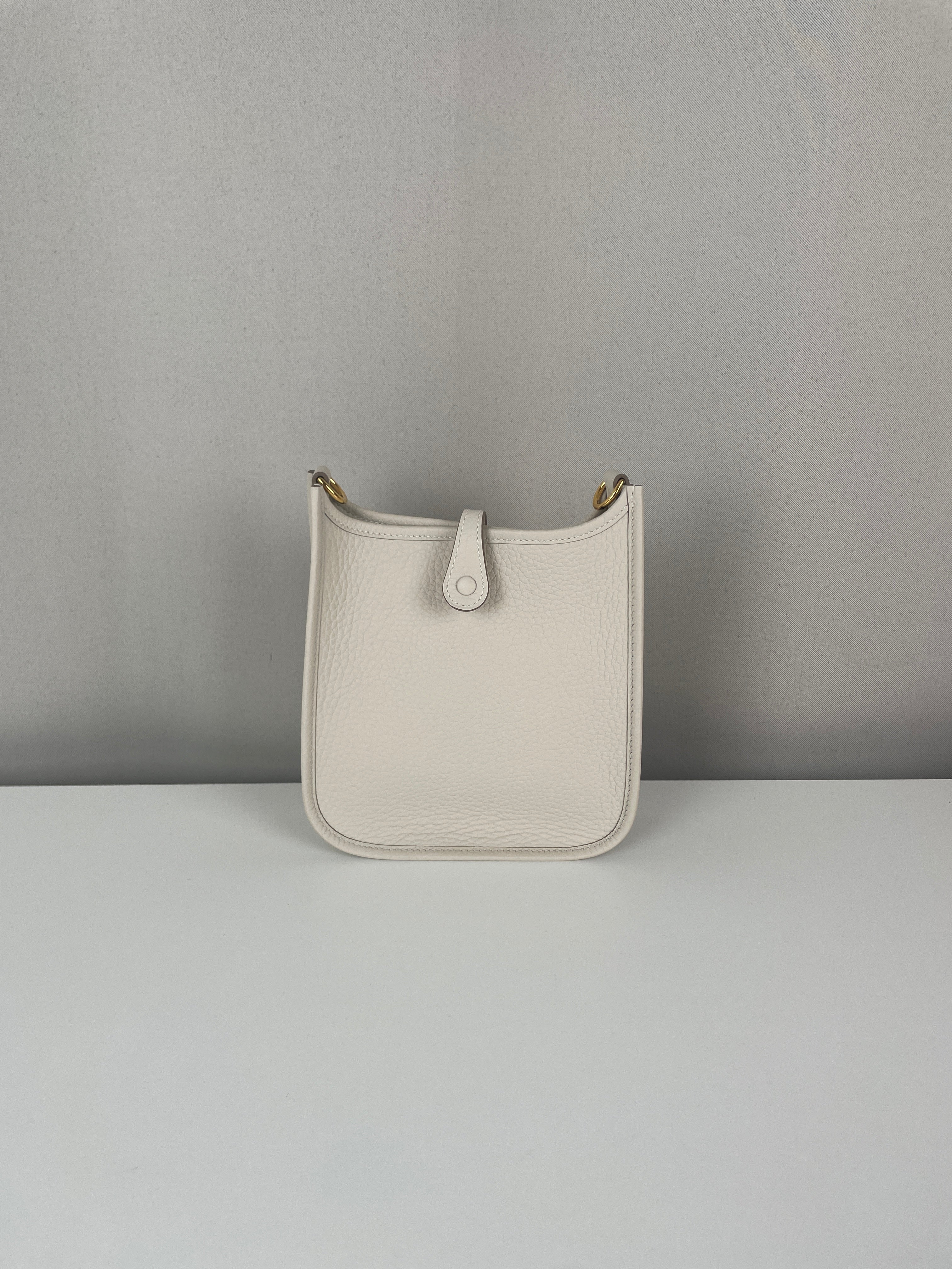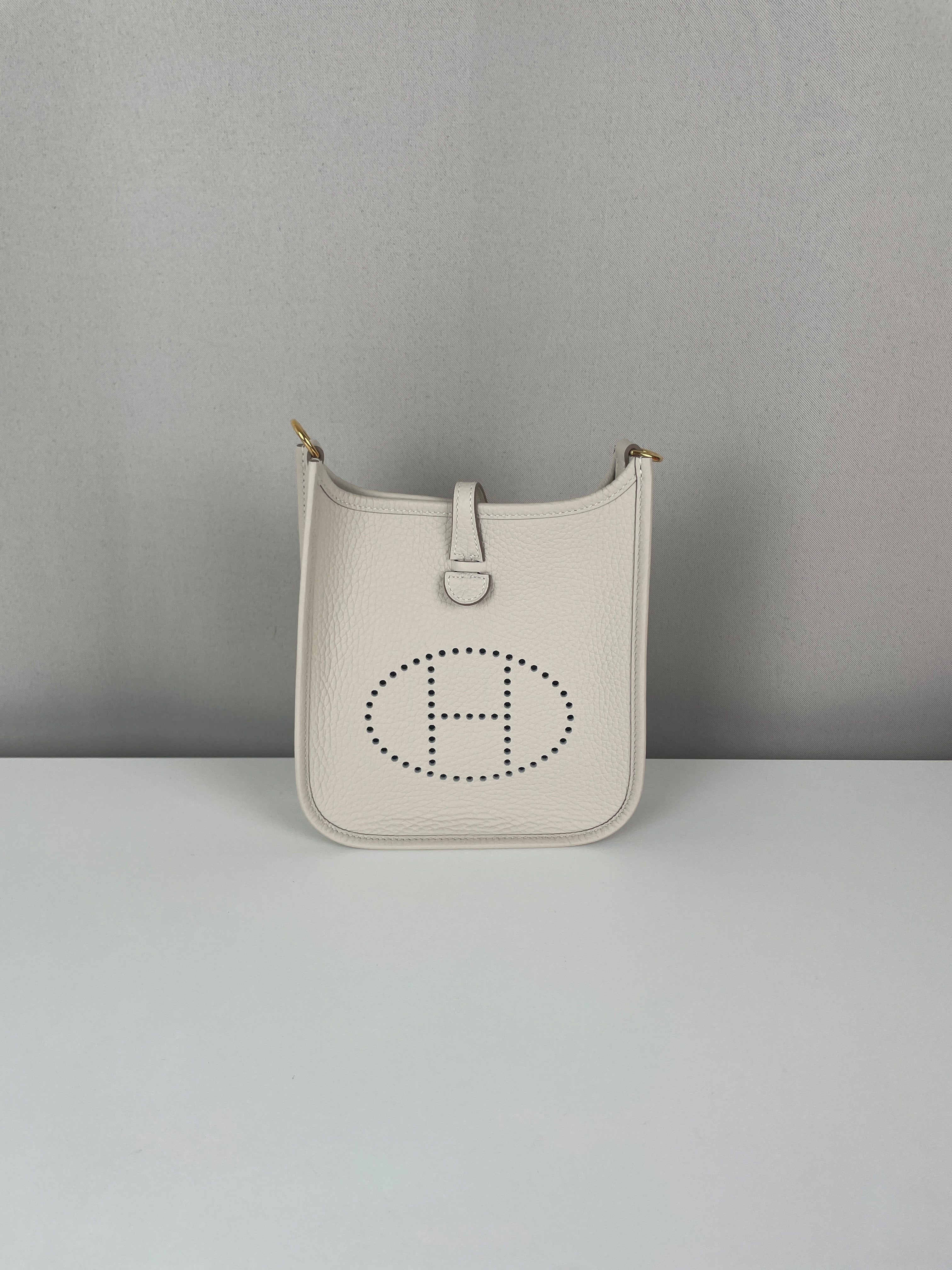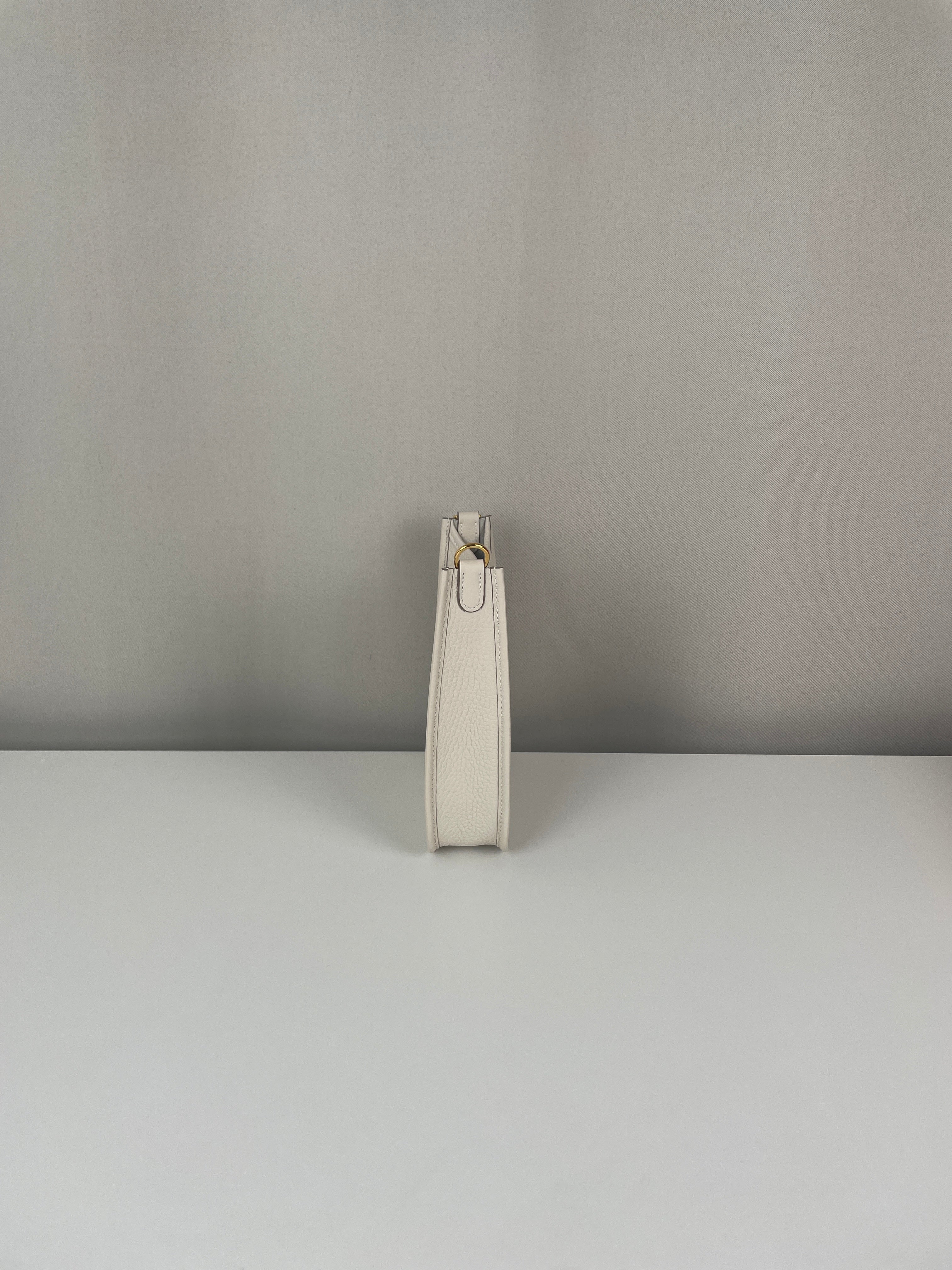 This Hermès Evelyne TPM in grey and off-white leather is in near-new condition. Crafted from a beautiful, supple leather with exceptional structure, this mini crossbody is perfect for everyday wear or a minimalist luxury statement. The contrast between the cream tones and gold hardware gives it a soft elegance. A highly sought-after size and colourway, ready to wear and collect.