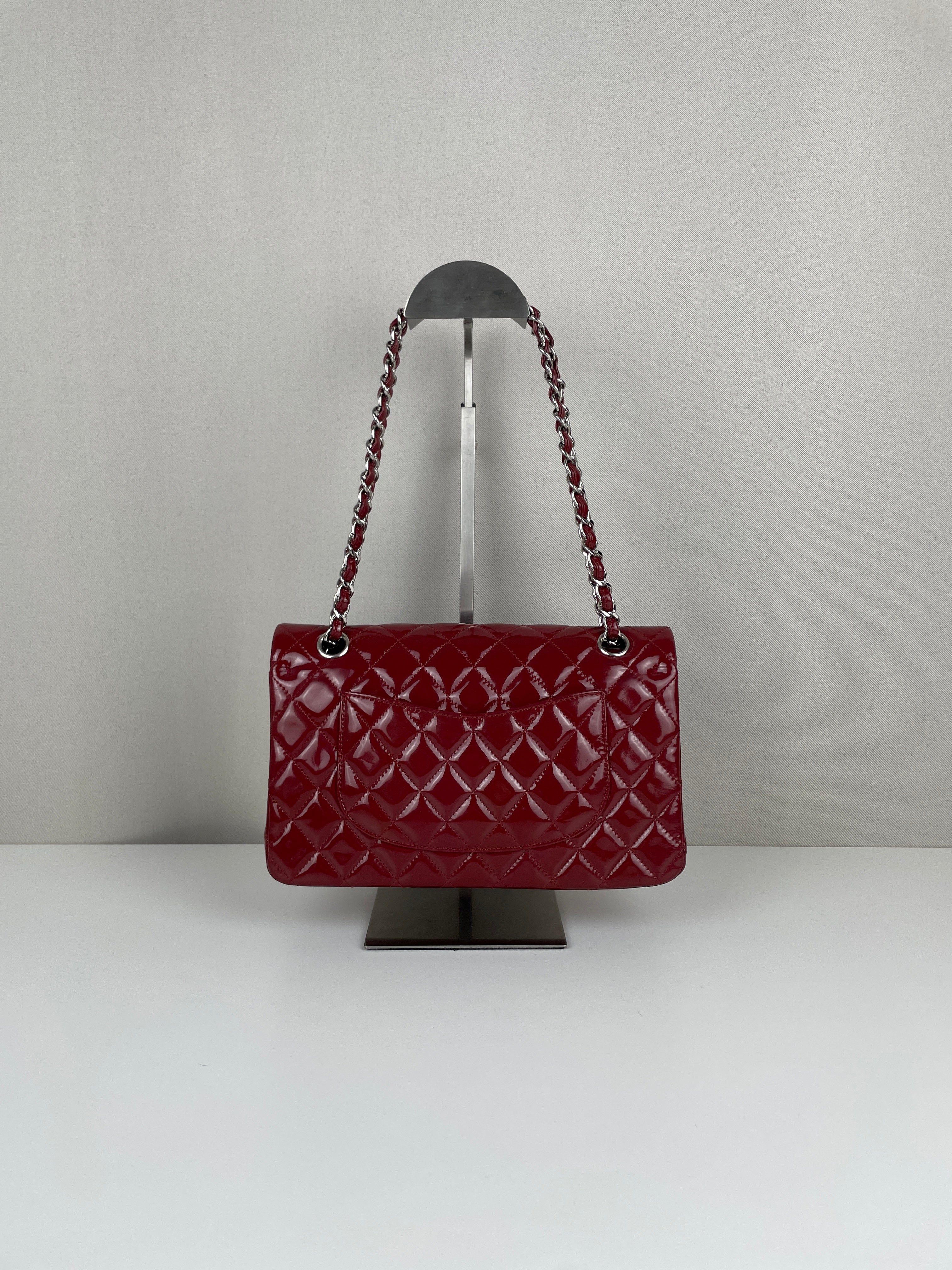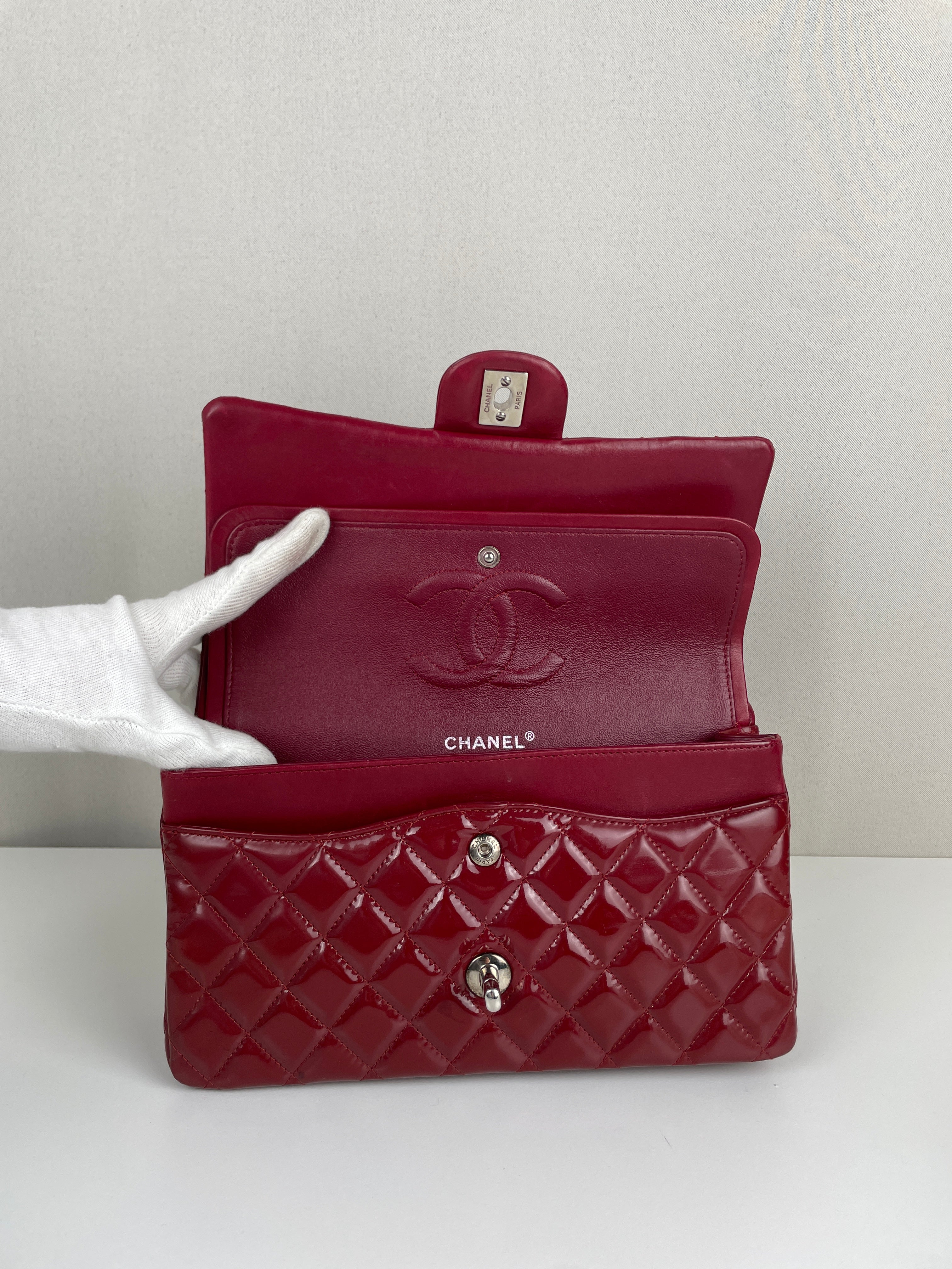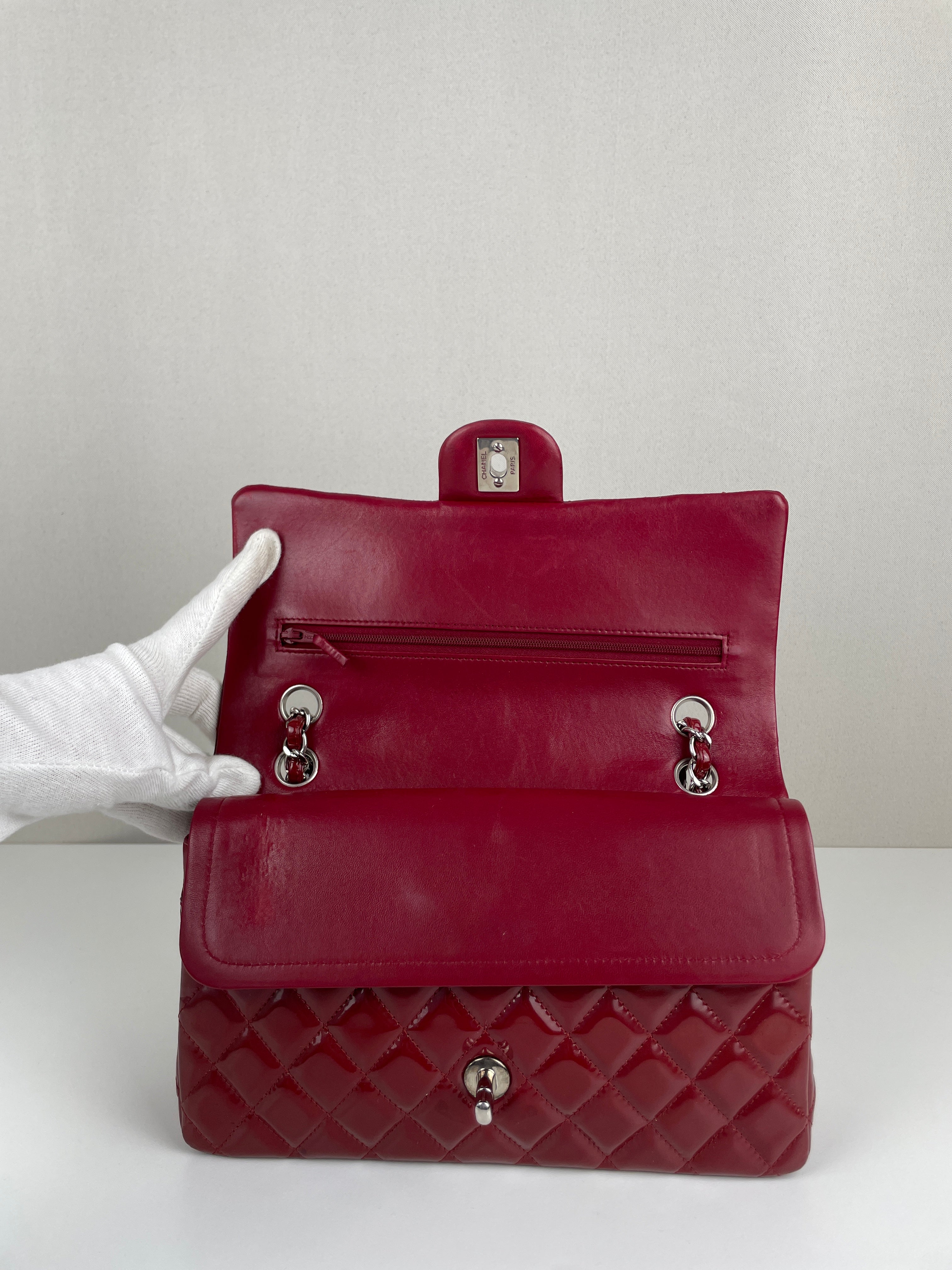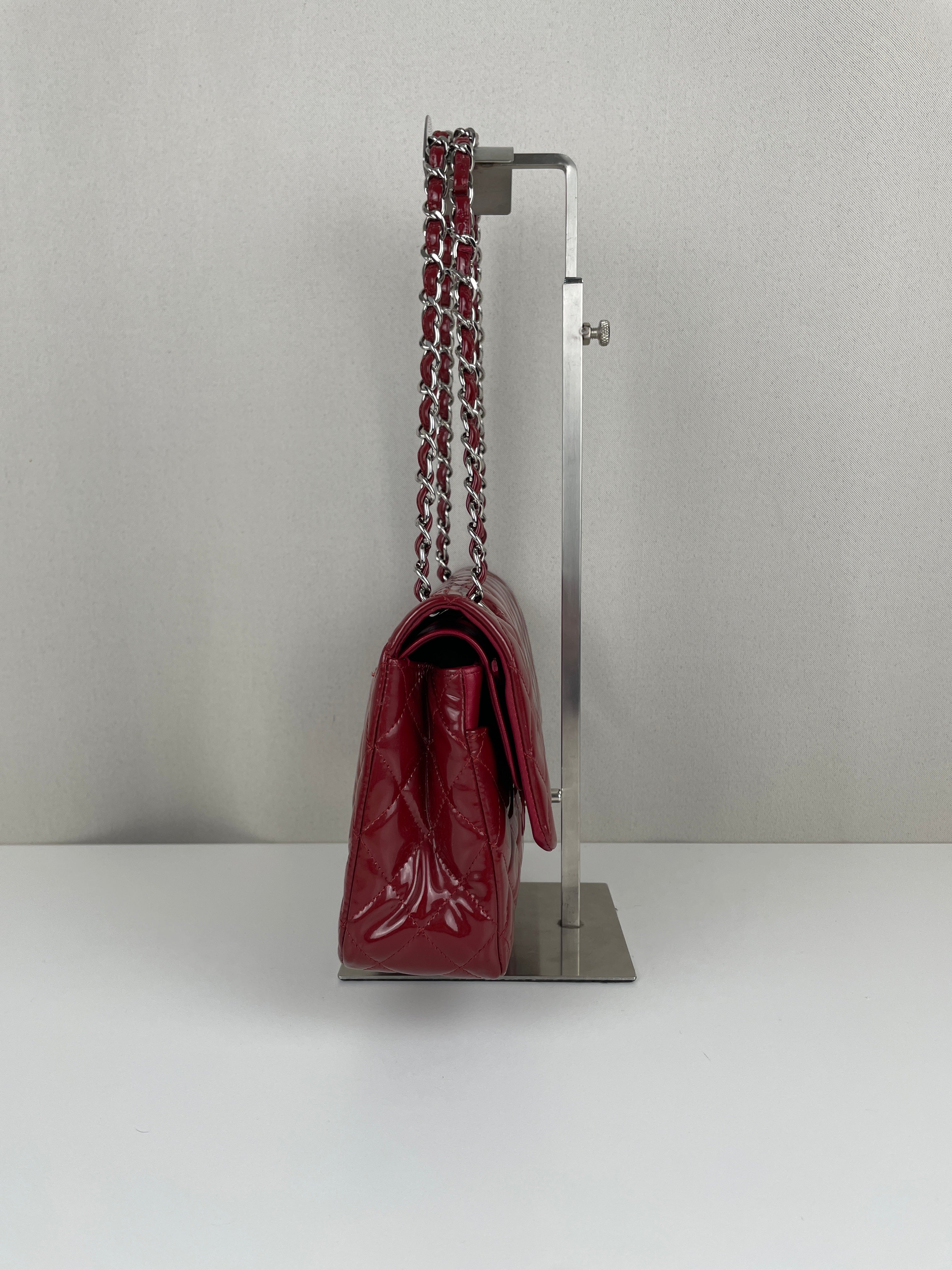 Chanel classic flap timeless 25 red patent leather handbag silver hardware