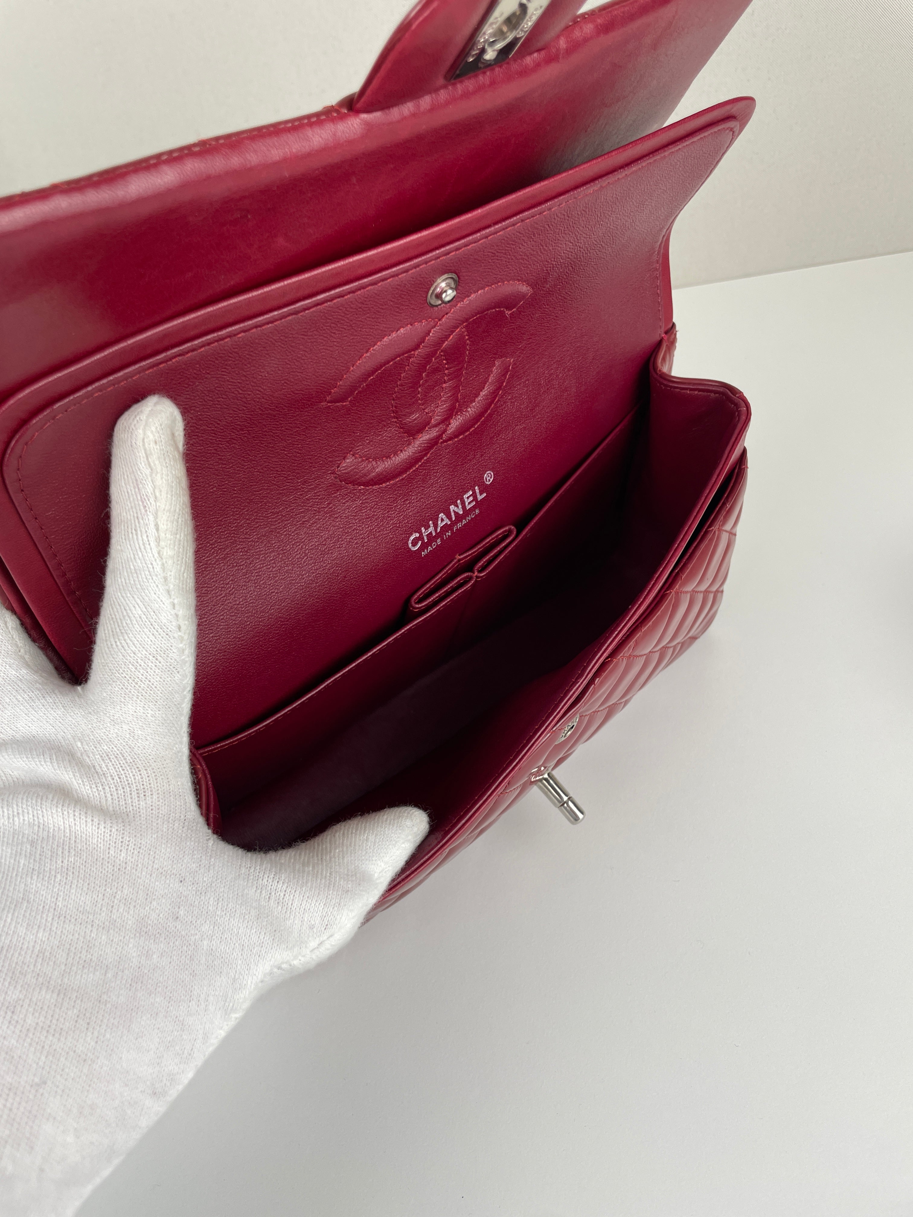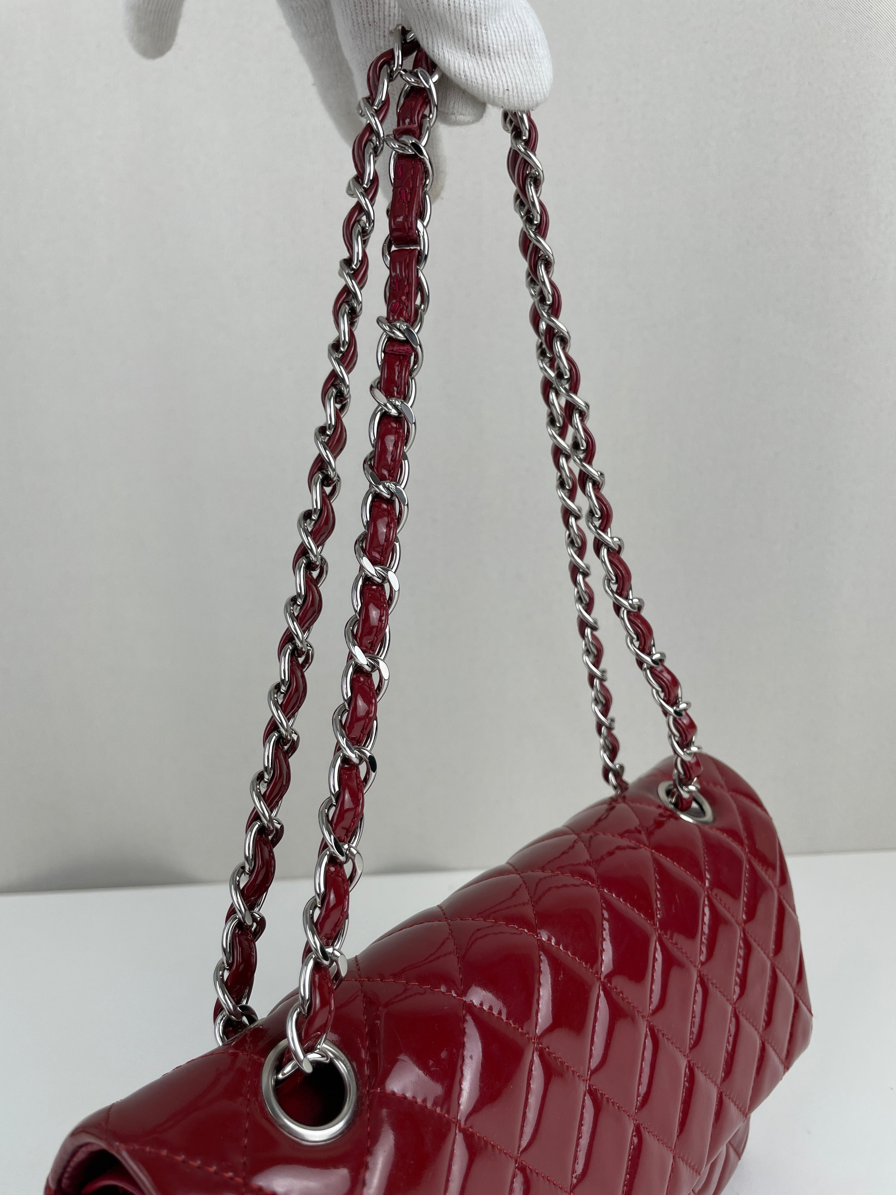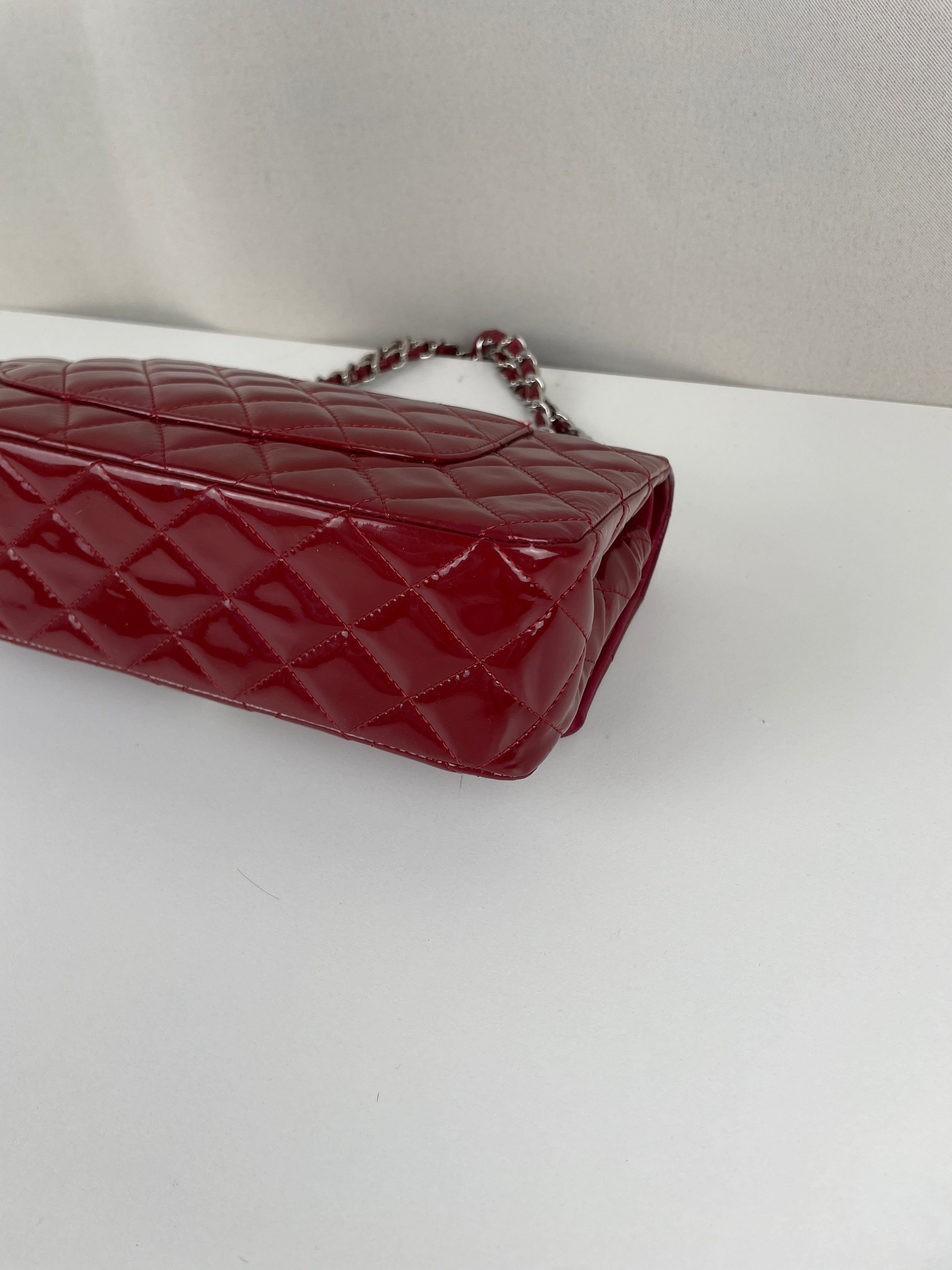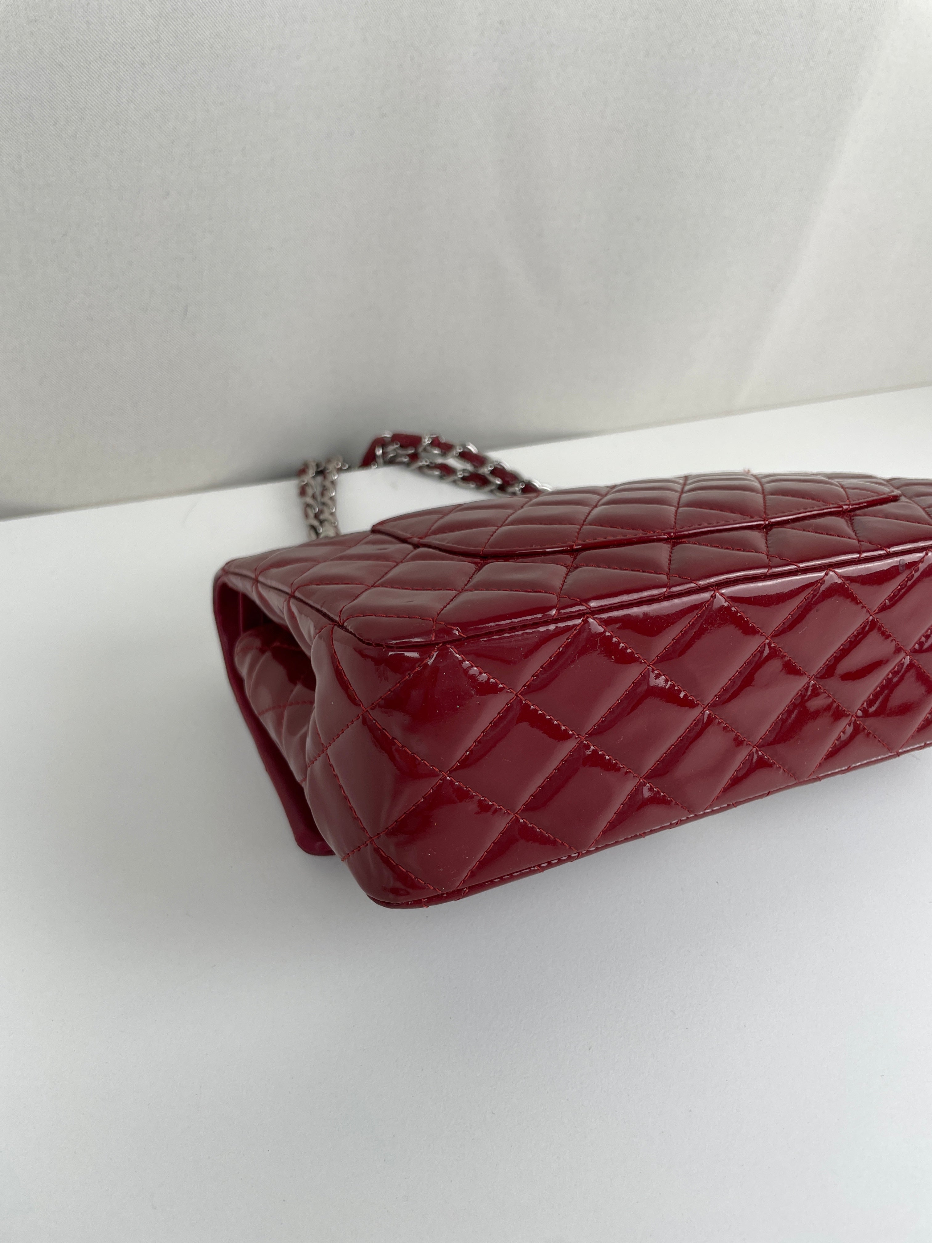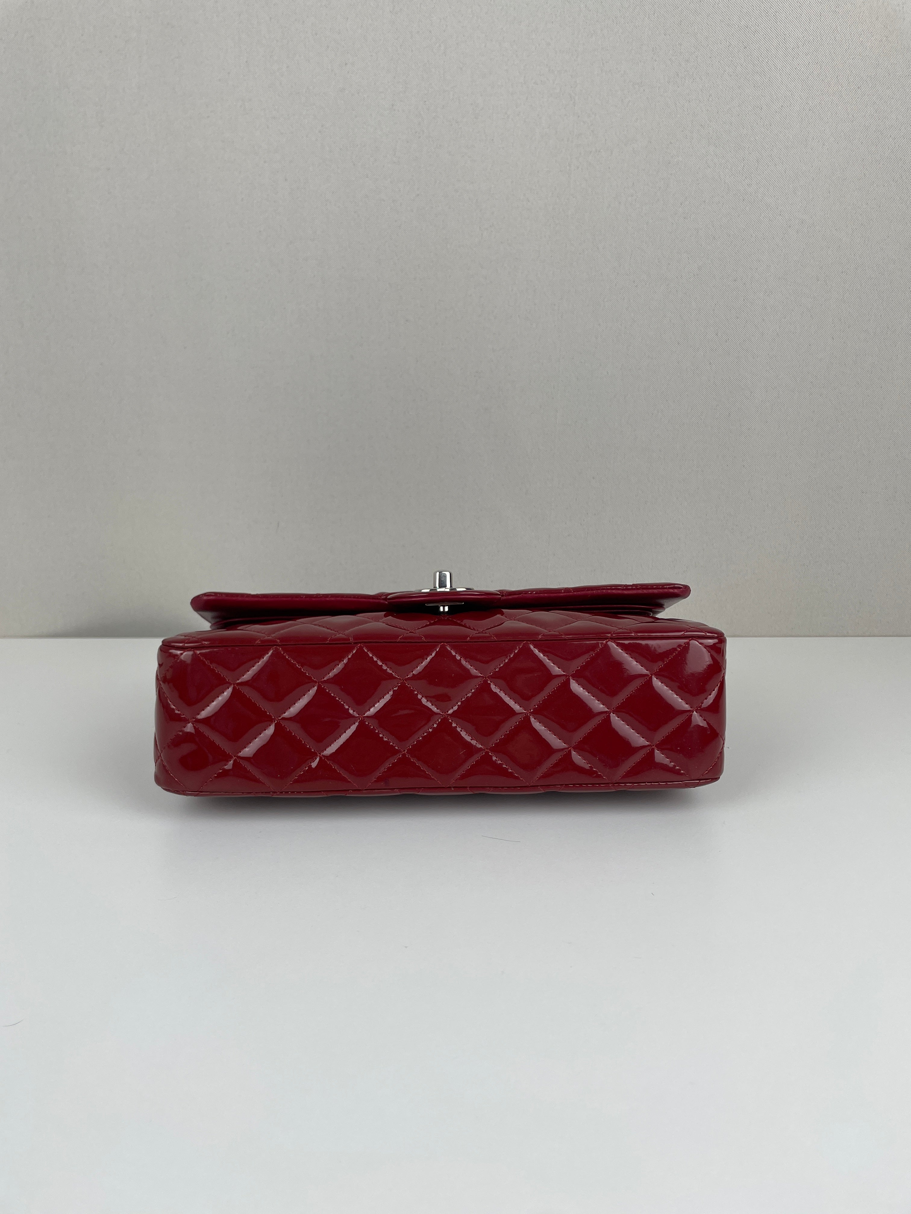 Chanel classic flap timeless 25 red patent leather handbag silver hardware