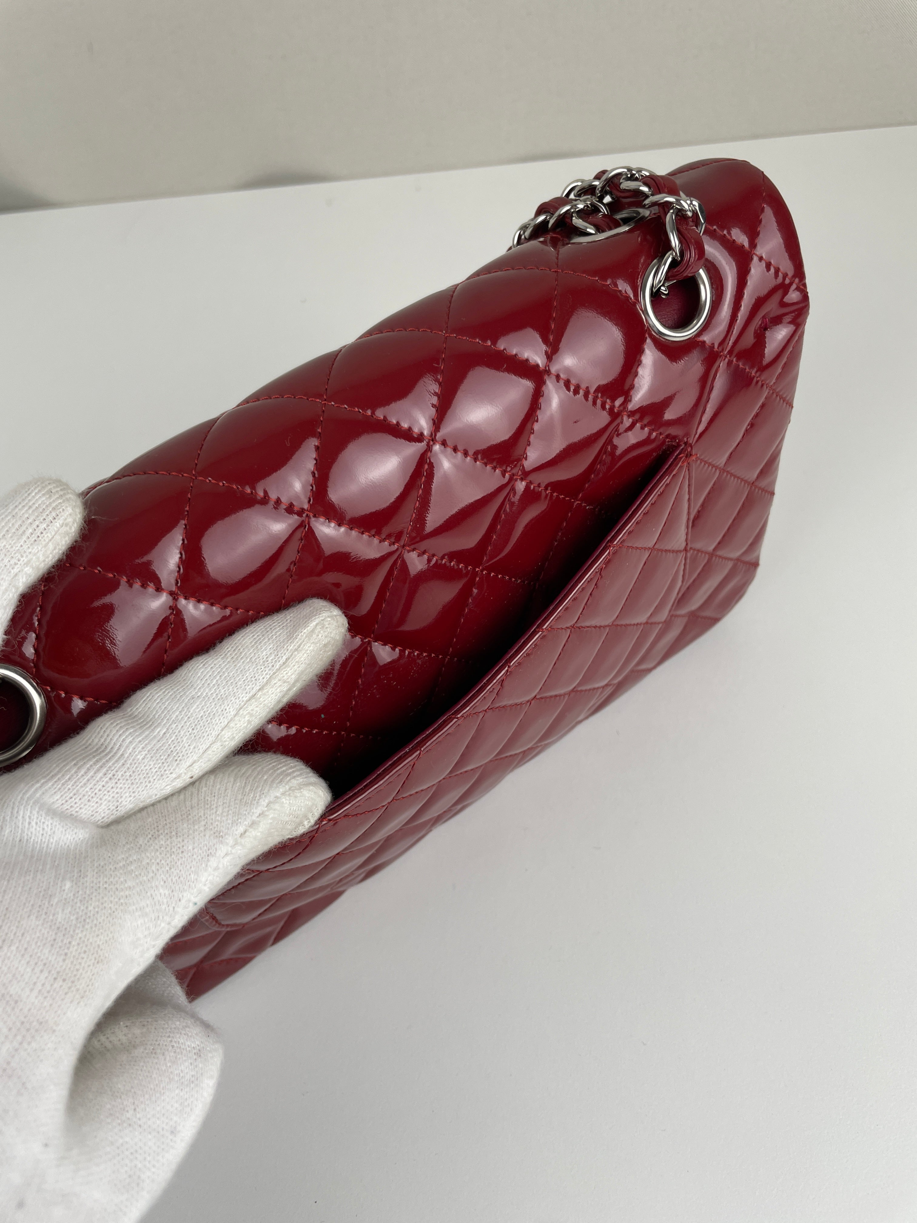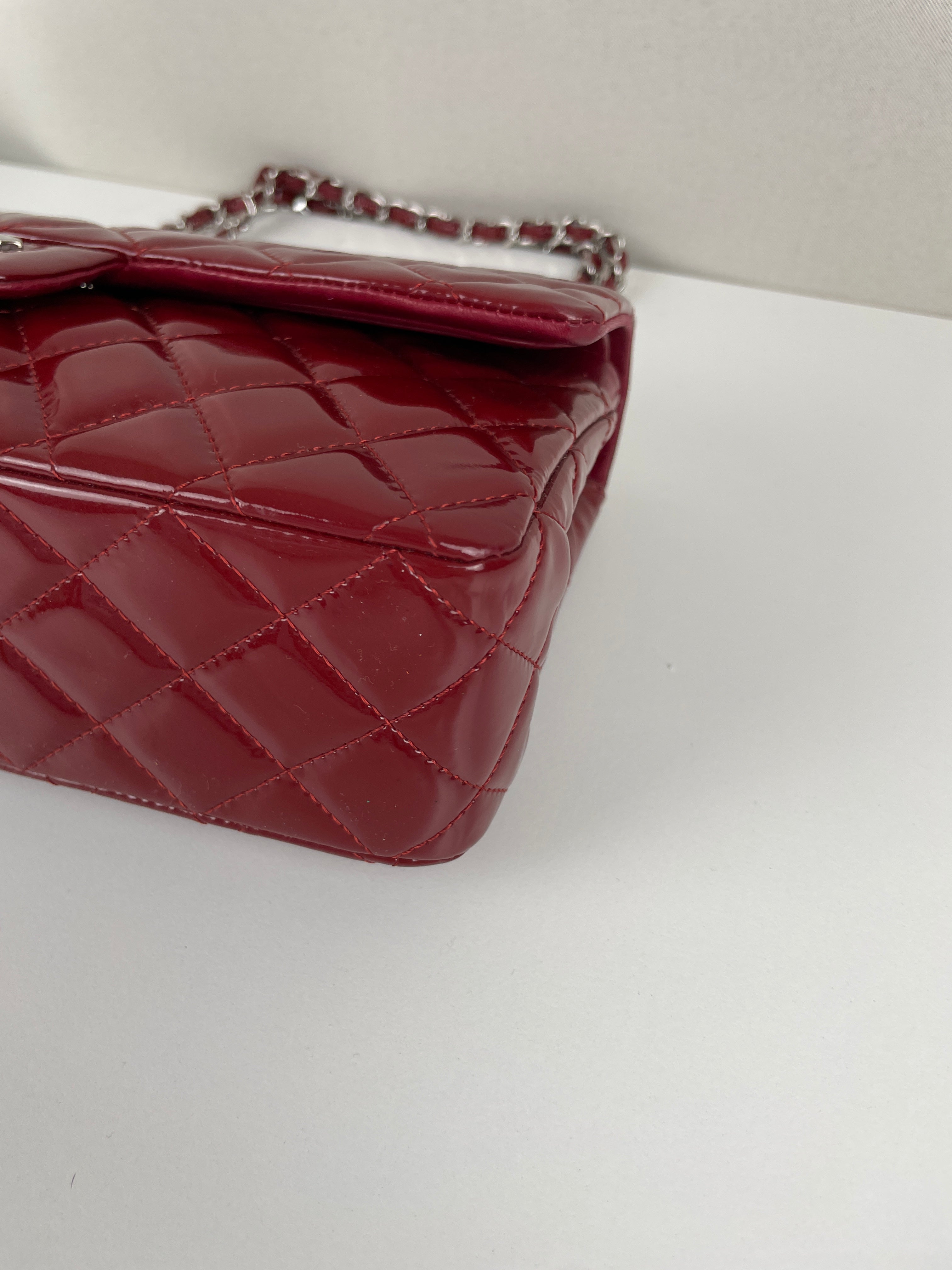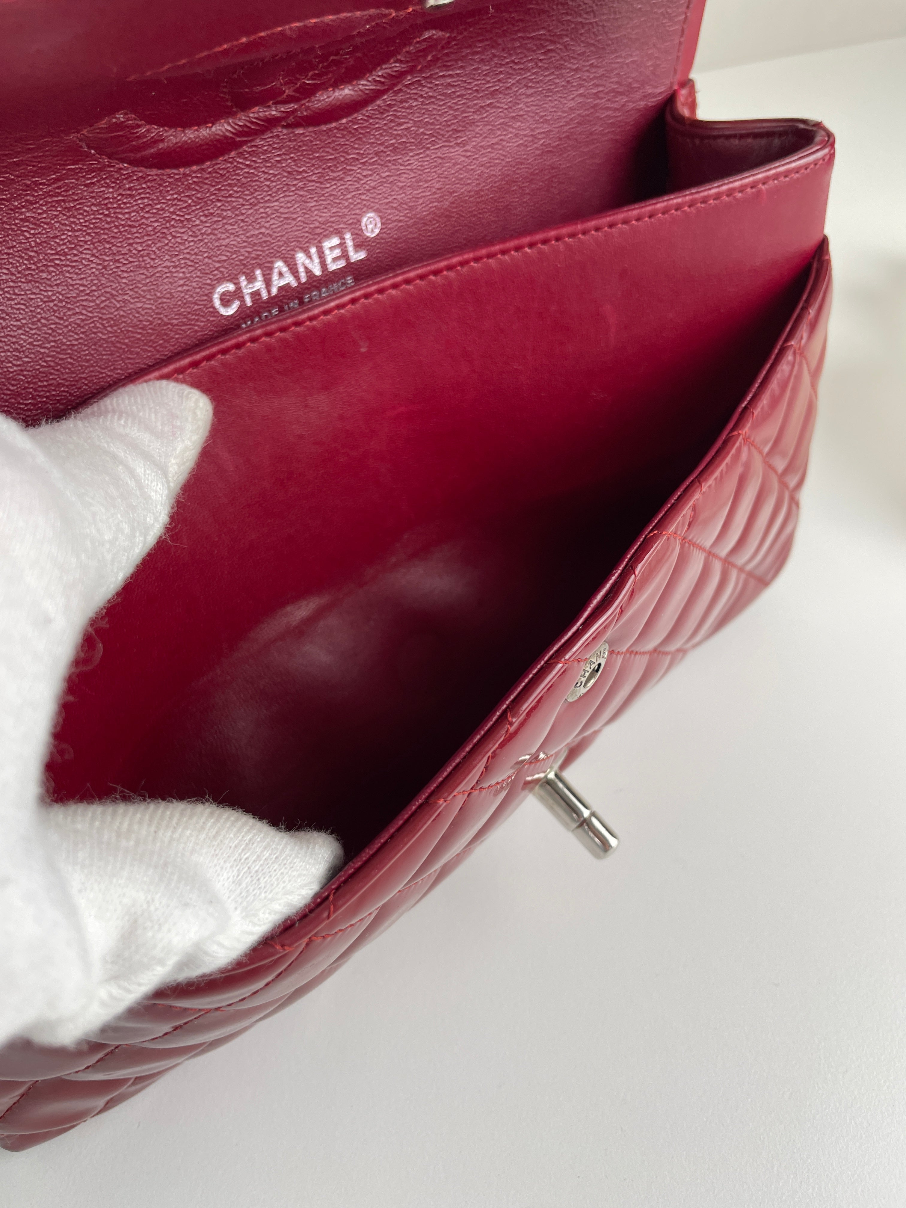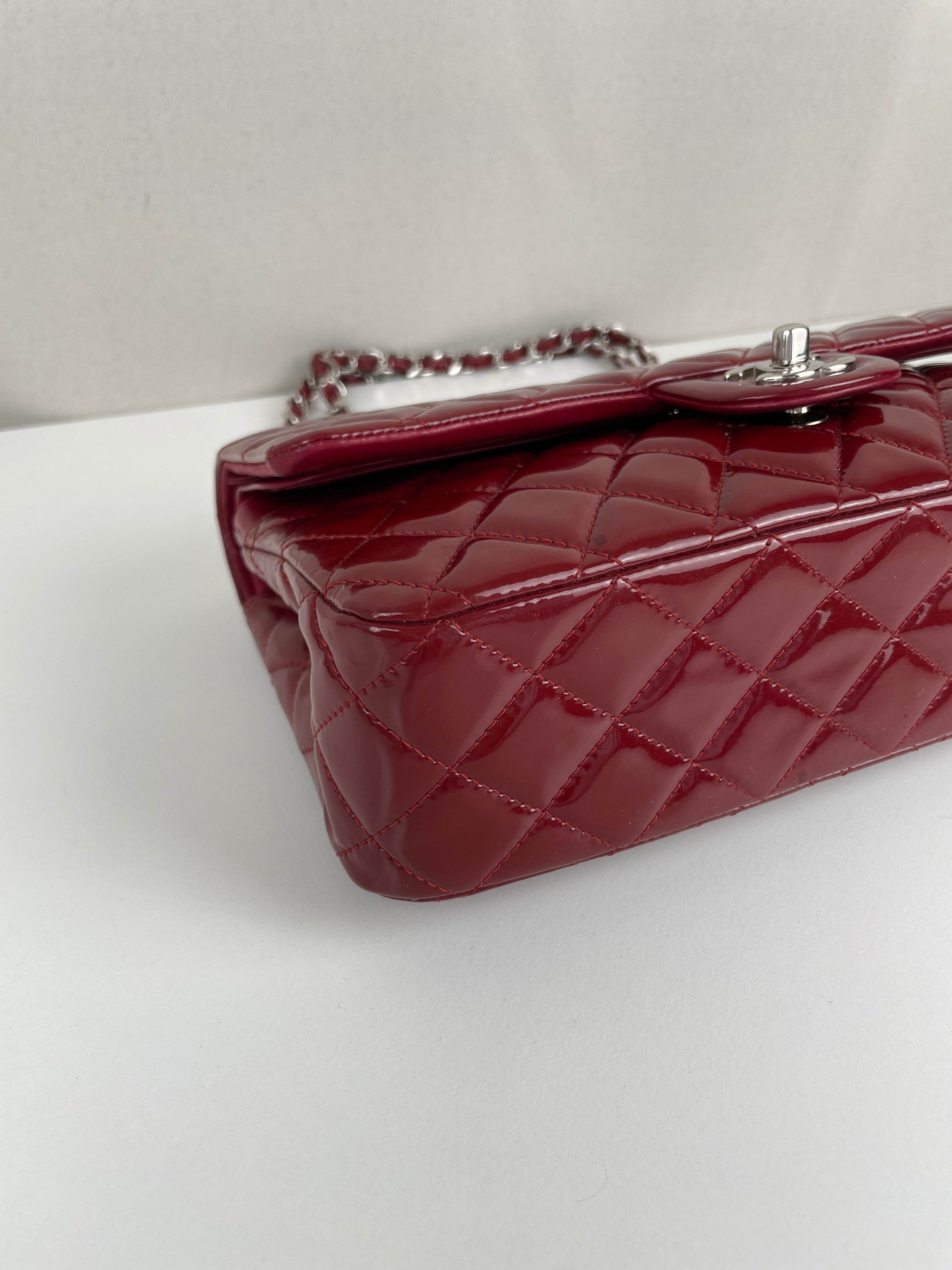 Chanel classic flap timeless 25 red patent leather handbag silver hardware