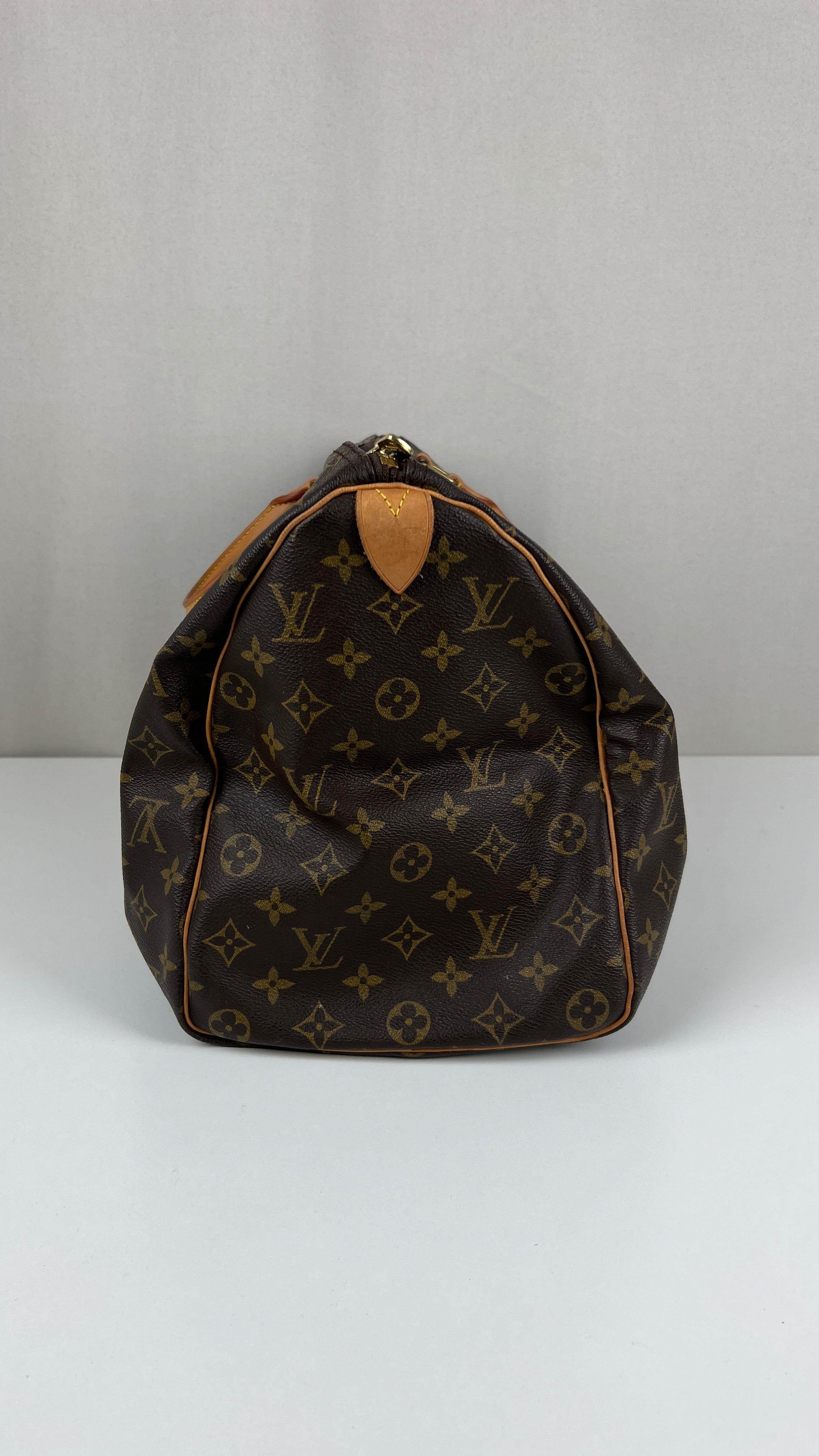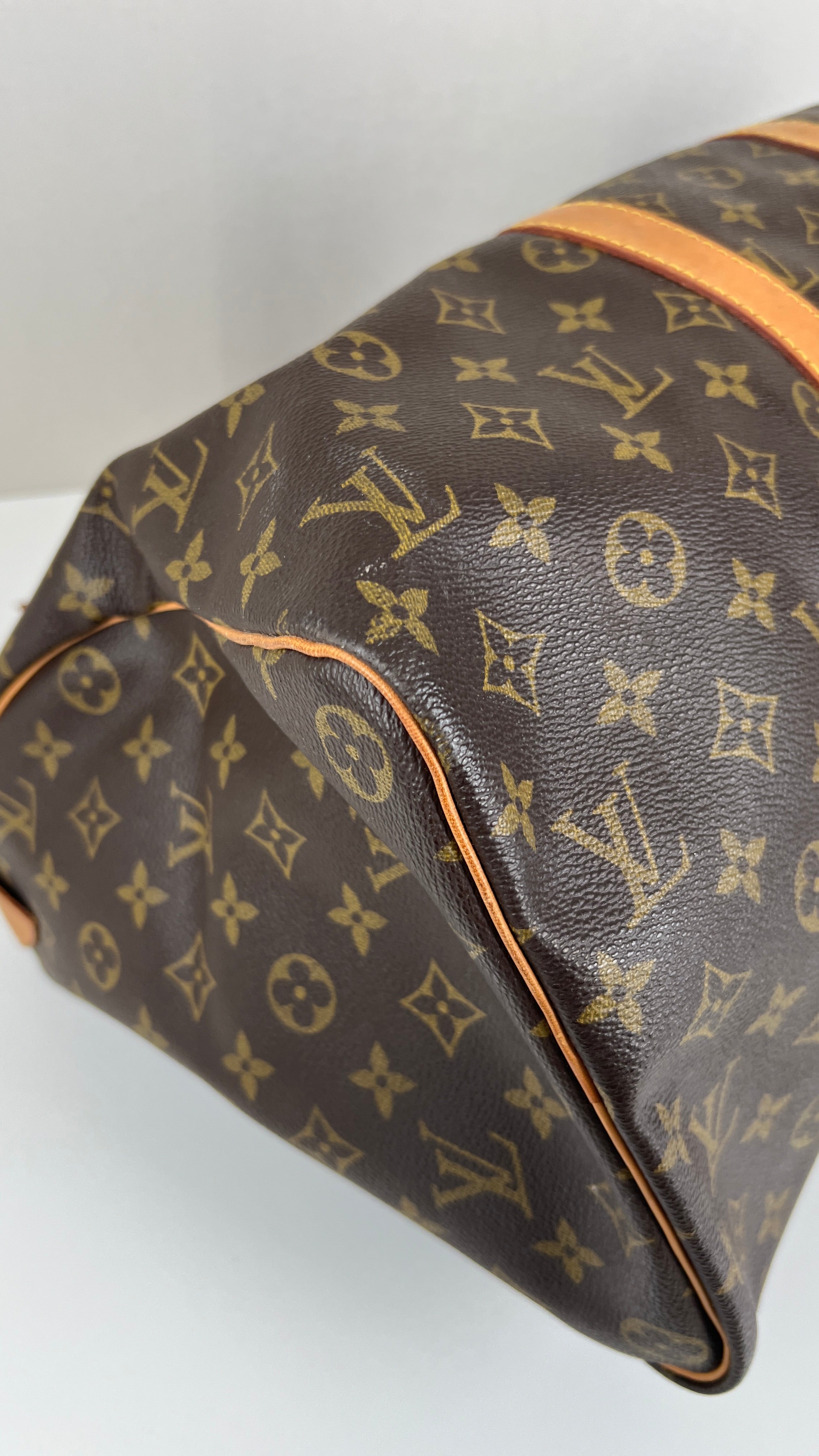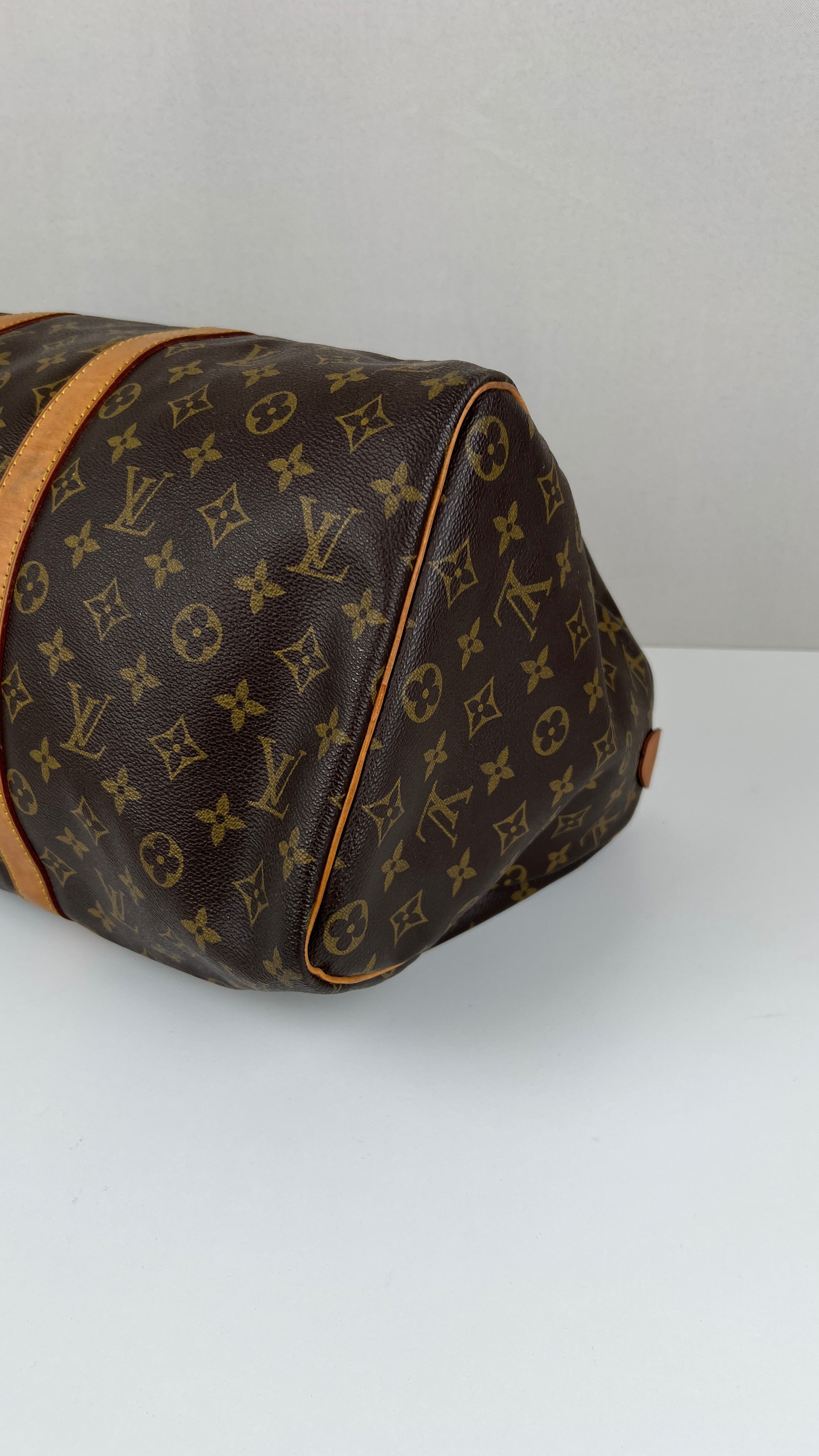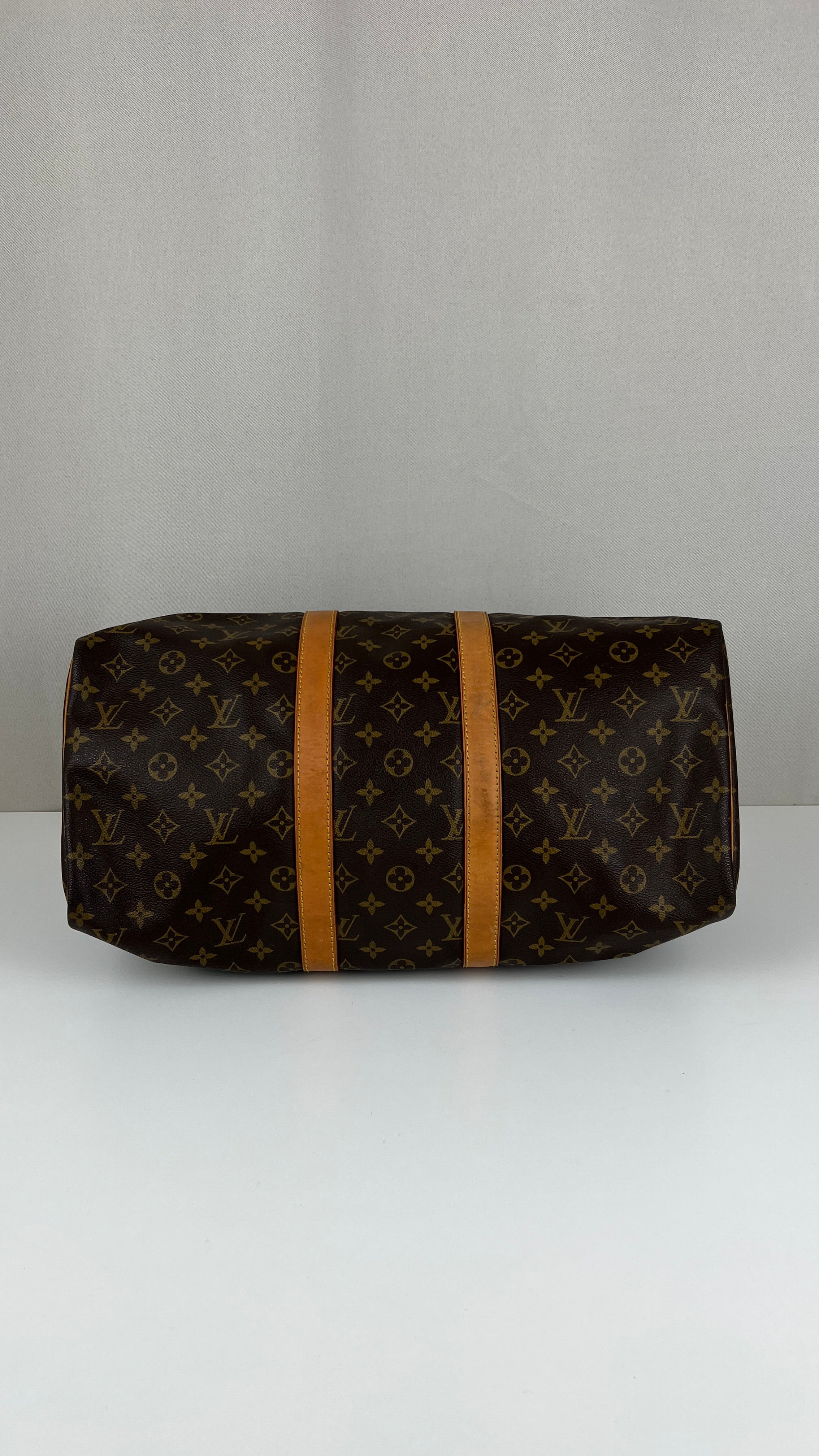 This Louis Vuitton Keepall 45 is in very good condition. The canvas is in very good condition. The corners are in good condition a little bit rubbed. The leather parts are tanned and in good condition some little trace of wear. The leather parts have some trace of wear at the base. The handles are in good condition. The inside is in good condition.