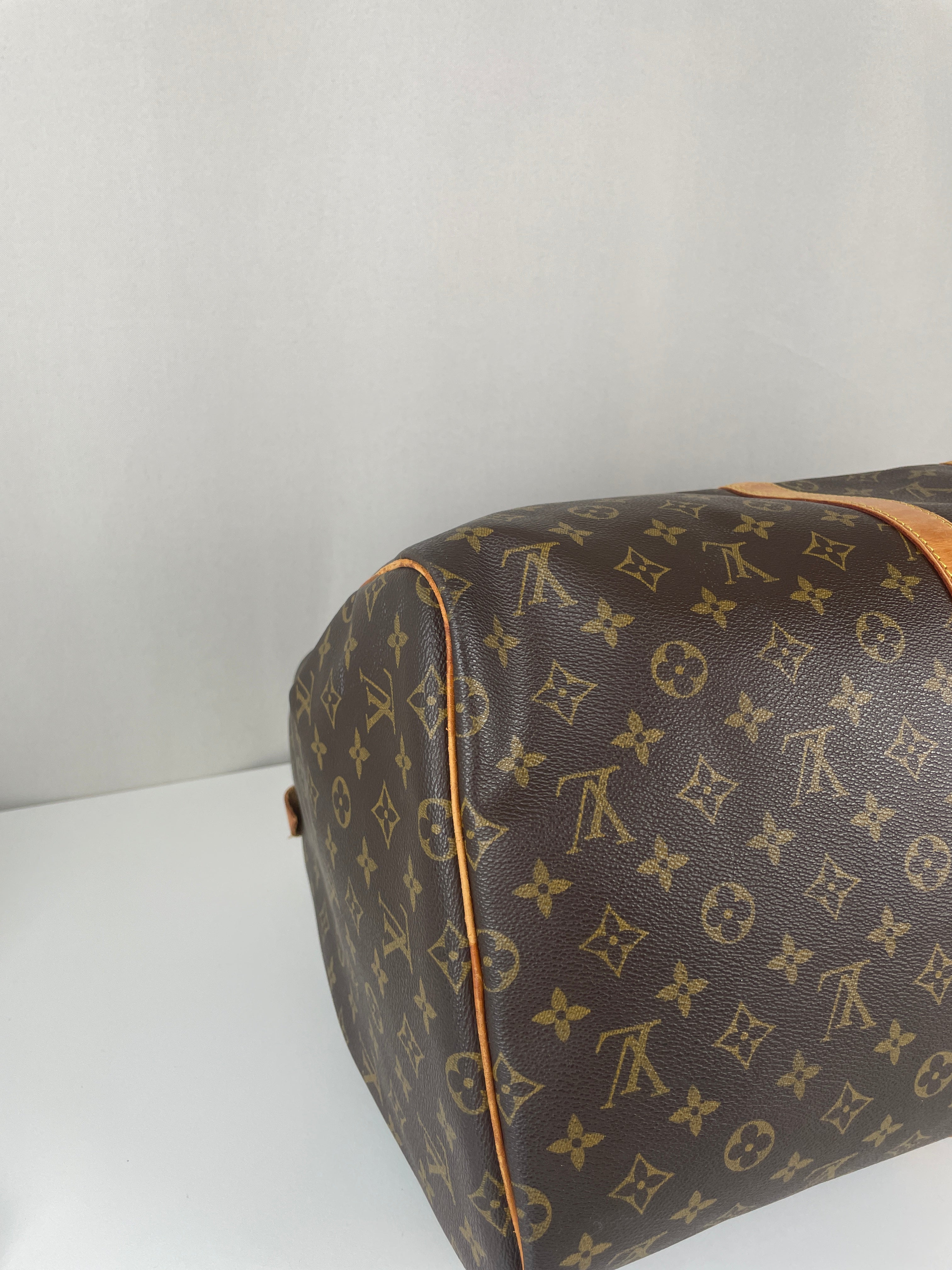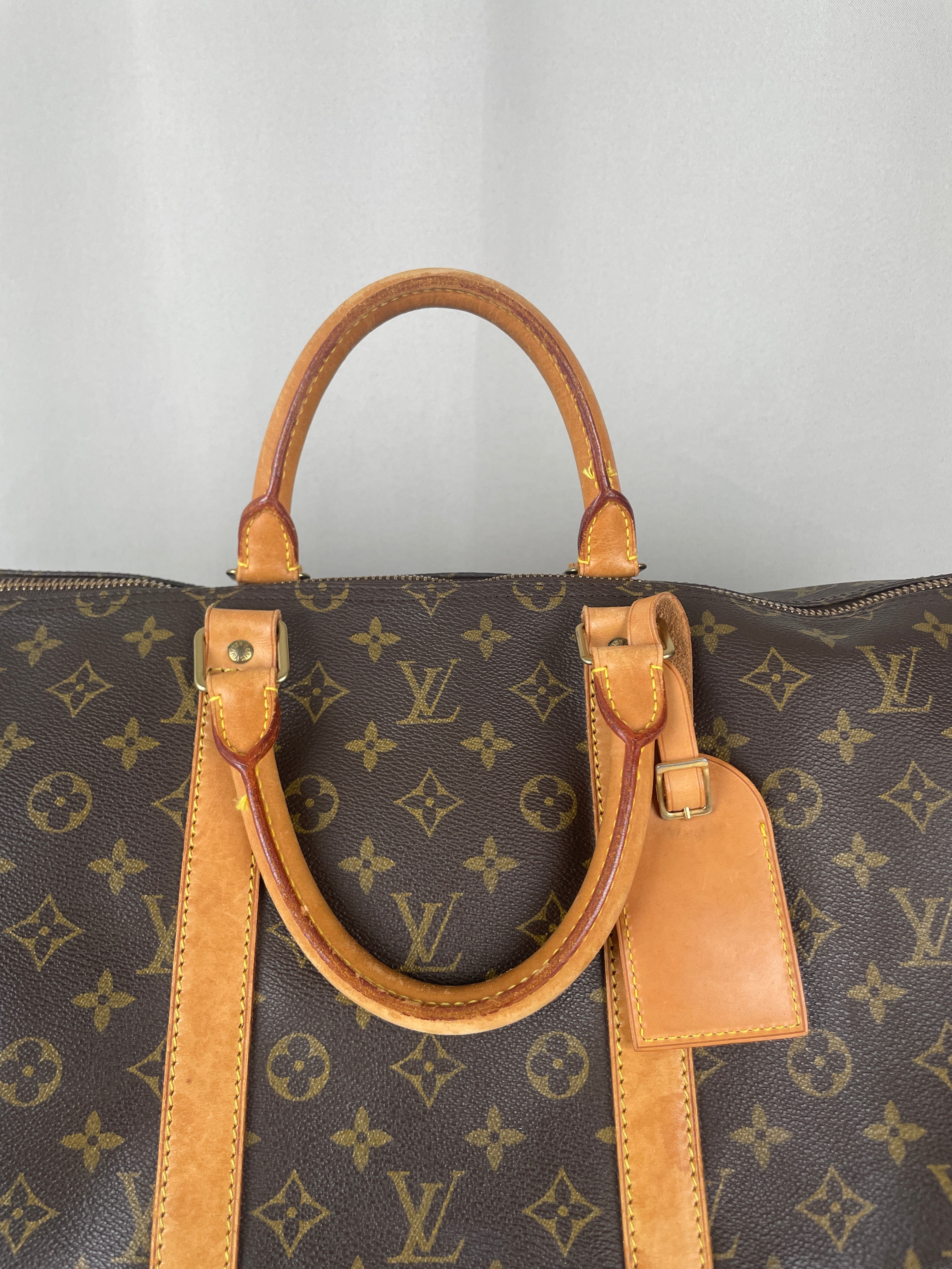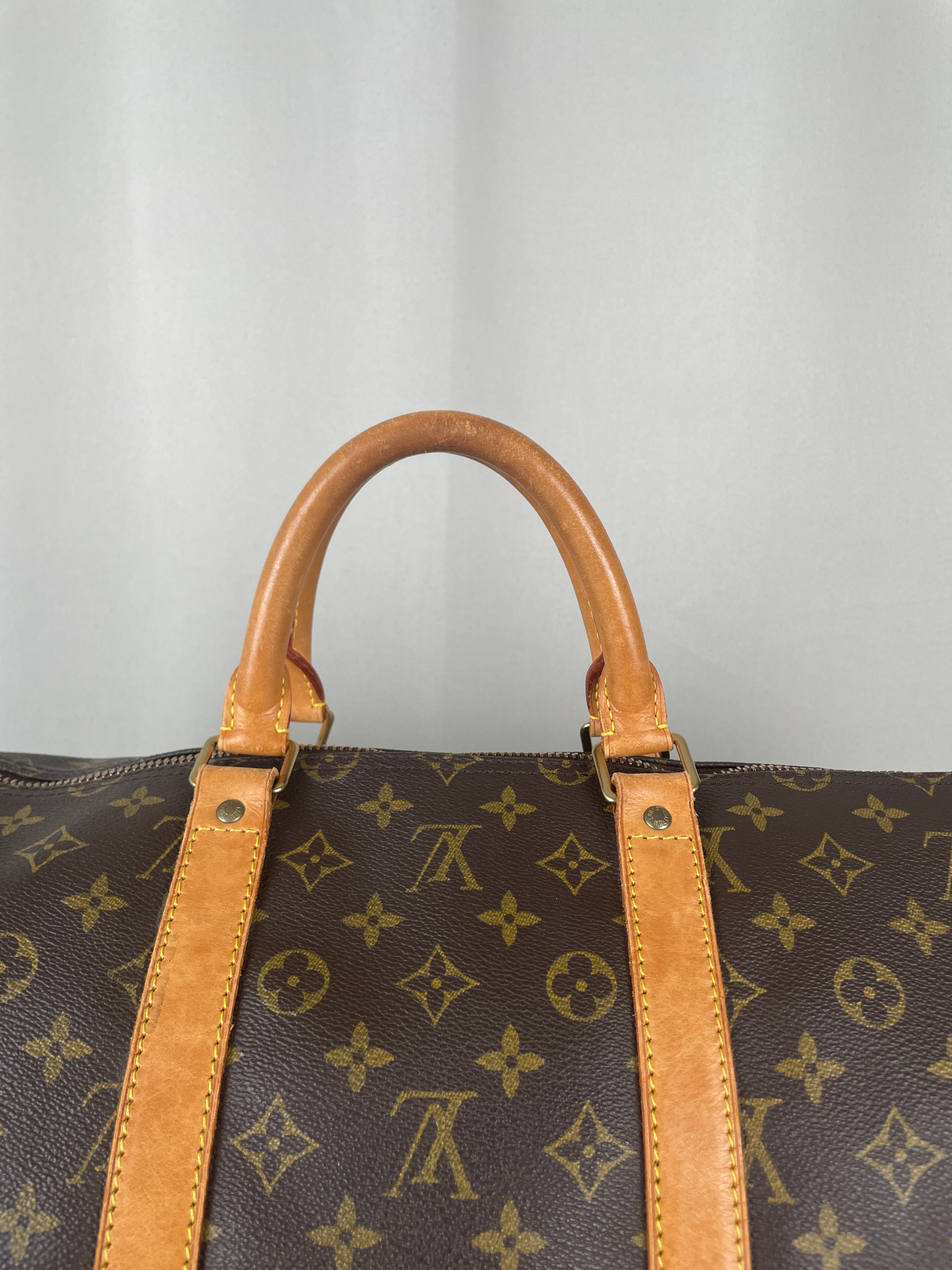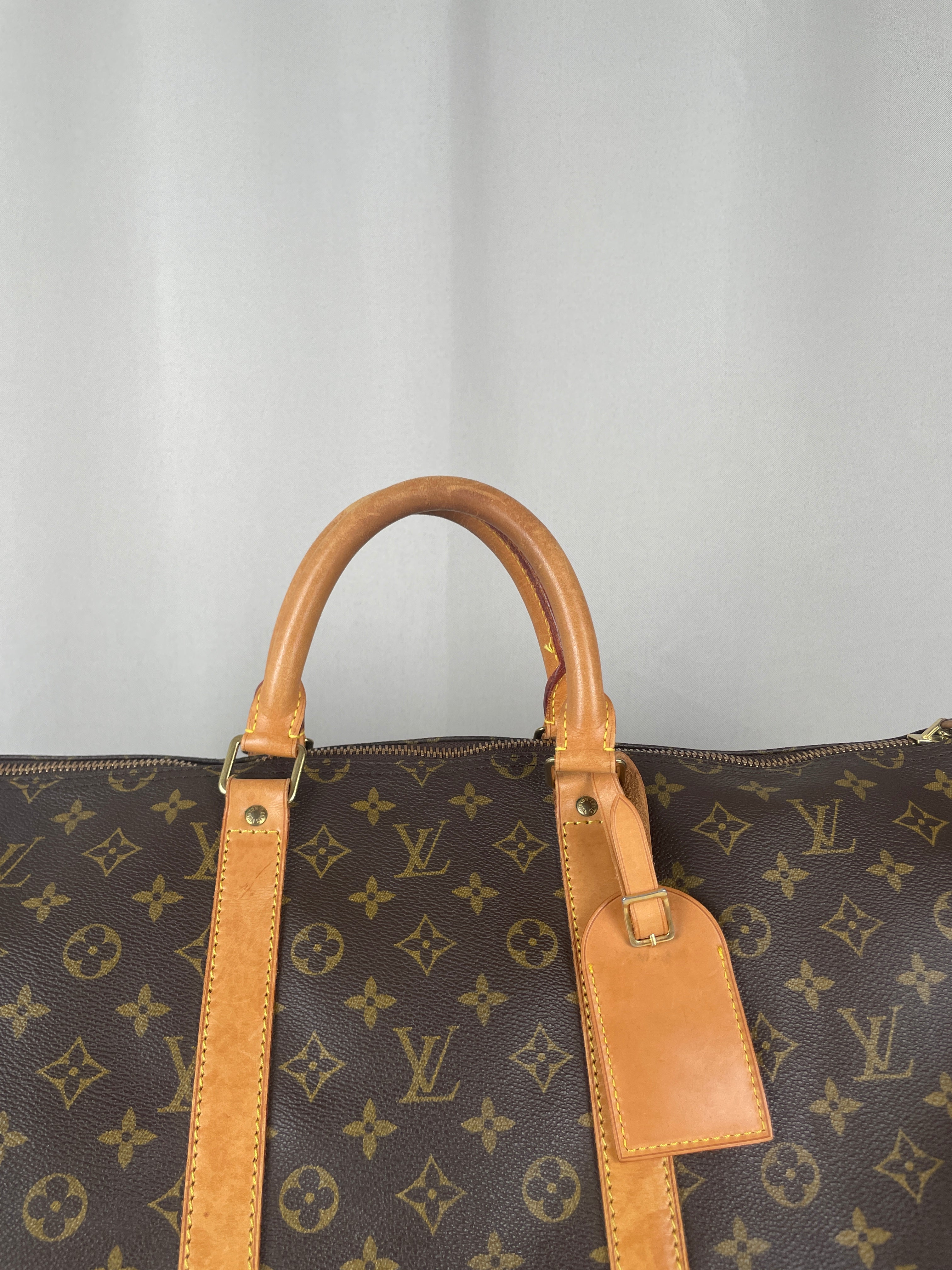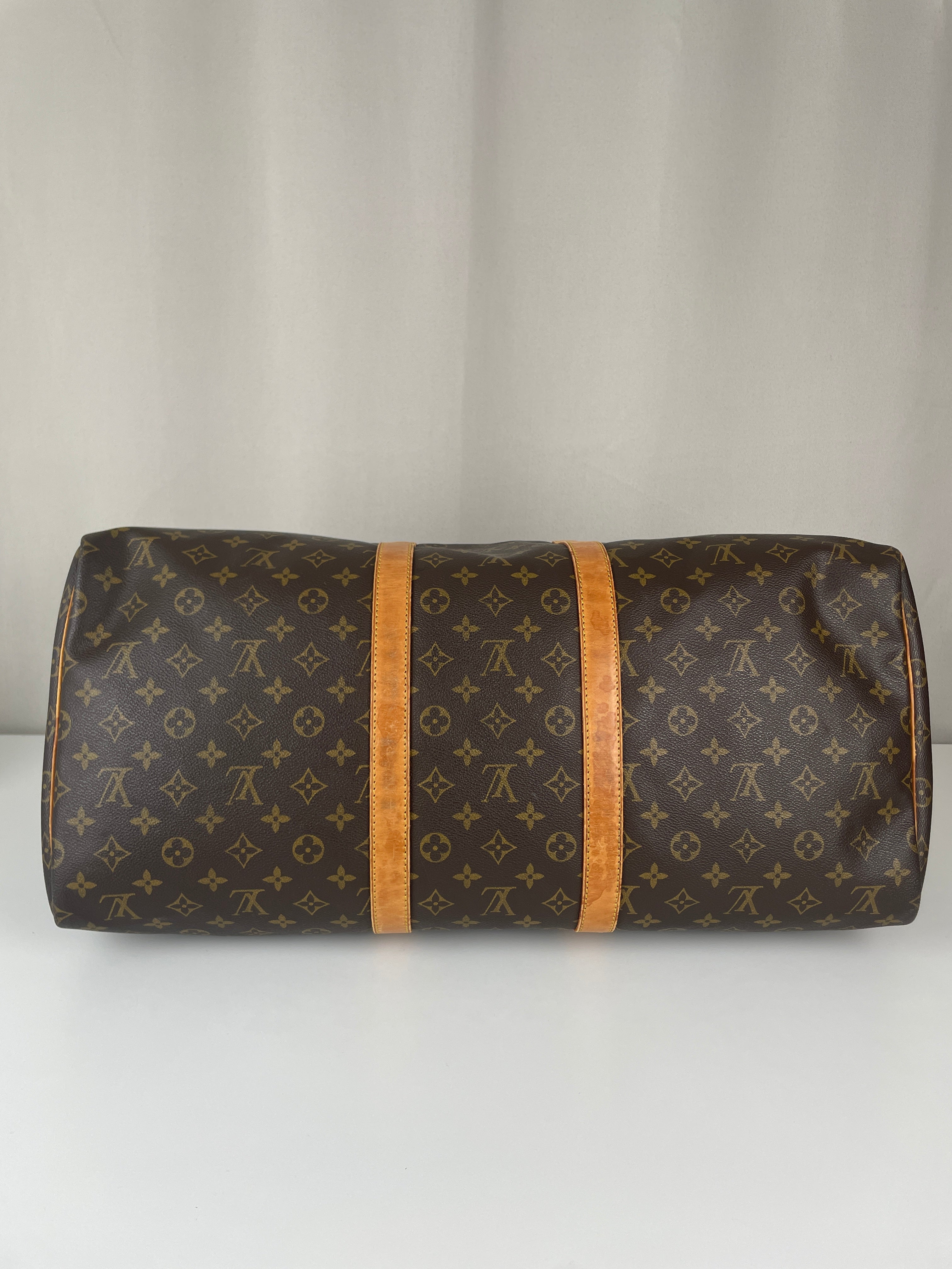 The Louis Vuitton Keepall 55 in Monogram canvas with shoulder strap is a cult classic in the world of luxury travel. Its flexible structure and cabin-friendly size make it the ideal partner for getaways and business trips alike. The naturally aged leather gives it character, and despite light signs of wear, this piece remains elegant, durable, and endlessly functional.
