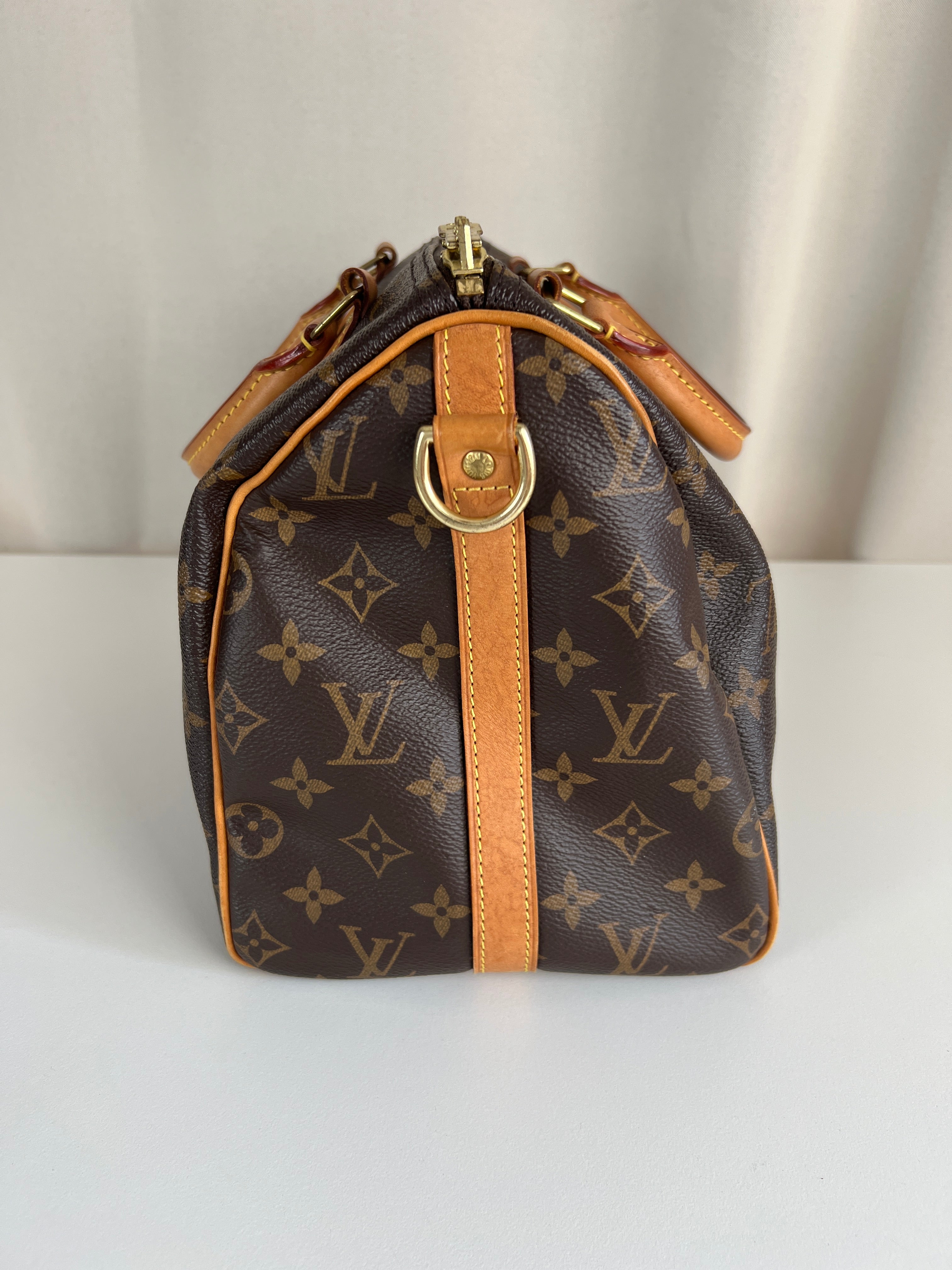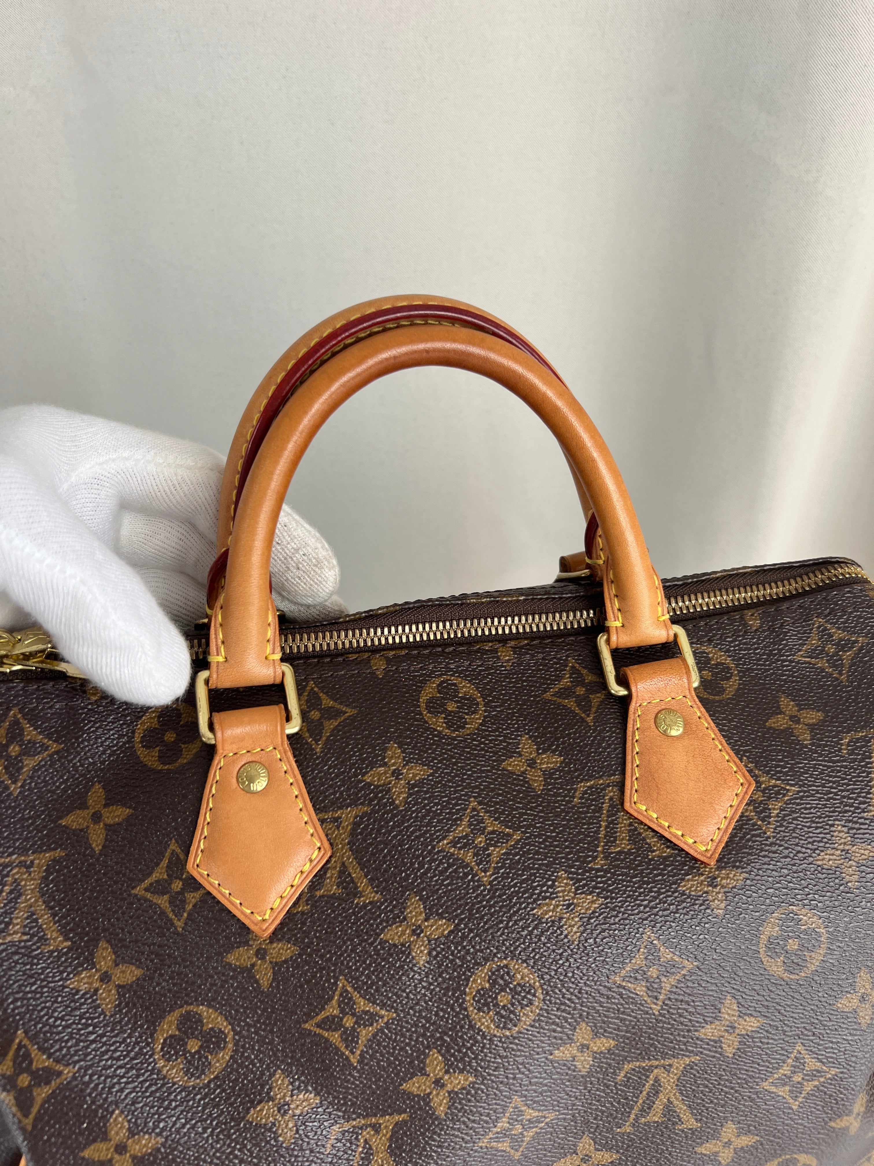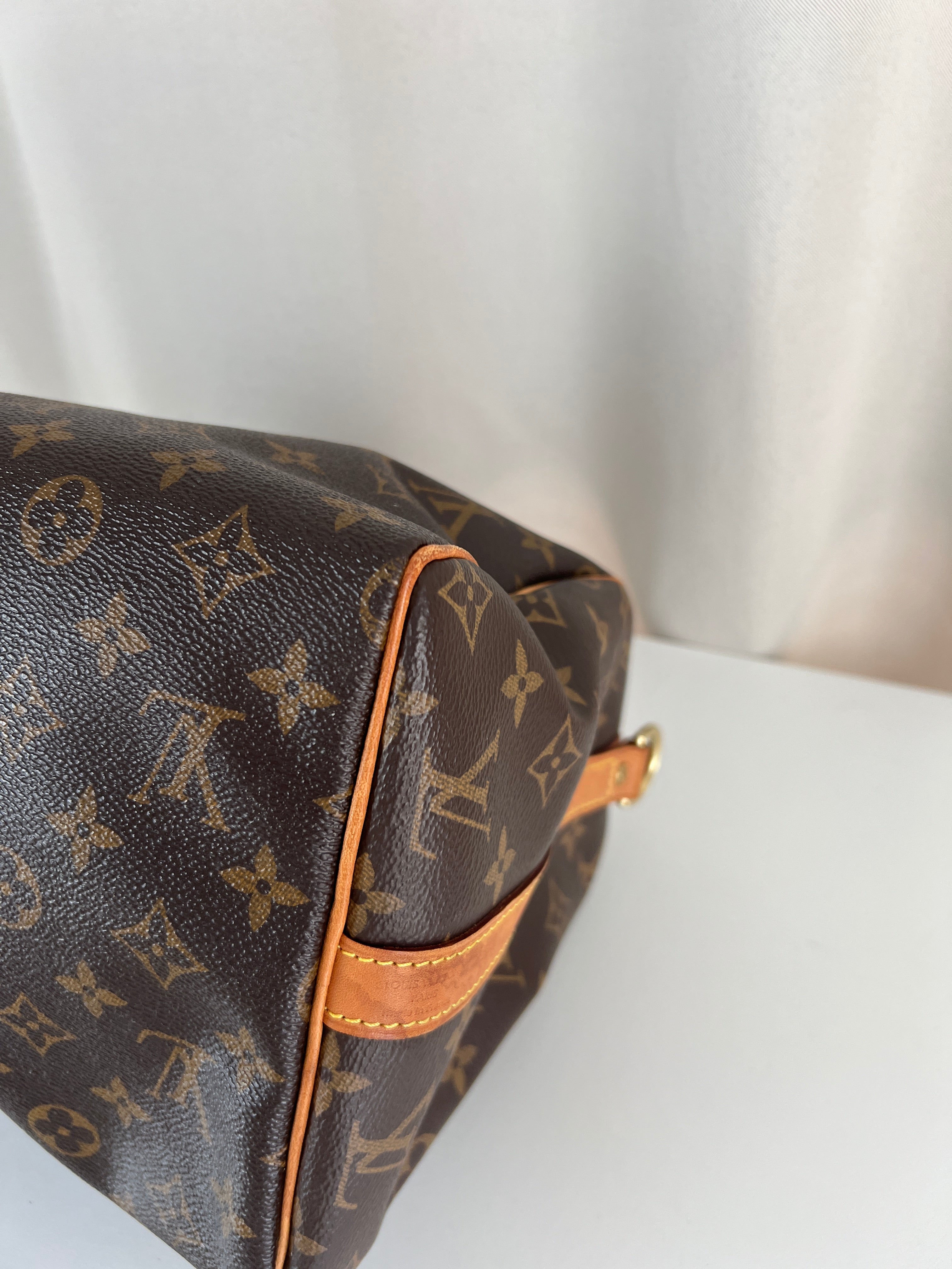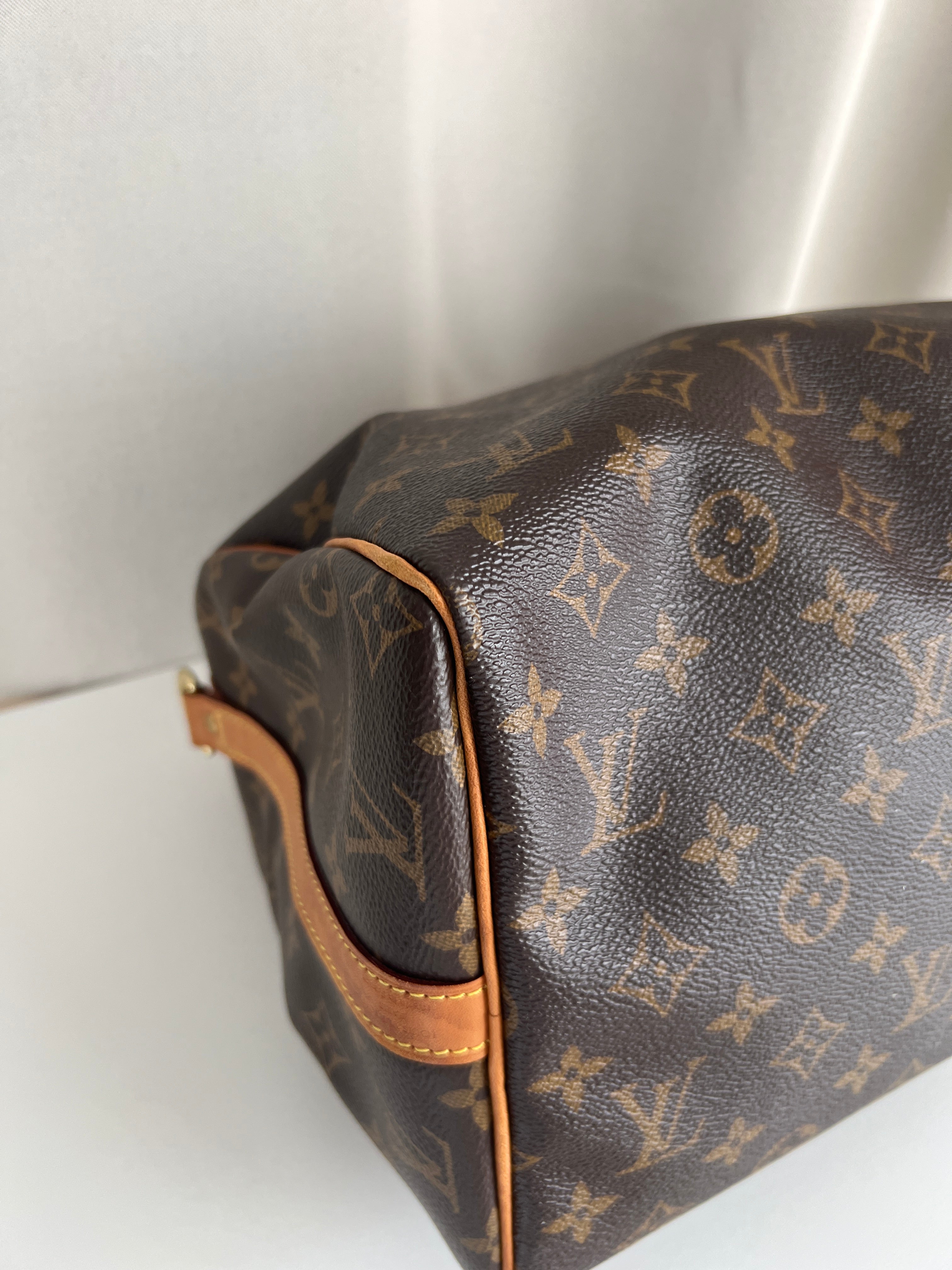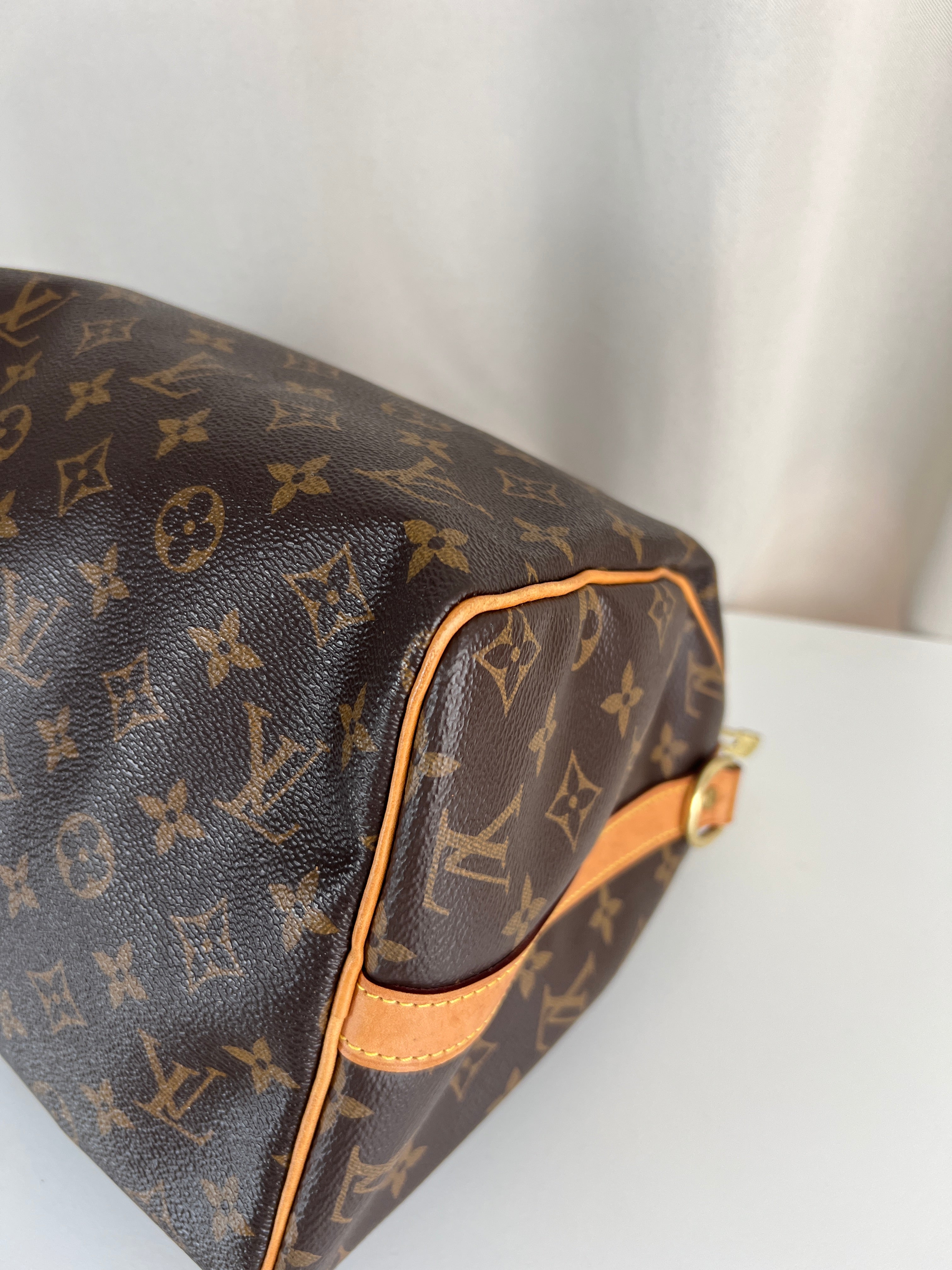 This Louis Vuitton Speedy Bandoulière 30 monogram handbag is in very good condition, super recent. The leather parts are in good condition, minor stains. The handles are very good as well as the corners (little bit rubbed). You can see the canvas on the outside has some sparkles. The interior is in perfect condition. The strap was probably never used the leather is perfect.