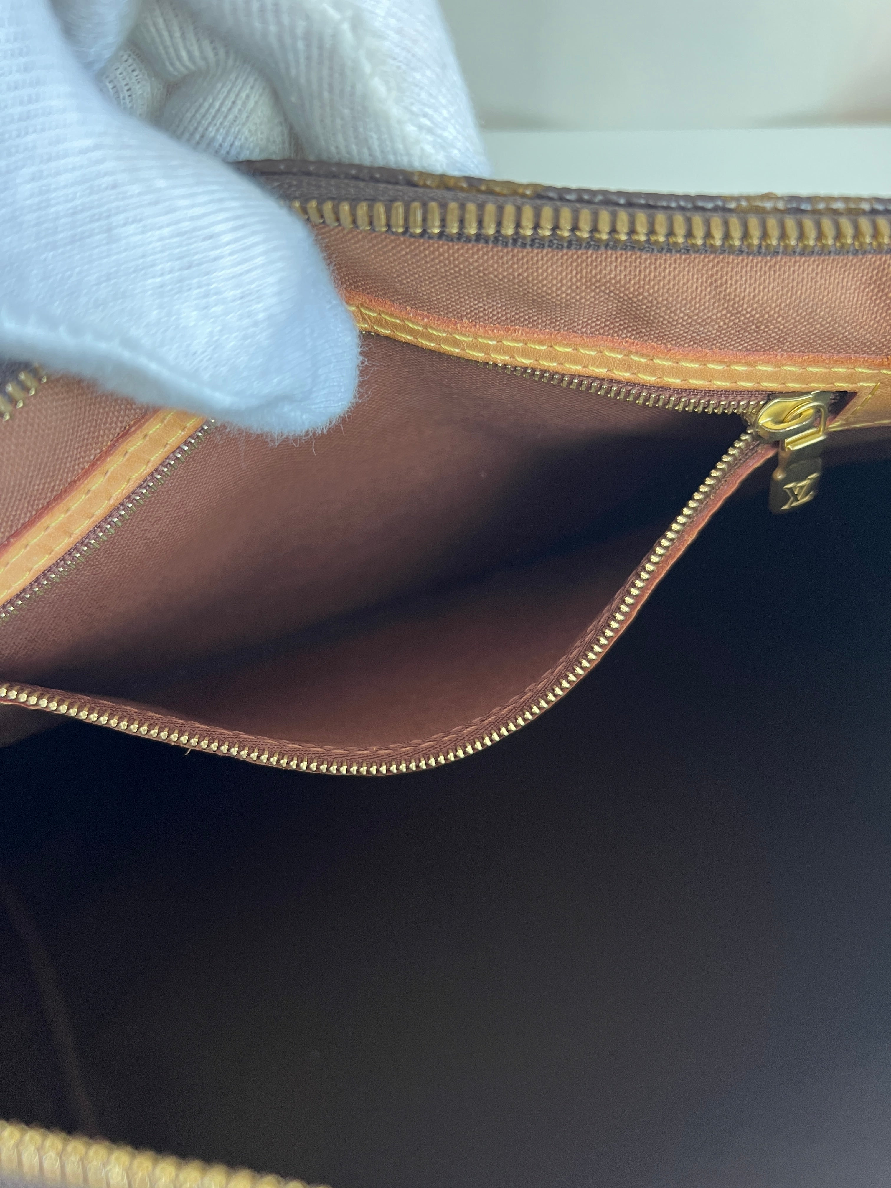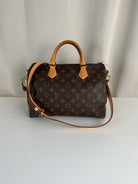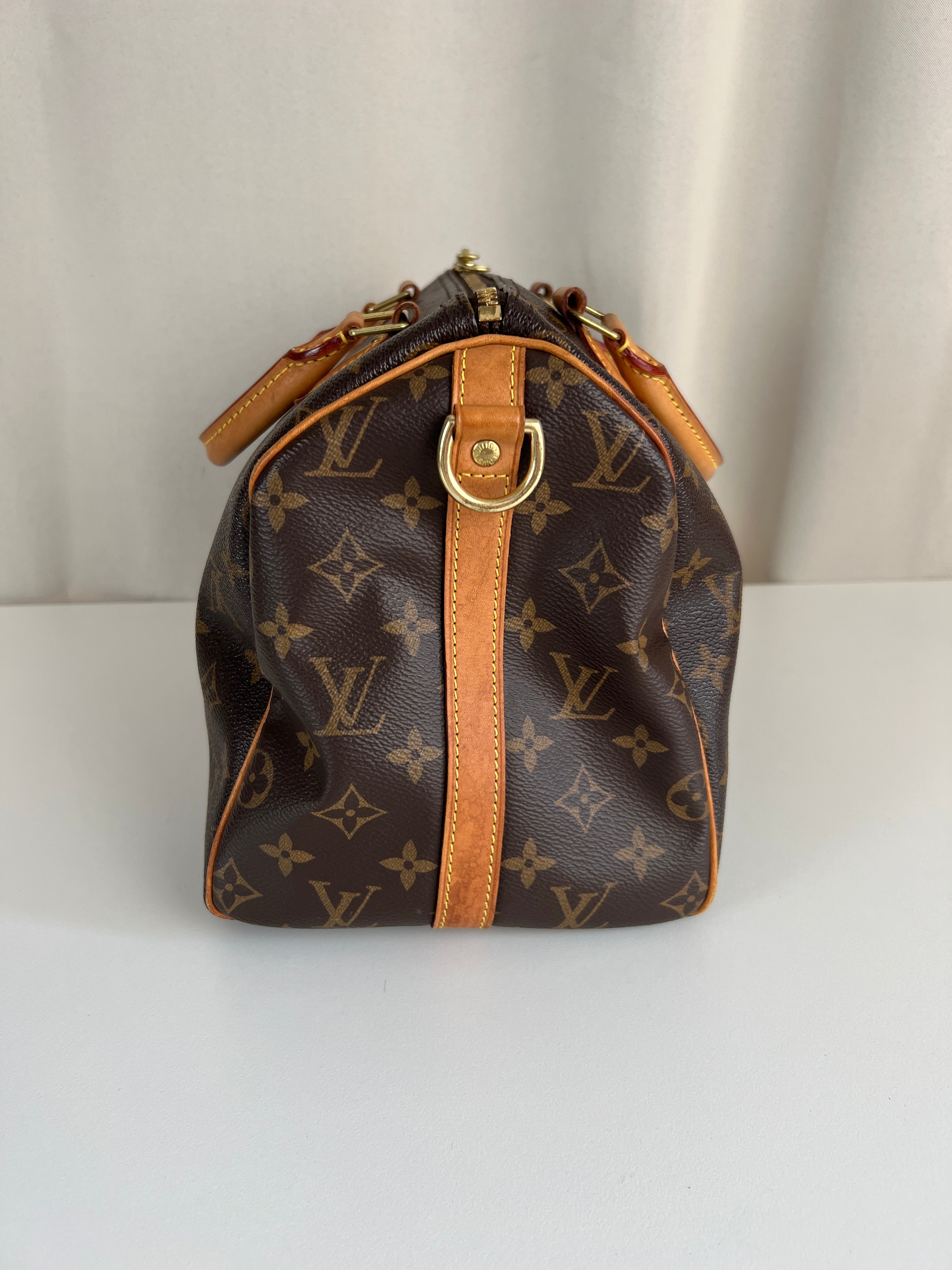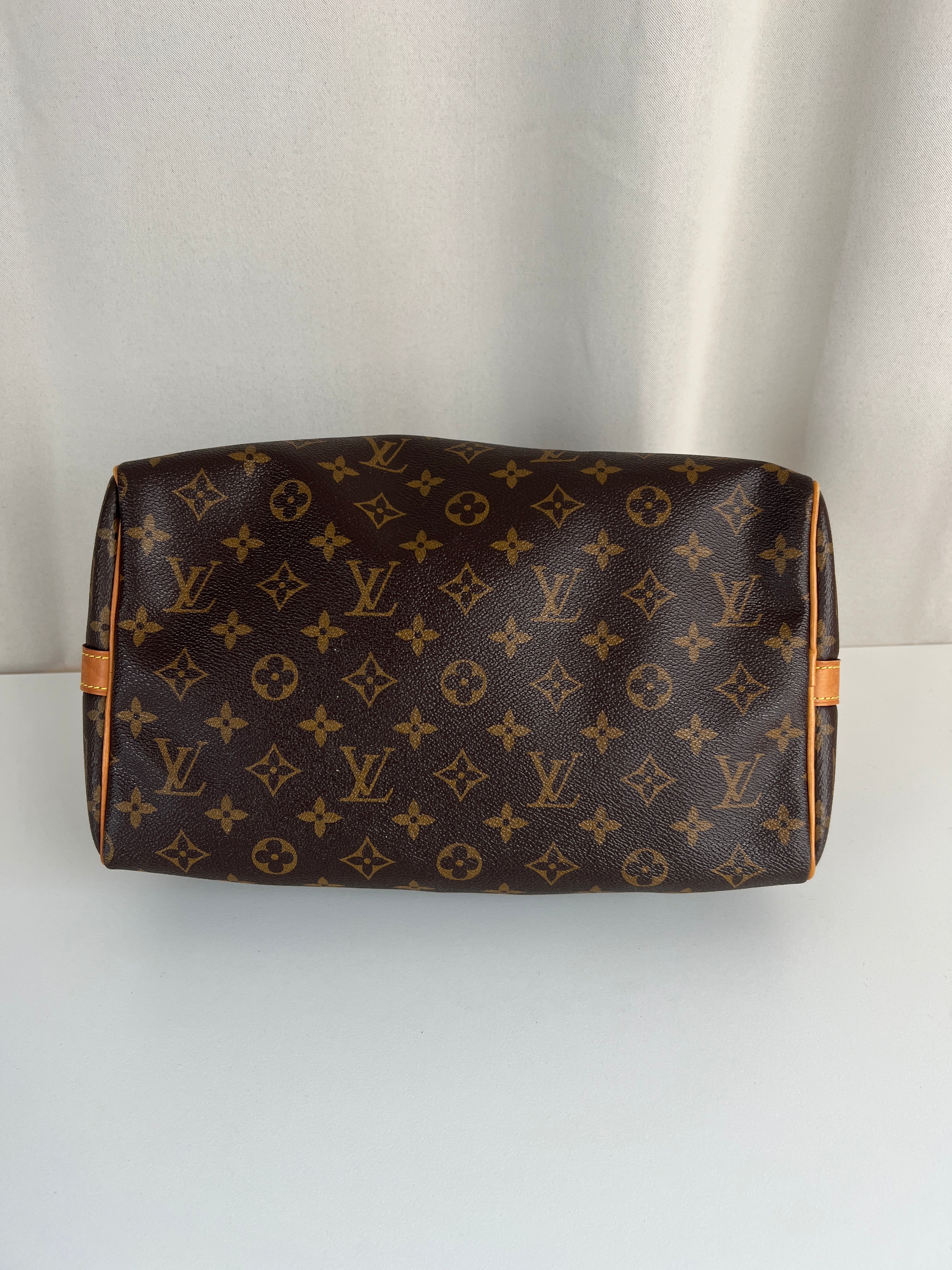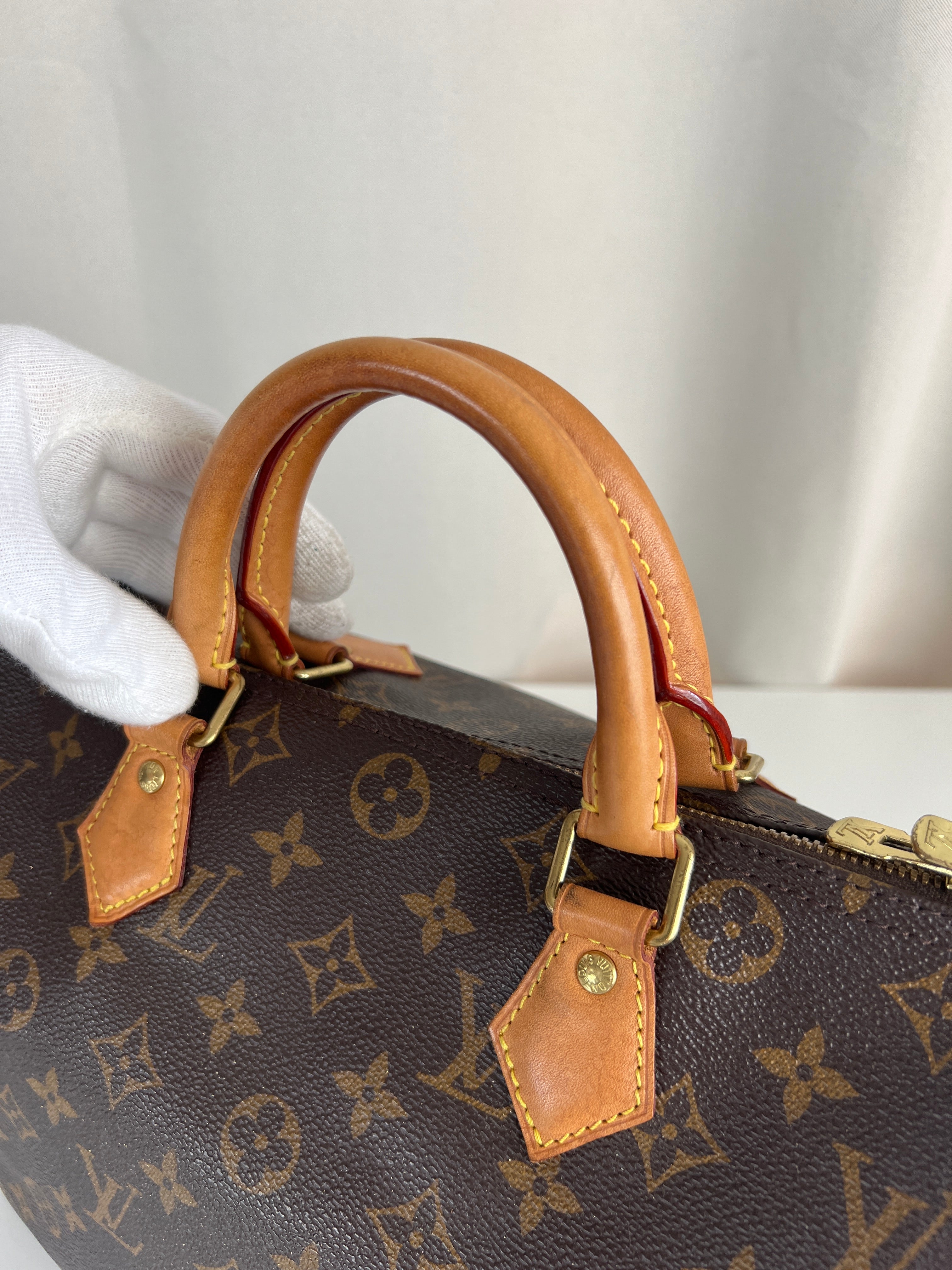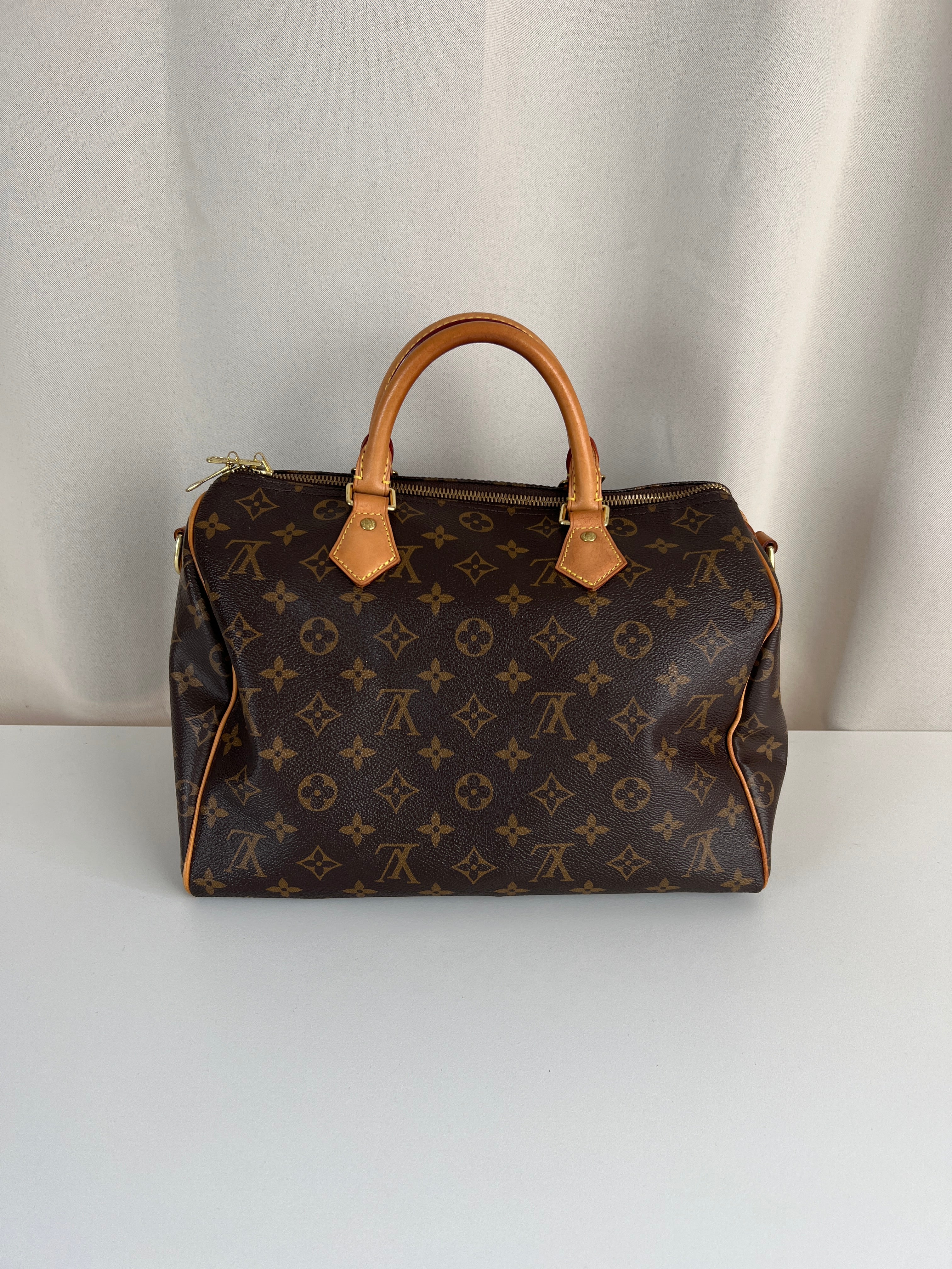 This Louis Vuitton Speedy Bandoulière 30 monogram handbag is in very good condition, super recent. The leather parts are in good condition, minor stains. The handles are very good as well as the corners (little bit rubbed). You can see the canvas on the outside has some sparkles. The interior is in perfect condition. The strap was probably never used the leather is perfect.