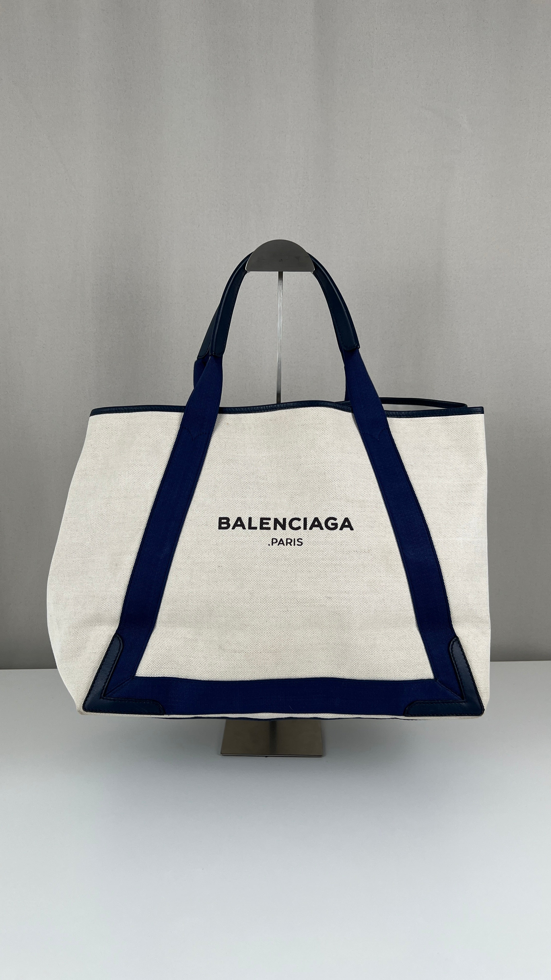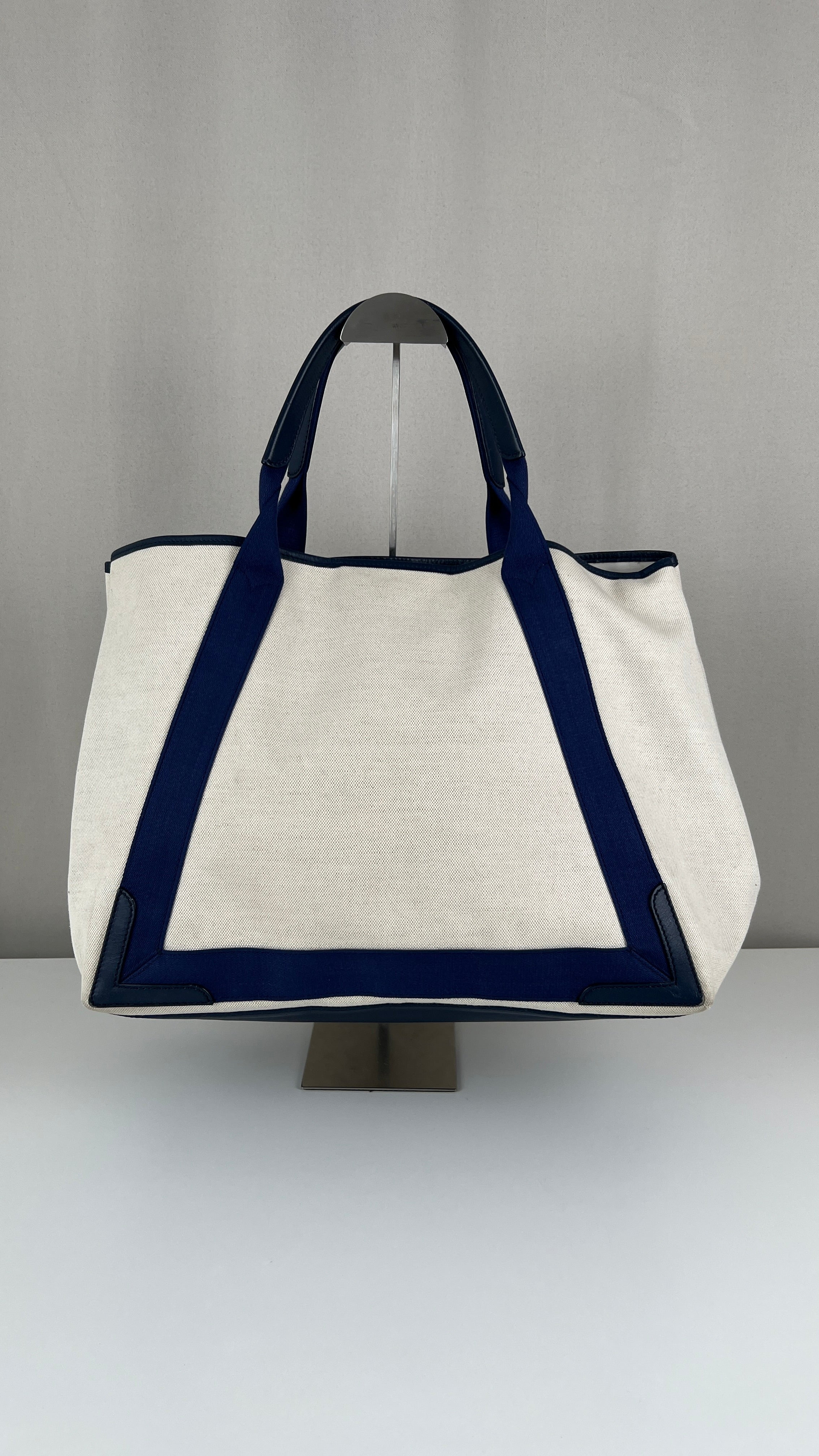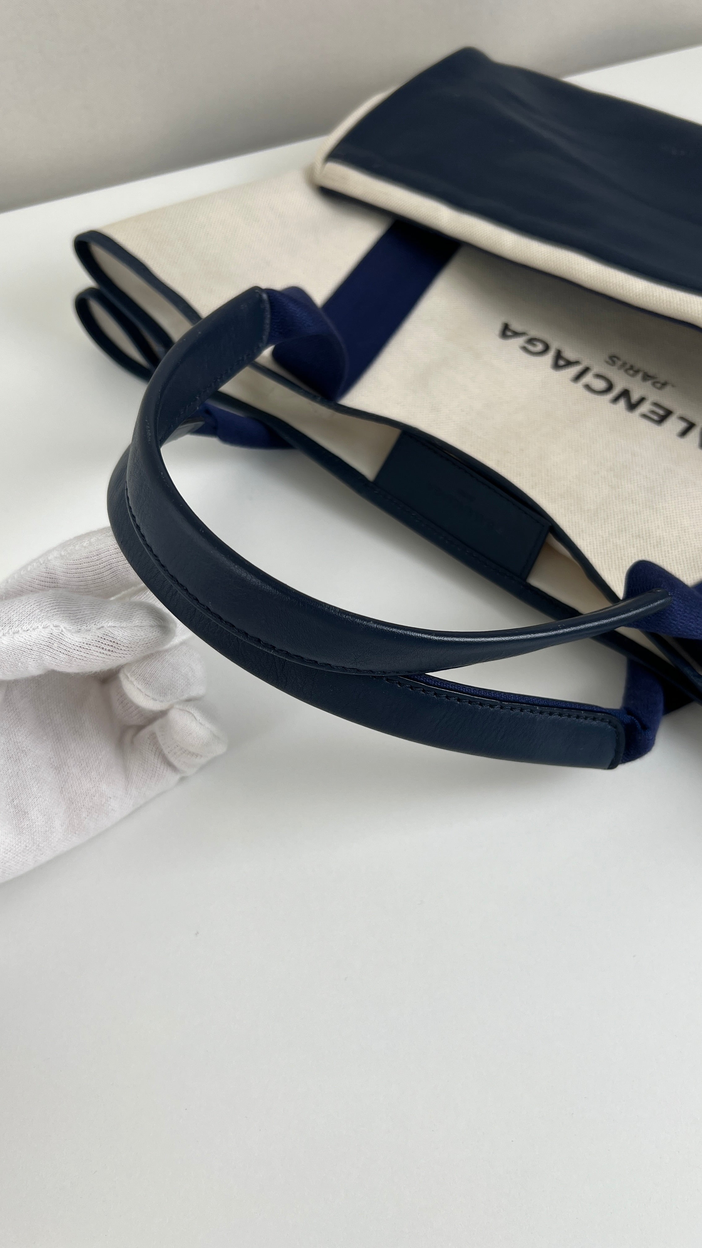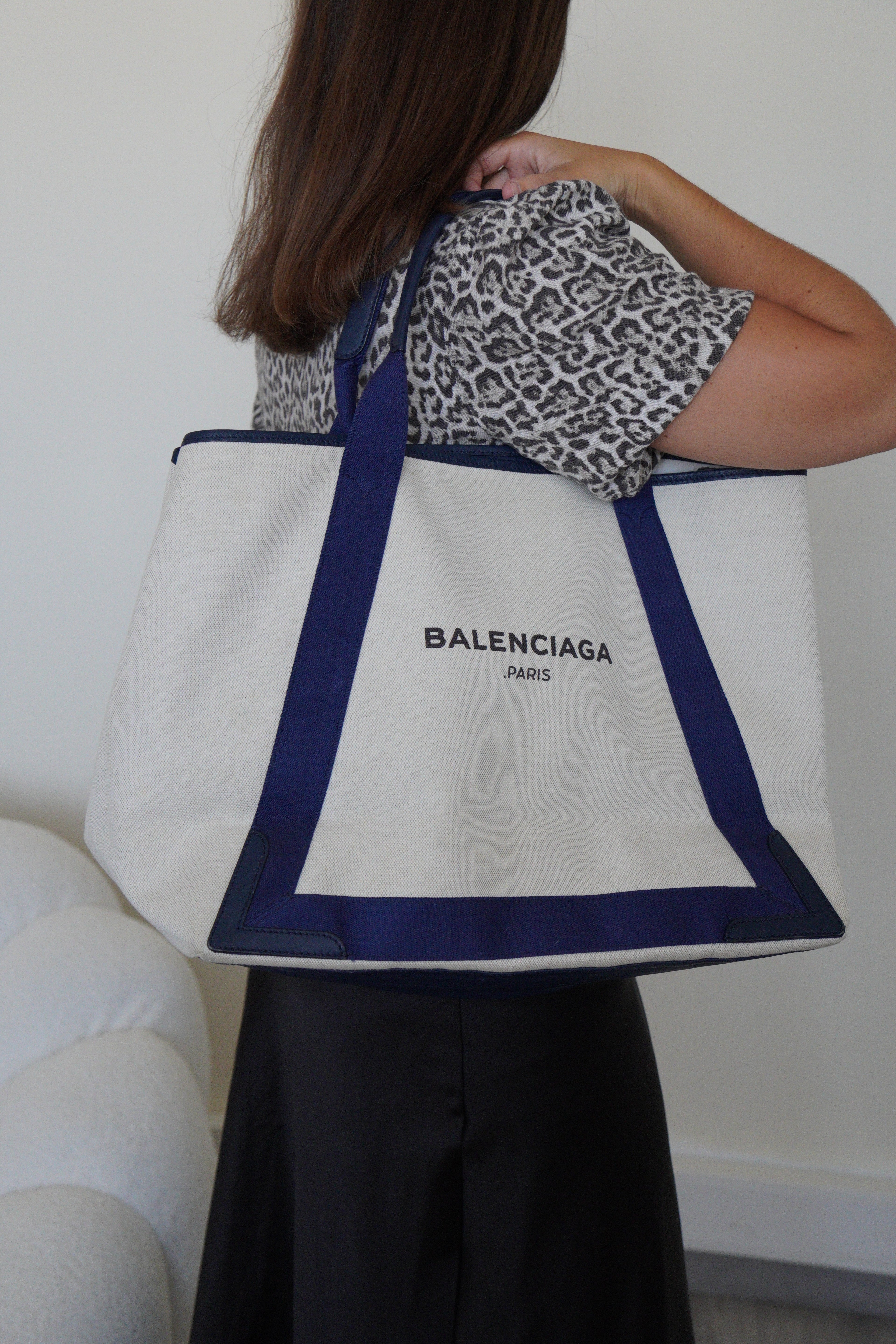 This Balenciaga Navy Big Cabas is in good / very good condition. The cotton canvas is in very good condition, very little trace of wear very natural. The corners are in good condition, a little bit rubbed. The handles are in very good condition and are in leather. There are little stains inside. You can largely fit a computer inside. Bottom of the bag is in leather, little trace of wear almost not.
