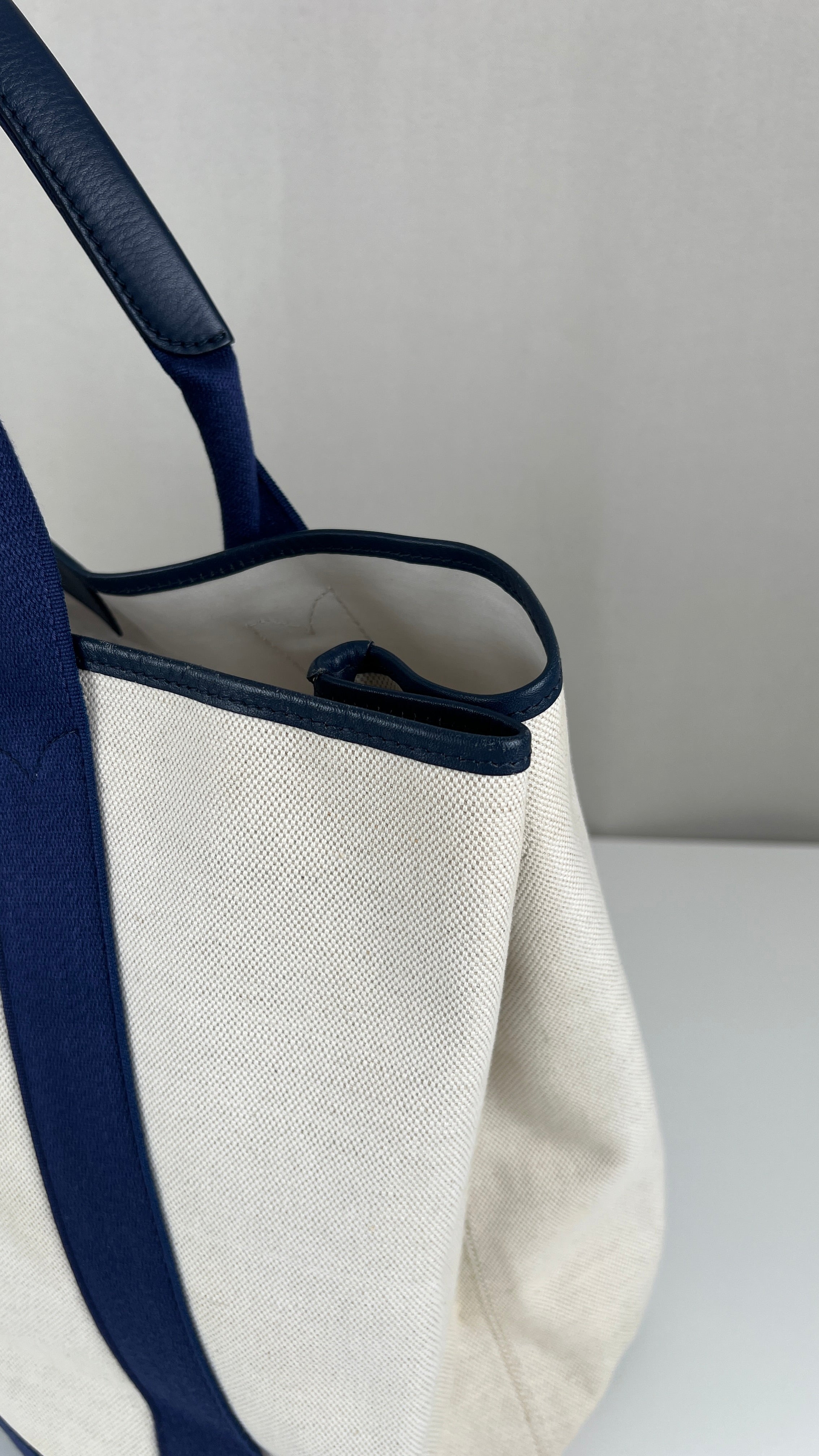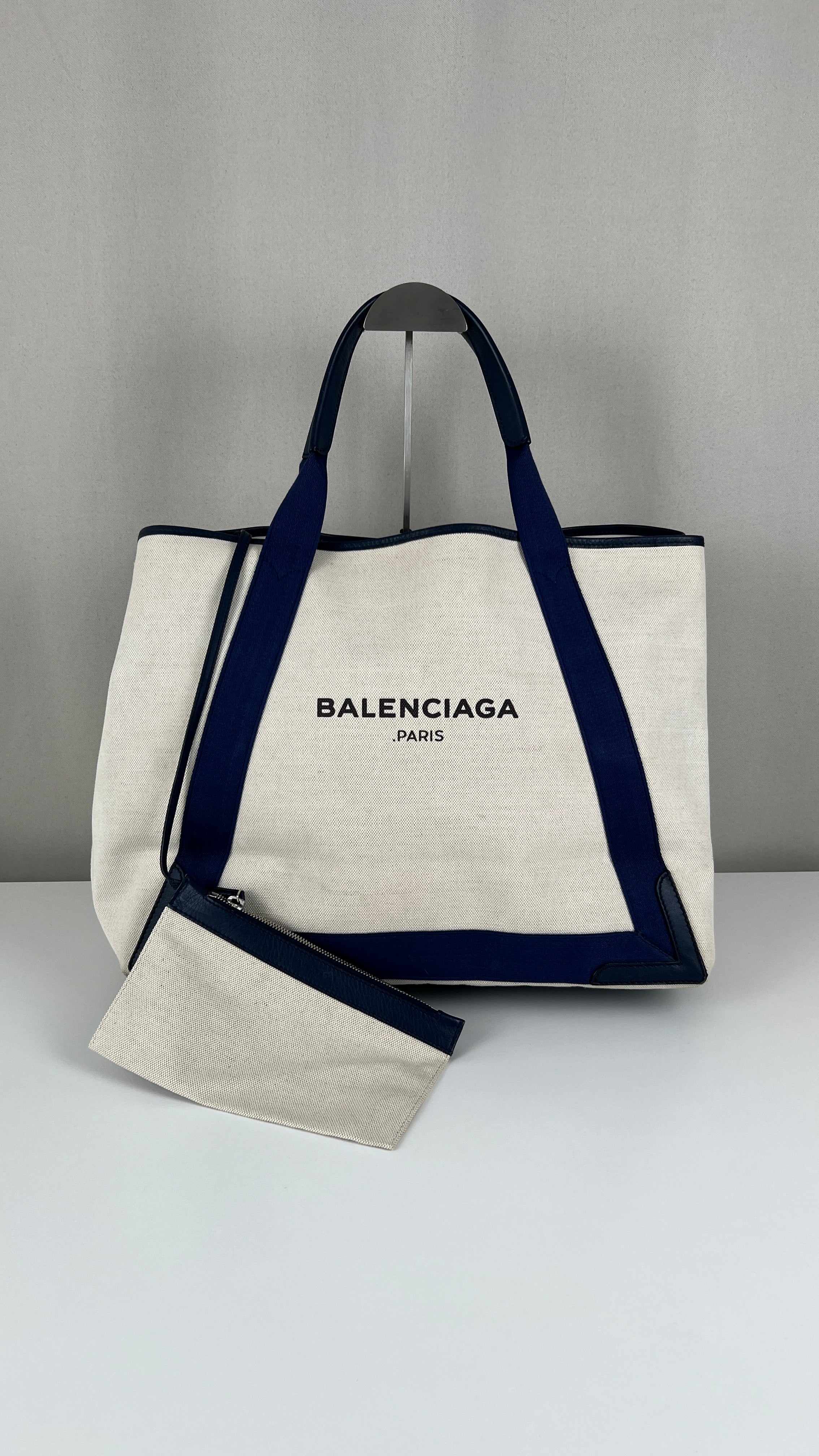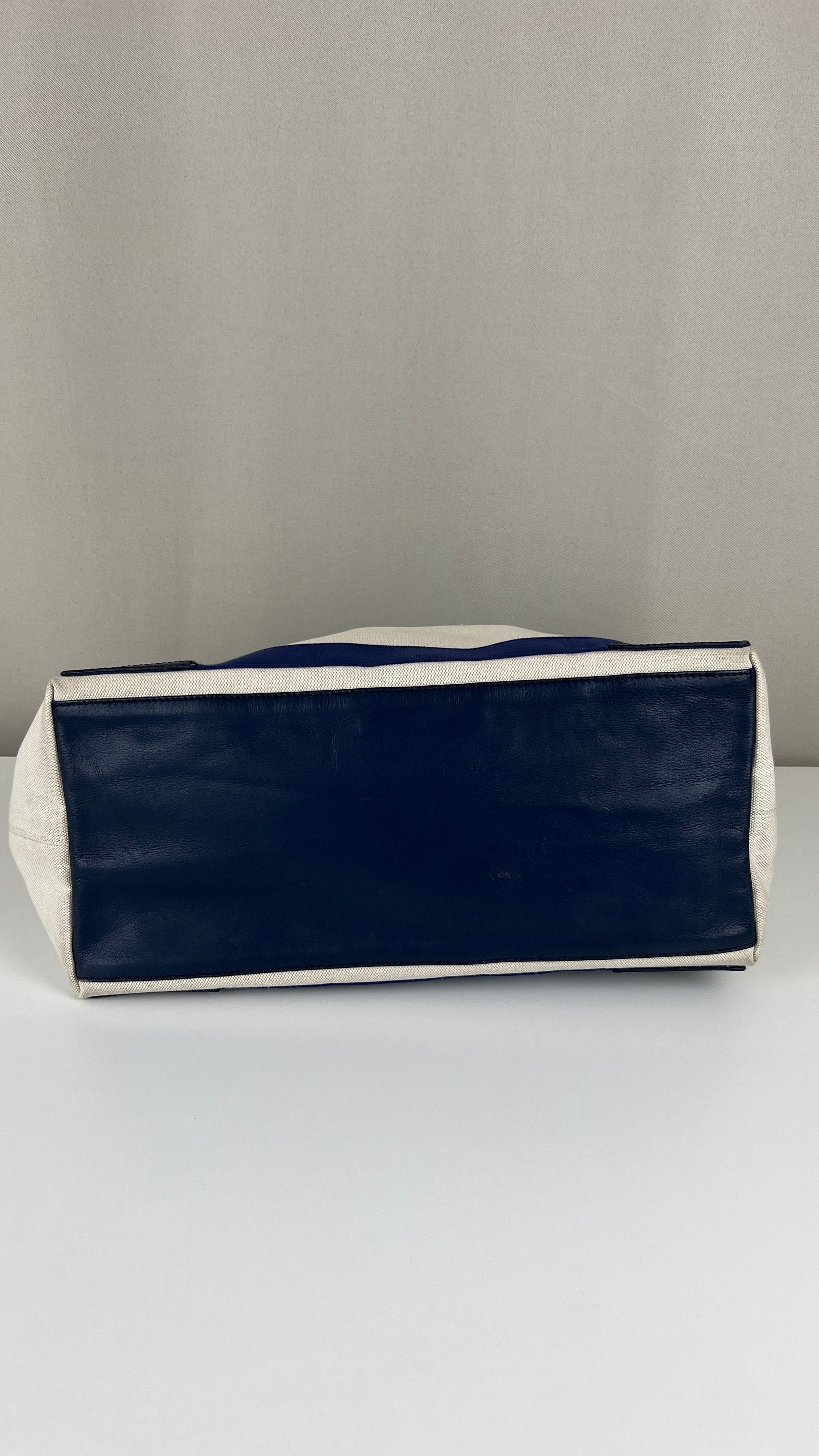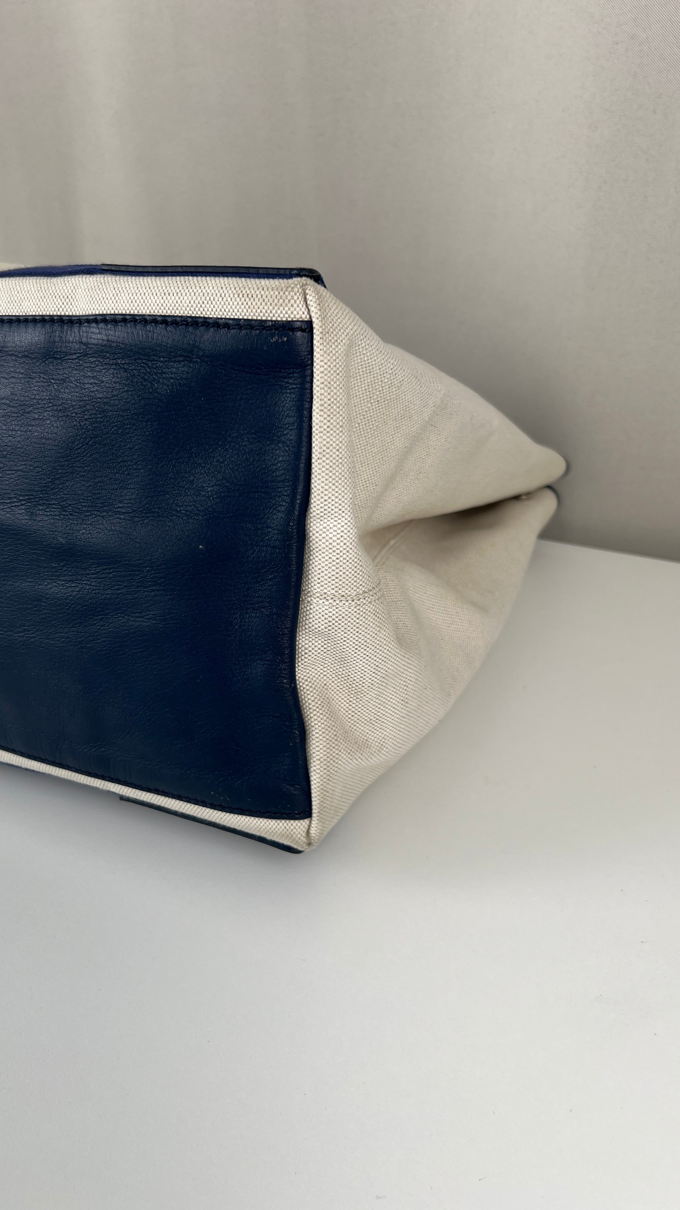 This Balenciaga Navy Big Cabas is in good / very good condition. The cotton canvas is in very good condition, very little trace of wear very natural. The corners are in good condition, a little bit rubbed. The handles are in very good condition and are in leather. There are little stains inside. You can largely fit a computer inside. Bottom of the bag is in leather, little trace of wear almost not.