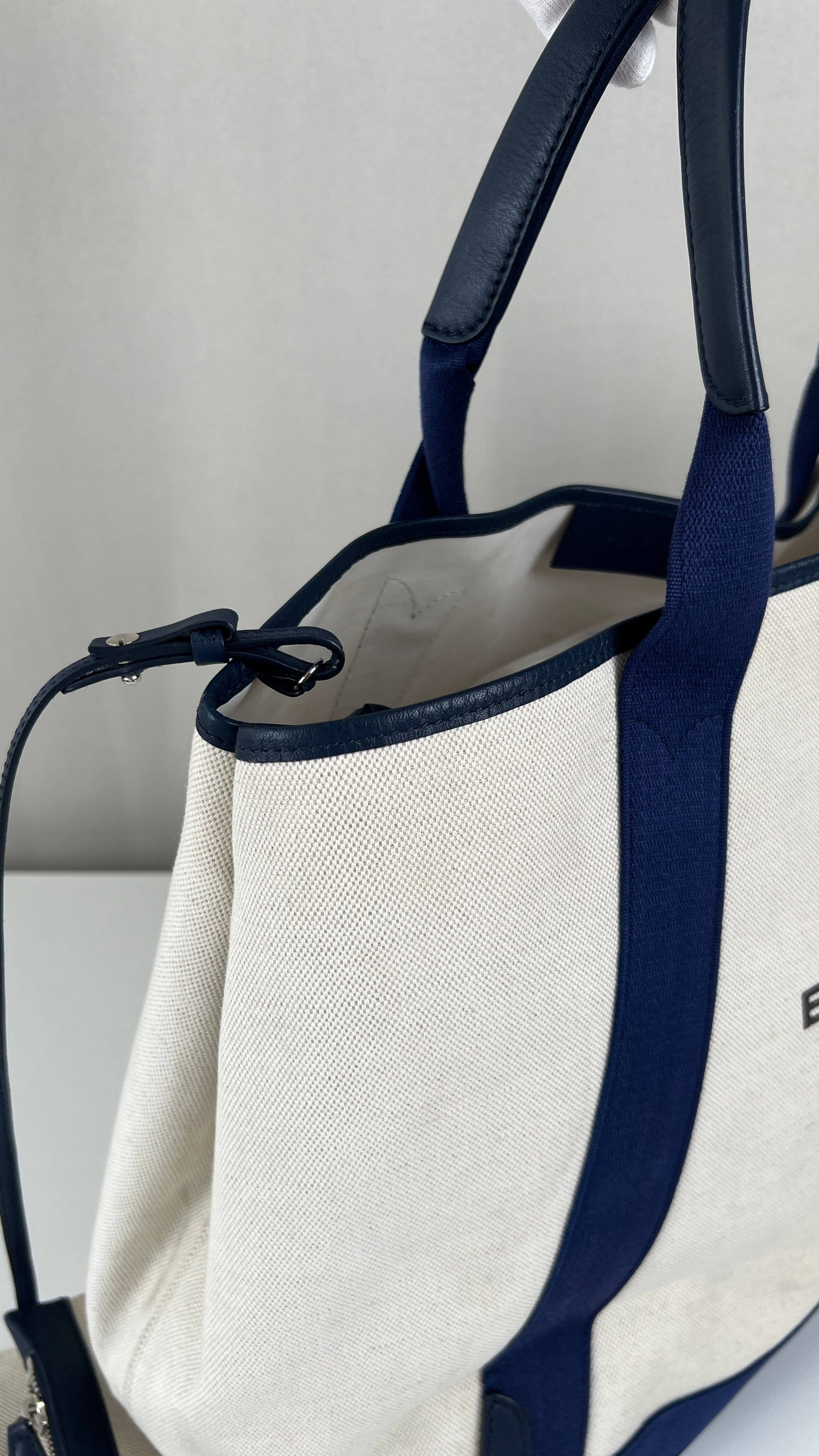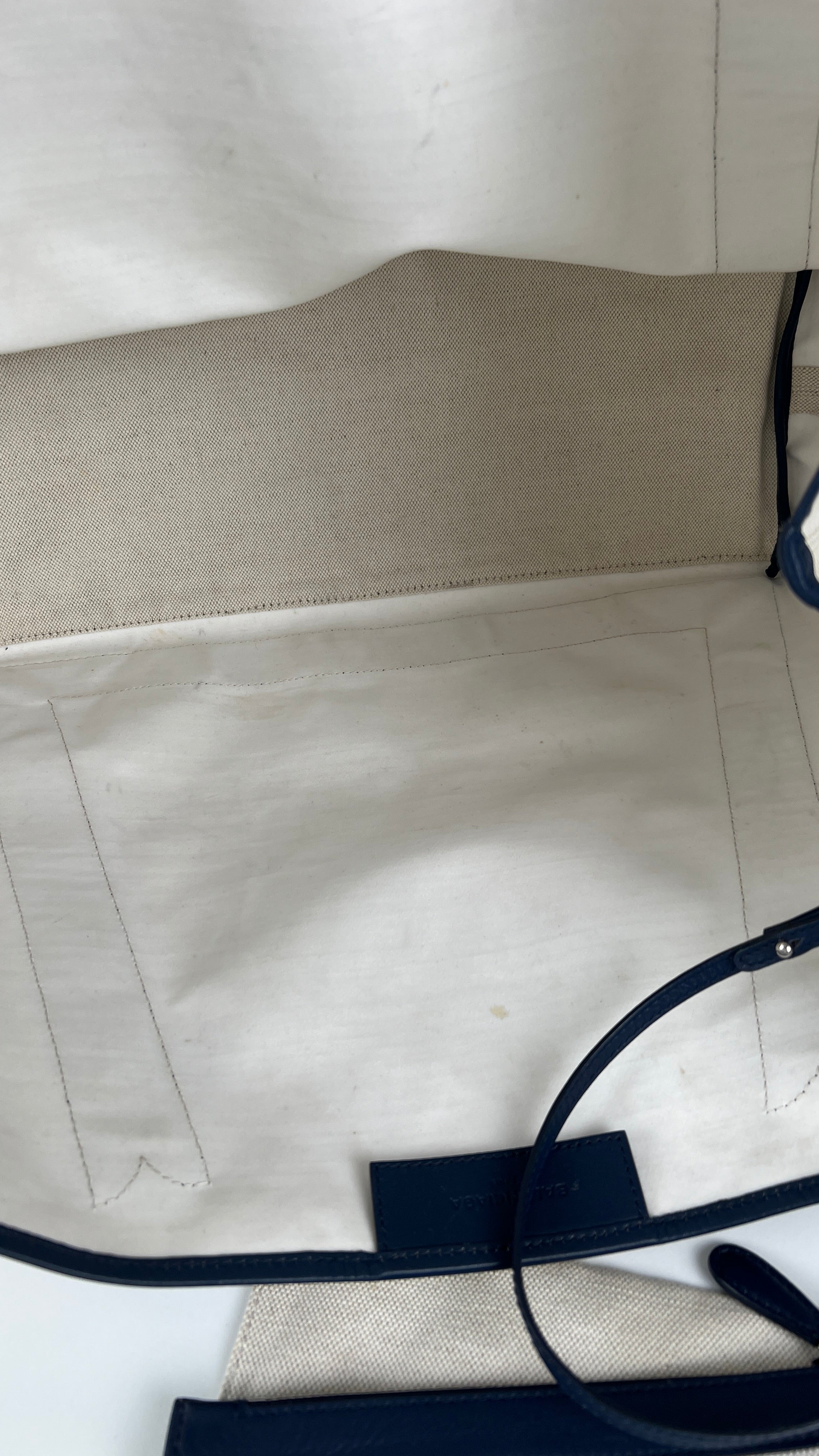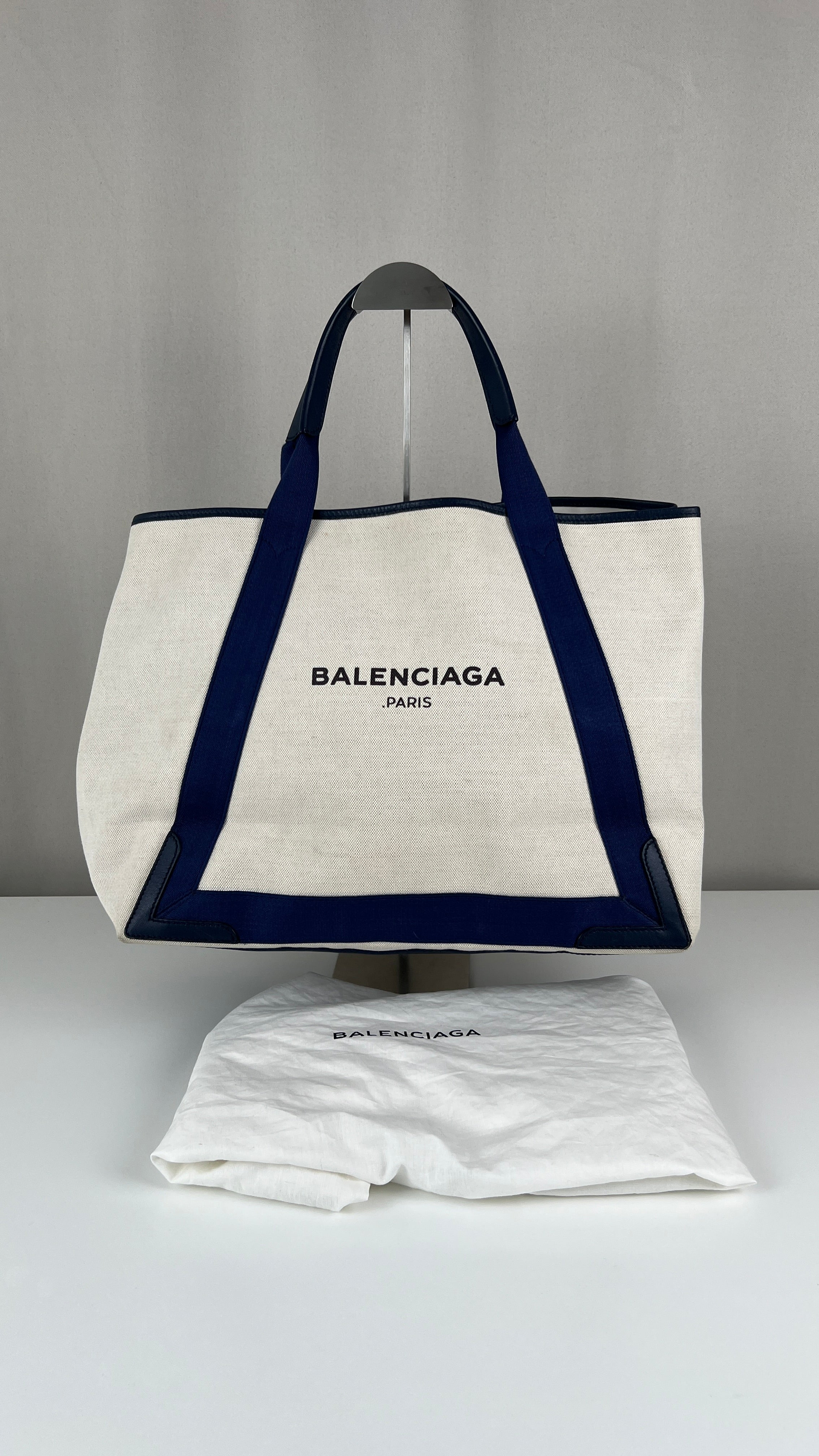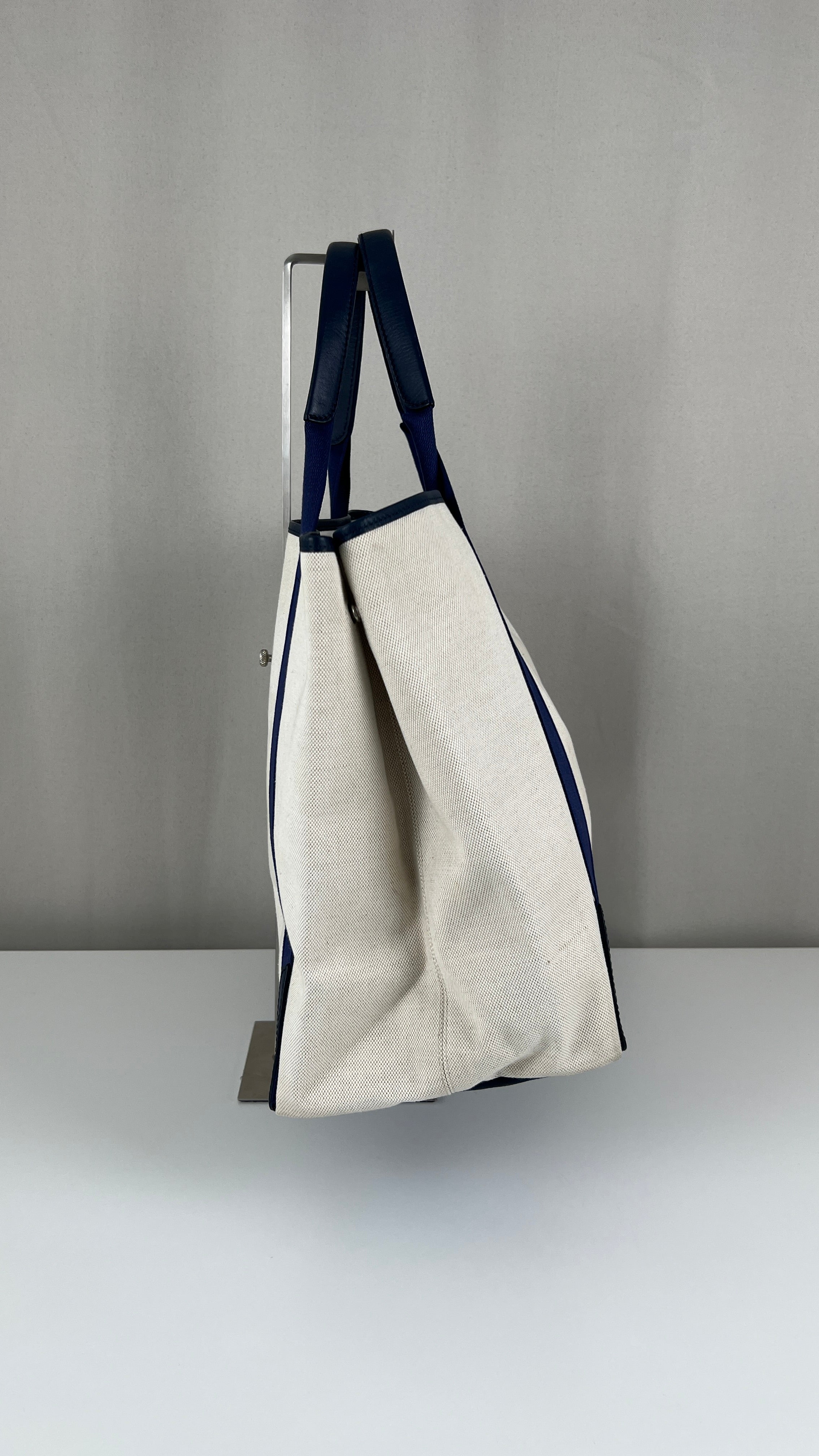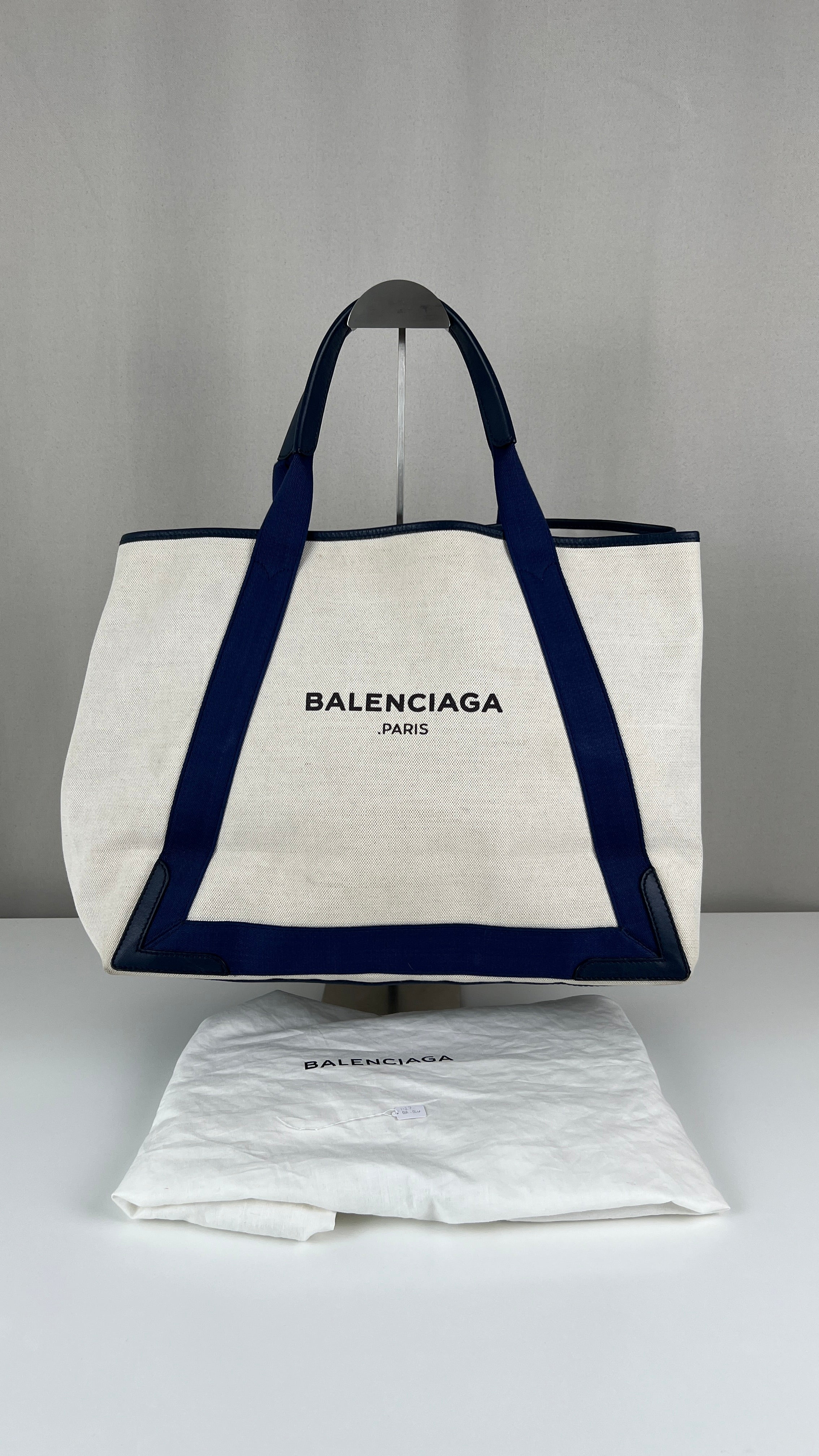 This Balenciaga Navy Big Cabas is in good / very good condition. The cotton canvas is in very good condition, very little trace of wear very natural. The corners are in good condition, a little bit rubbed. The handles are in very good condition and are in leather. There are little stains inside. You can largely fit a computer inside. Bottom of the bag is in leather, little trace of wear almost not.