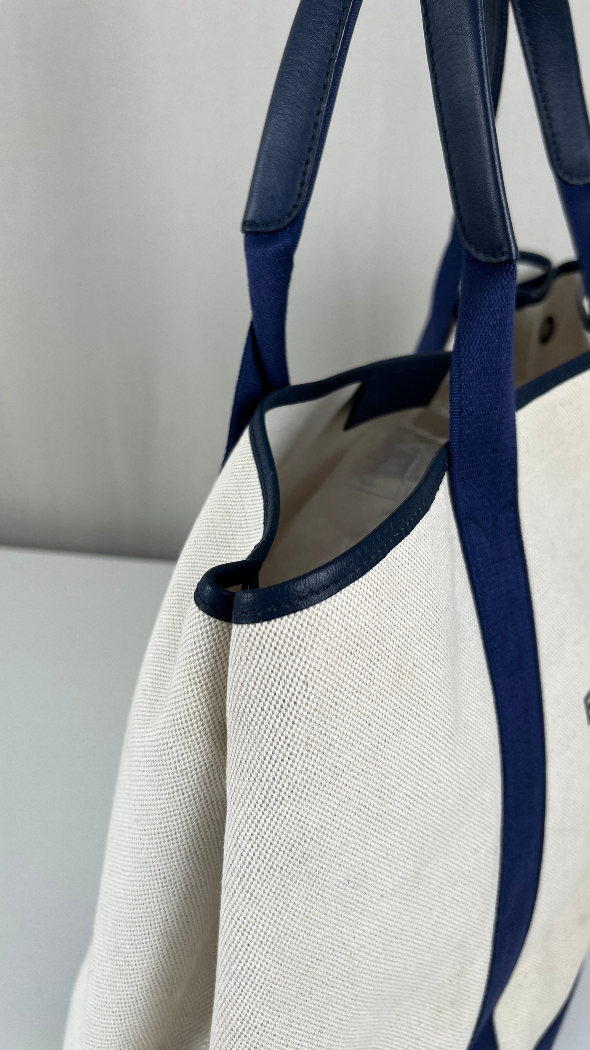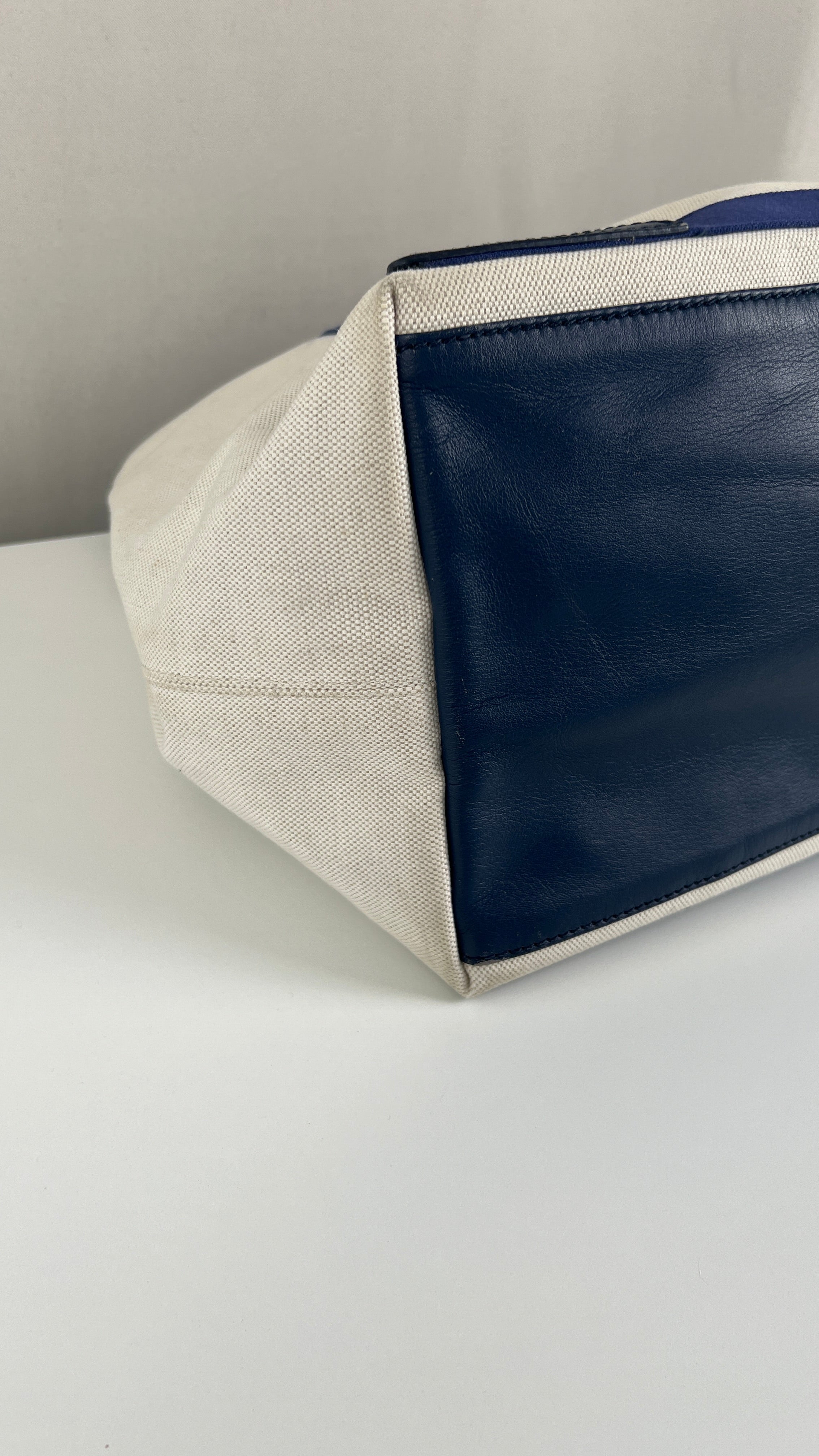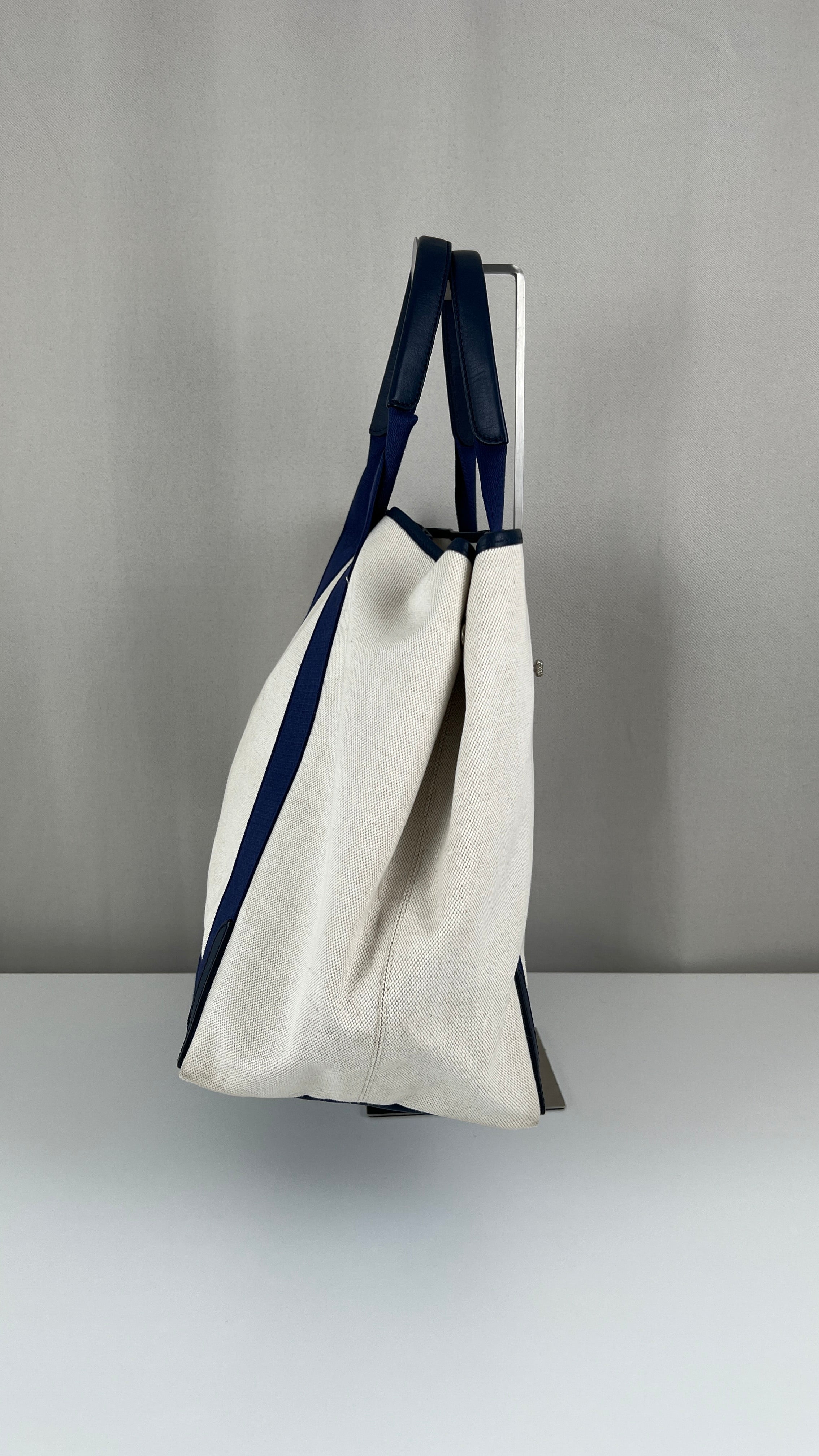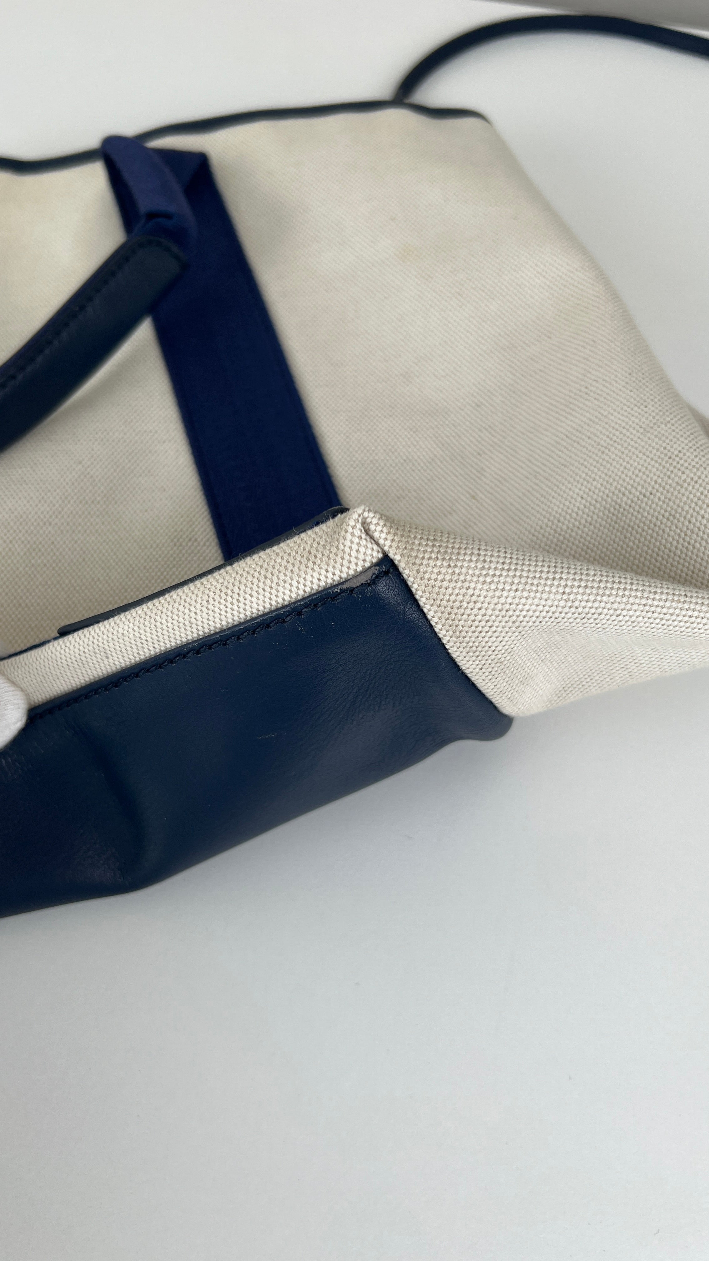 This Balenciaga Navy Big Cabas is in good / very good condition. The cotton canvas is in very good condition, very little trace of wear very natural. The corners are in good condition, a little bit rubbed. The handles are in very good condition and are in leather. There are little stains inside. You can largely fit a computer inside. Bottom of the bag is in leather, little trace of wear almost not.