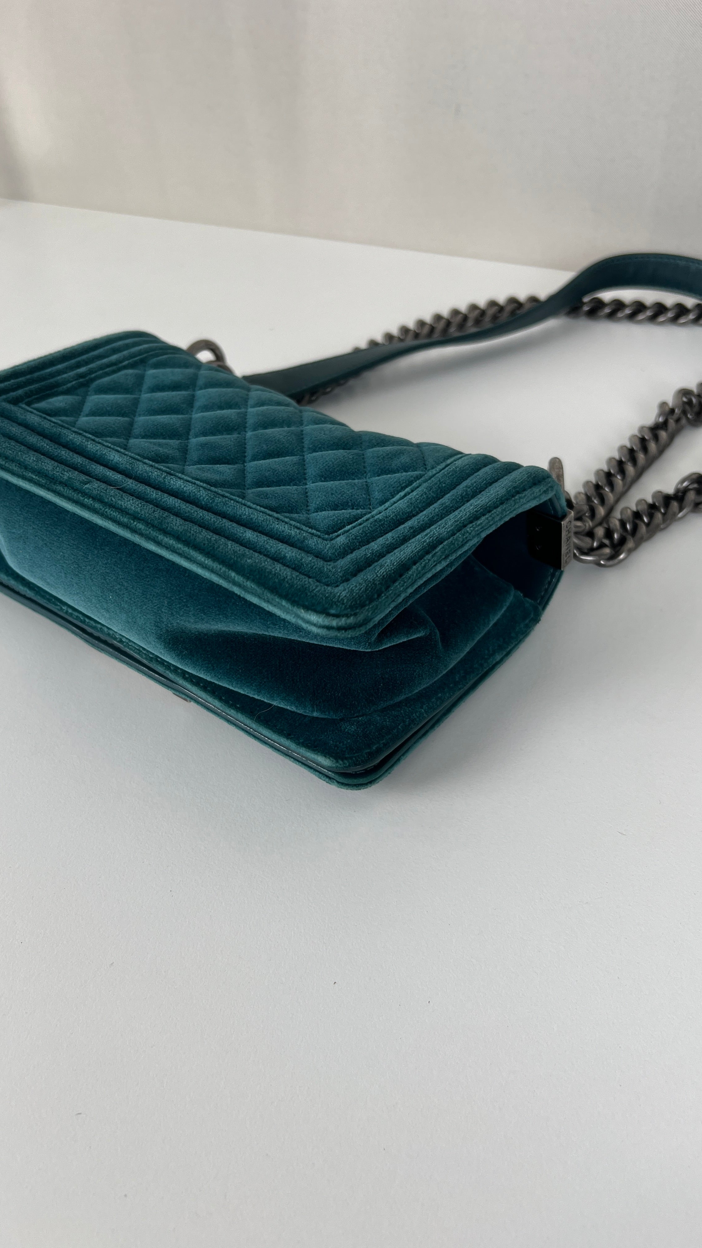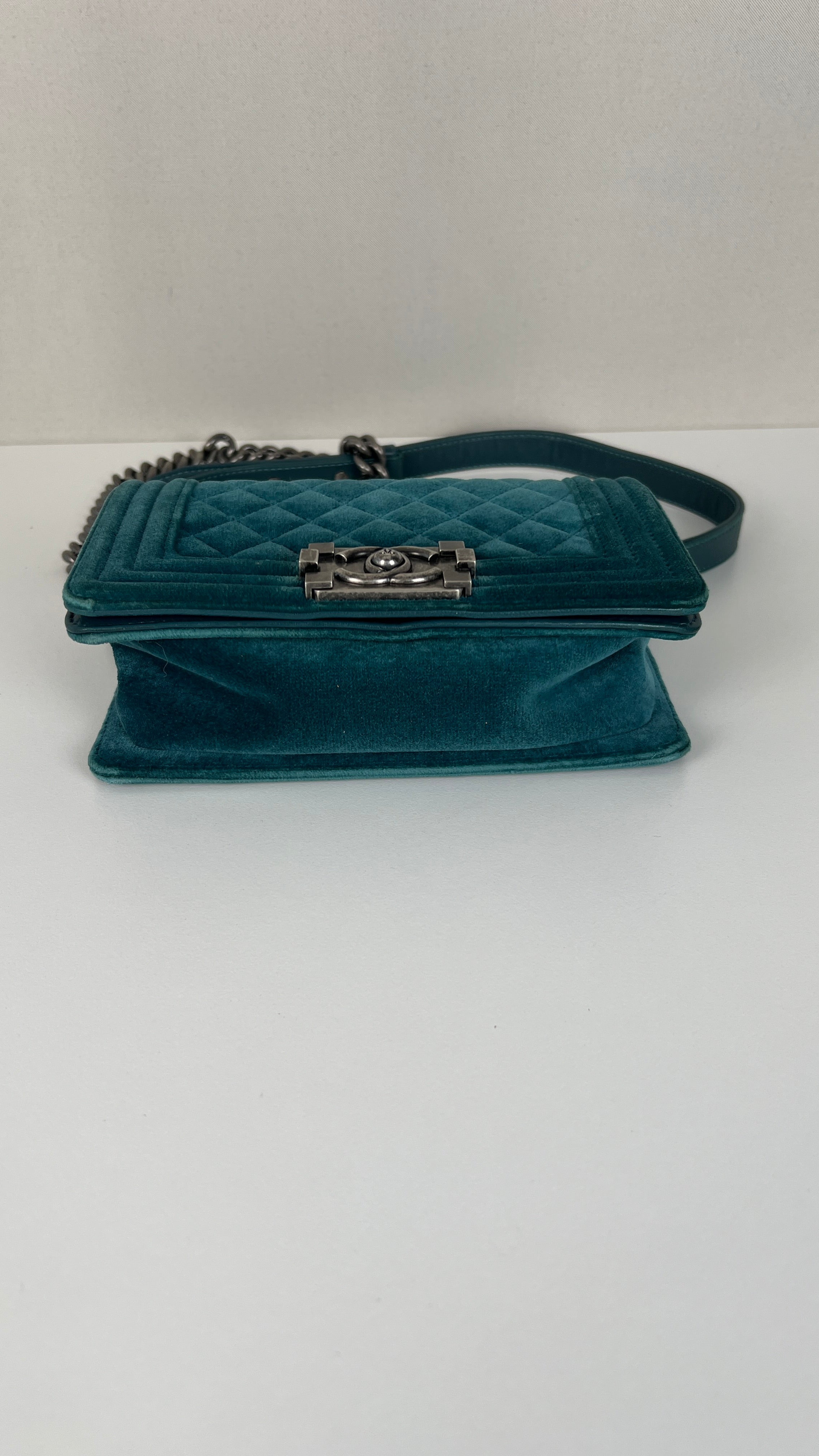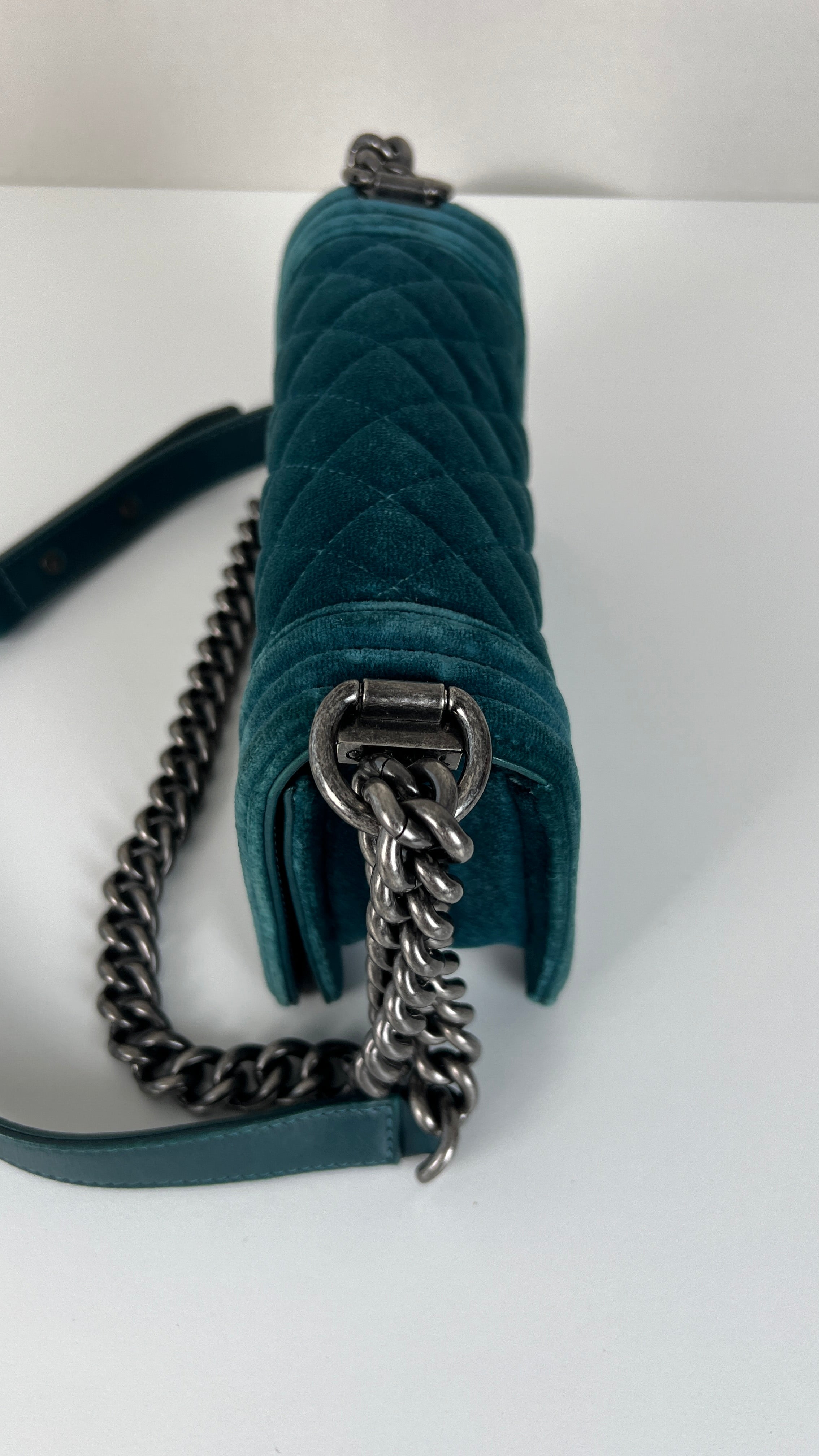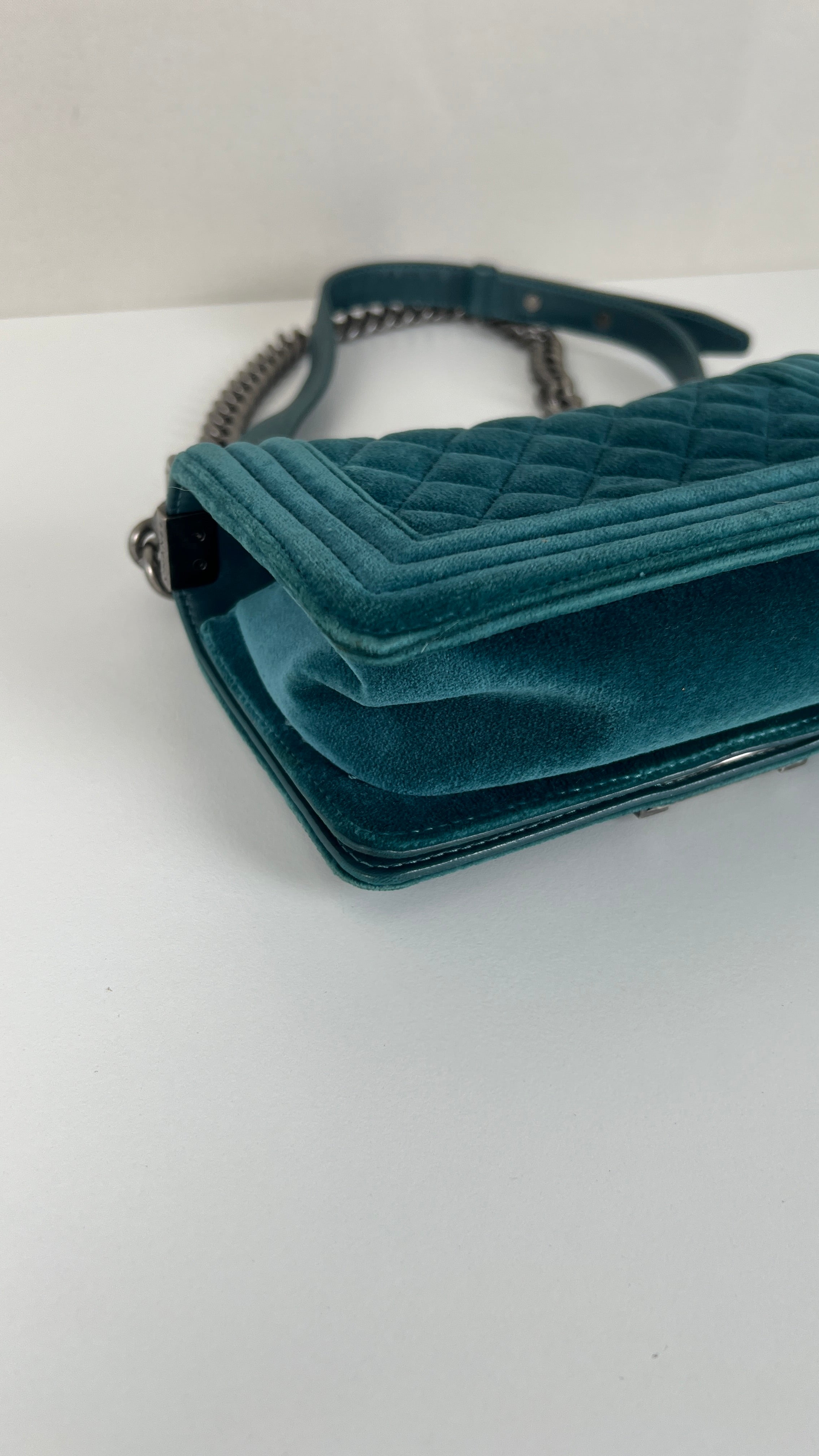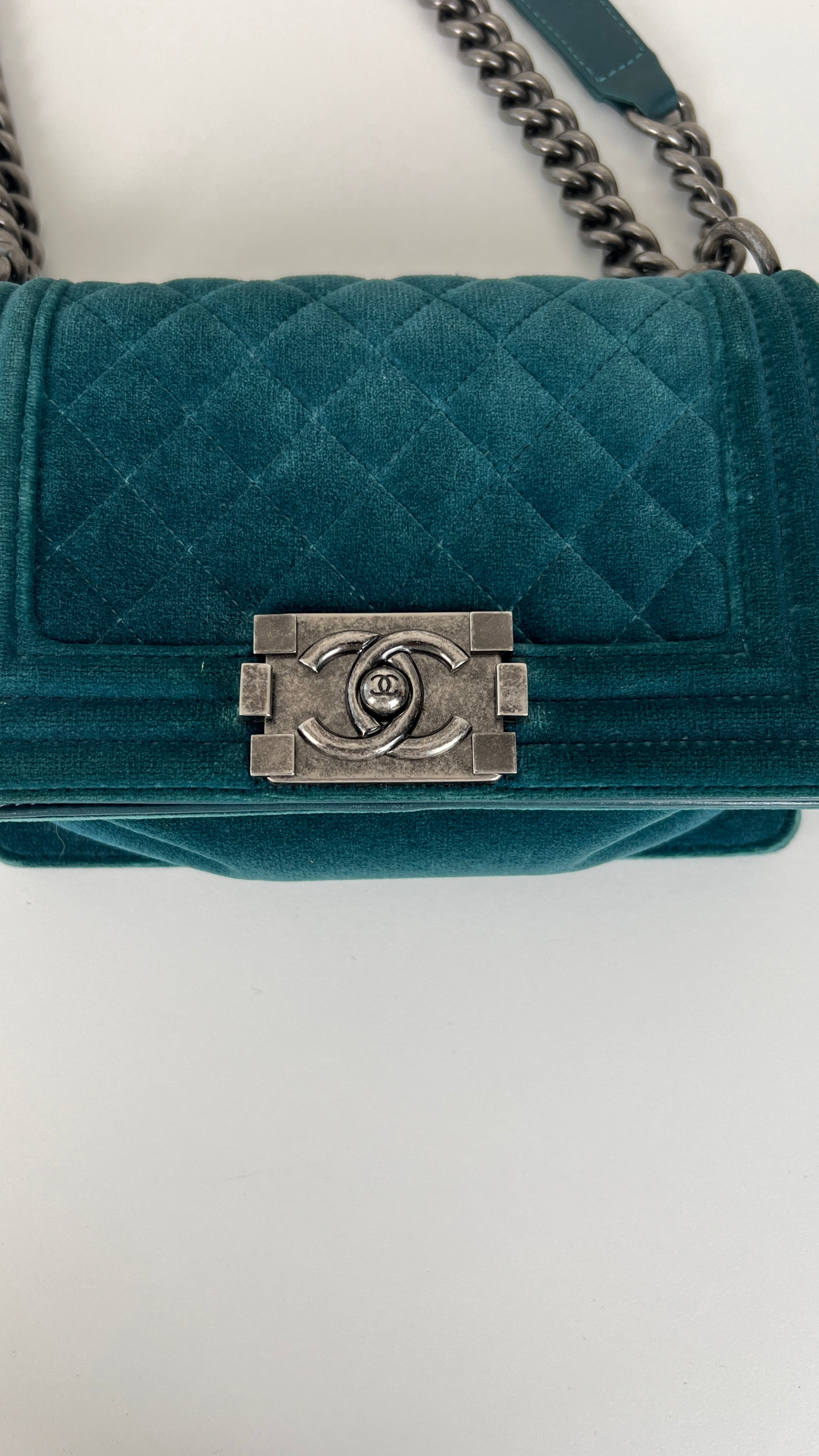 This Chanel Boy Small Green Velvet is in very good condition. The velvet is in very good condition. The corners have little marks and are in good condition. The strap is in very good condition. The interior is in very good condition. On the top of the bag close to the chains it's little bit rubbed, natural use.