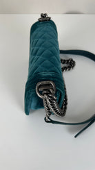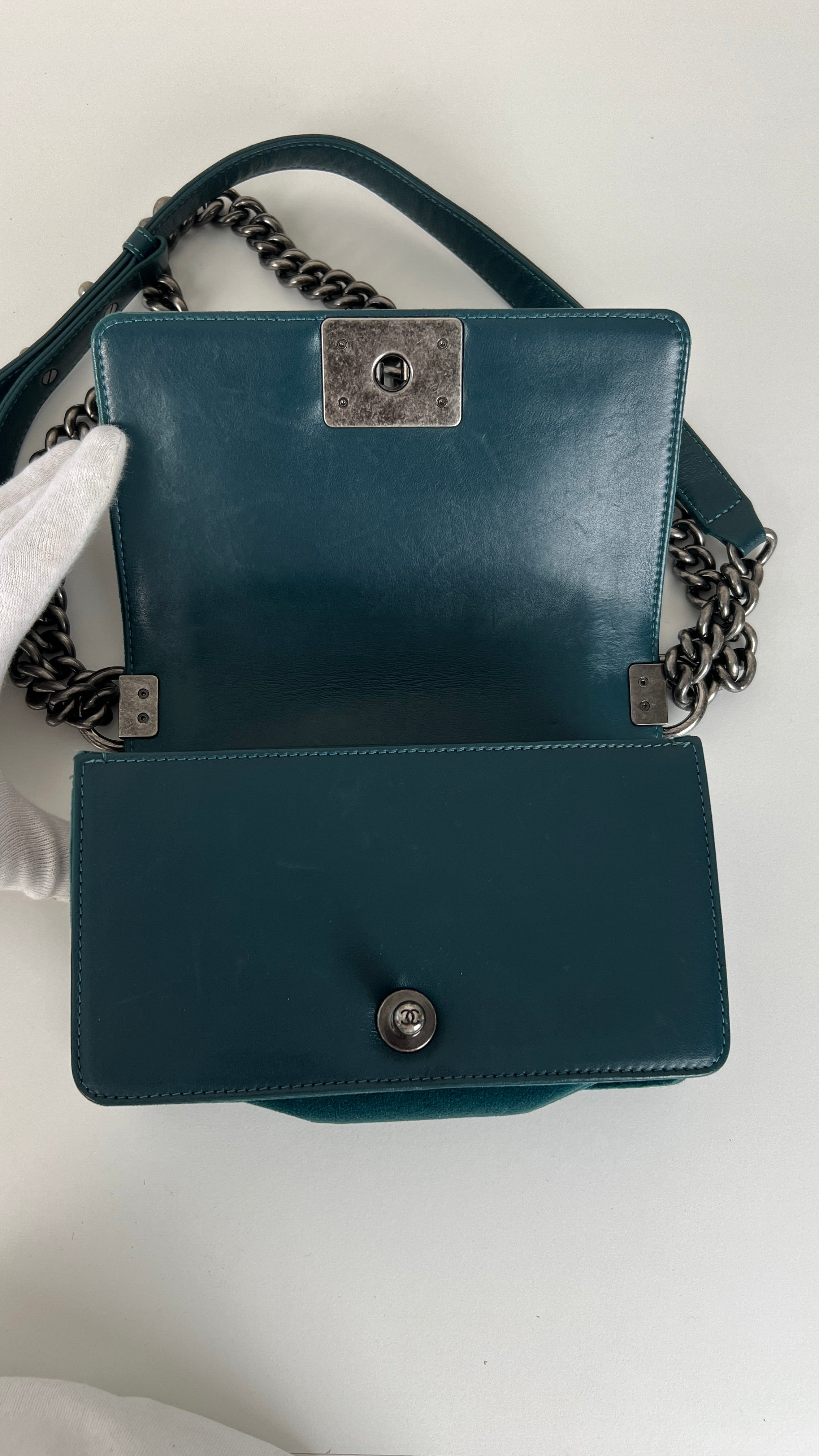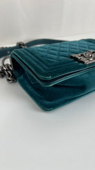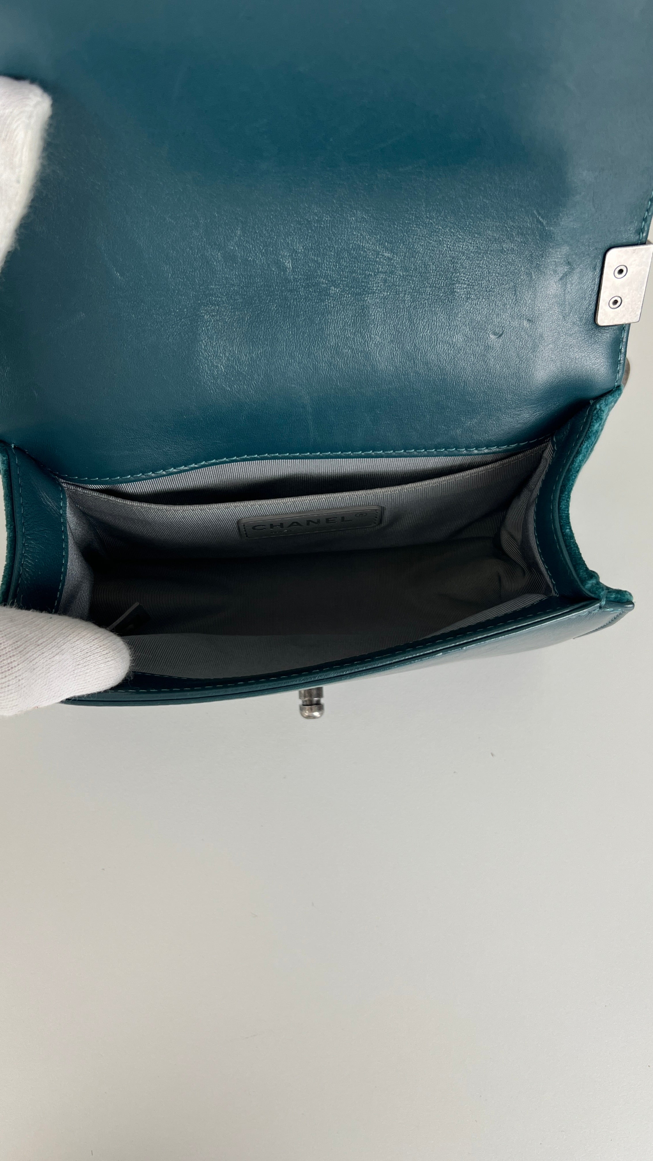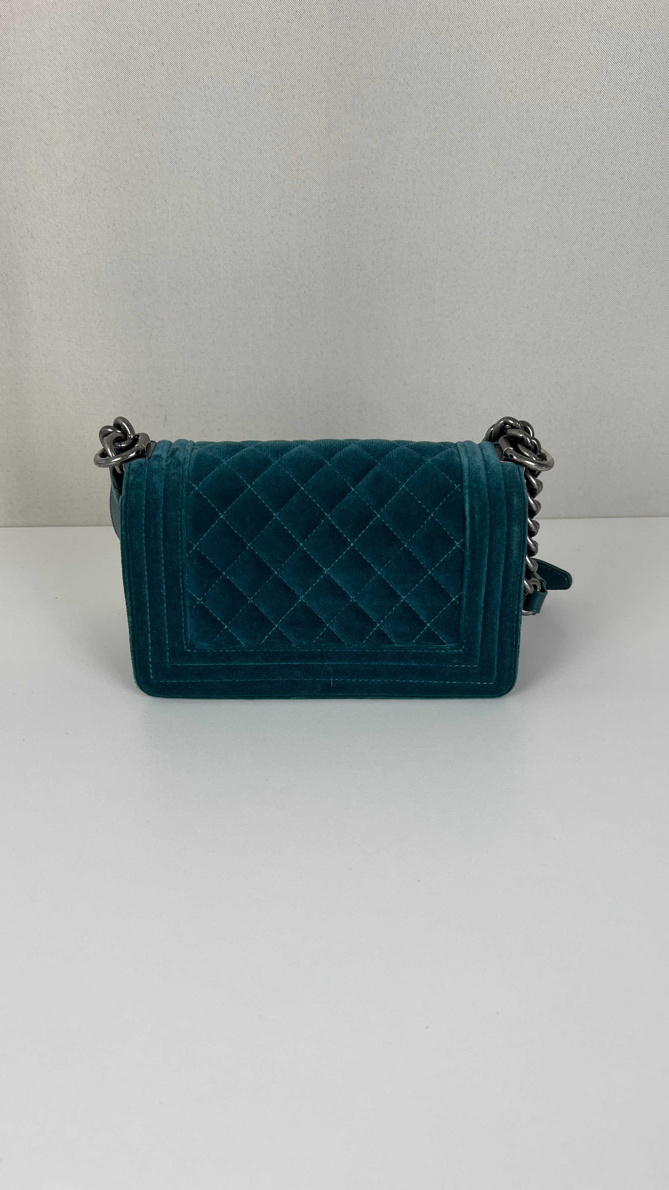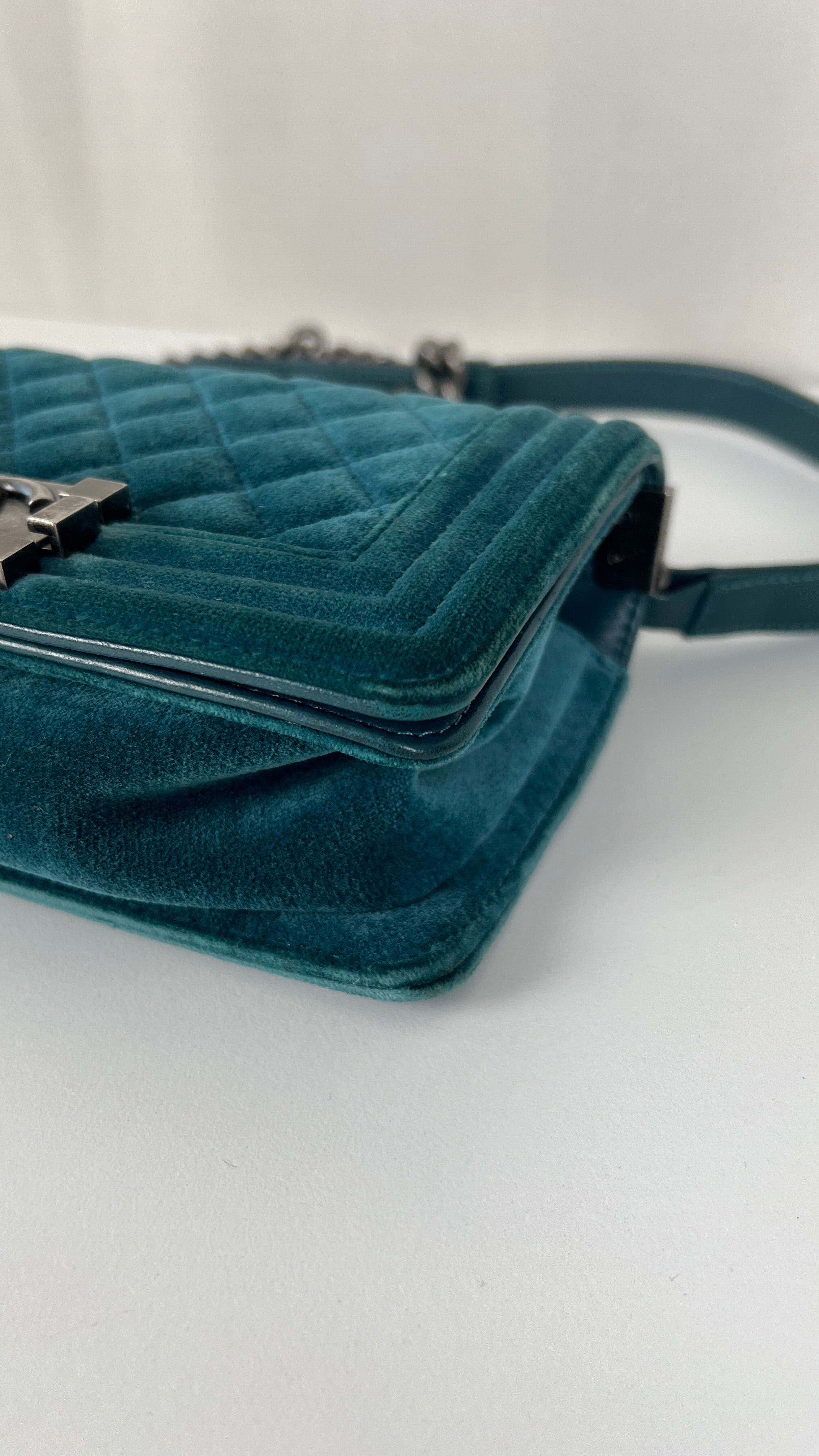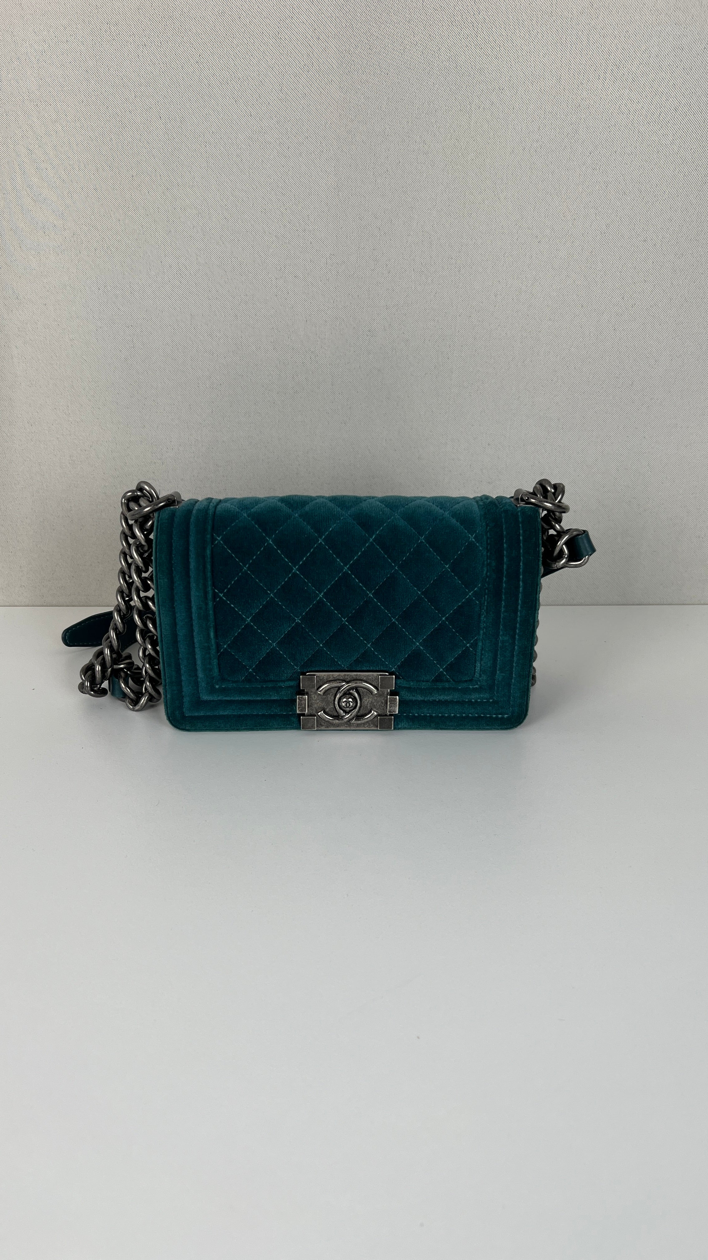 This Chanel Boy Small Green Velvet is in very good condition. The velvet is in very good condition. The corners have little marks and are in good condition. The strap is in very good condition. The interior is in very good condition. On the top of the bag close to the chains it's little bit rubbed, natural use.