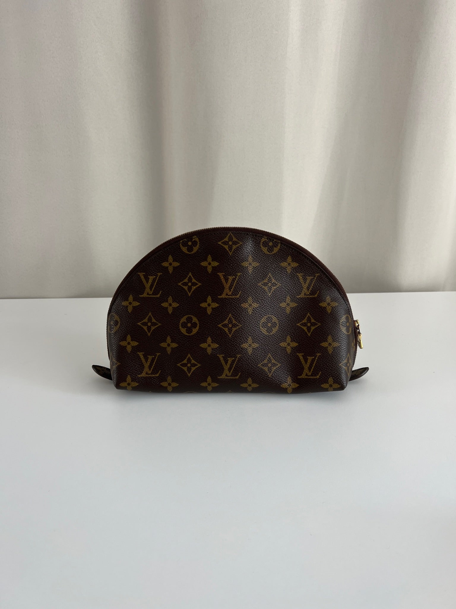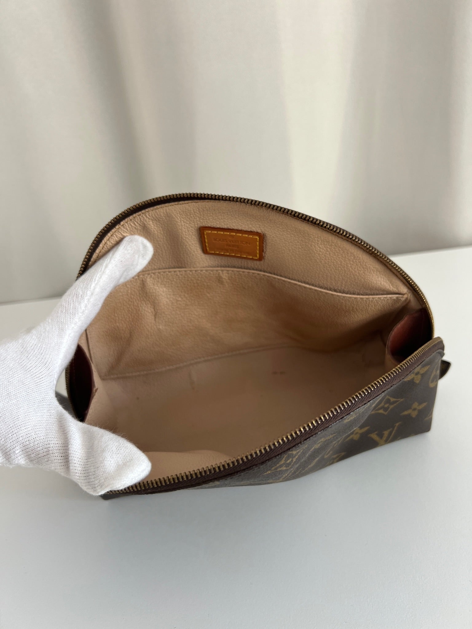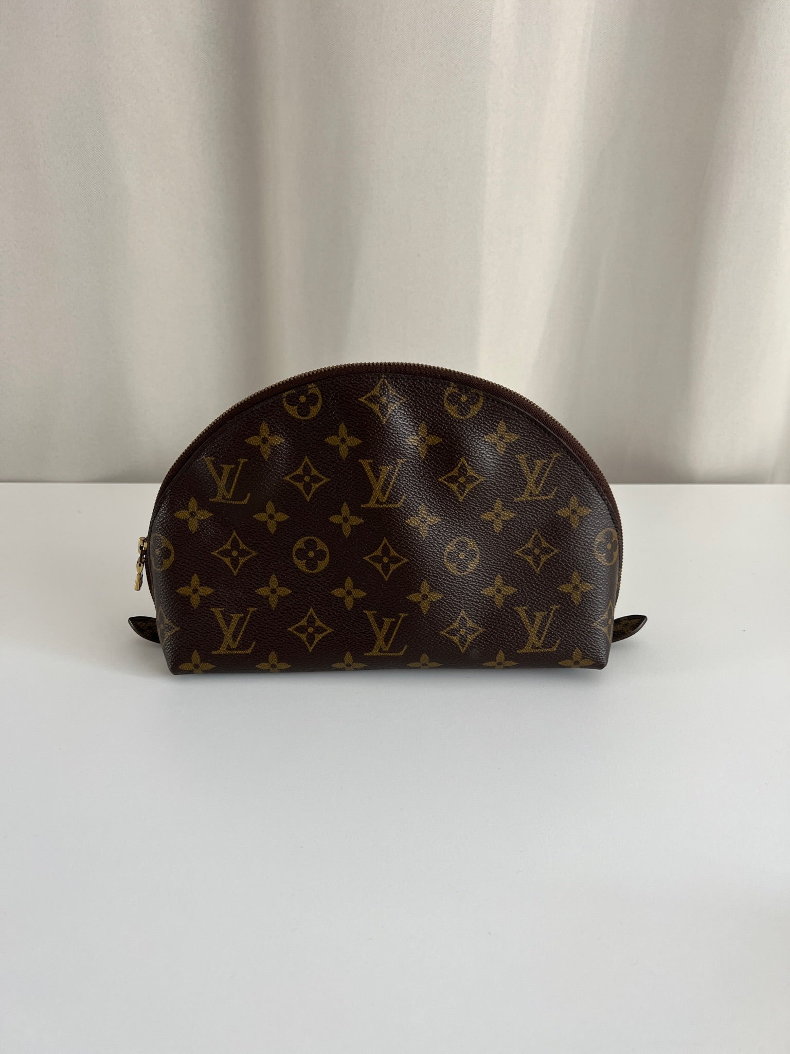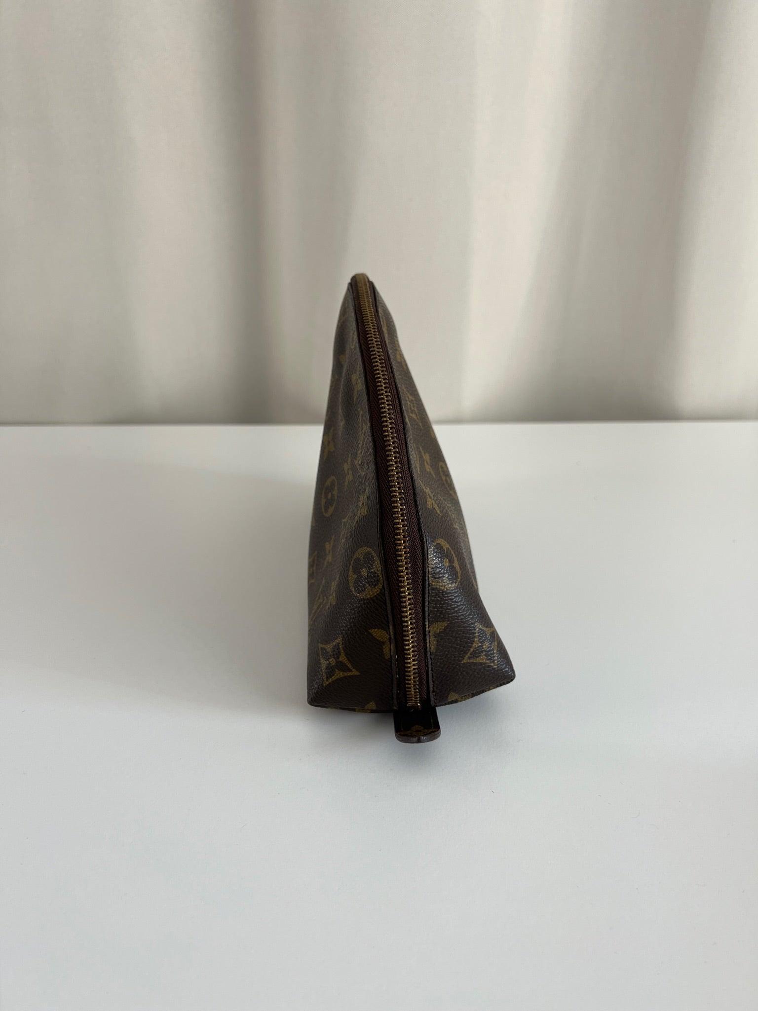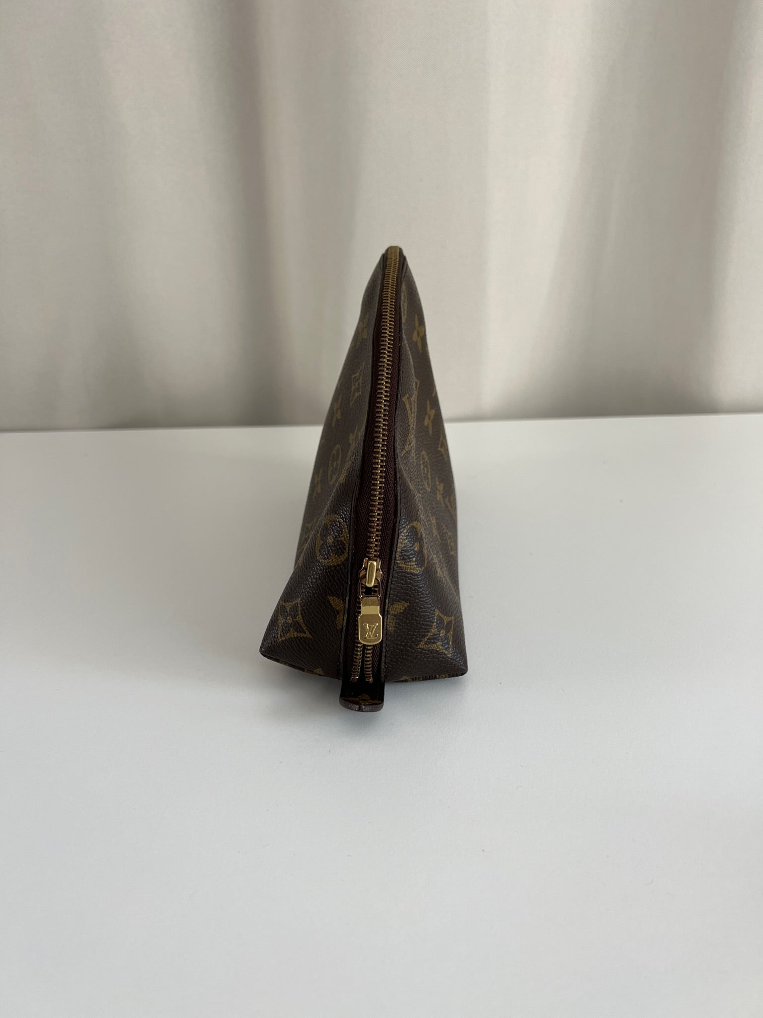 This Louis Vuitton Canva Monogram MM cosmetic pouch is in good condition. The canva and leather parts are in very good condition. The zipper interior close to it is a little used from normal use. The interior is in good condition you can see some sign of use of the leather insde little cracks.