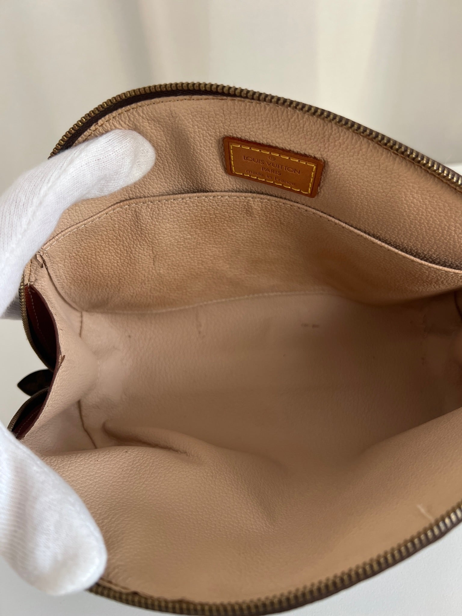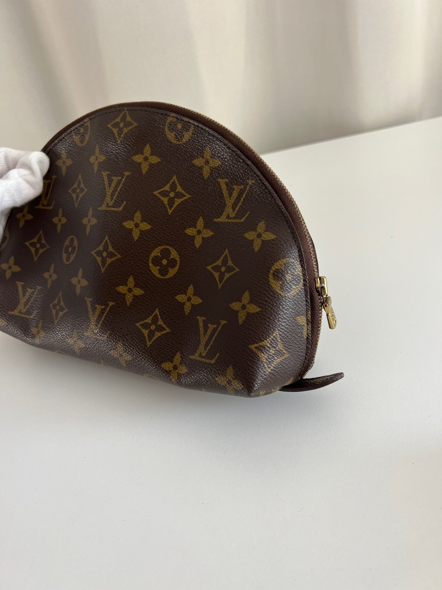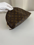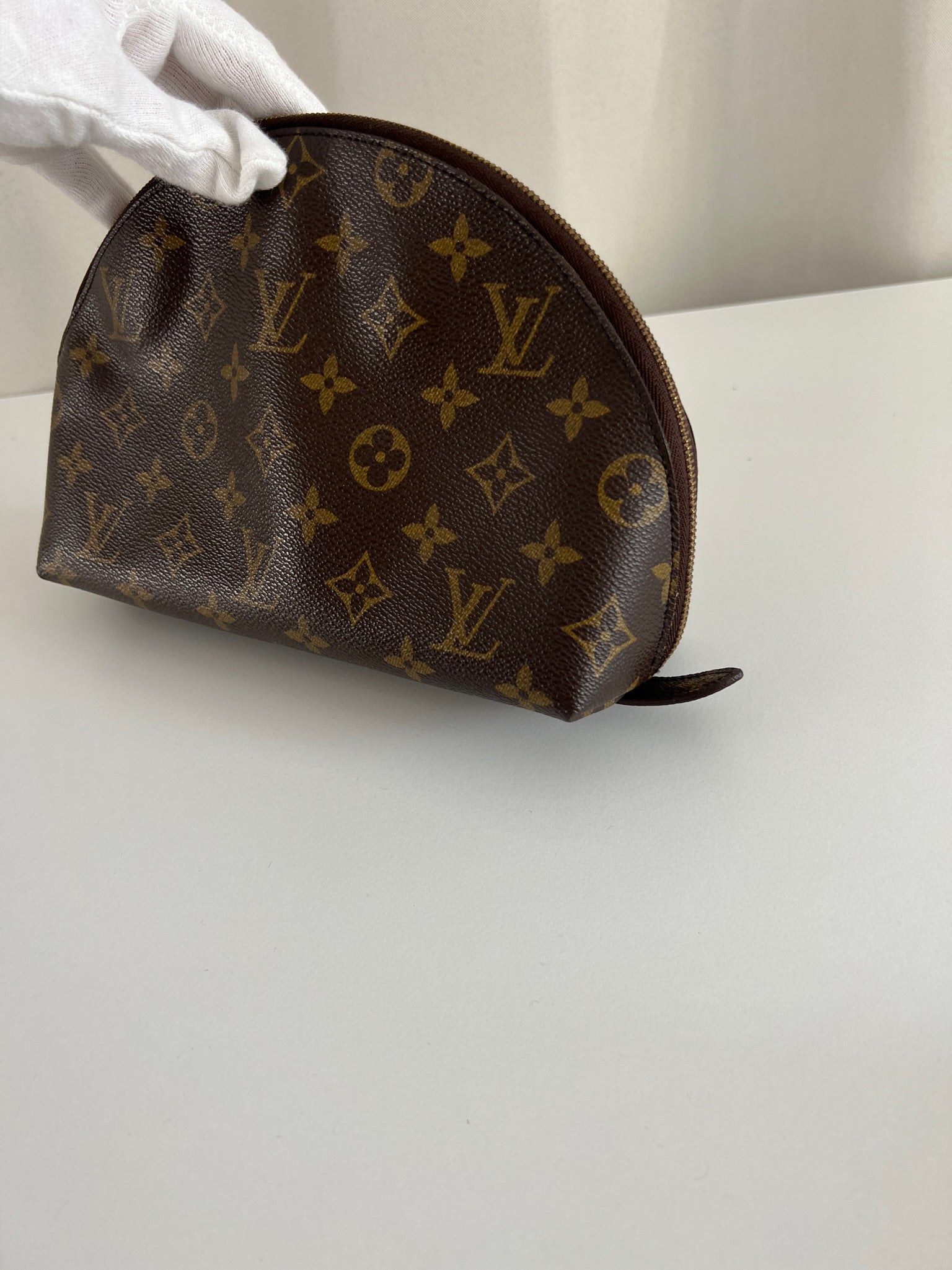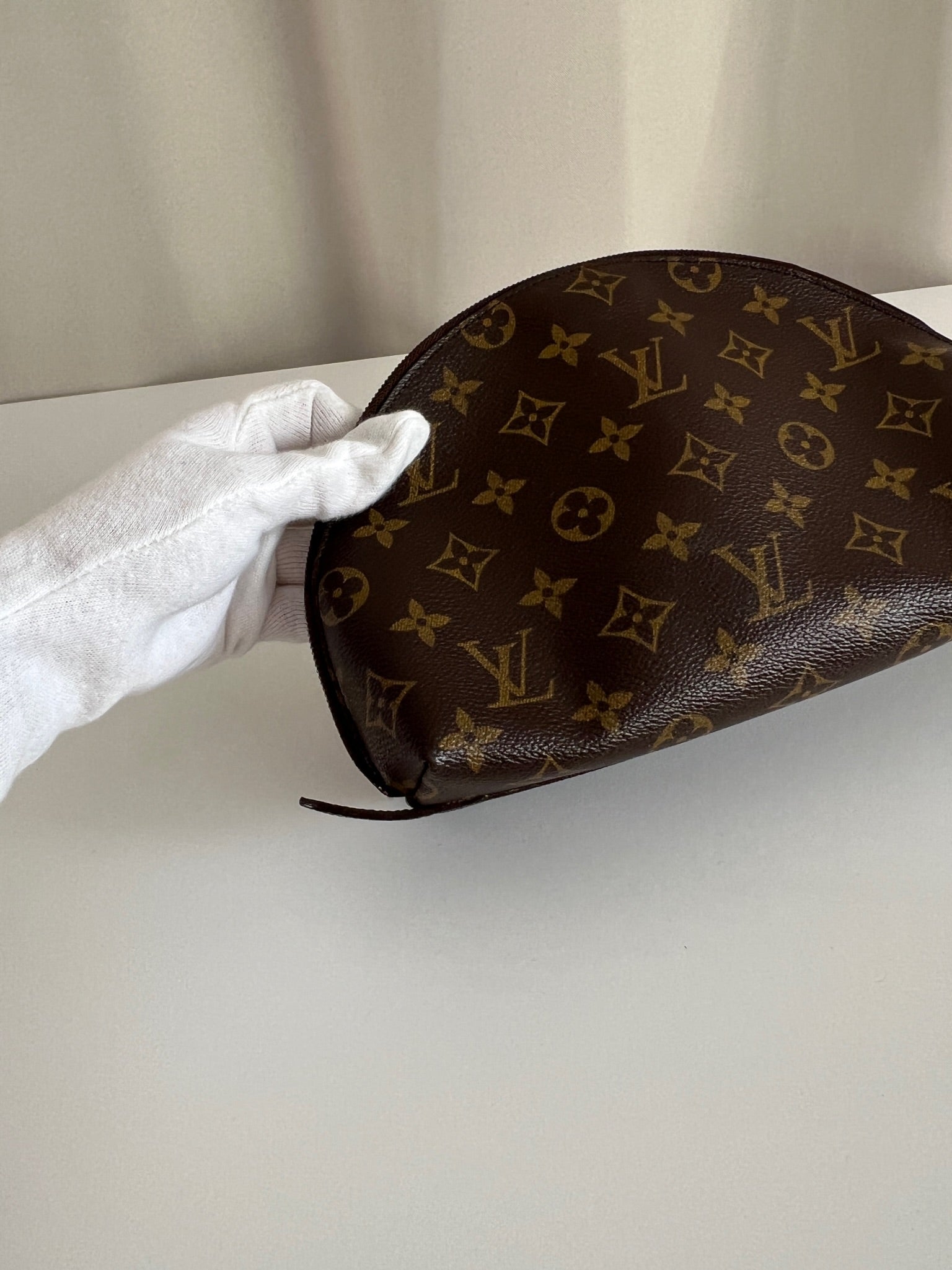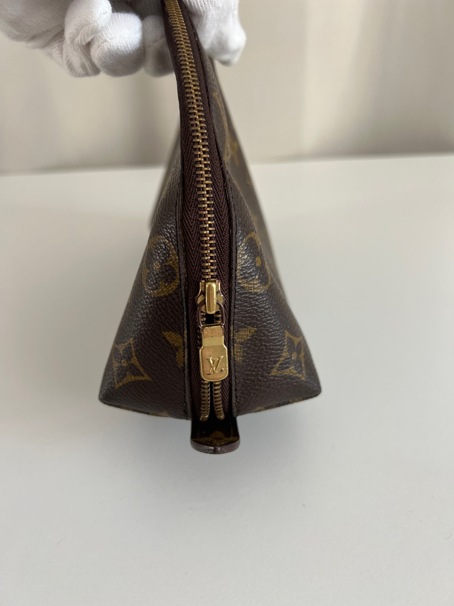 This Louis Vuitton Canva Monogram MM cosmetic pouch is in good condition. The canva and leather parts are in very good condition. The zipper interior close to it is a little used from normal use. The interior is in good condition you can see some sign of use of the leather insde little cracks.